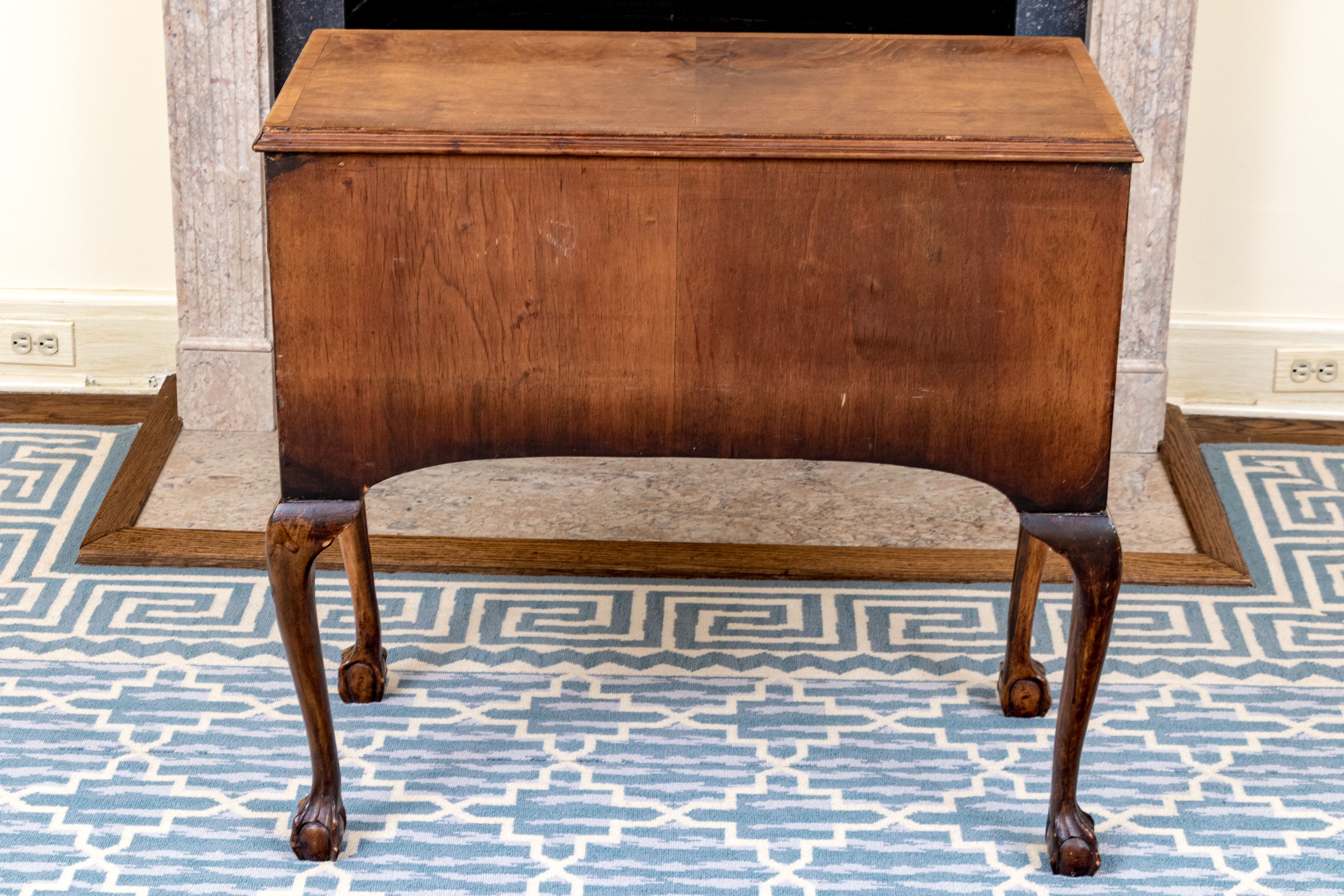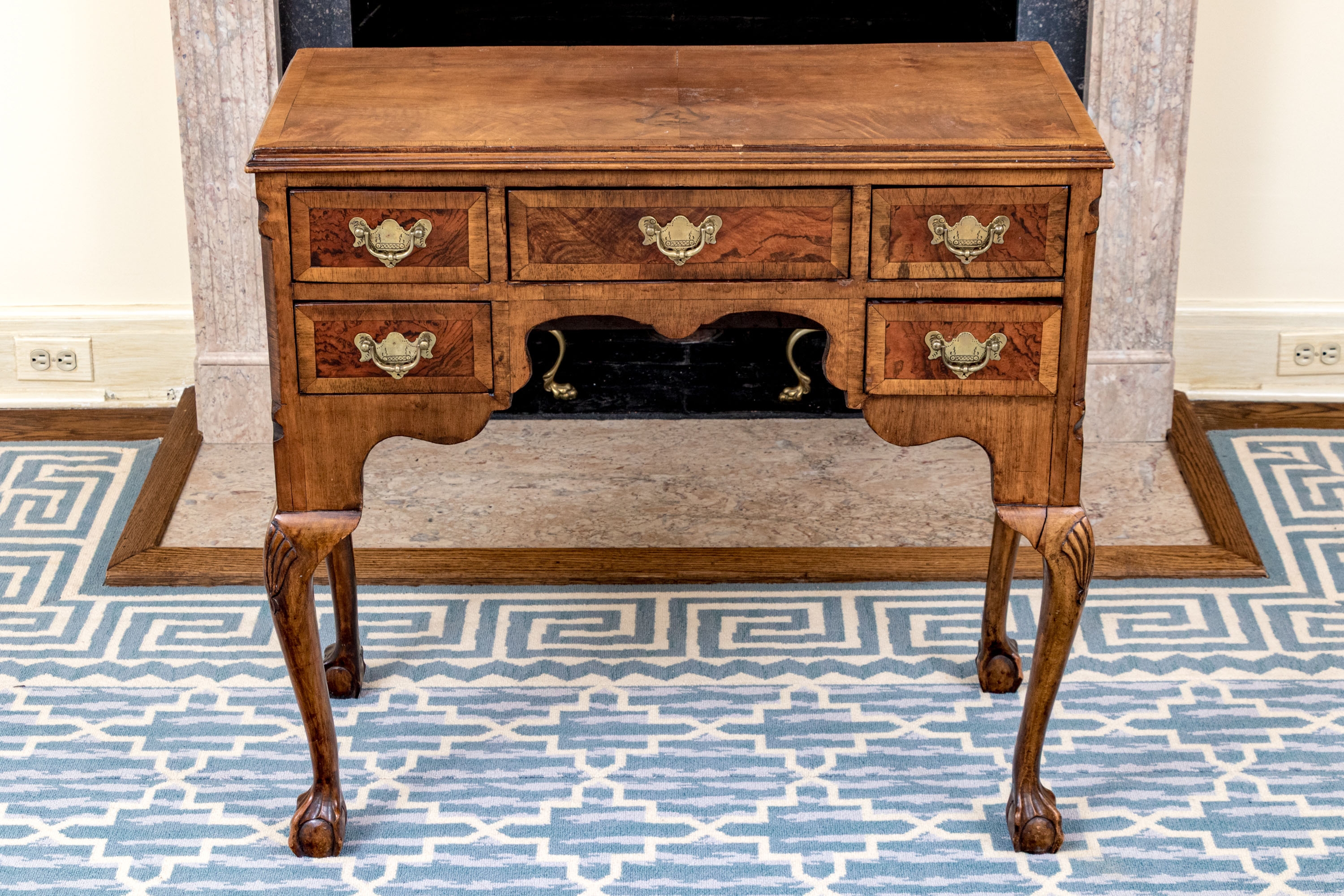 A stunning period Chippendale style vanity in warm honeyed brown showcasing excellent figured veneers across the top and drawers with banded ogee edges. The vanity sports a long center drawer and two short drawers on each side, all adorned with brass swing handles on batwing plaques with fine etched designs. The shapely, high-arched apron allows ample, comfortable space for sitting at the vanity, raised on carved cabriole legs and claw and ball feet.