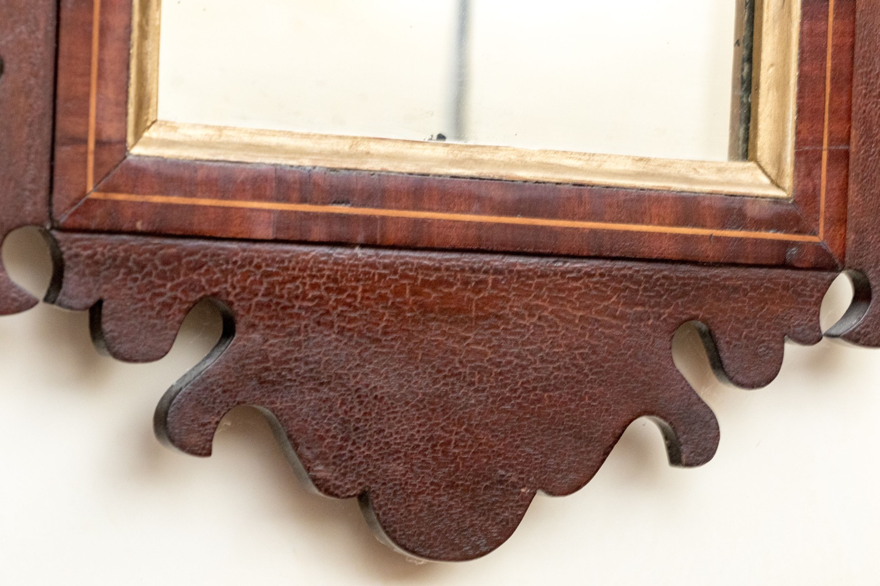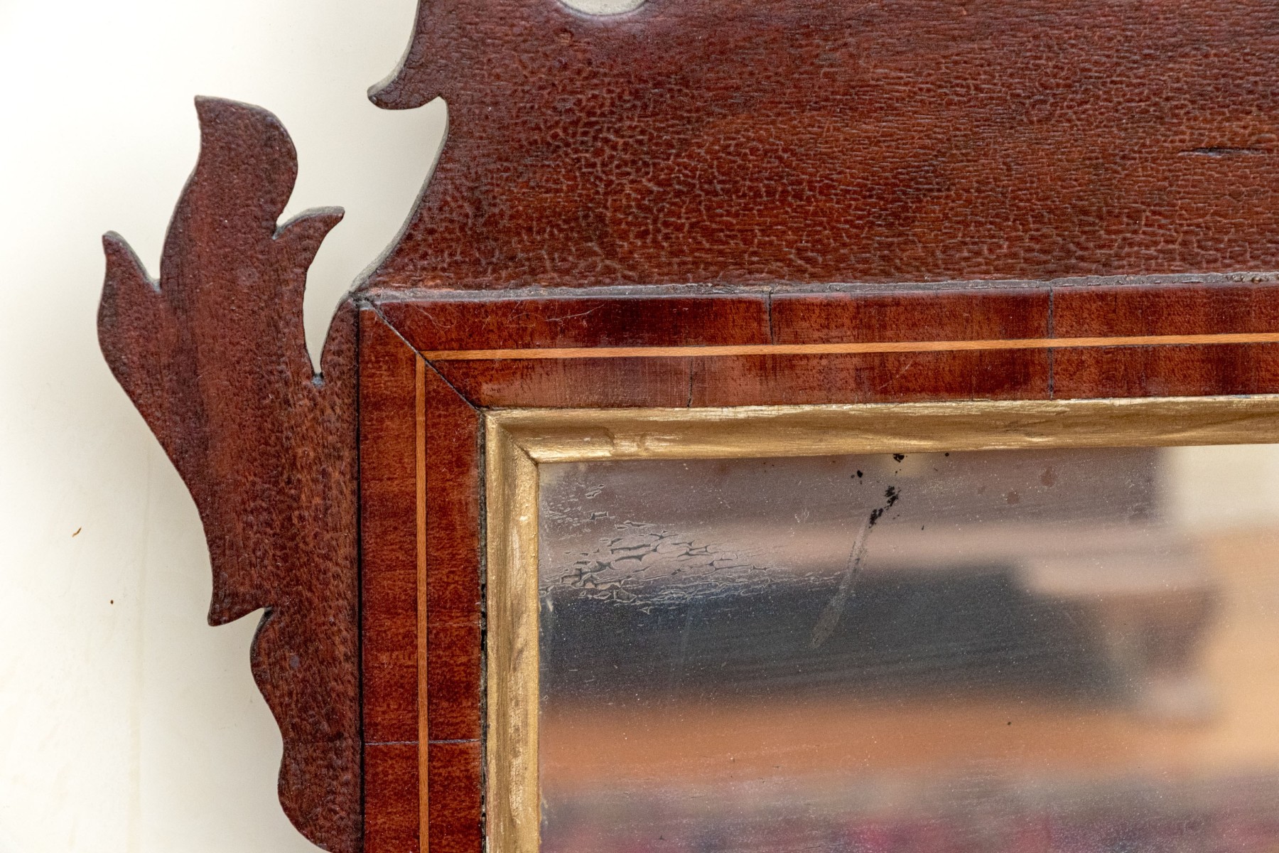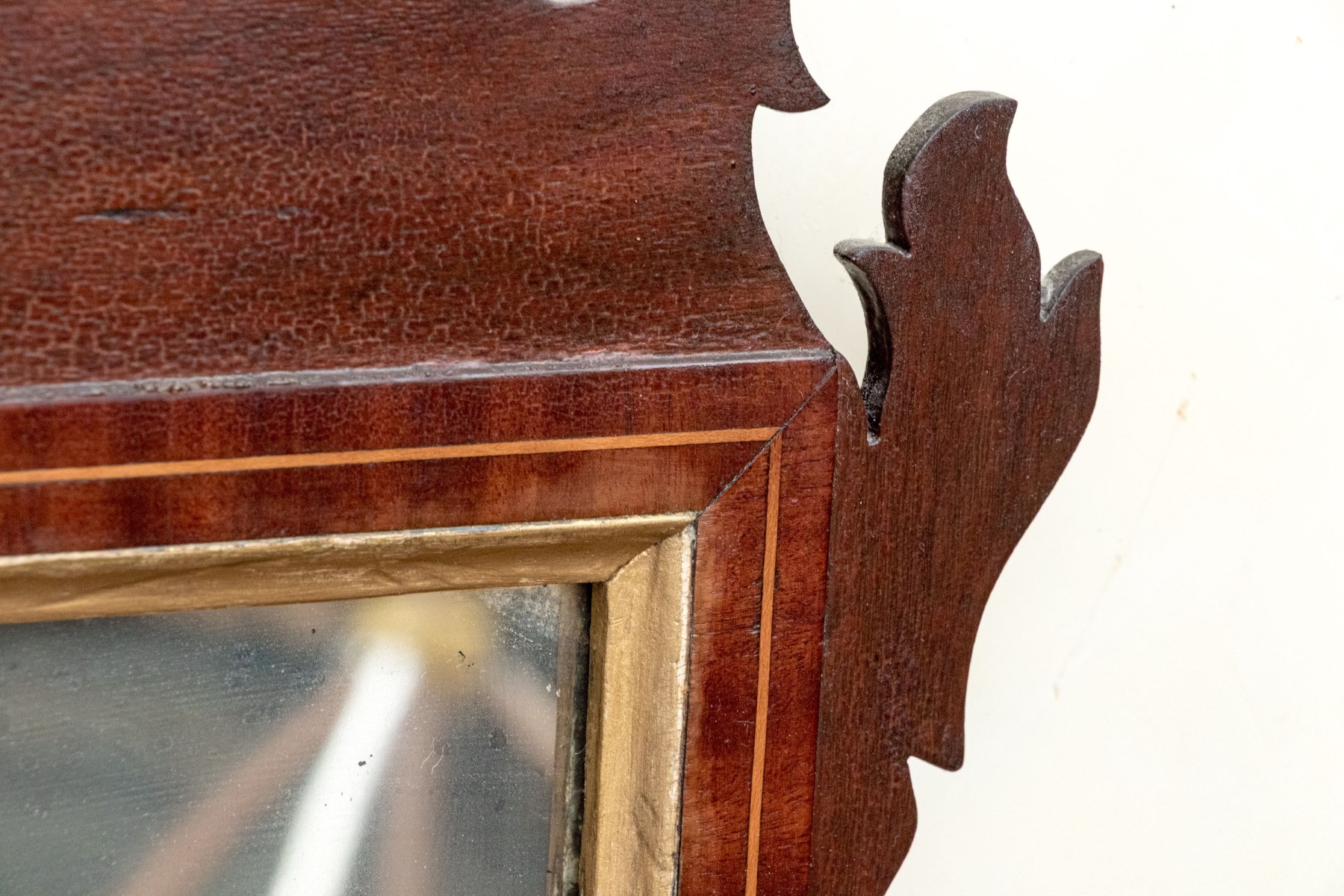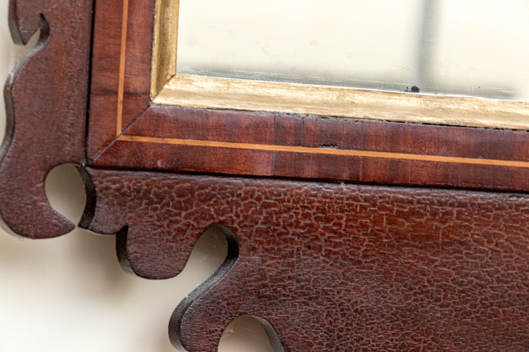 A gorgeous antique mirror exuding Chippendale elegance with a rectangular mirror surrounded by a gilt bevel in a rich red-brown flamed mahogany frame with a fine satinwood inlaid border. The frame is surrounded by elegantly carved flourishes creating a shapely foliate appearance.