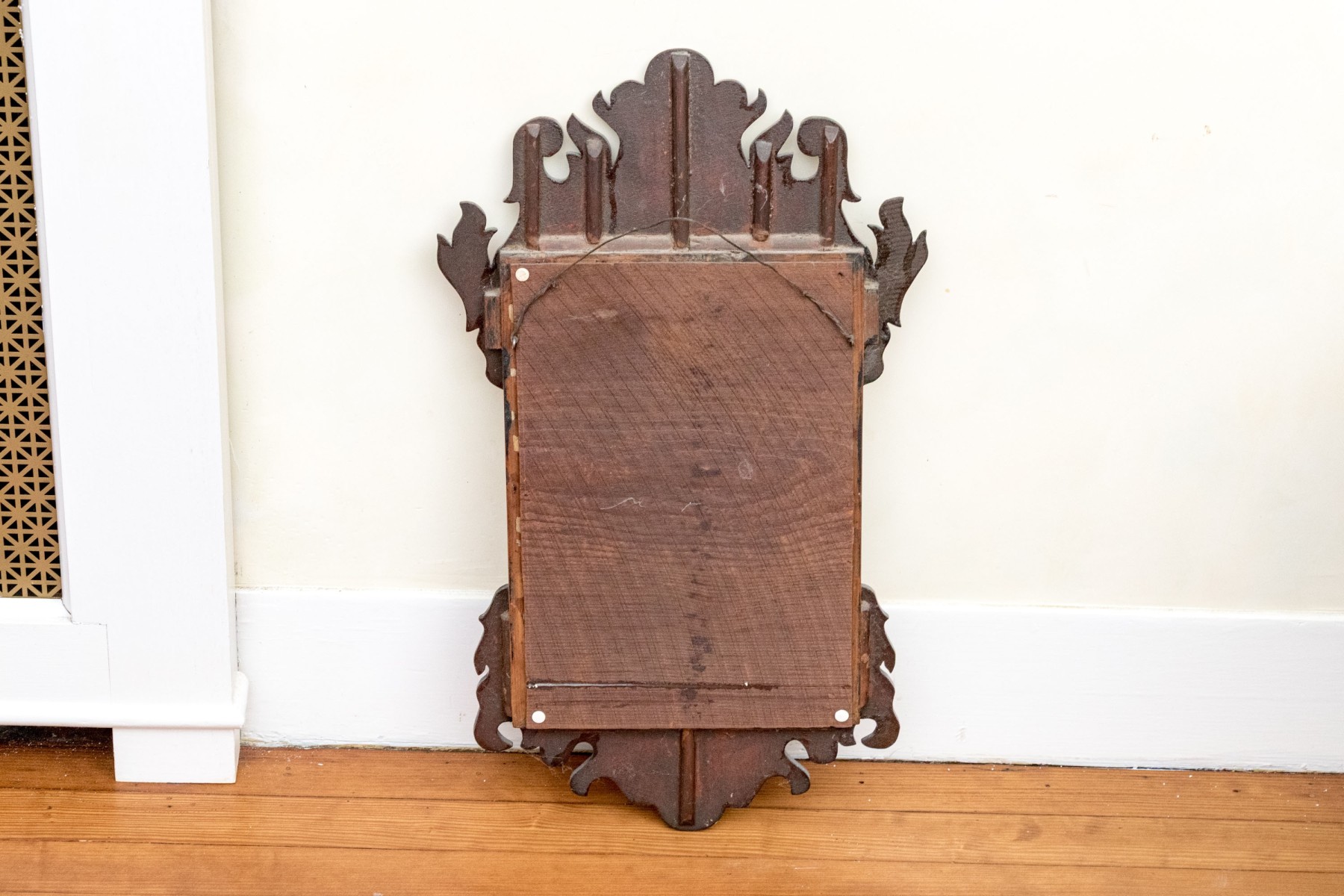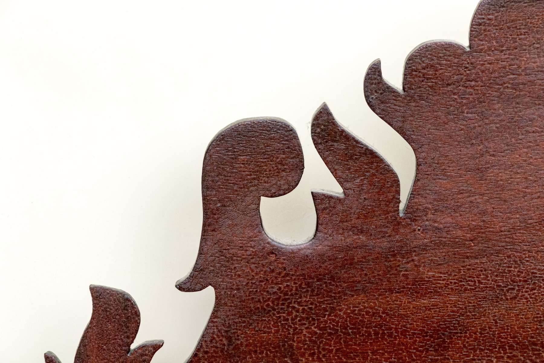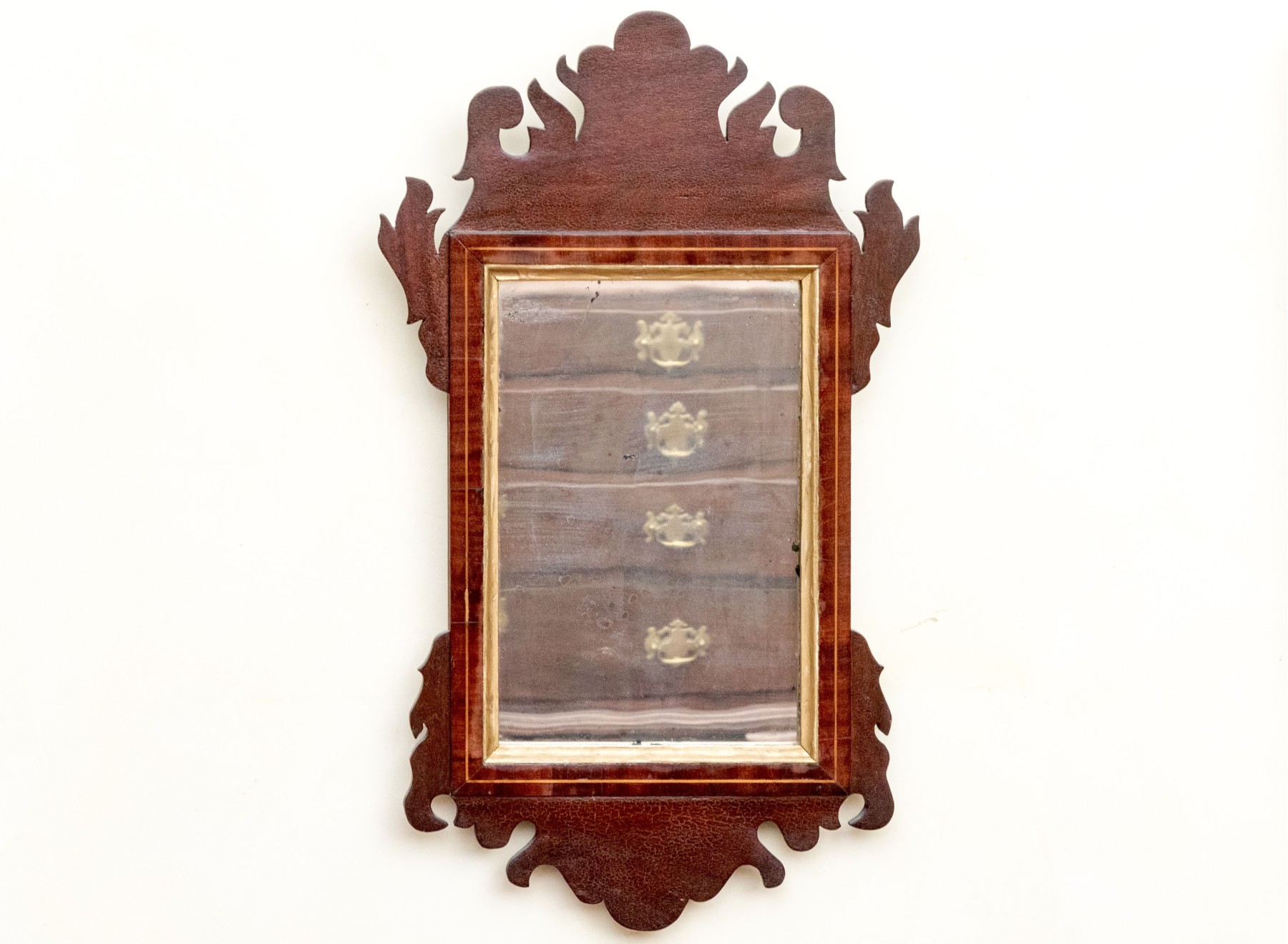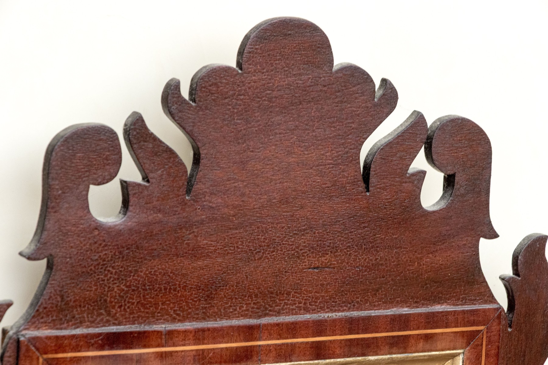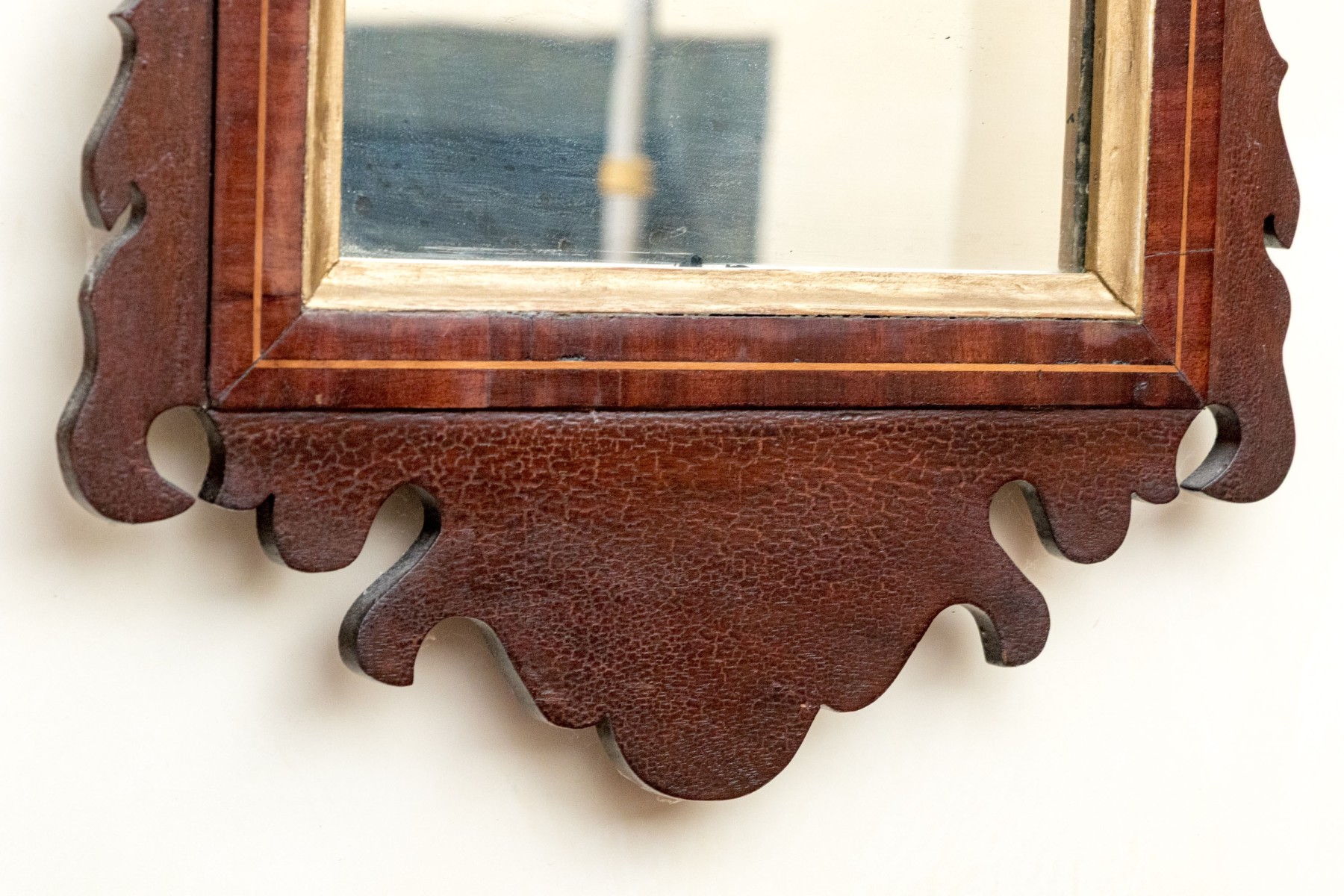 A gorgeous antique mirror exuding Chippendale elegance with a rectangular mirror surrounded by a gilt bevel in a rich red-brown flamed mahogany frame with a fine satinwood inlaid border. The frame is surrounded by elegantly carved flourishes creating a shapely foliate appearance.