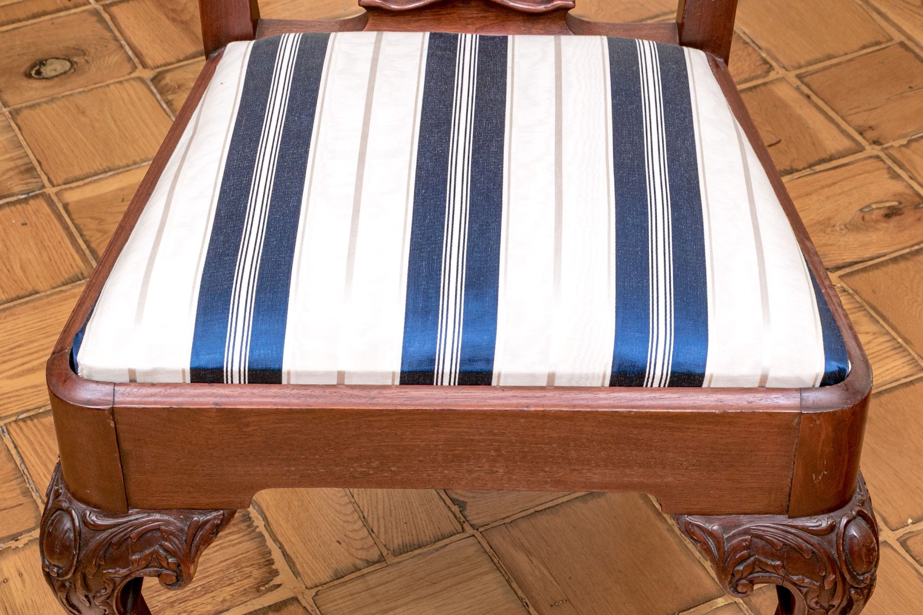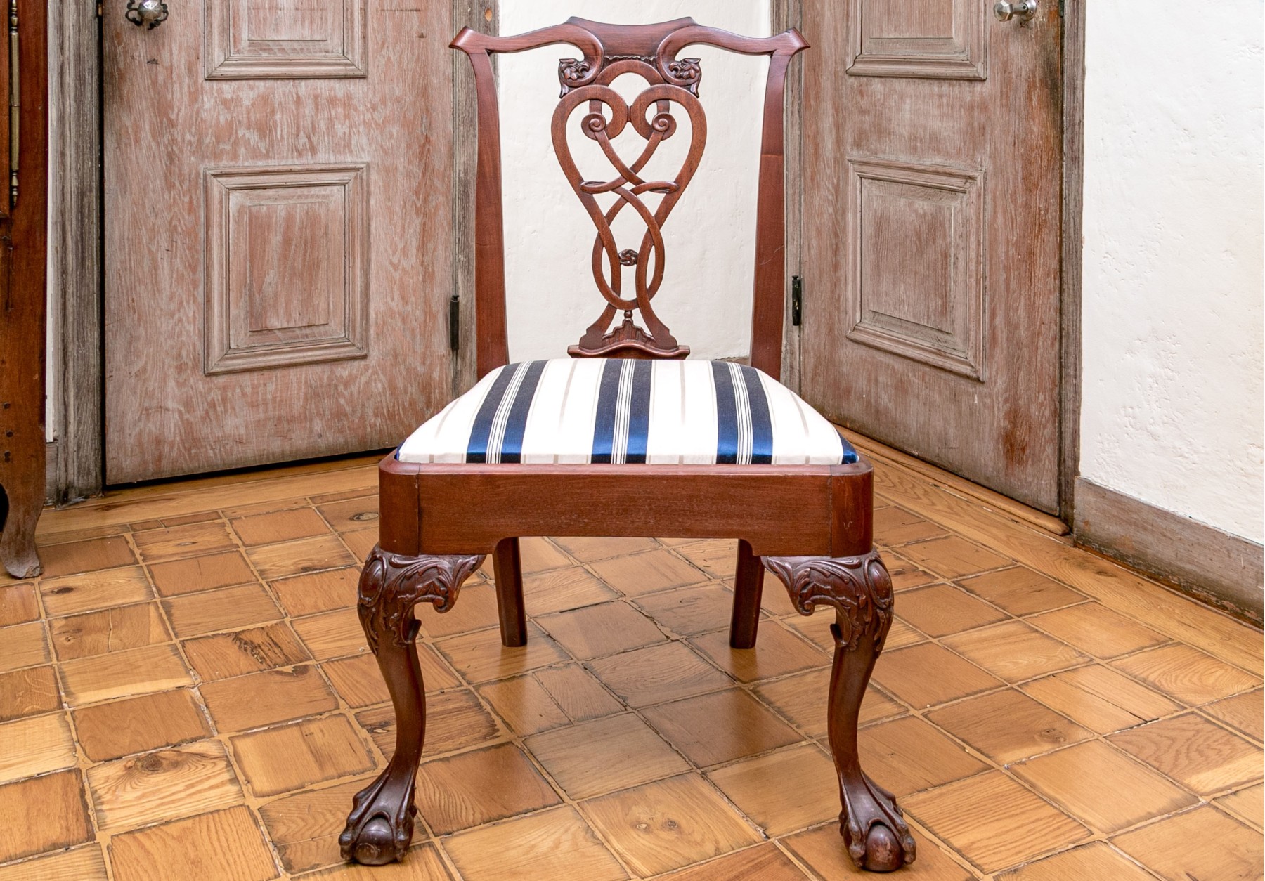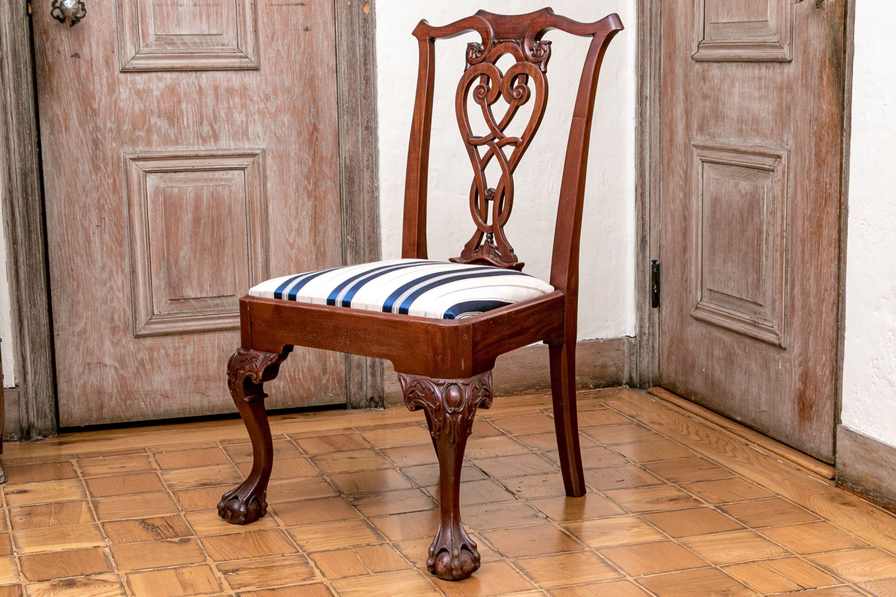 A handsome late Victorian Chippendale style side chair well constructed in warm brown mahogany. The chair features a shapely top rail with flared ears and a magnificent openwork splat ornately carved with delicately intertwined scrolls and carved bird heads. The seat is upholstered in stately white and blue striped fabric, raised on classic cabriole legs with richly carved knees and ball and claw feet complimenting the bird head motifs.