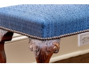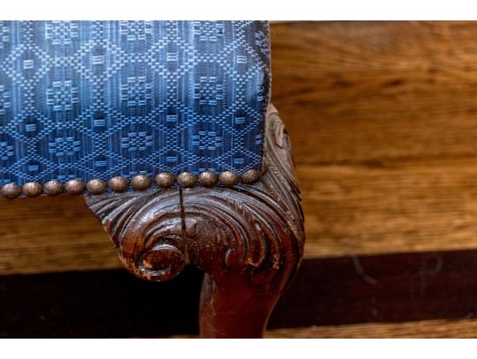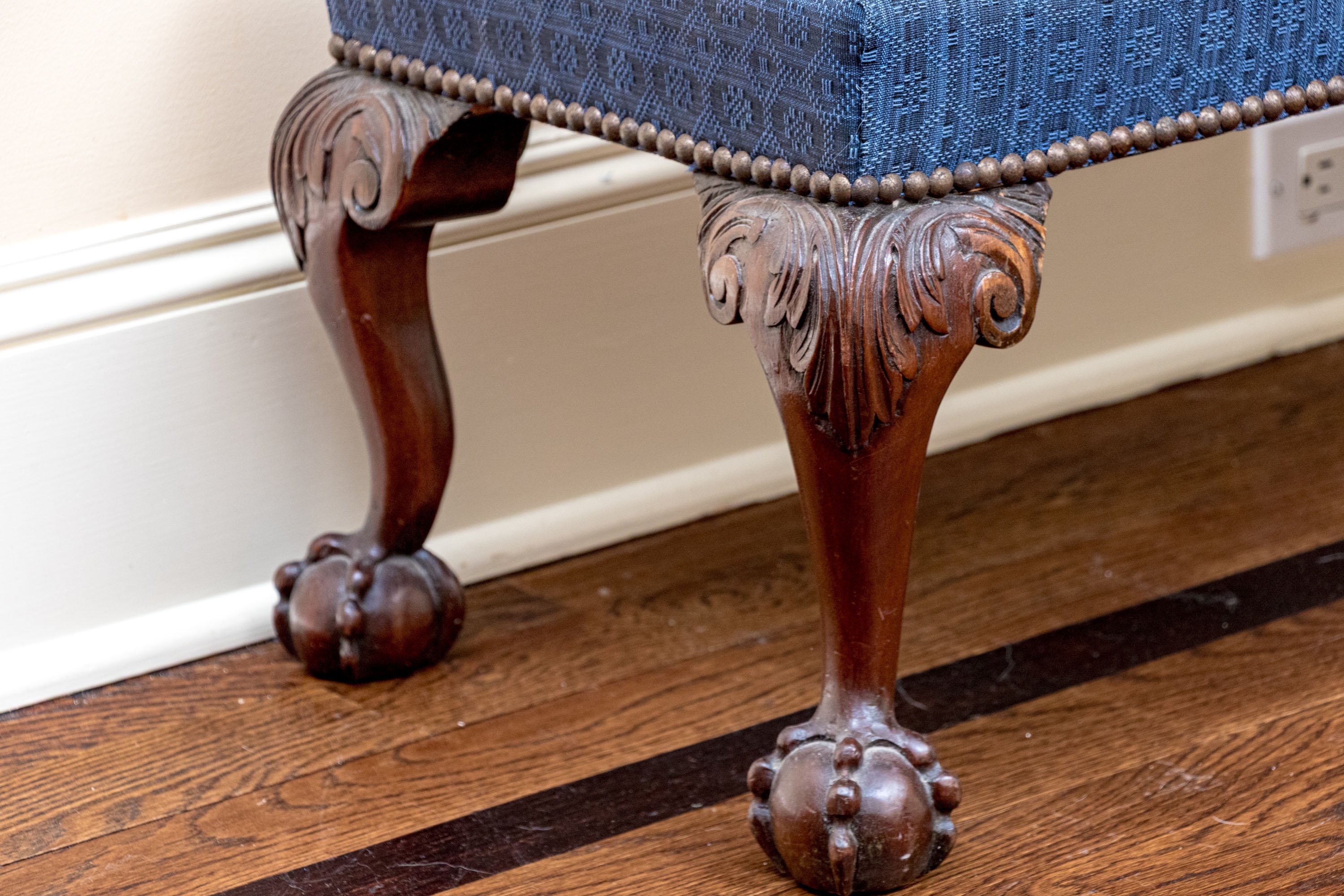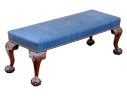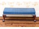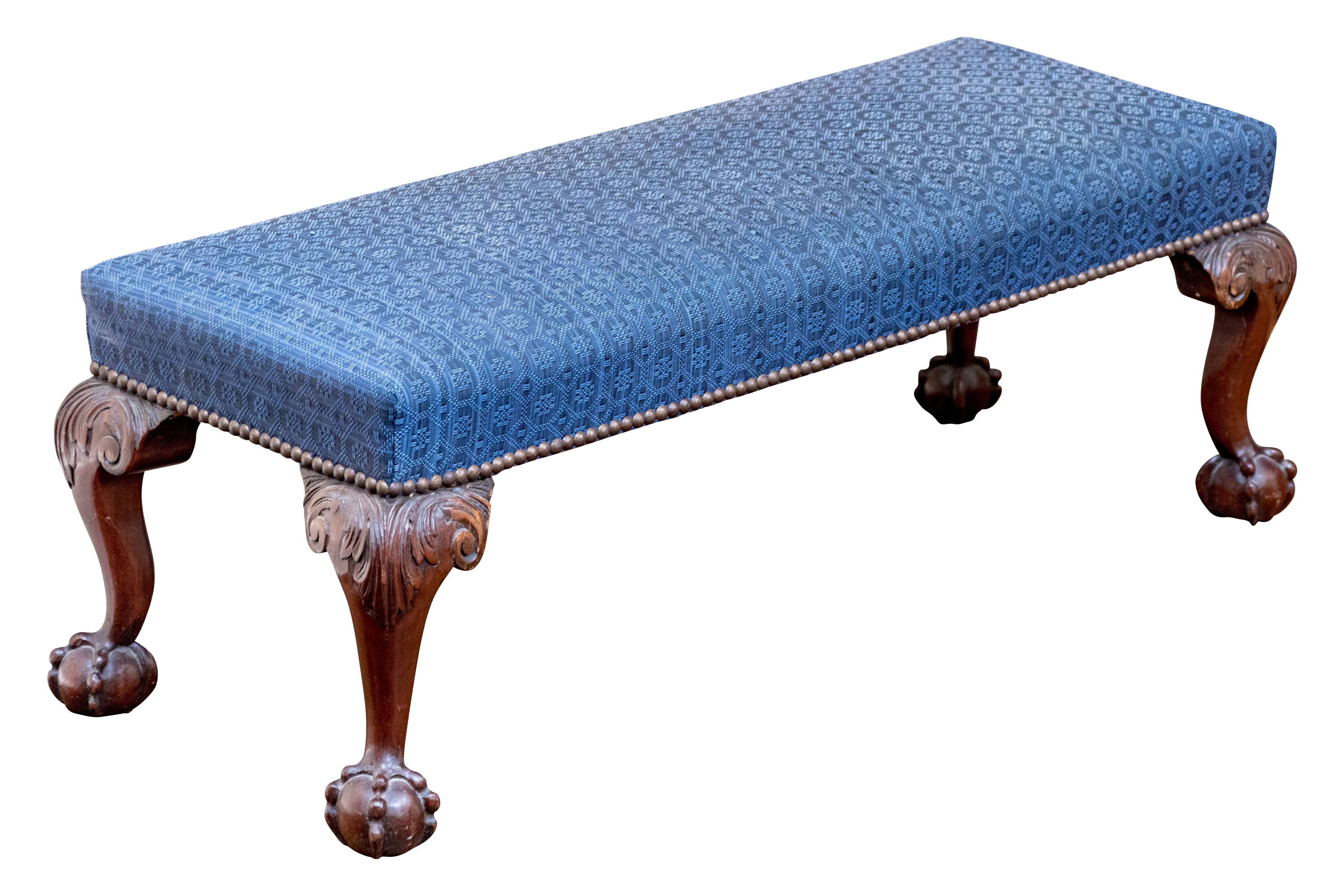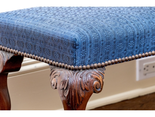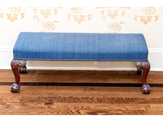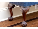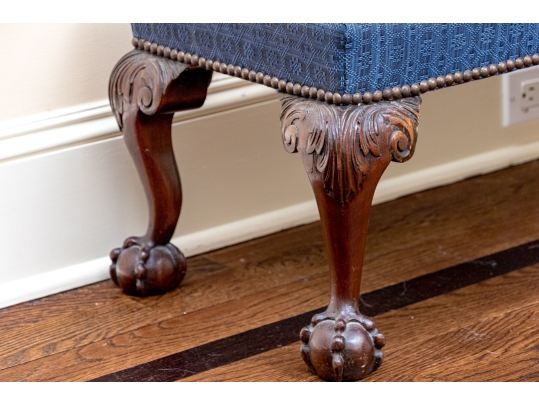 Likely English Antique Chippendale style mahogany upholstered bench with good joinery standing on four heavily carved mahogany legs, well carved ball and claw feet with brass tack nailhead trim.
