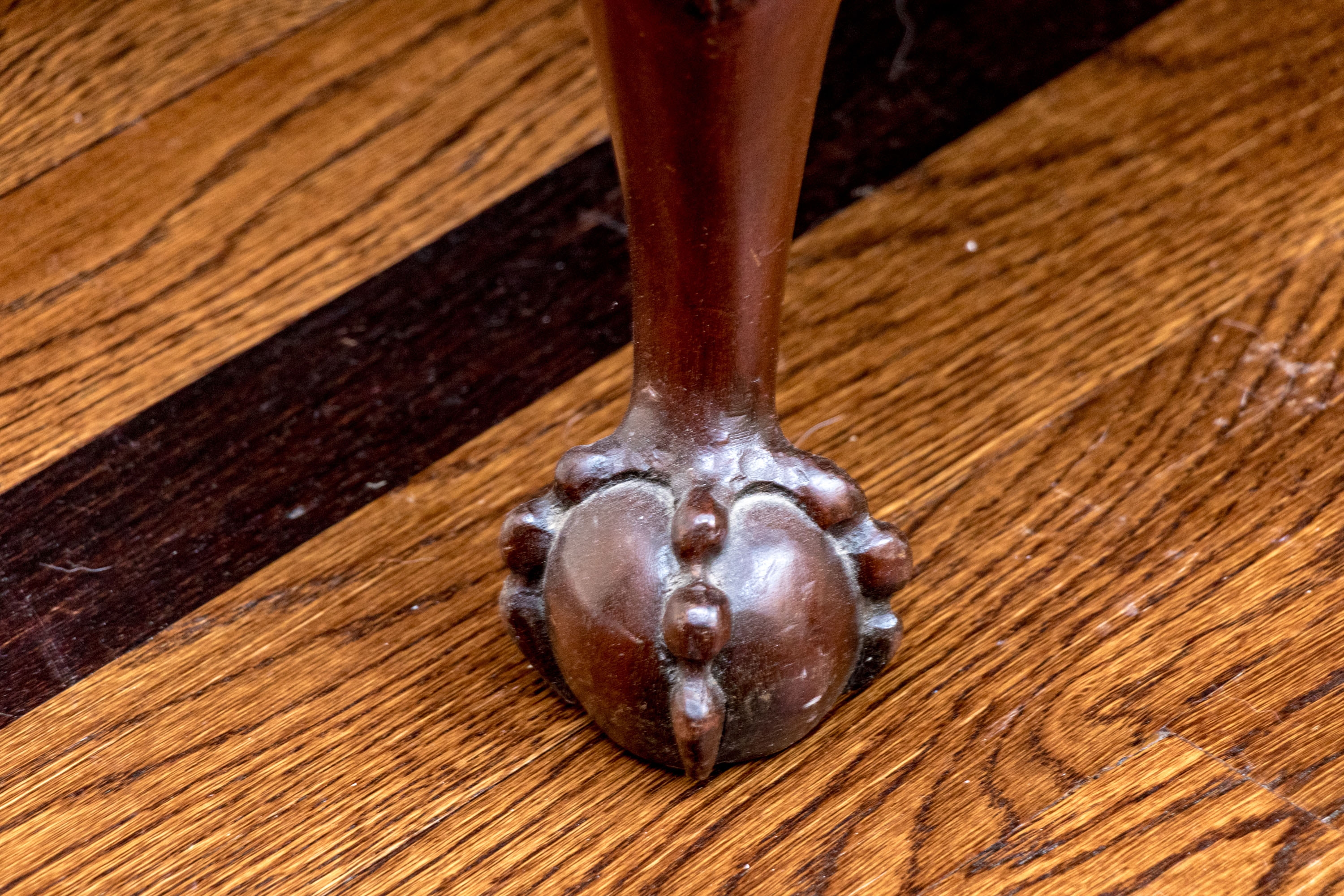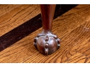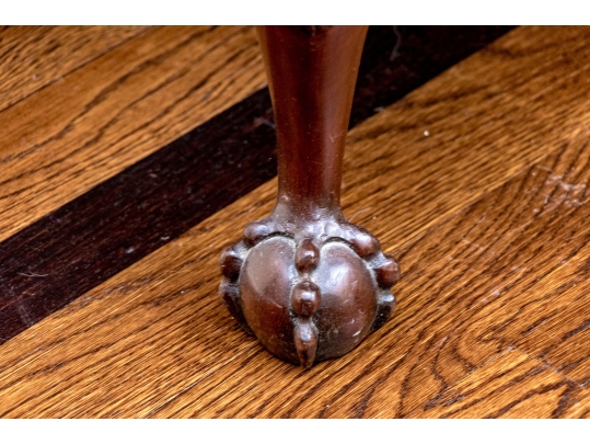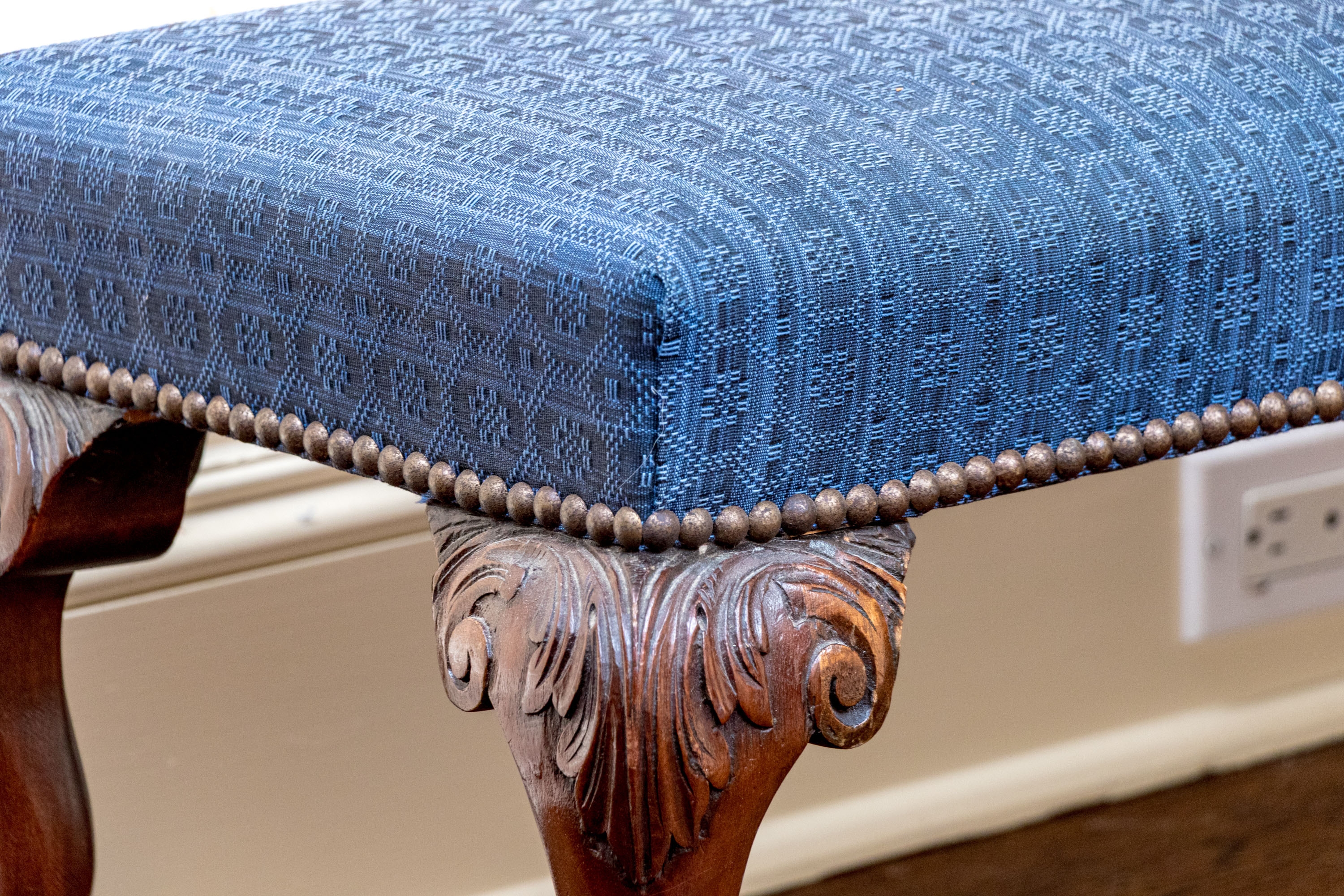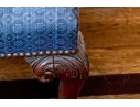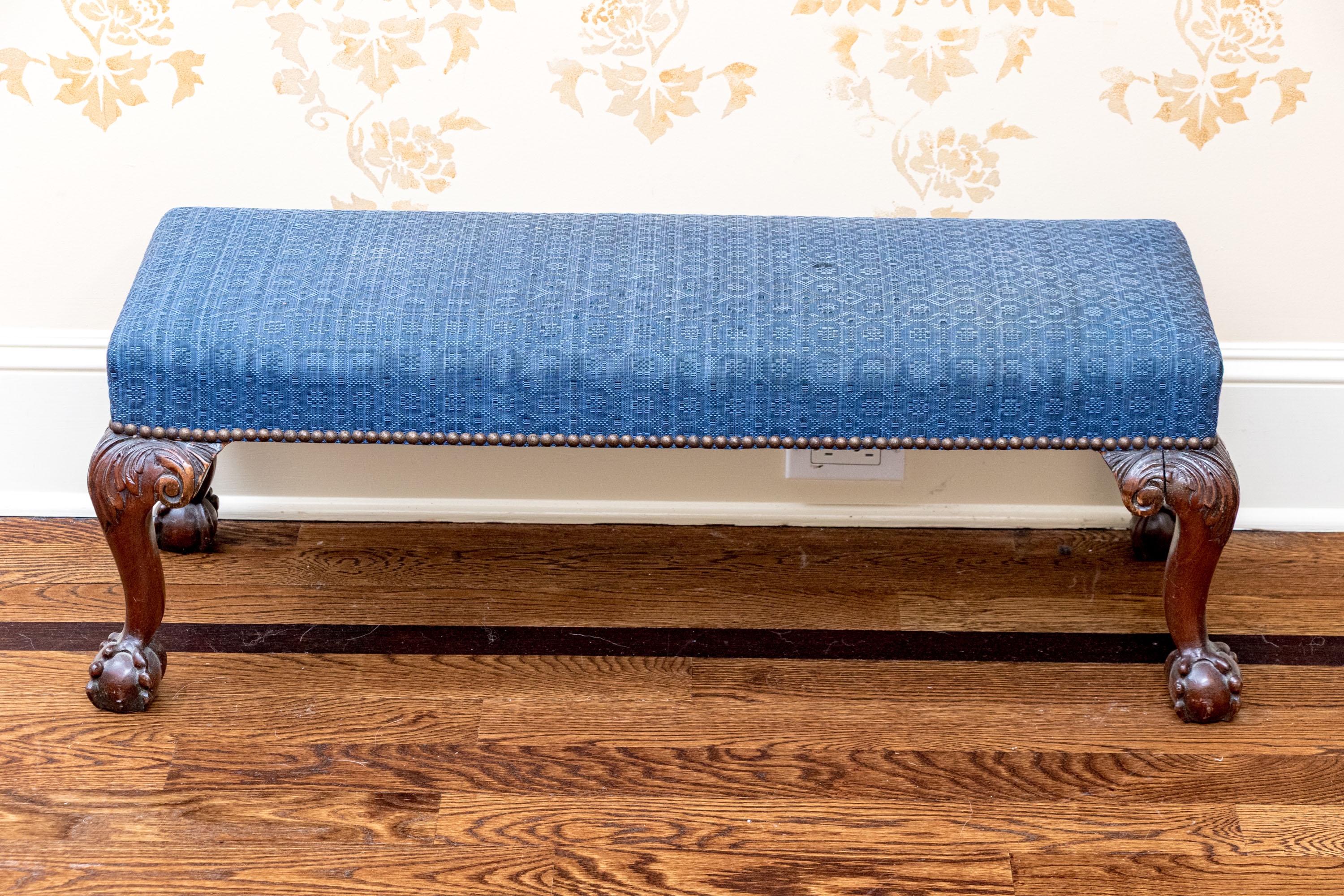 Likely English Antique Chippendale style mahogany upholstered bench with good joinery standing on four heavily carved mahogany legs, well carved ball and claw feet with brass tack nailhead trim.