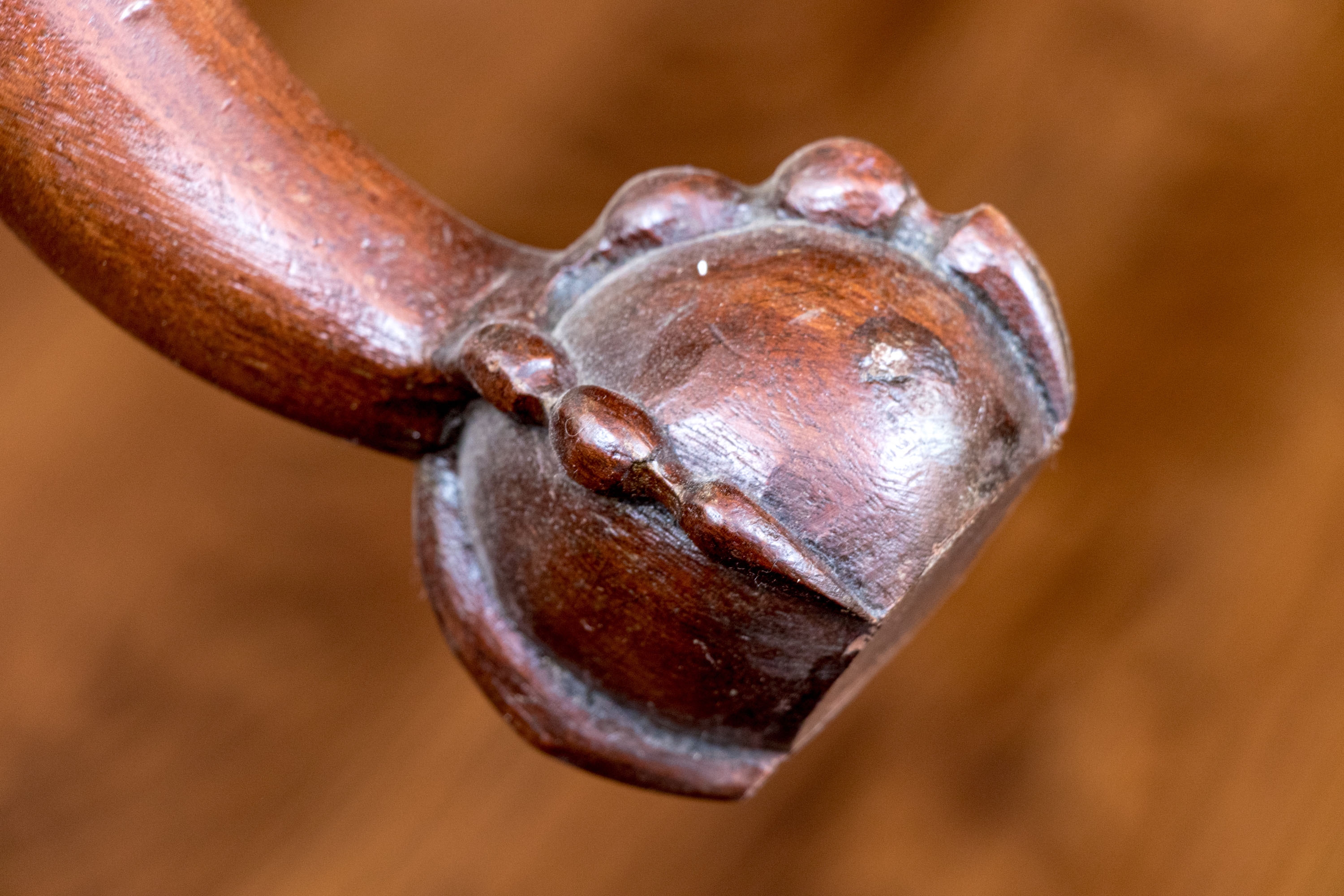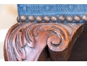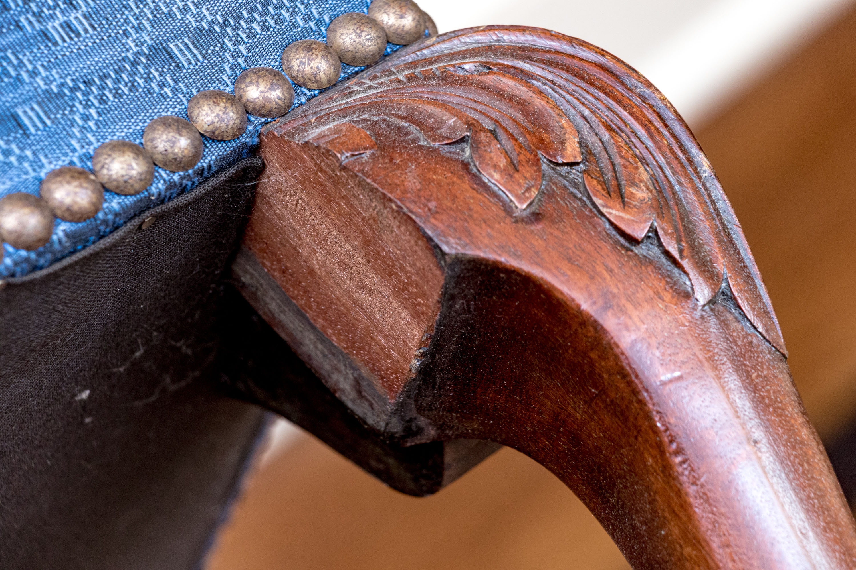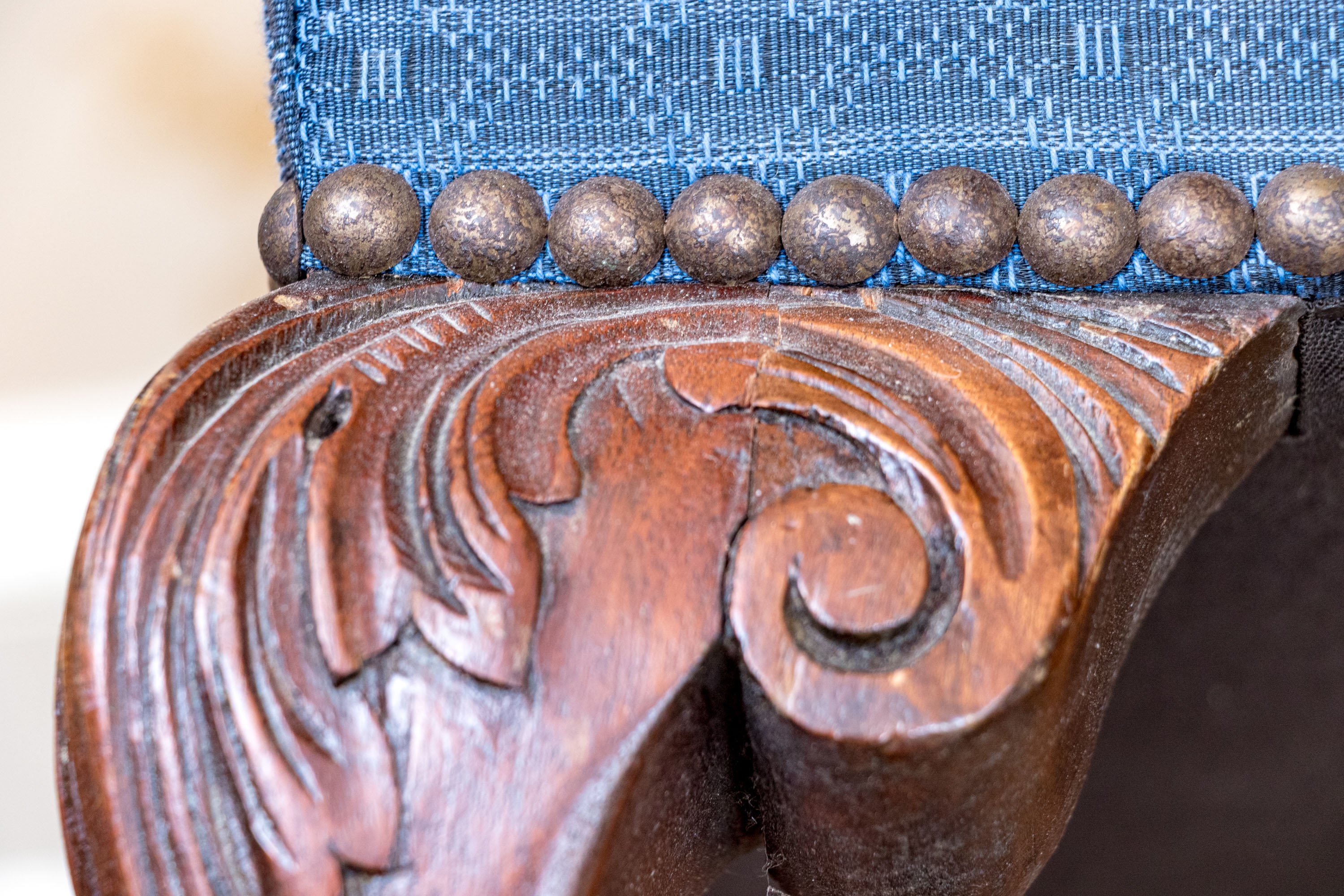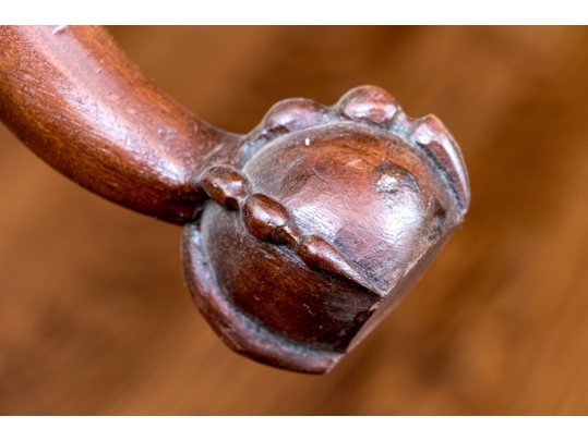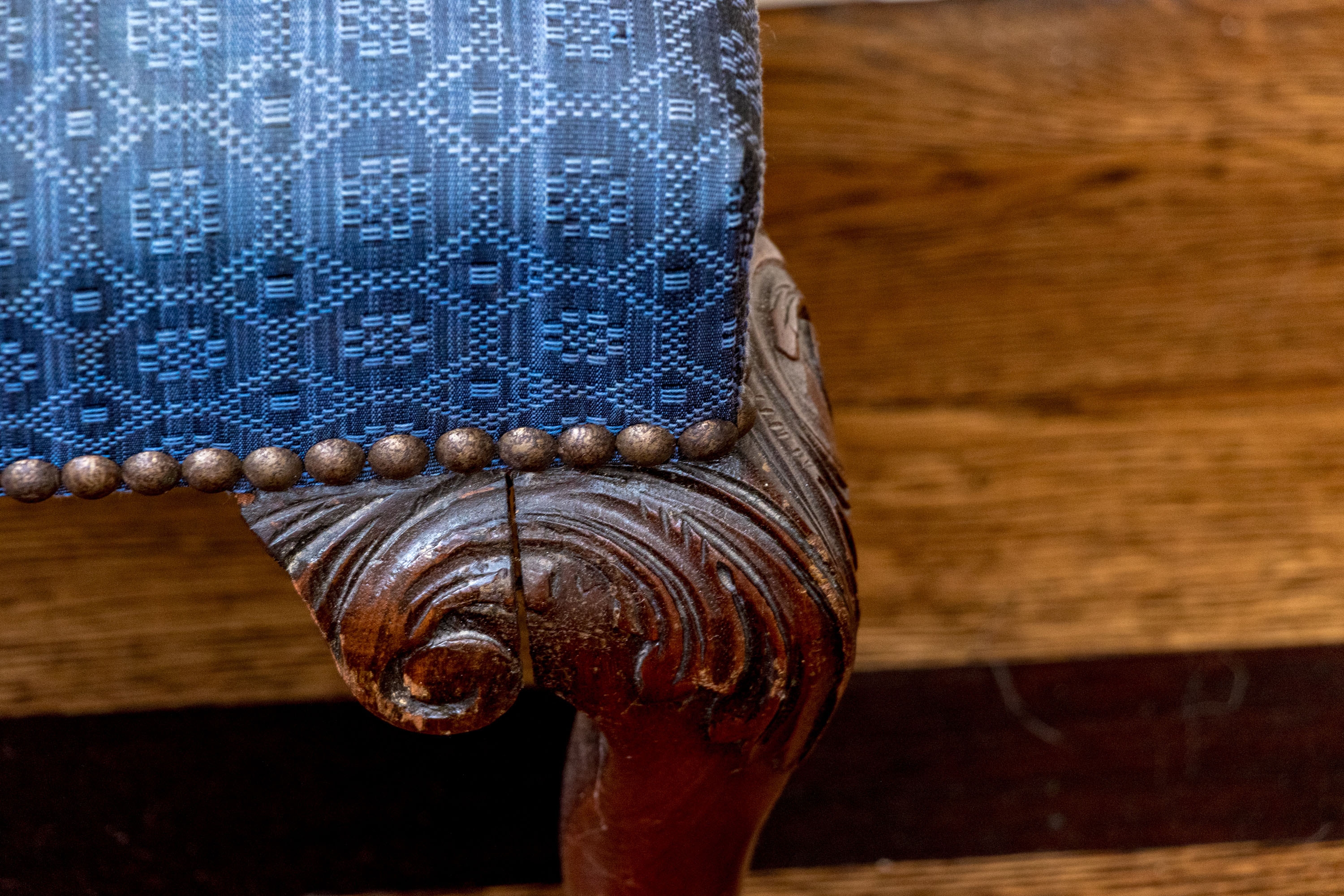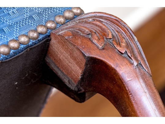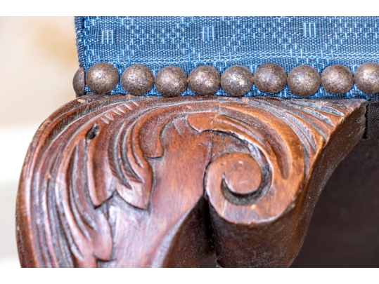 Condition: Please see detail photos. One of the carved legs has a loss to the scroll on the upper leg. Two other legs have a stable age crack in the same place. The upholstery with a few spots to the fabric. While some level of restoration may be desired, it is not strictly necessary as the presentation is exceptional.