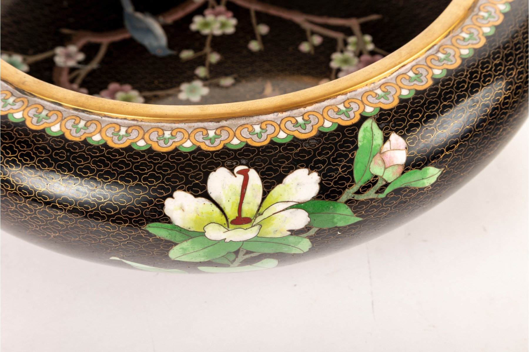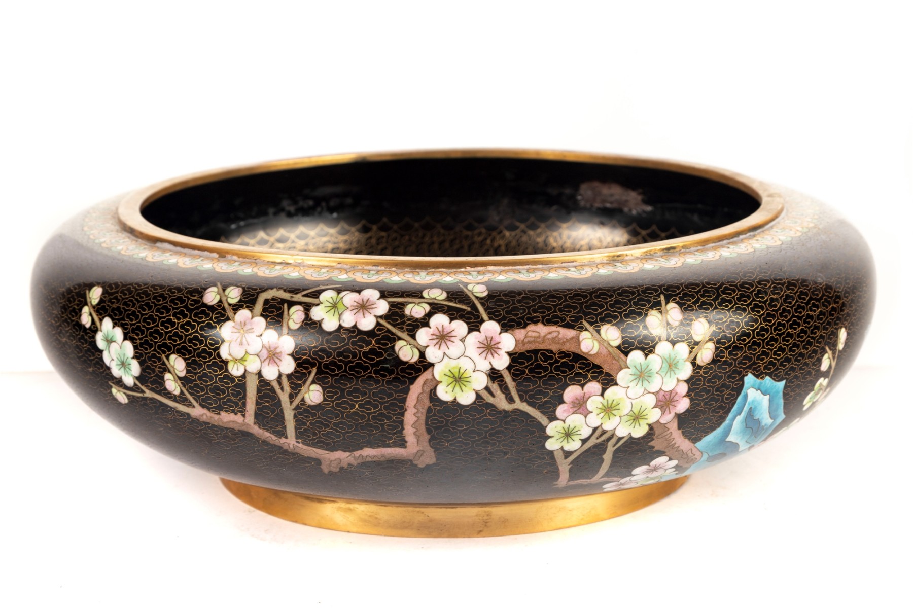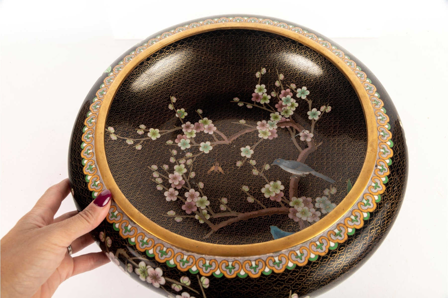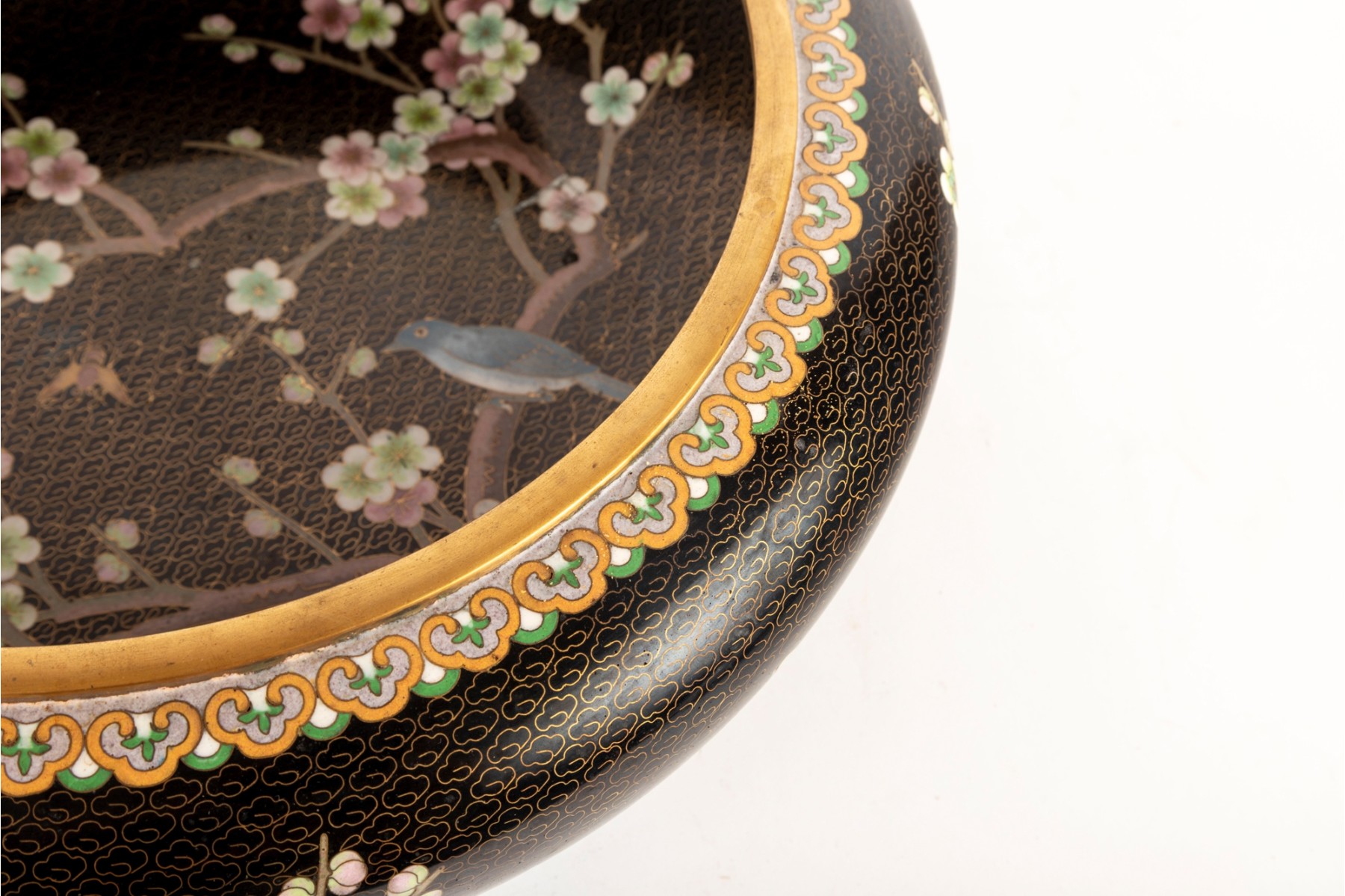This antique Cloisonné bowl features a black background with vivid cherry blossom and leaf enamel designs in pink, green, and white over brass. The intricate patterns are meticulously crafted, with the interior sporting a matching design.