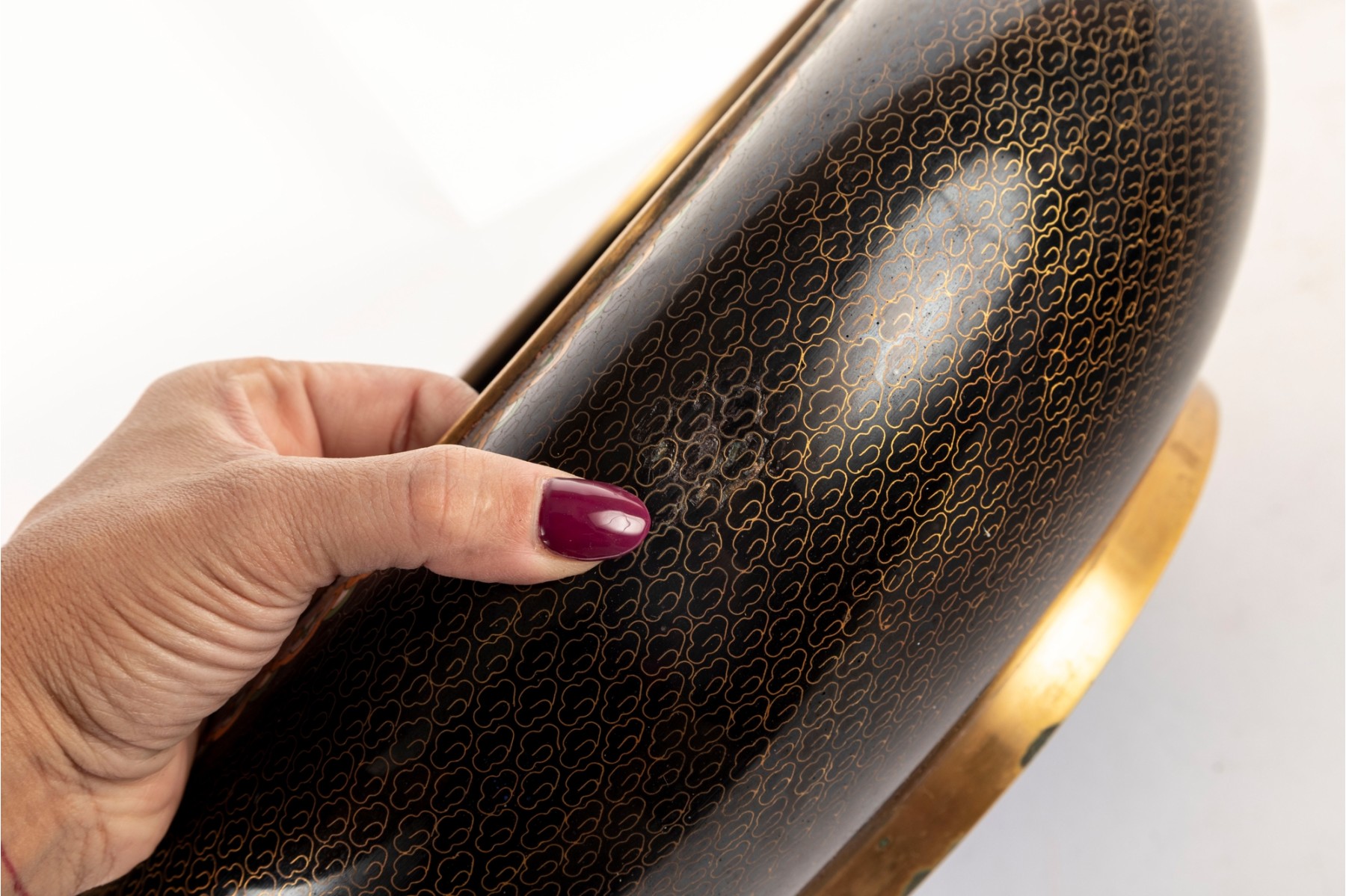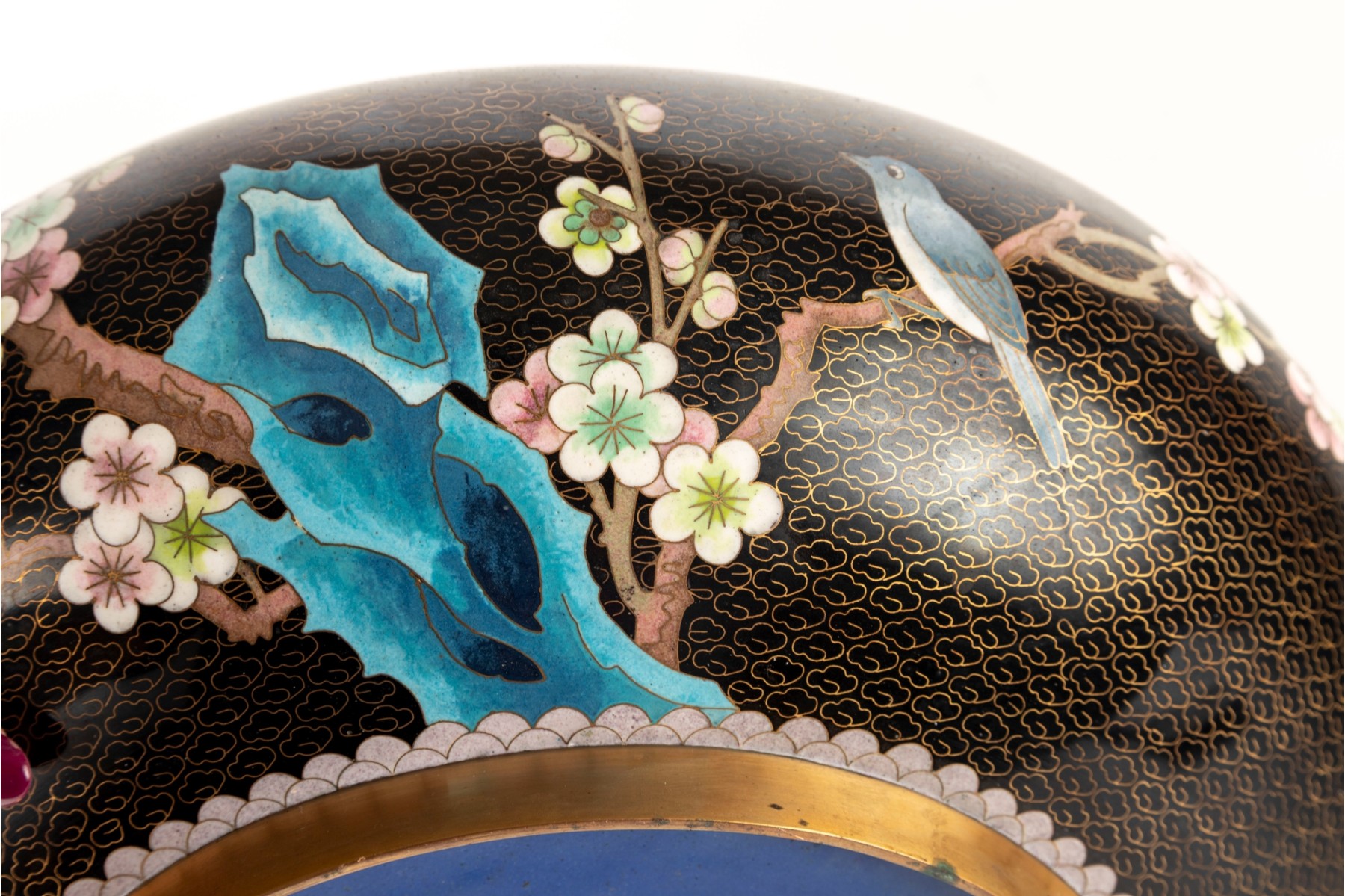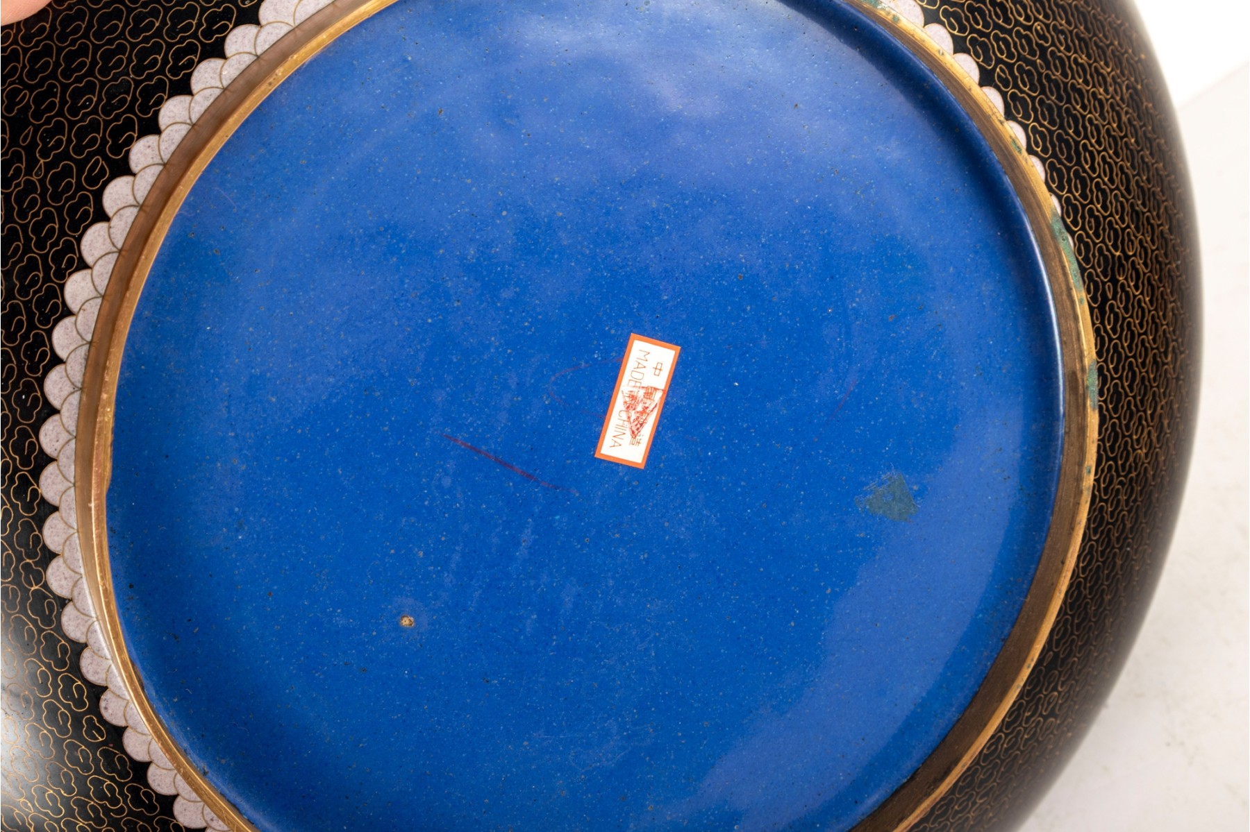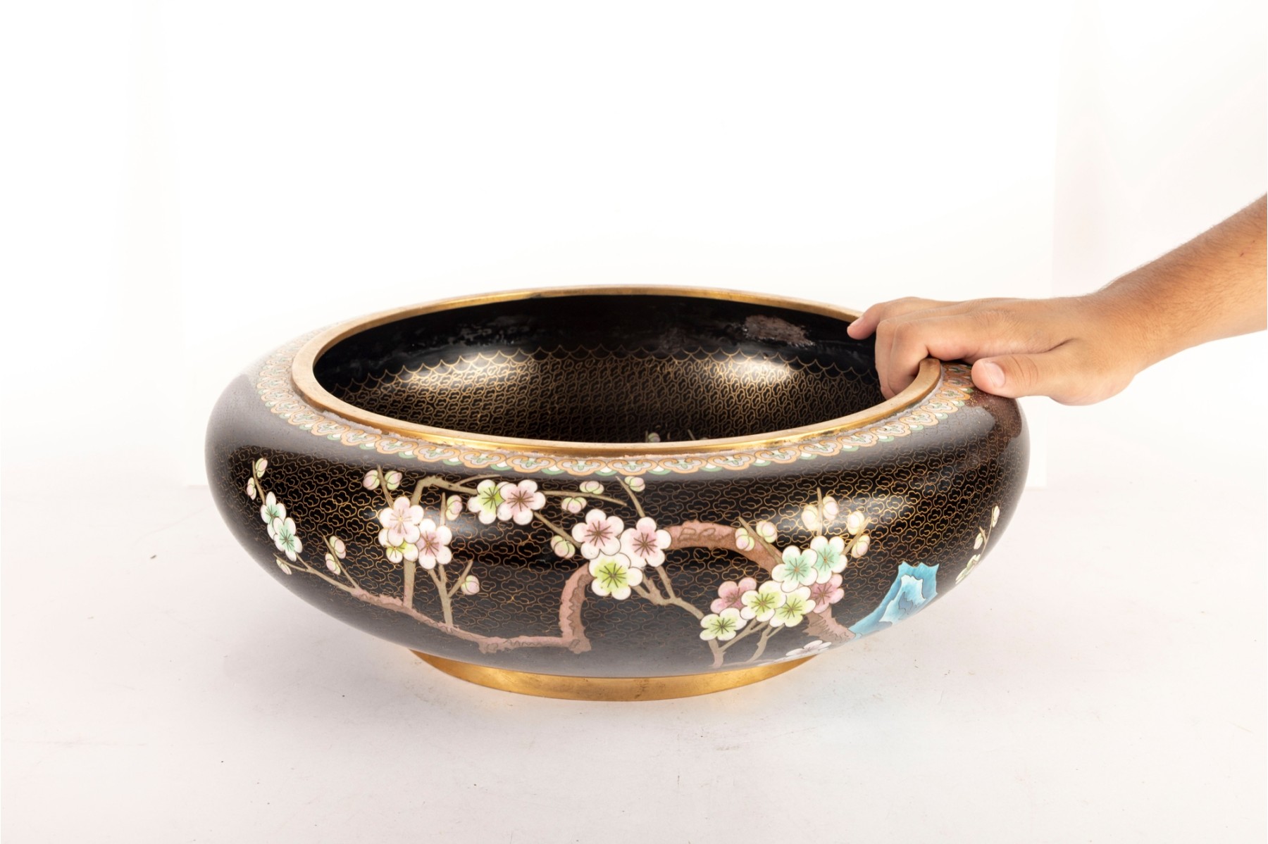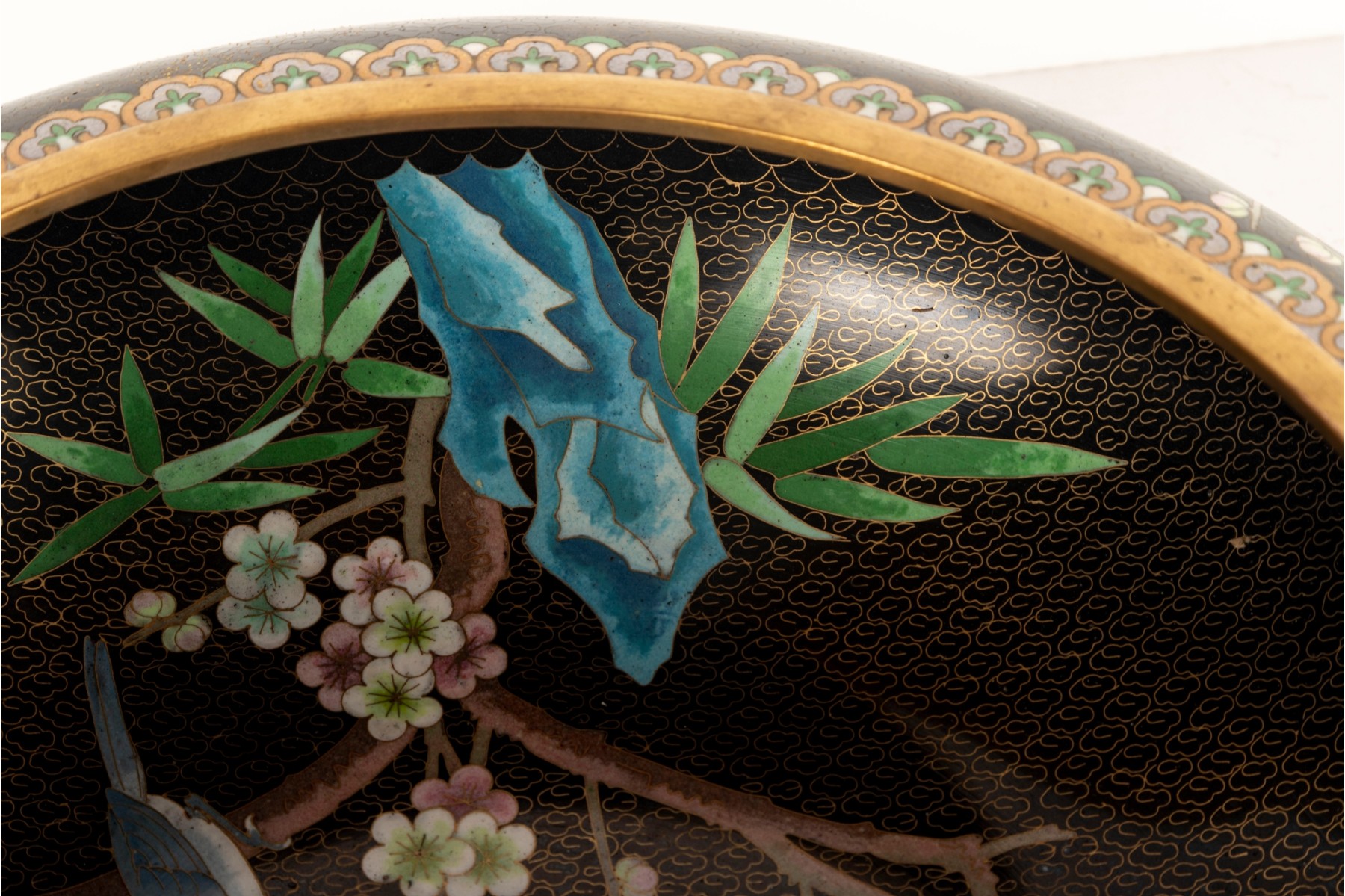 This antique Cloisonné bowl features a black background with vivid cherry blossom and leaf enamel designs in pink, green, and white over brass. The intricate patterns are meticulously crafted, with the interior sporting a matching design.