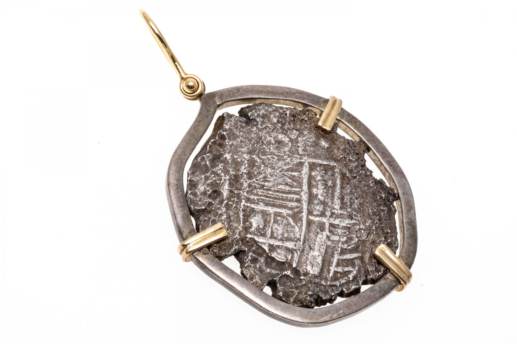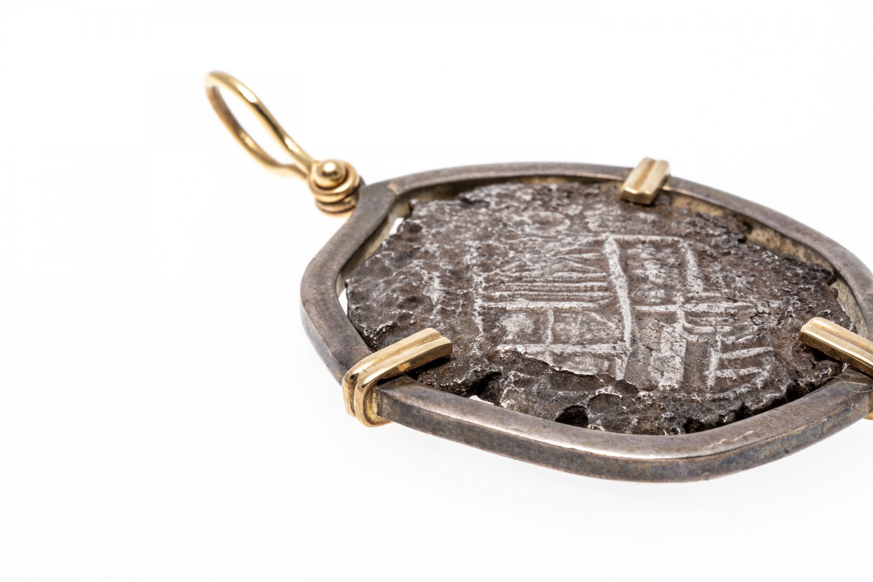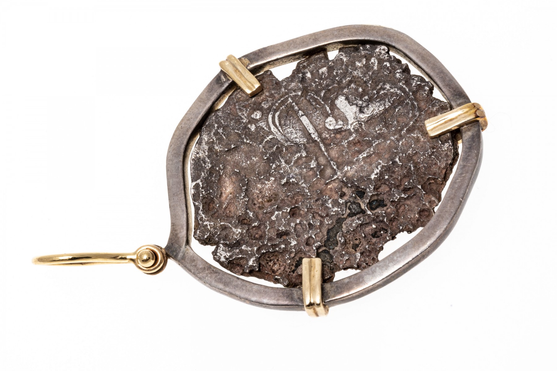 Antique coin pendant. Displayed within the open style sterling silver pendant is an antique coin. Accenting the sterling pendant are 14K yellow gold prong style accents and bale.