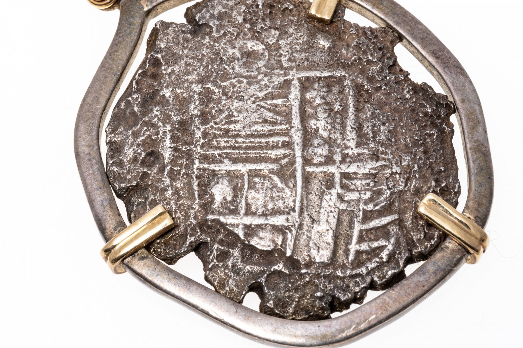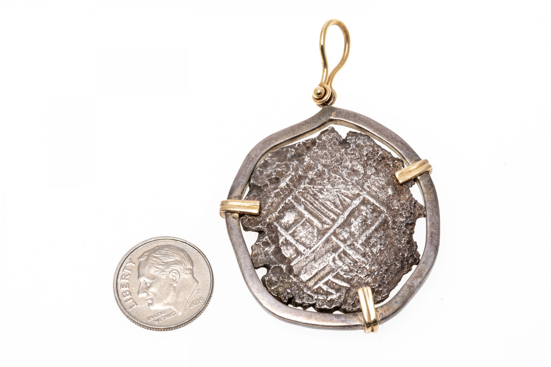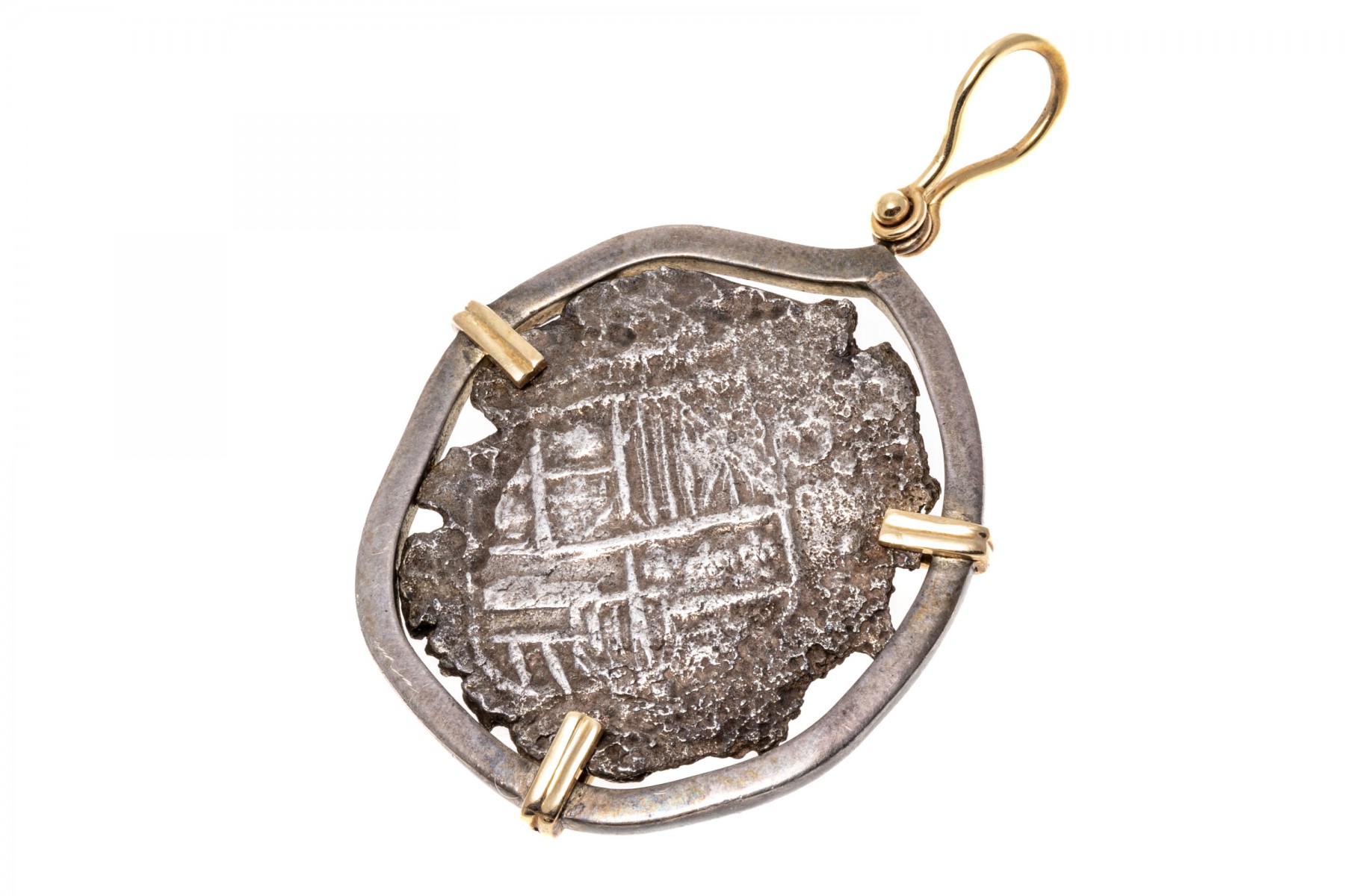 Antique coin pendant. Displayed within the open style sterling silver pendant is an antique coin. Accenting the sterling pendant are 14K yellow gold prong style accents and bale.