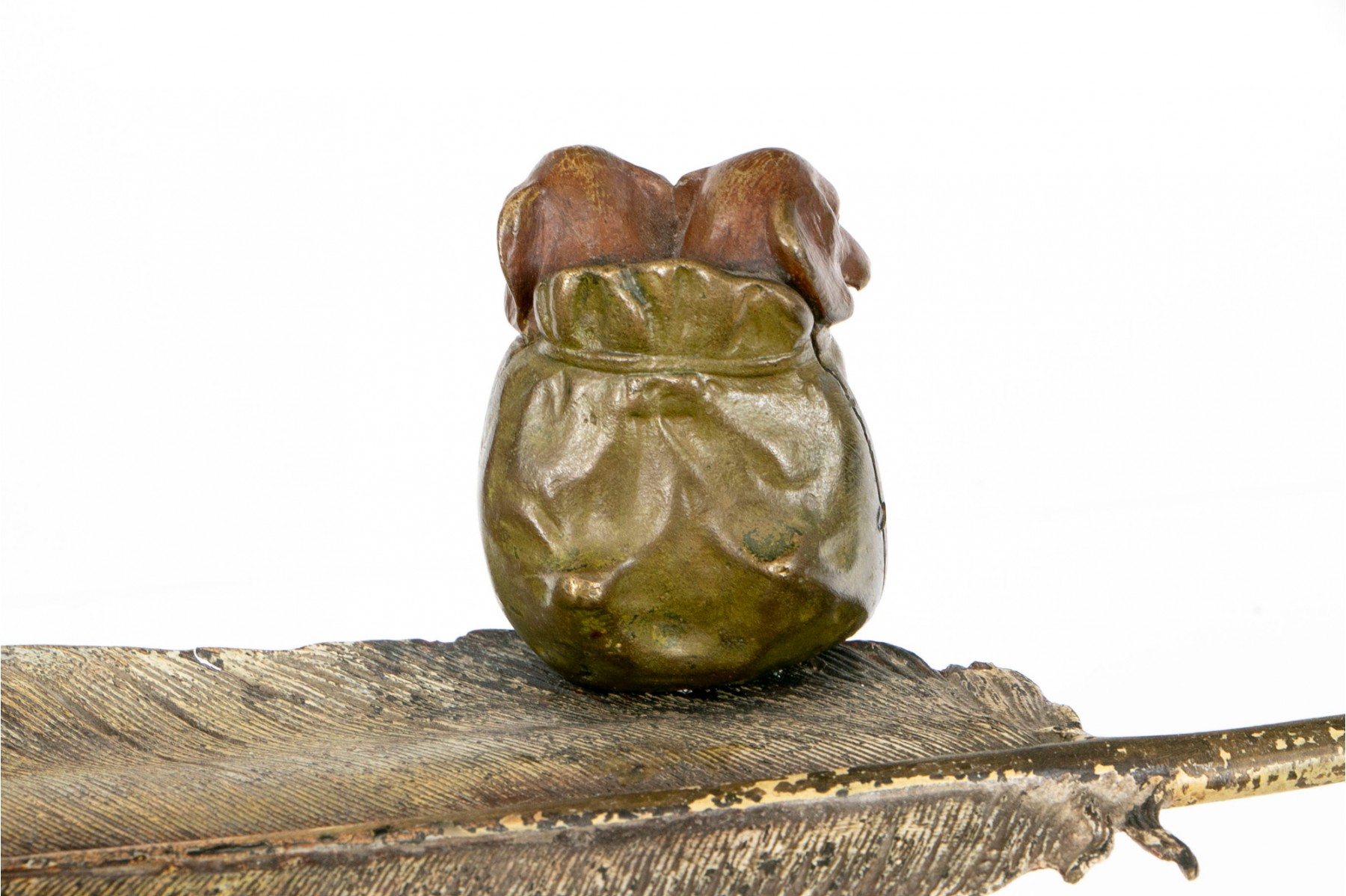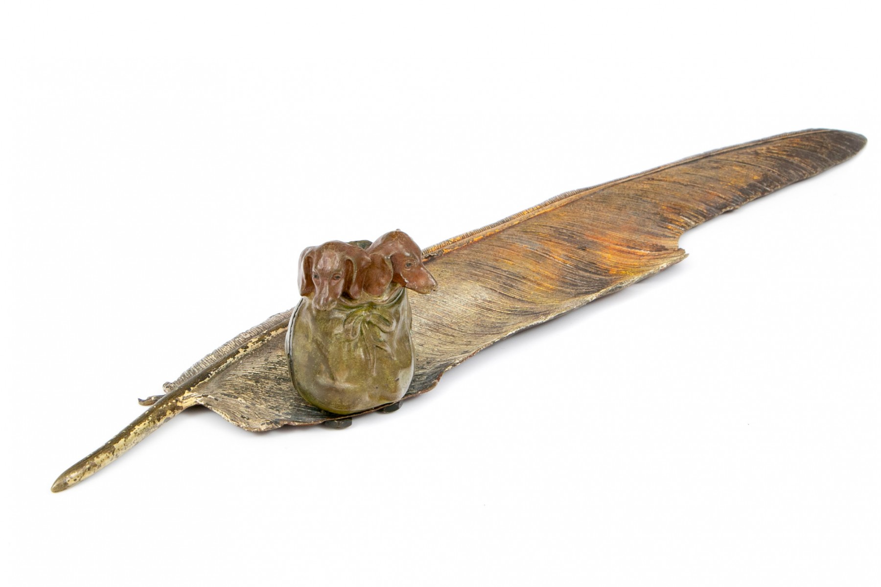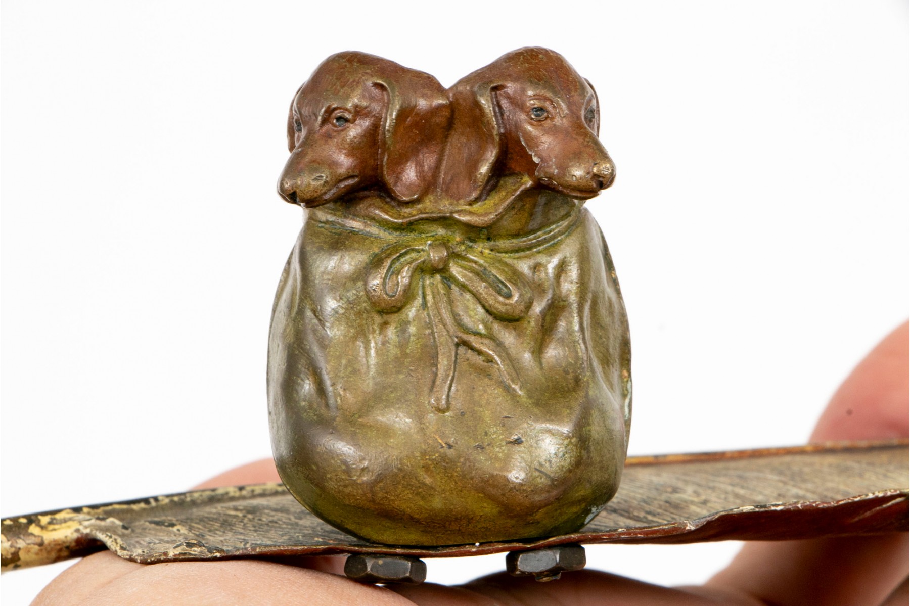 Antique cold painted Vienna bronze figure depicting two puppies in a sack attached to a pen quill. Unsigned.