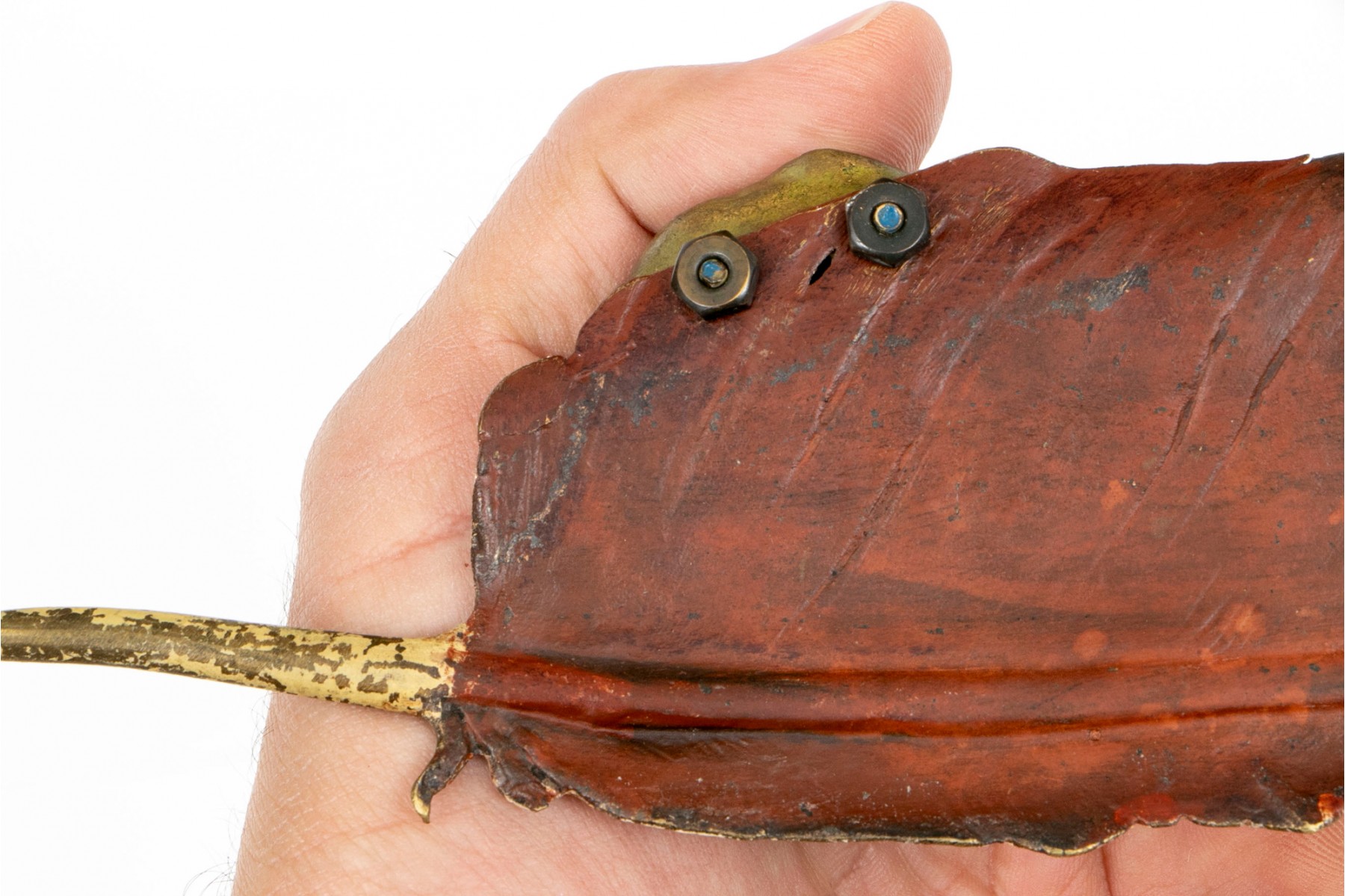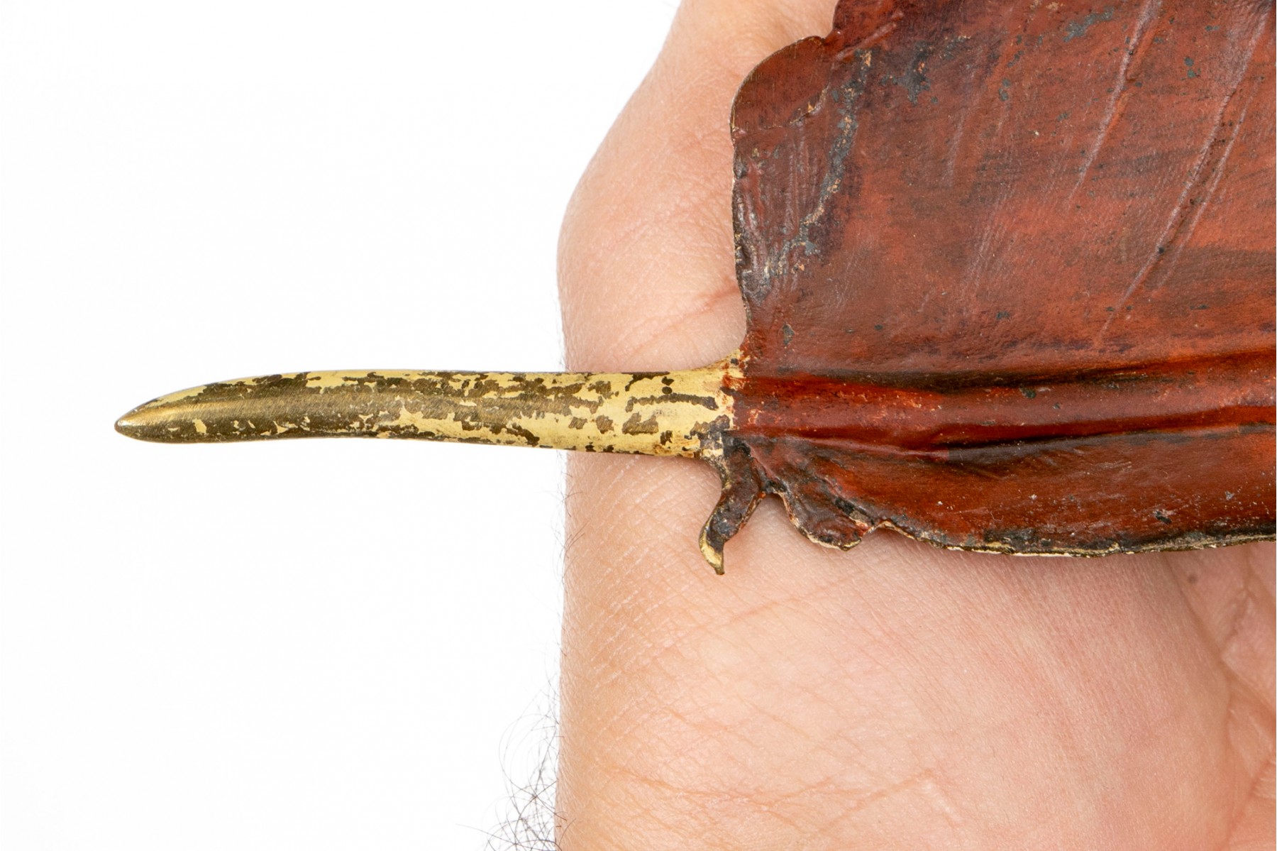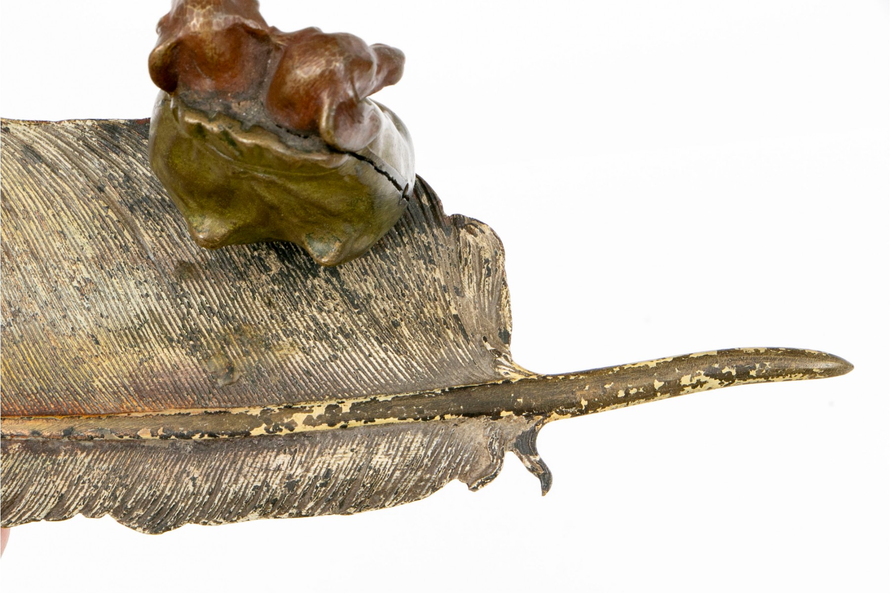 Antique cold painted Vienna bronze figure depicting two puppies in a sack attached to a pen quill. Unsigned.