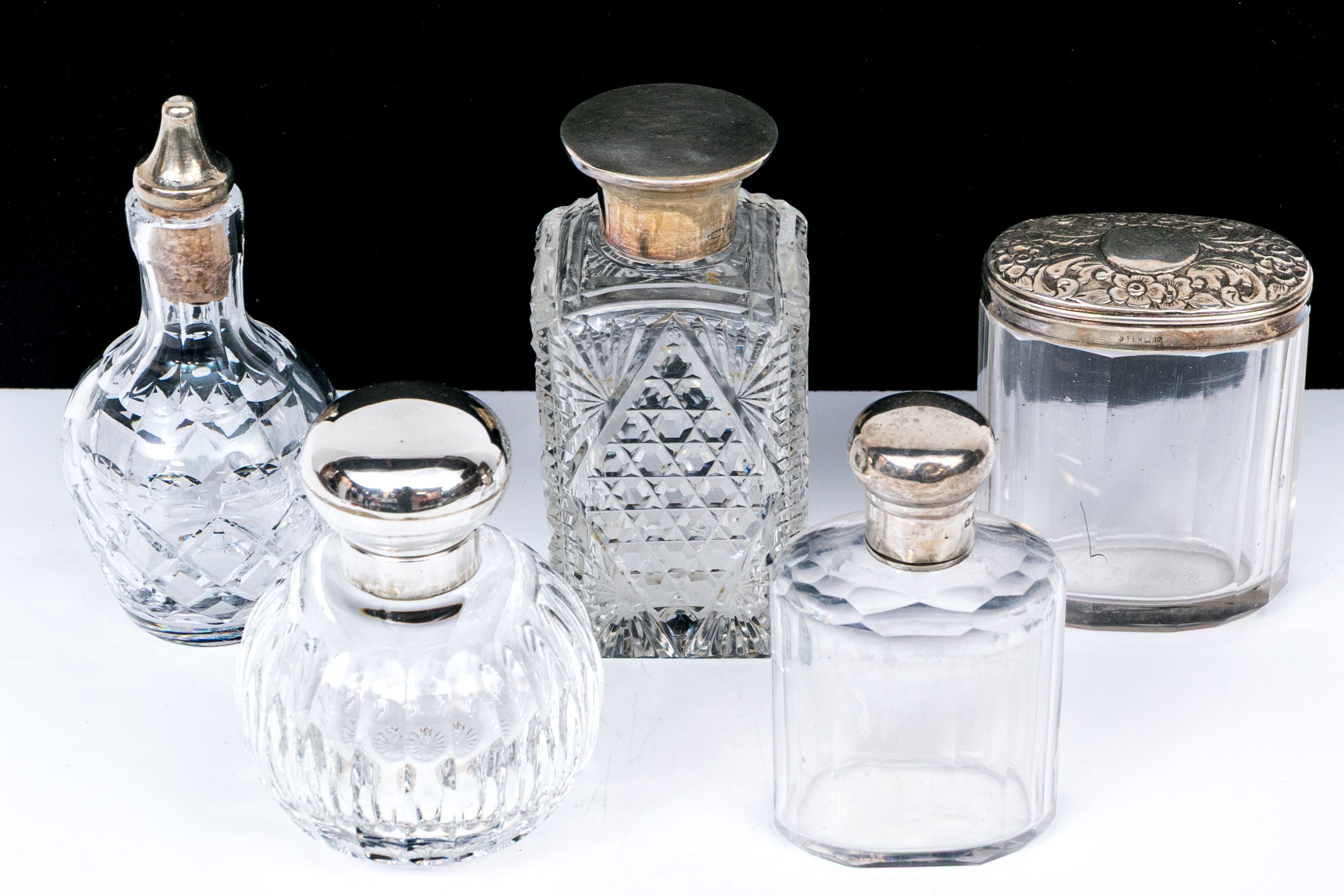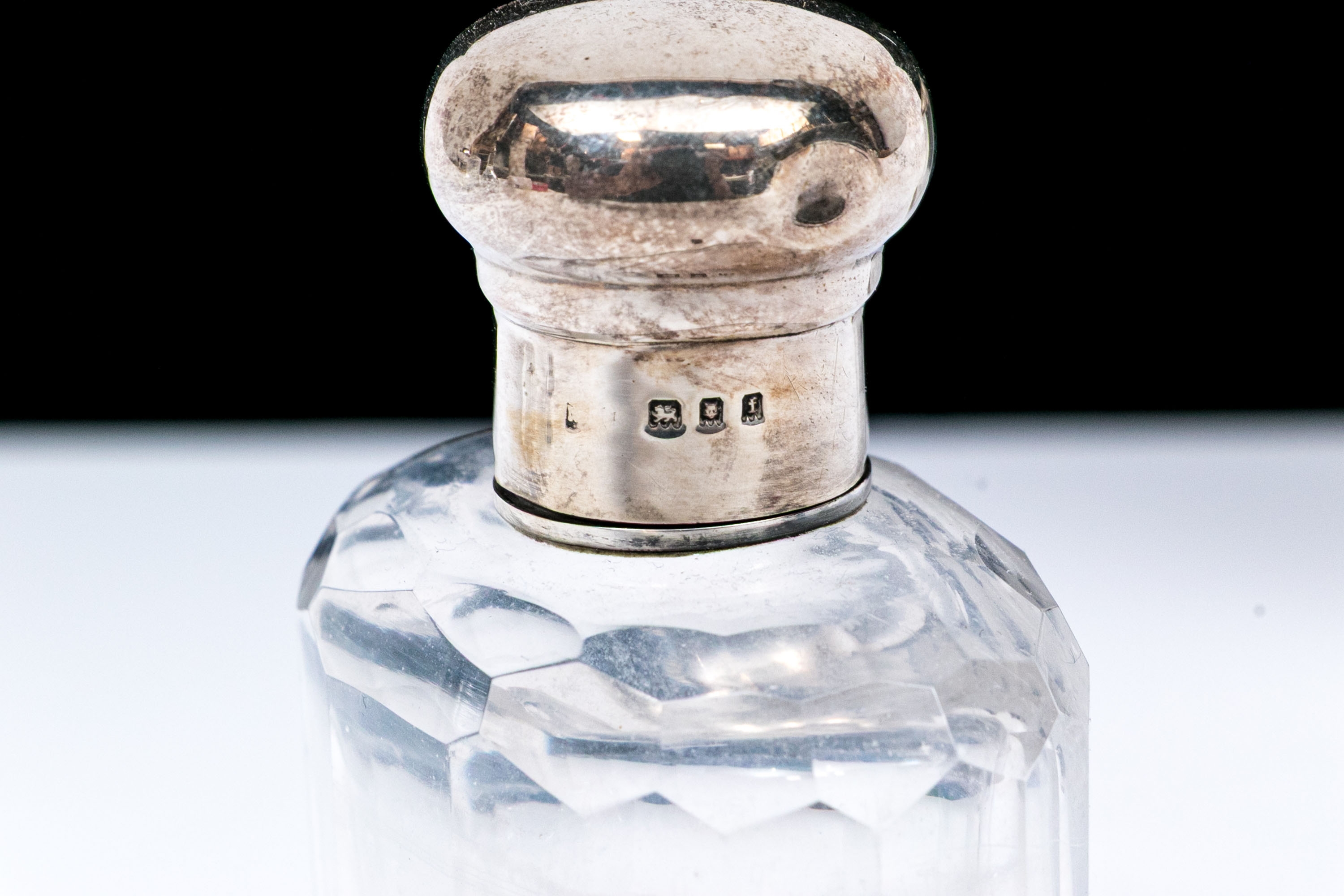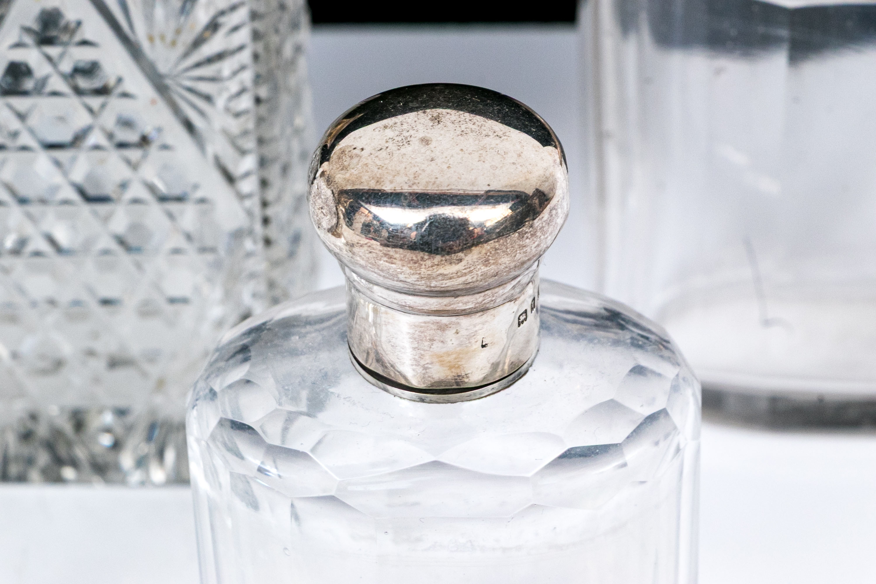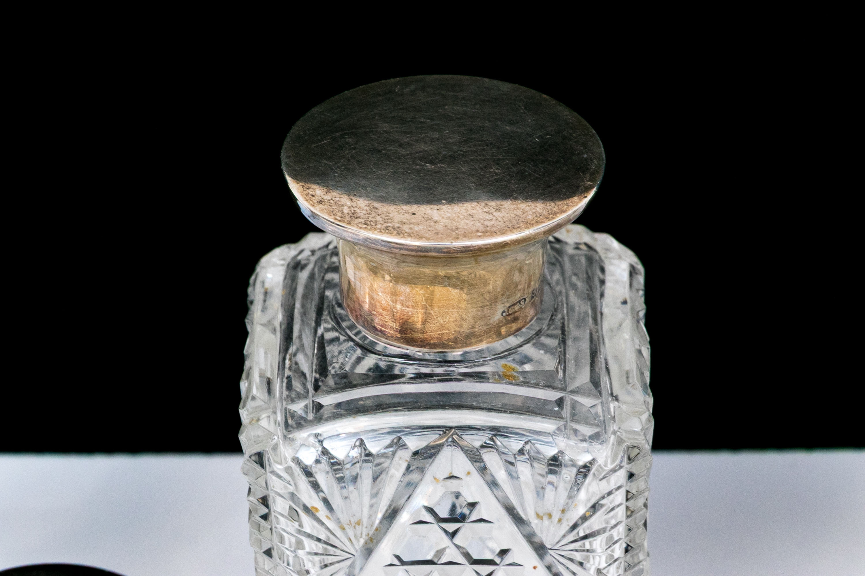 - Sterling lidded bottle, square form with cut crystal and circular sterling lid.