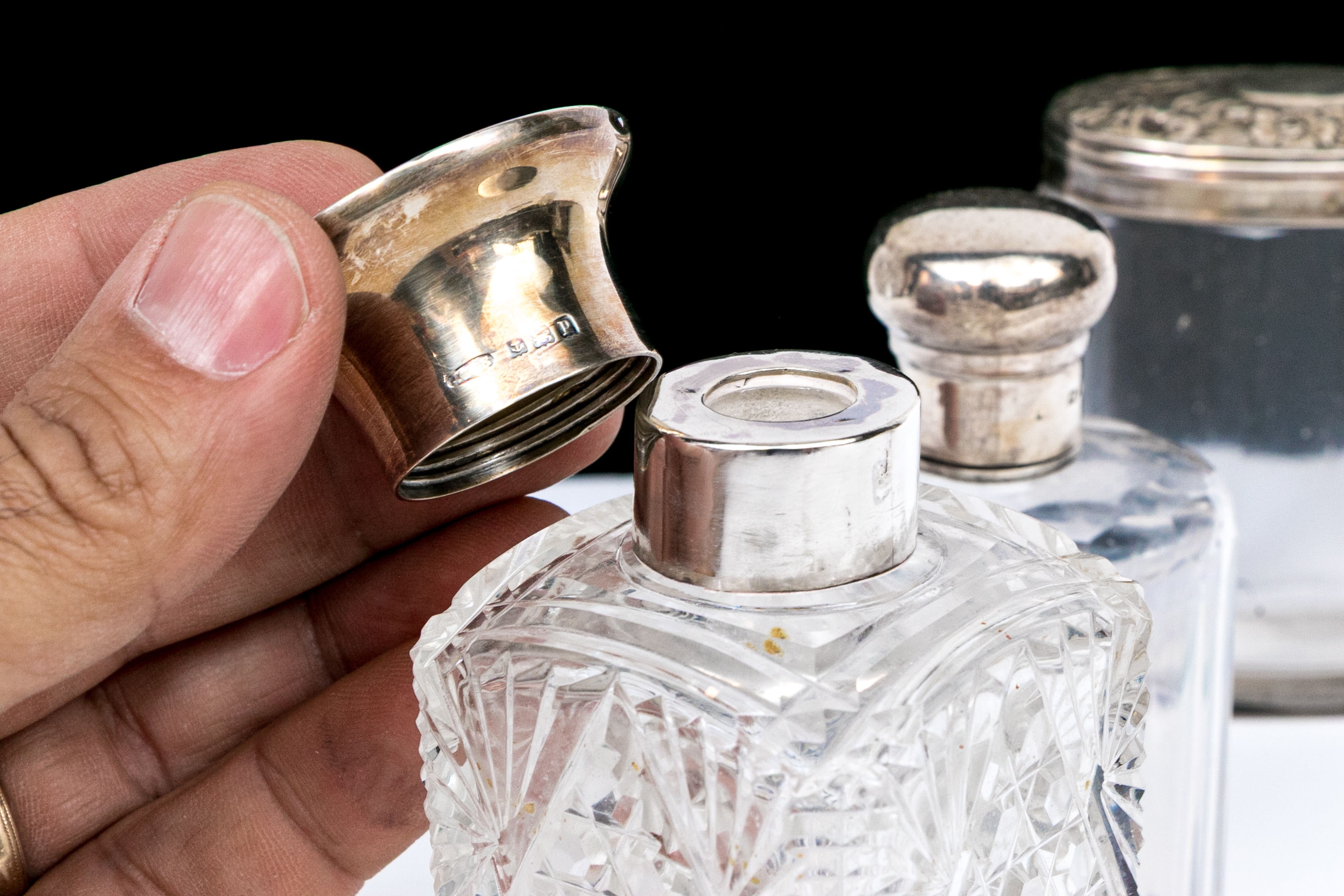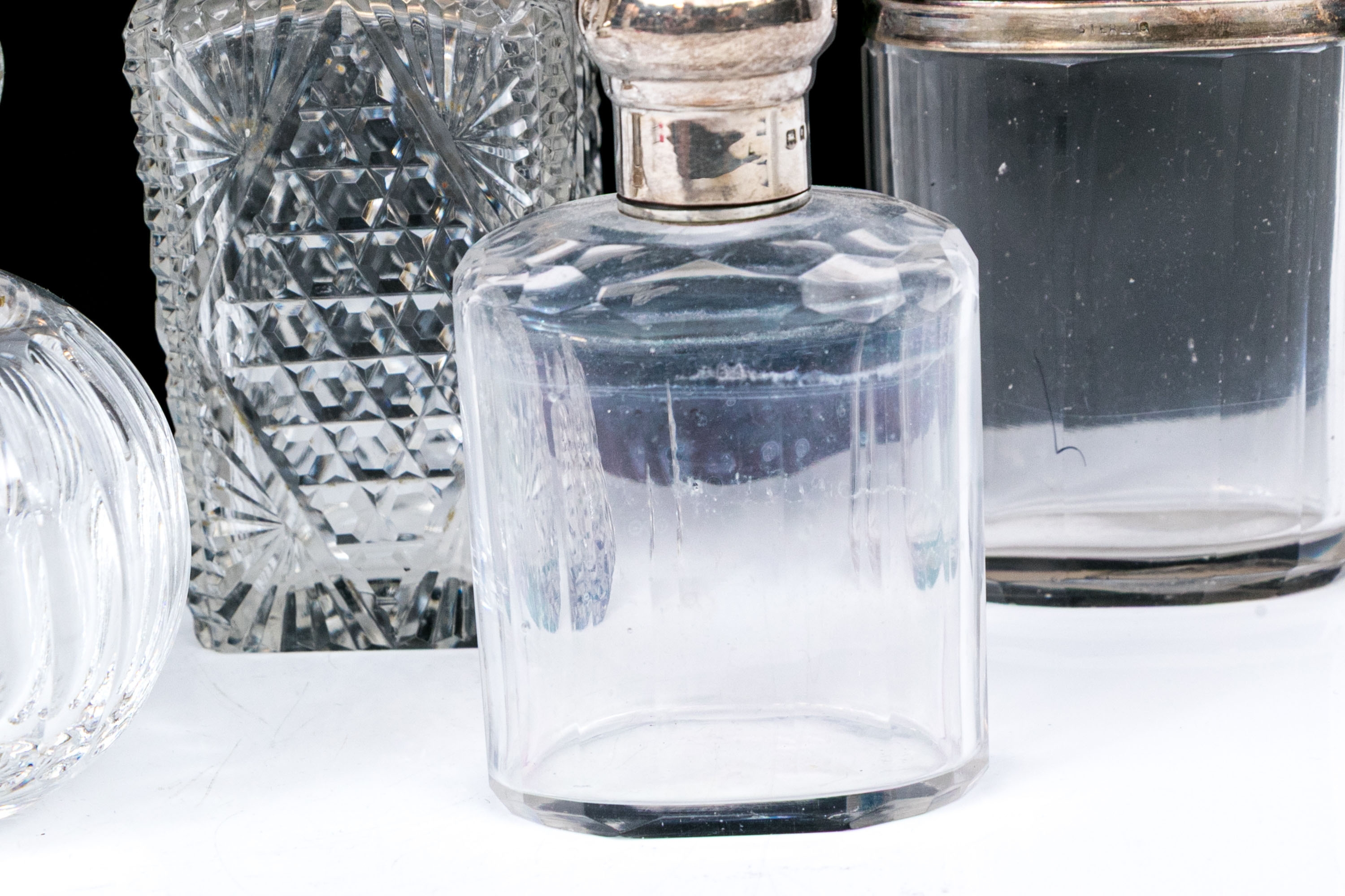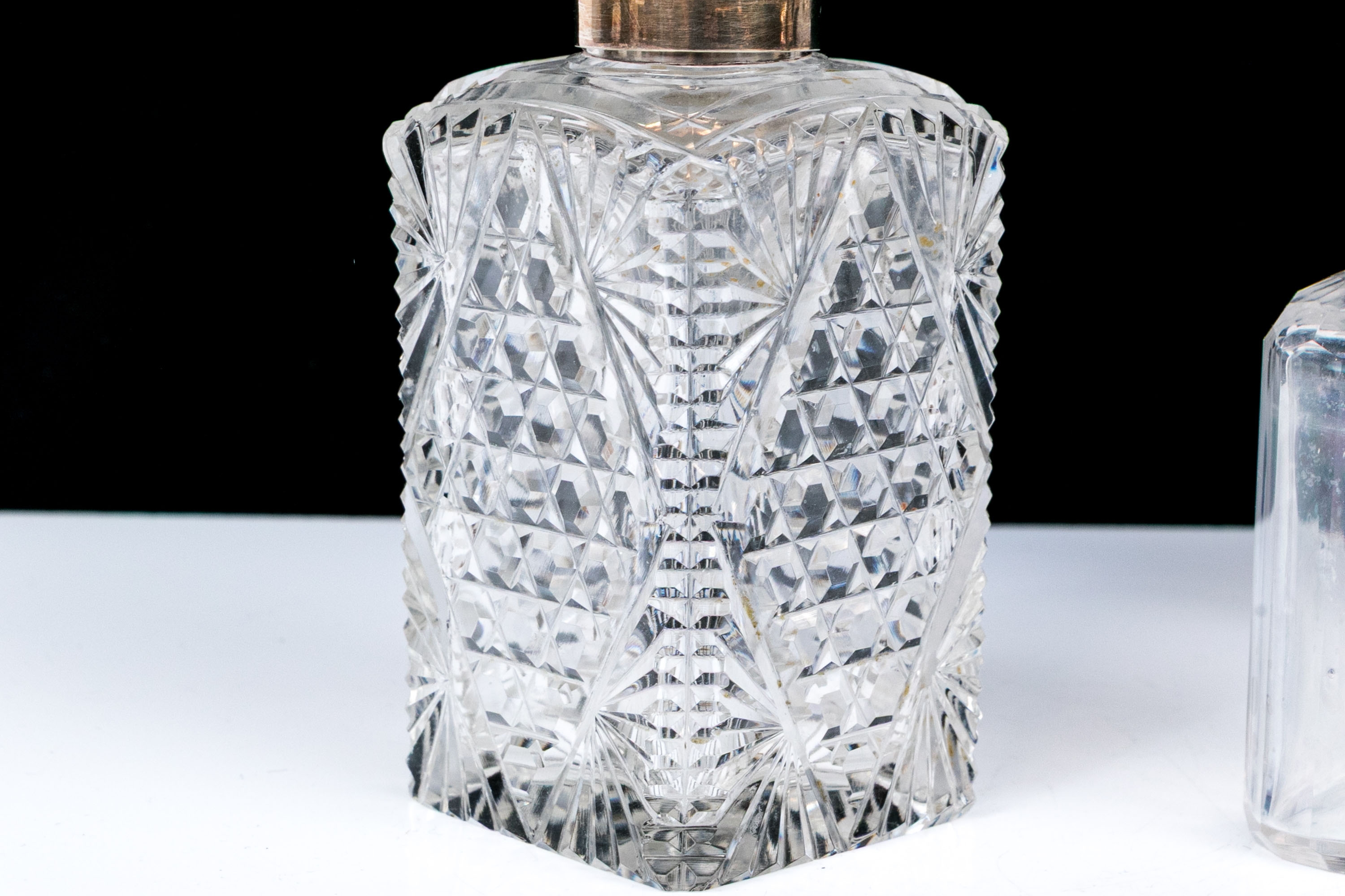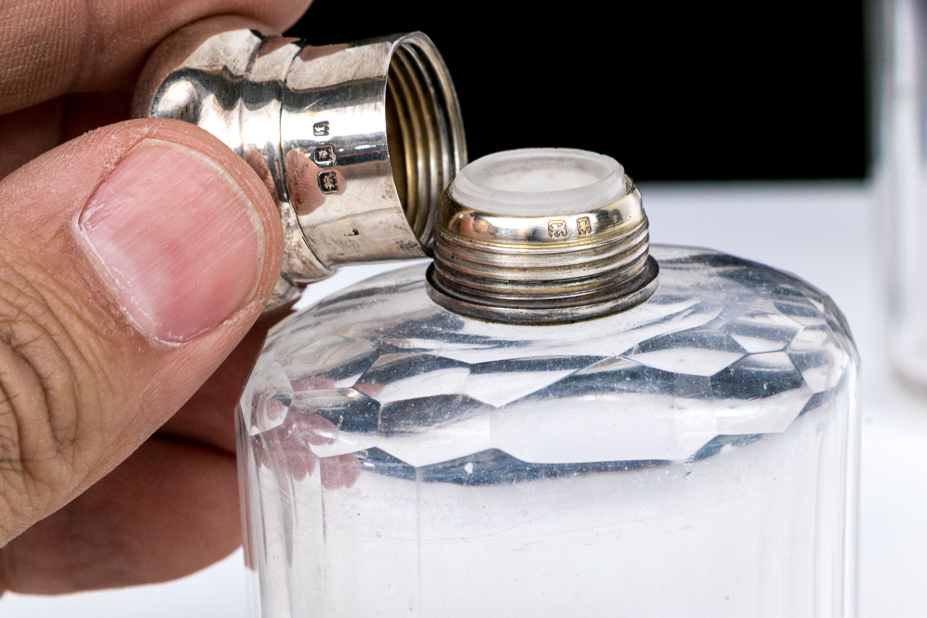 - Sterling lidded bottle, square form with cut crystal and circular sterling lid.
