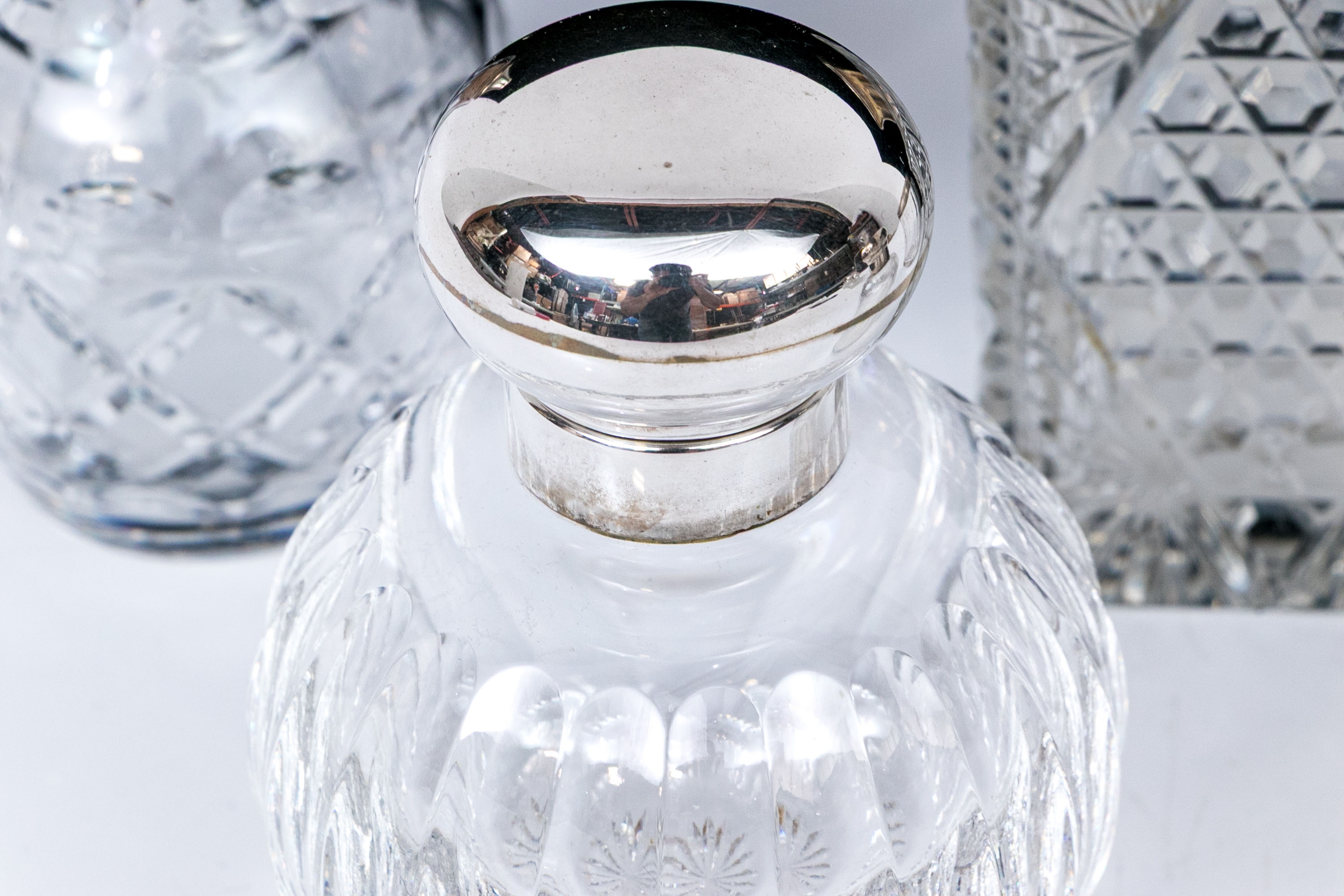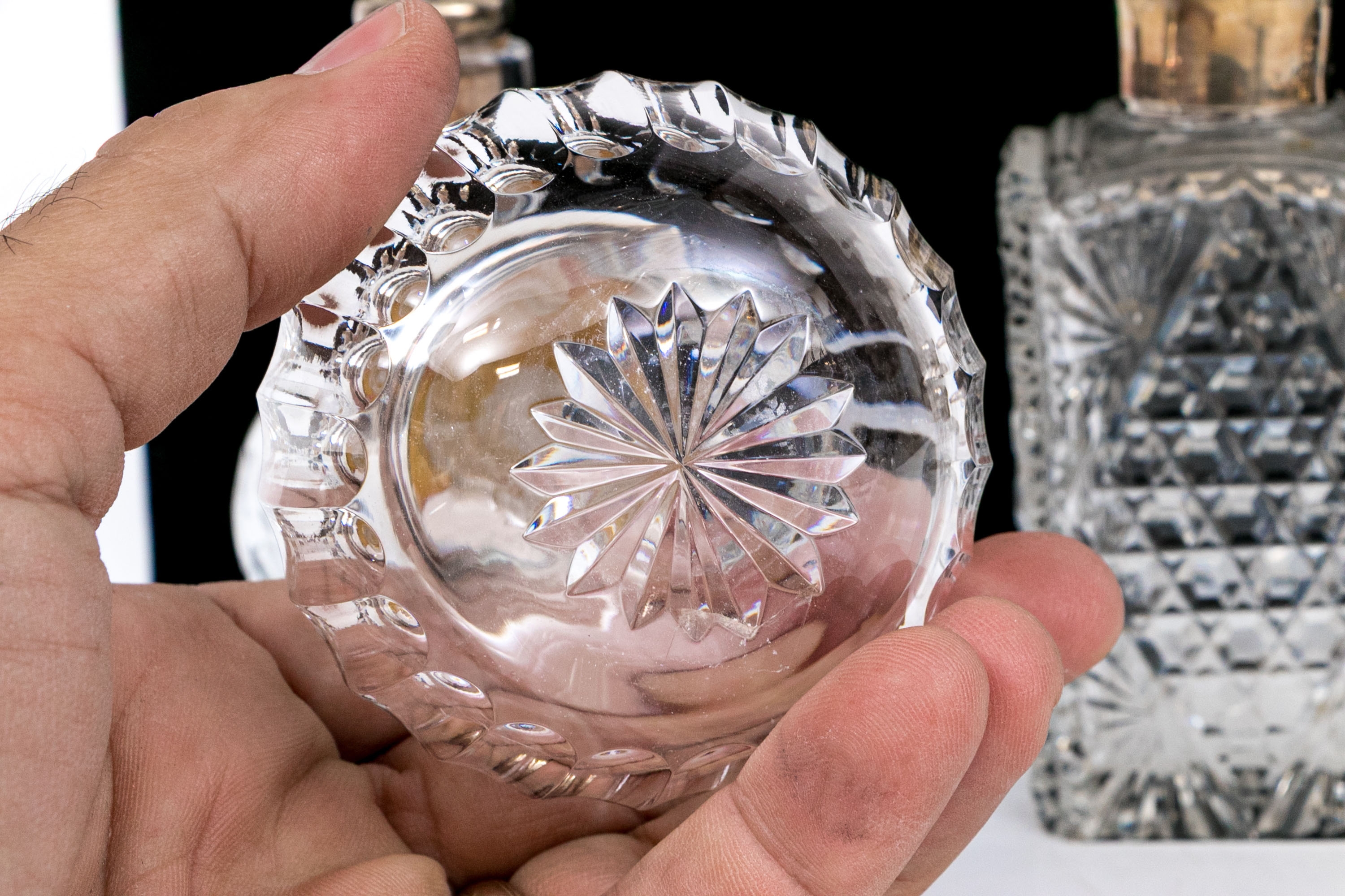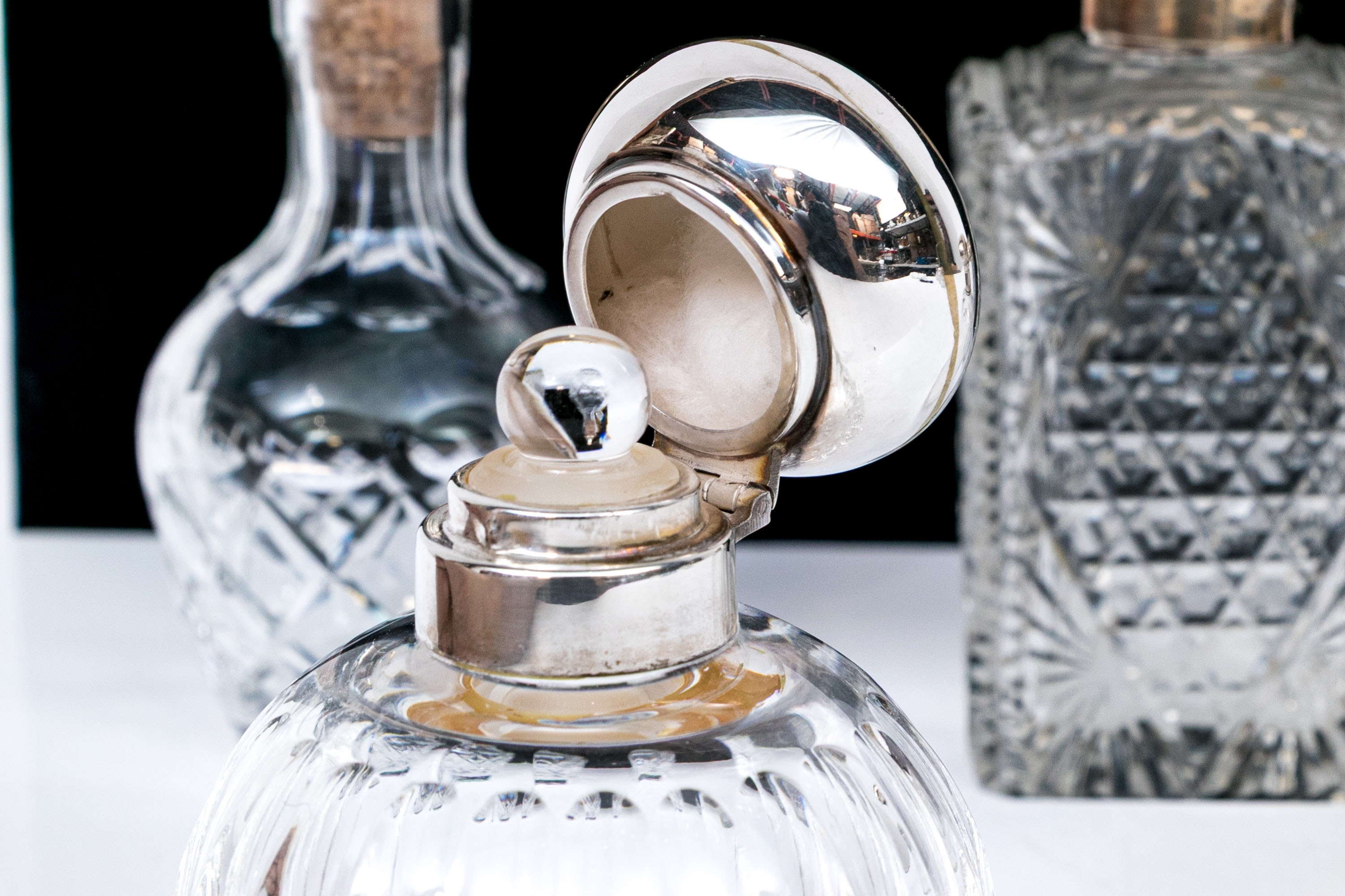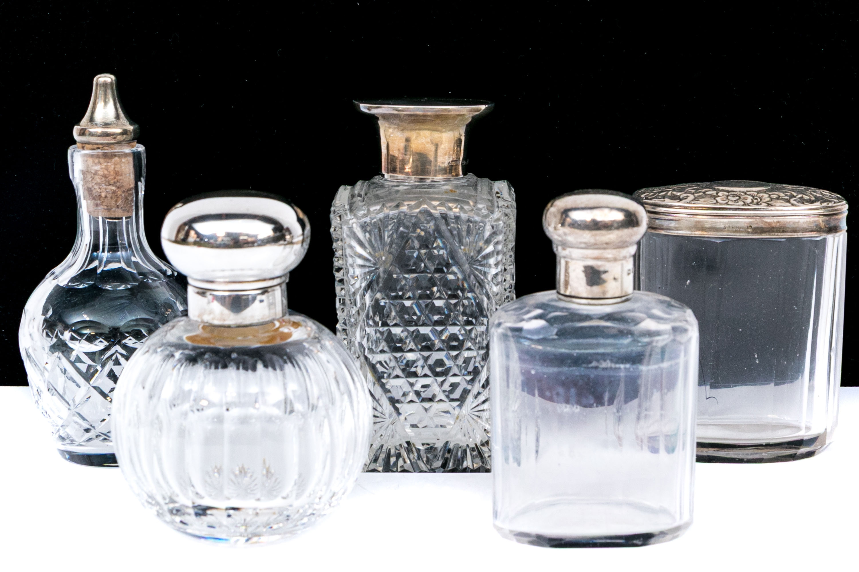 - Sterling lidded bottle, square form with cut crystal and circular sterling lid.