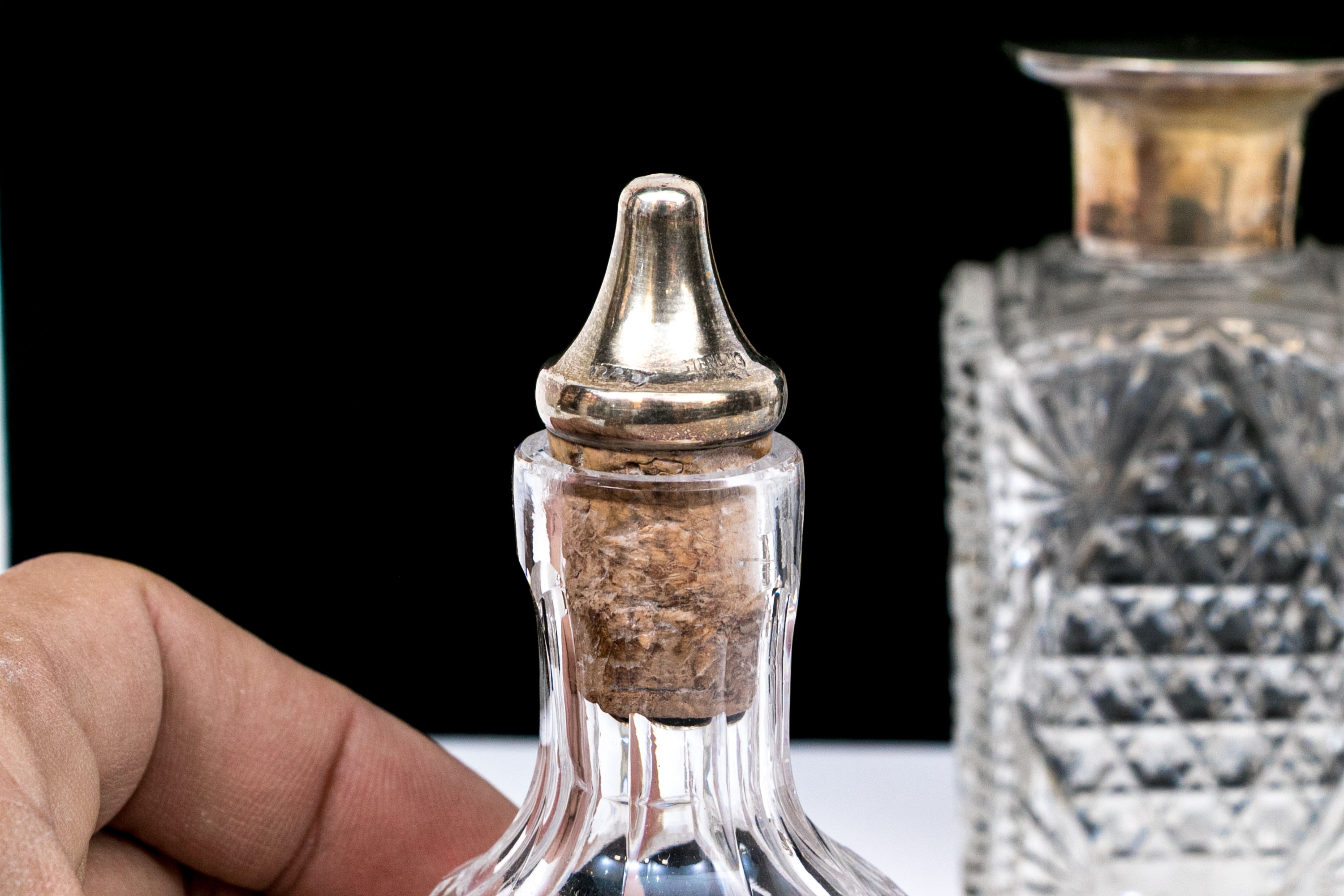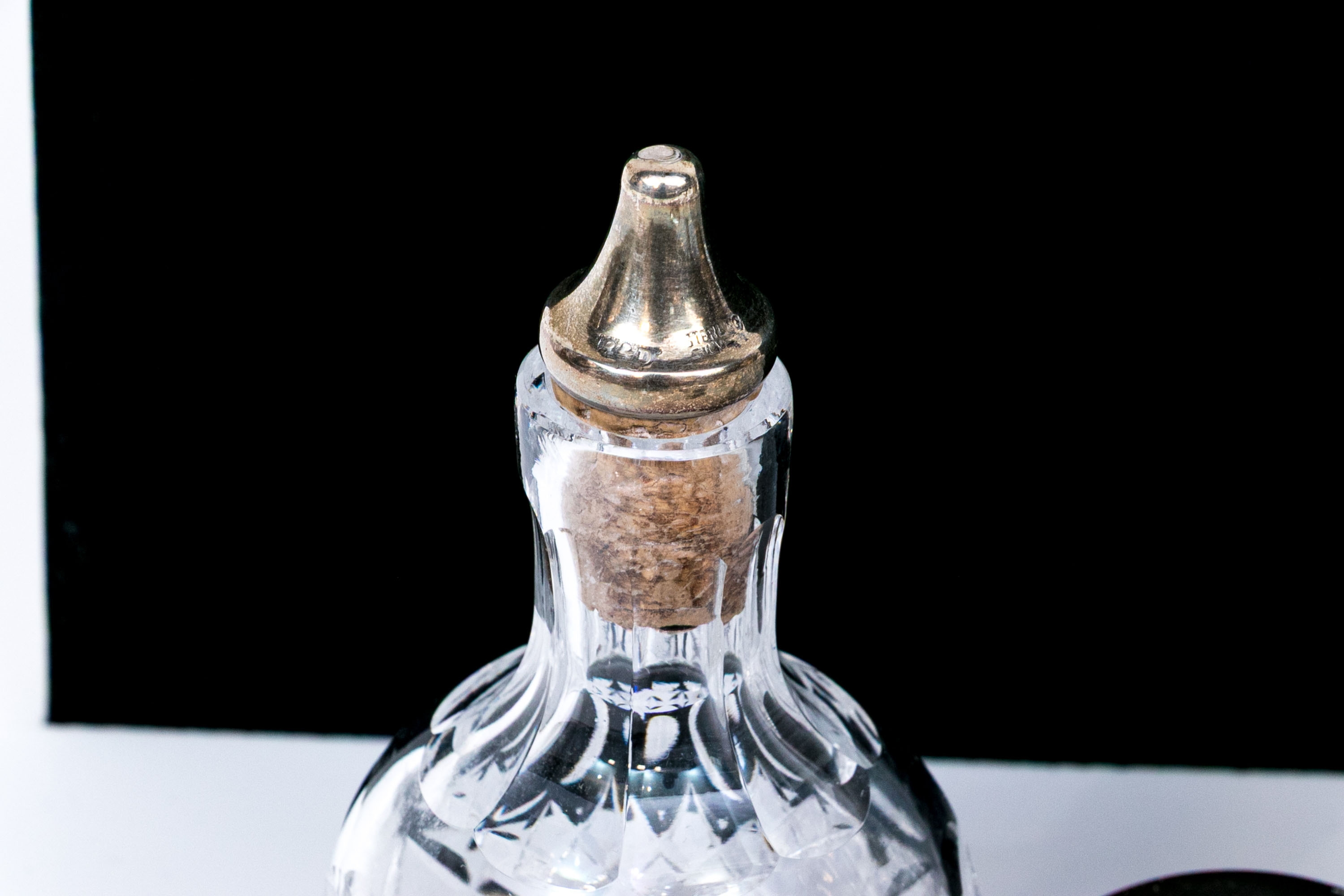- Diminutive decanter bottle with sterling capped cork stopper.
