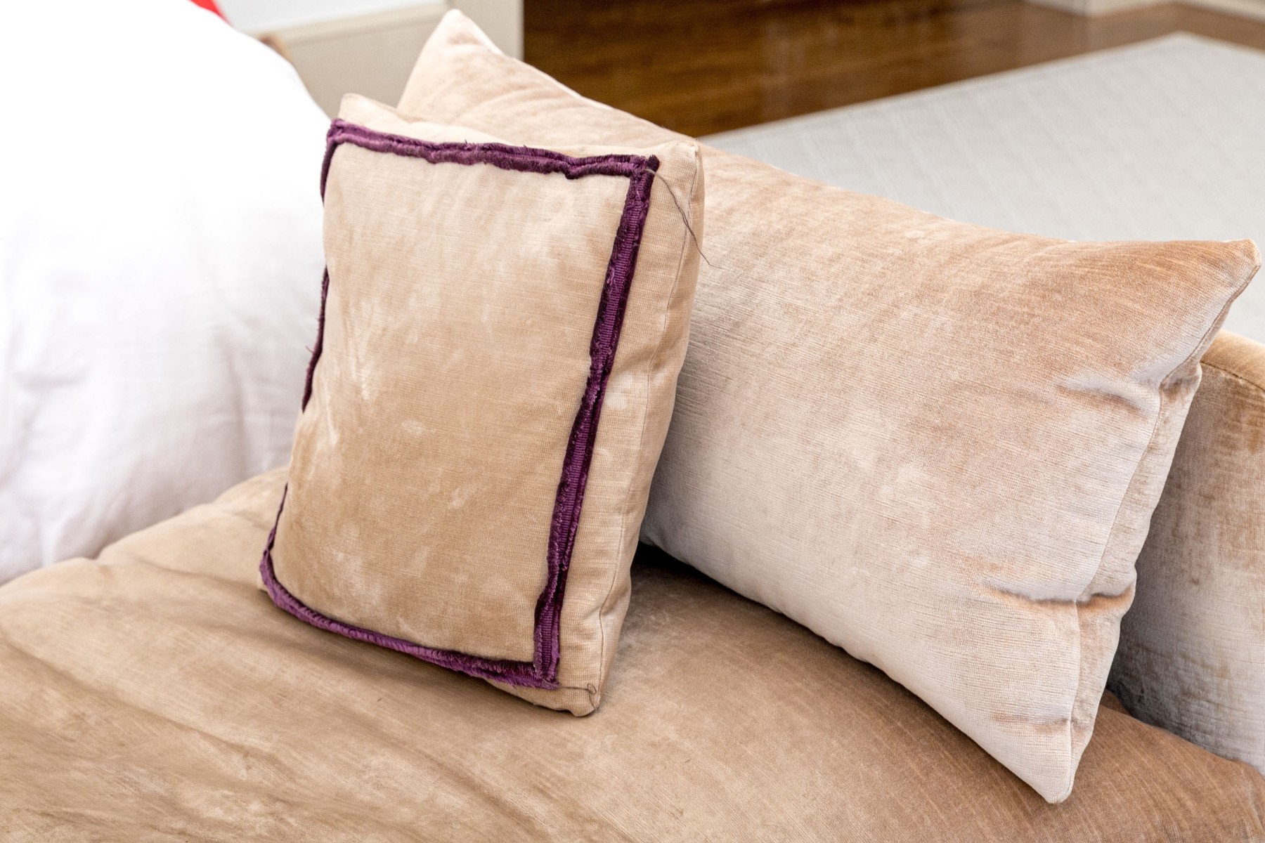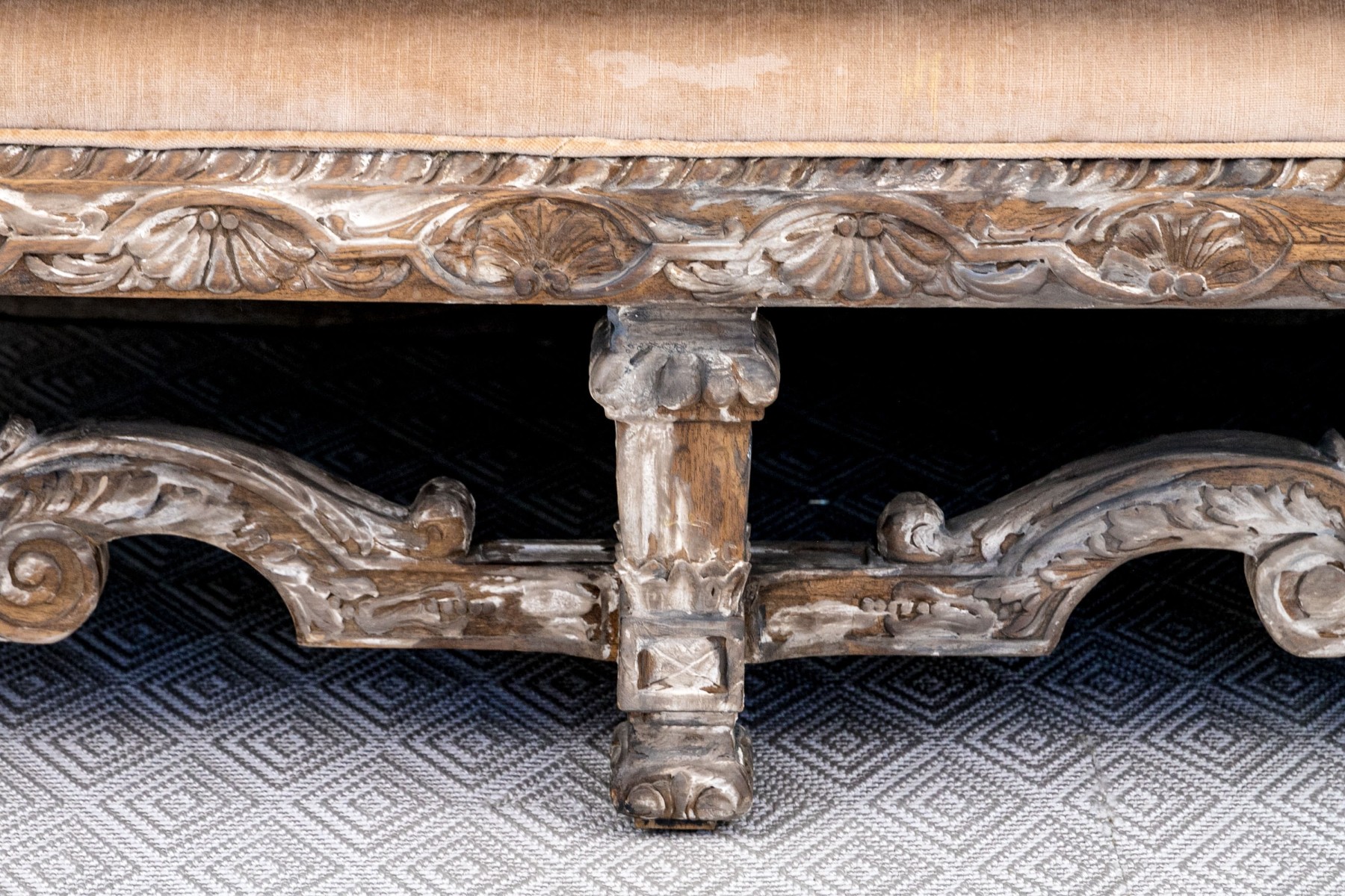 A gorgeous antique continental daybed showcasing sleek narrow arms, a loose bench cushion, and throw pillows in beautiful peachy salmon velvet. The daybed is raised on a heavy carved base with stately tapered legs surrounded by double camelback stretchers with scrolled and flourished designs in a distressed paint stripped finish adding to the rustic elegance of the piece.