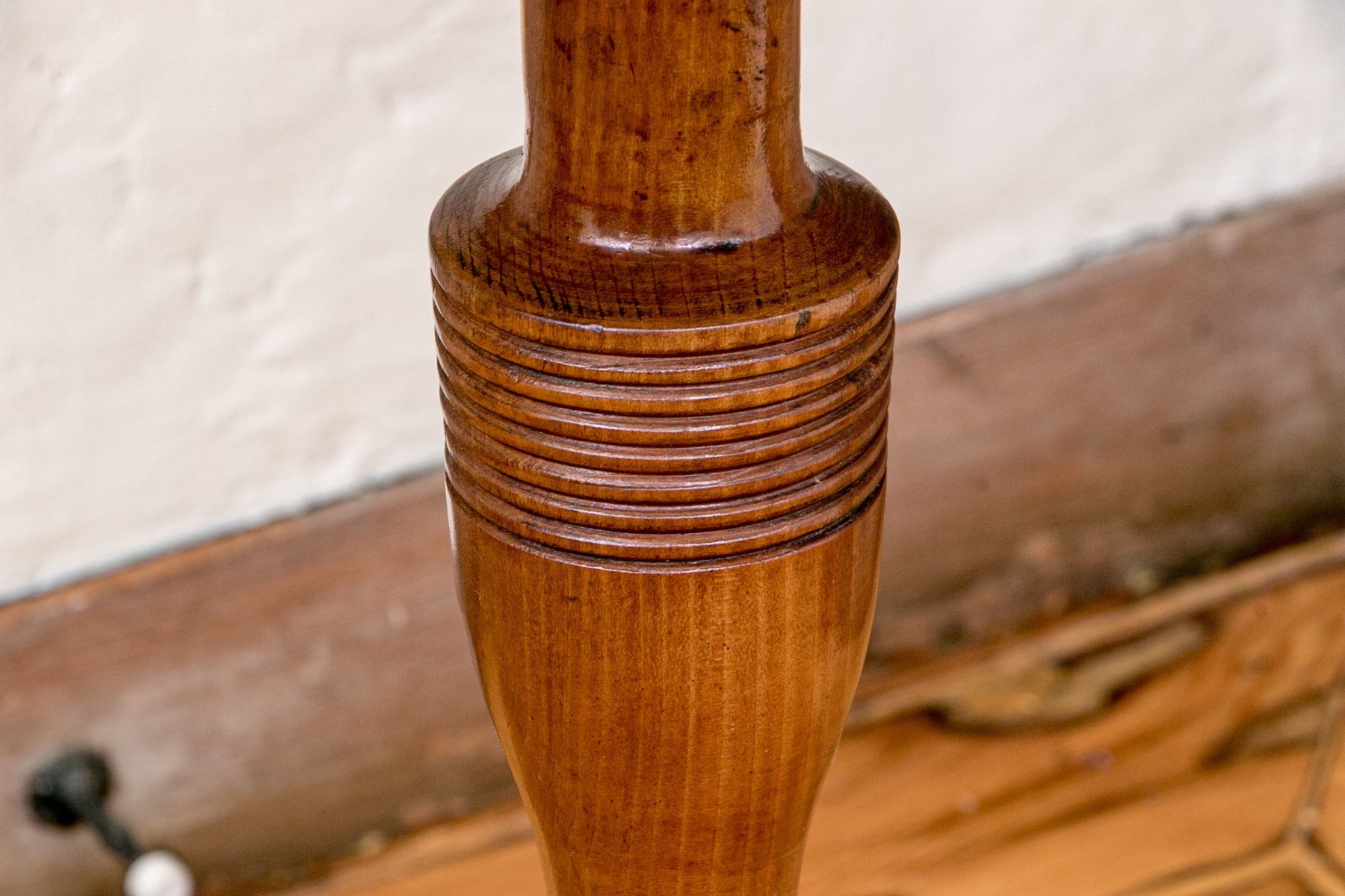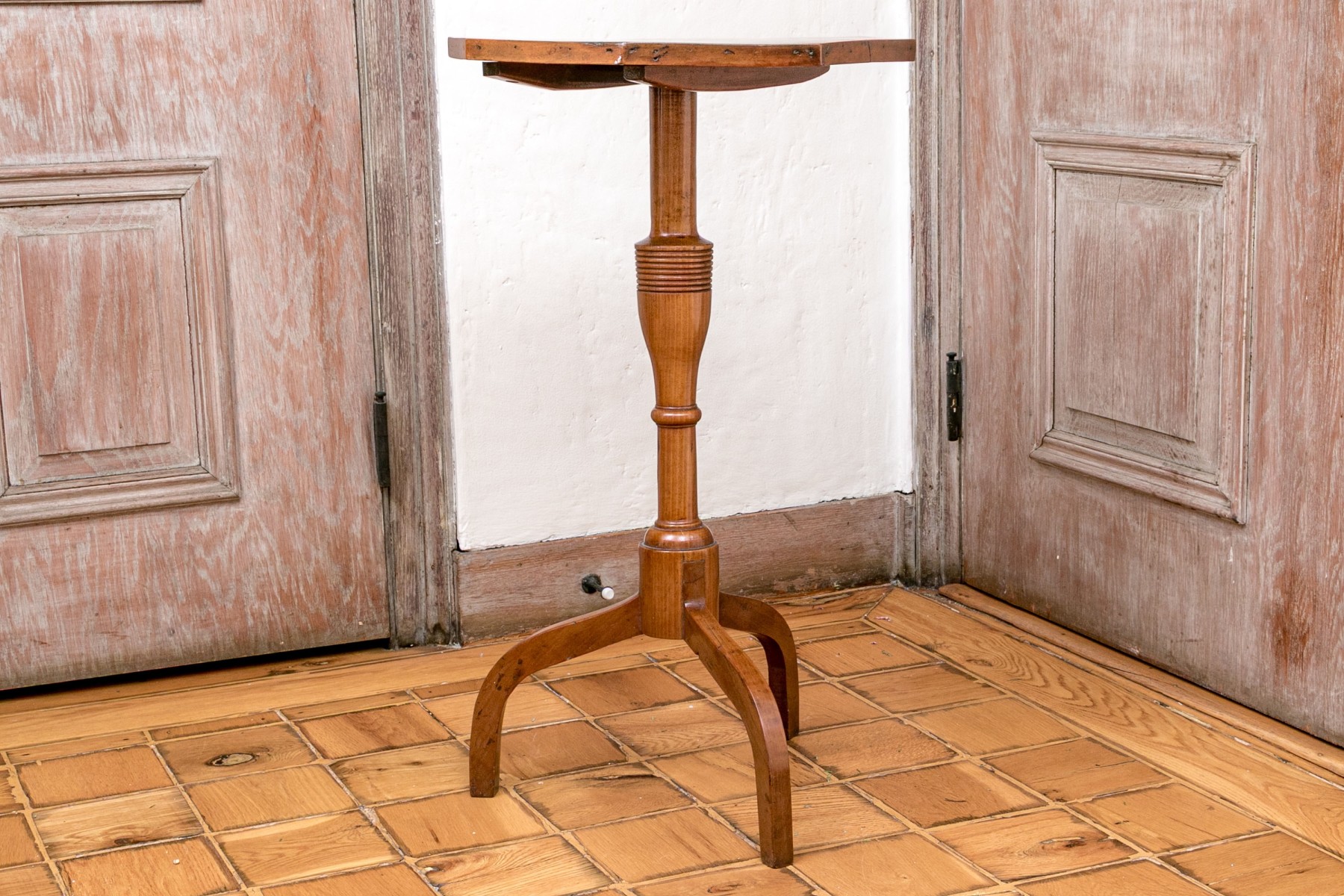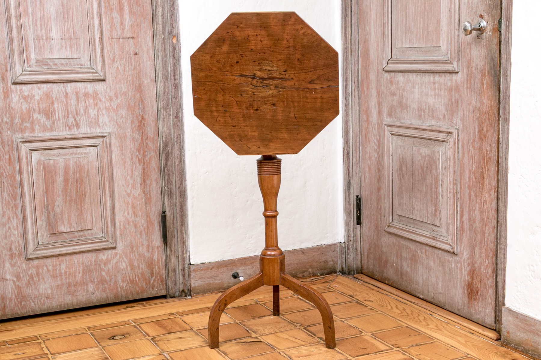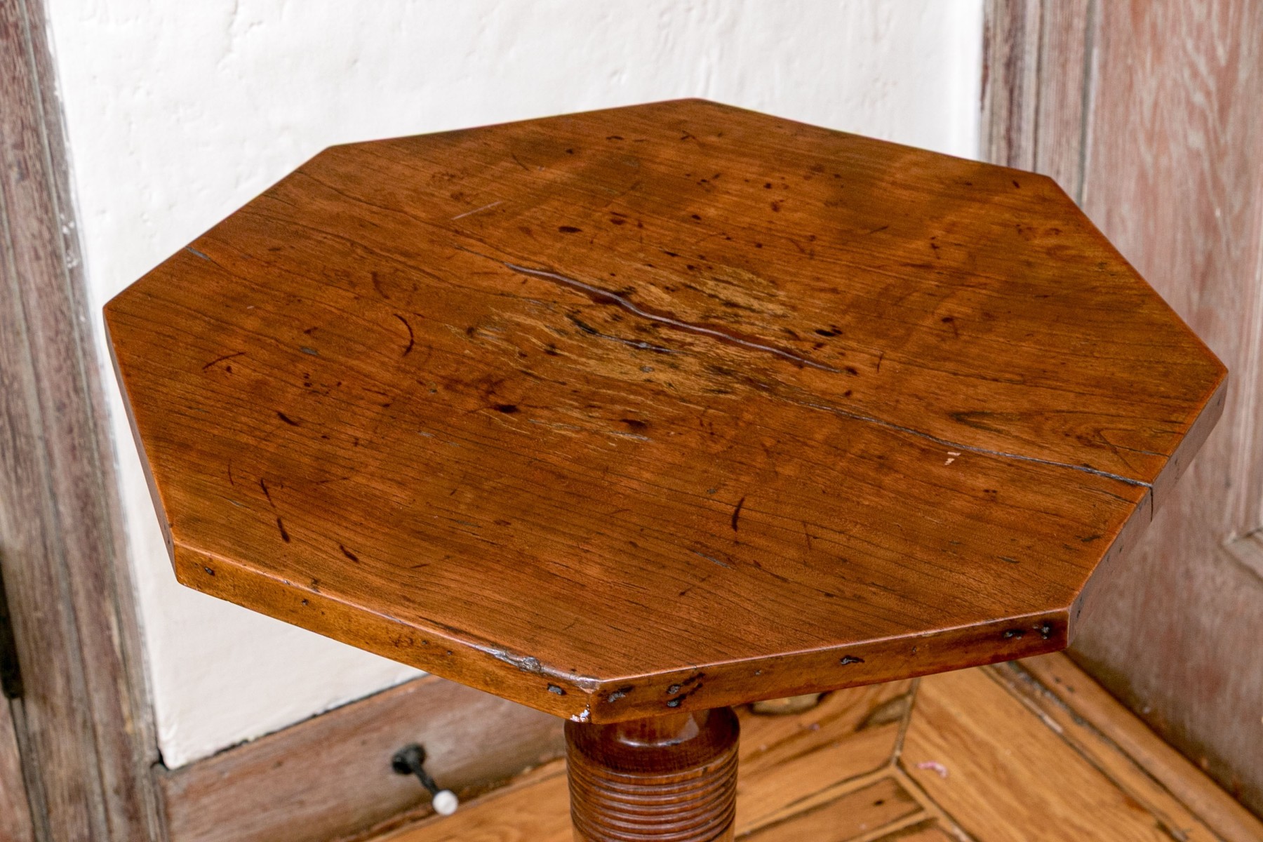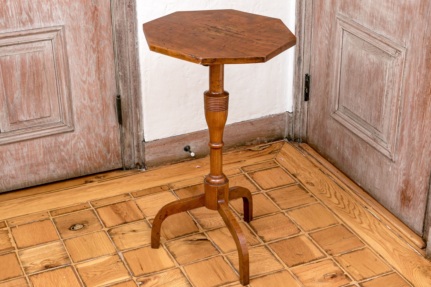 A delightful antique continental gueridon perfect for versatile use as a candle stand, plant stand, lamp table, or wine table. The table is beautifully constructed in warm medium brown walnut, showcasing an octagonal tilt top supported by a shapely column with reeded bands leading to a tripod of sleek curved legs.