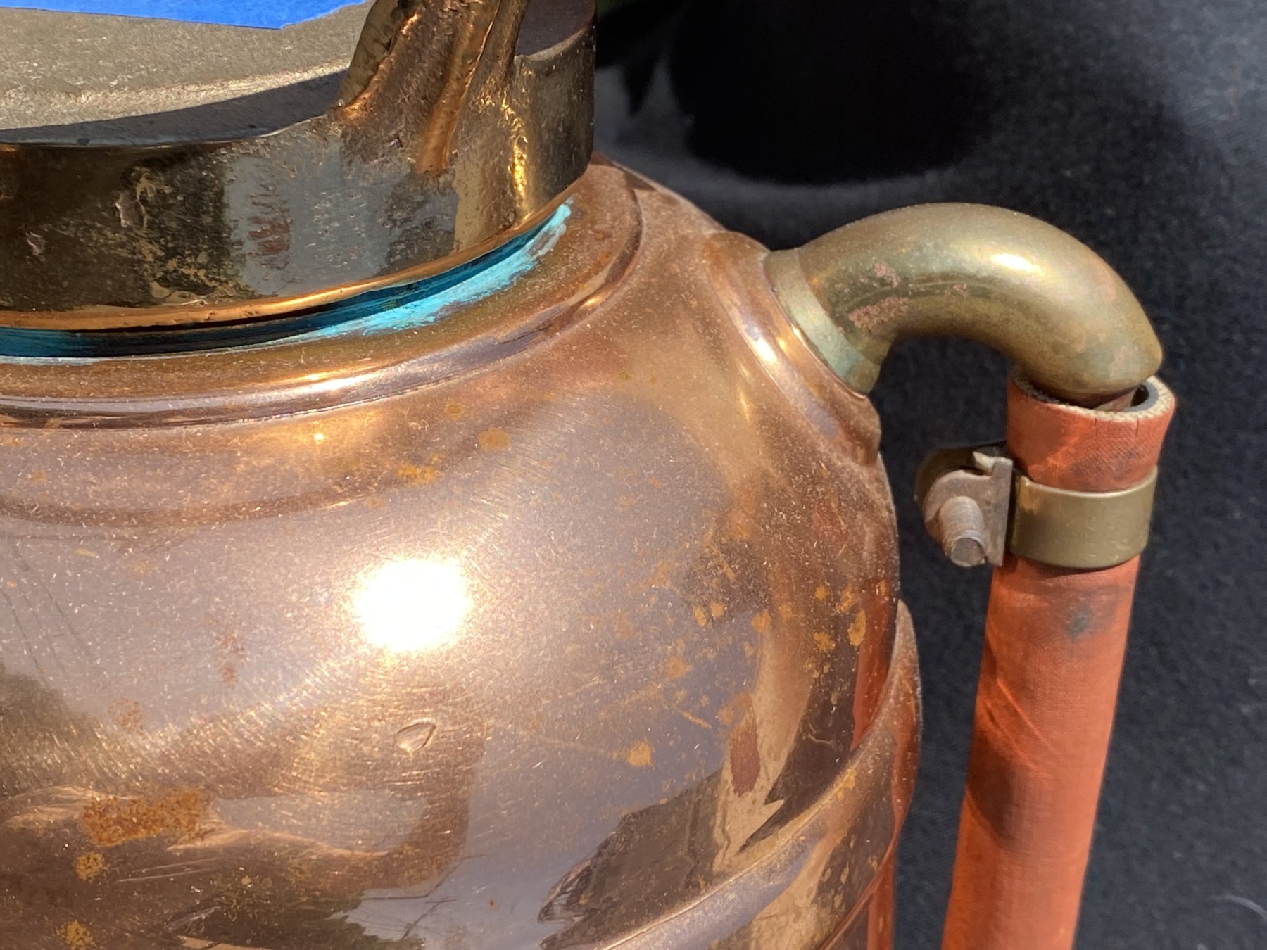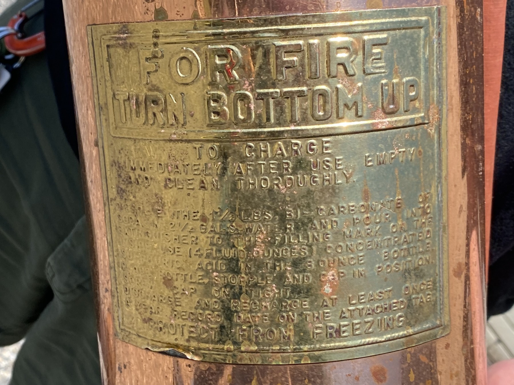 The copper fire extinguisher with three brass labels. With a separate copper top piece.