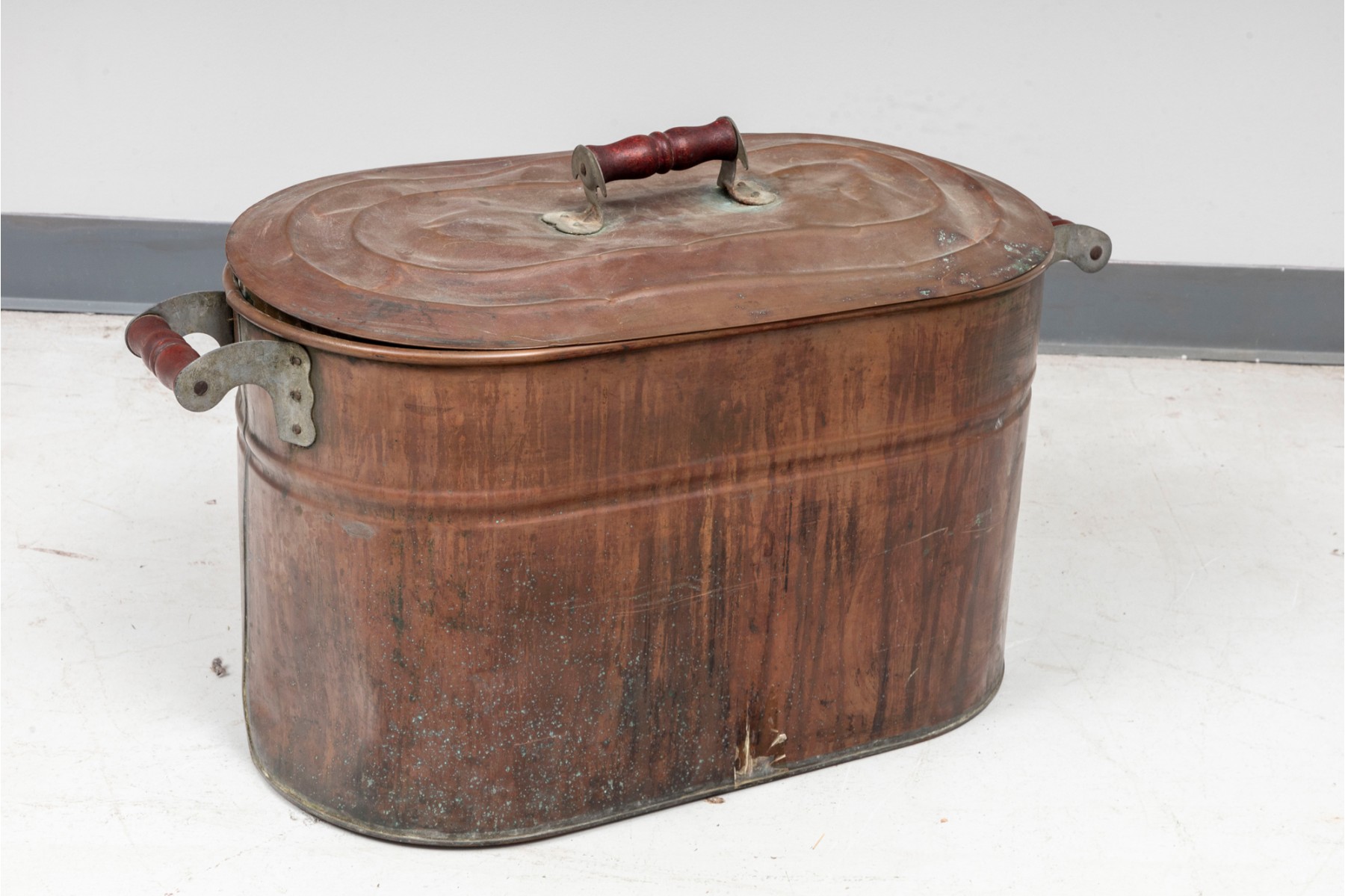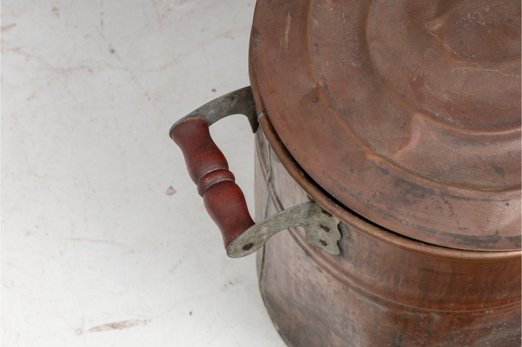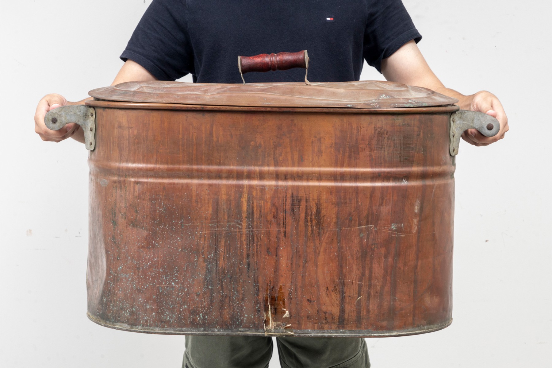 A traditional, antique lidded copper boiler sporting a Canco form complete with wood handles.