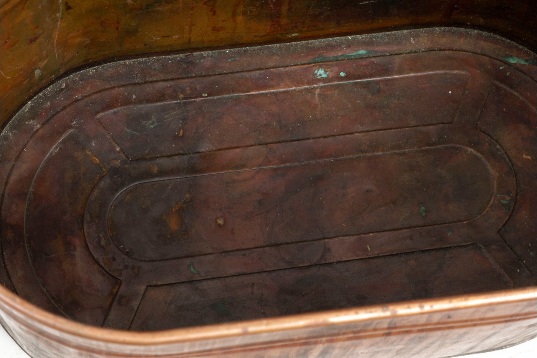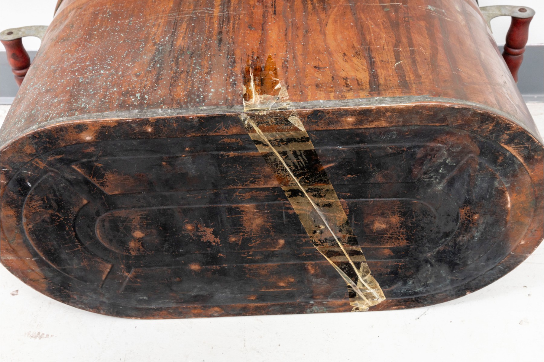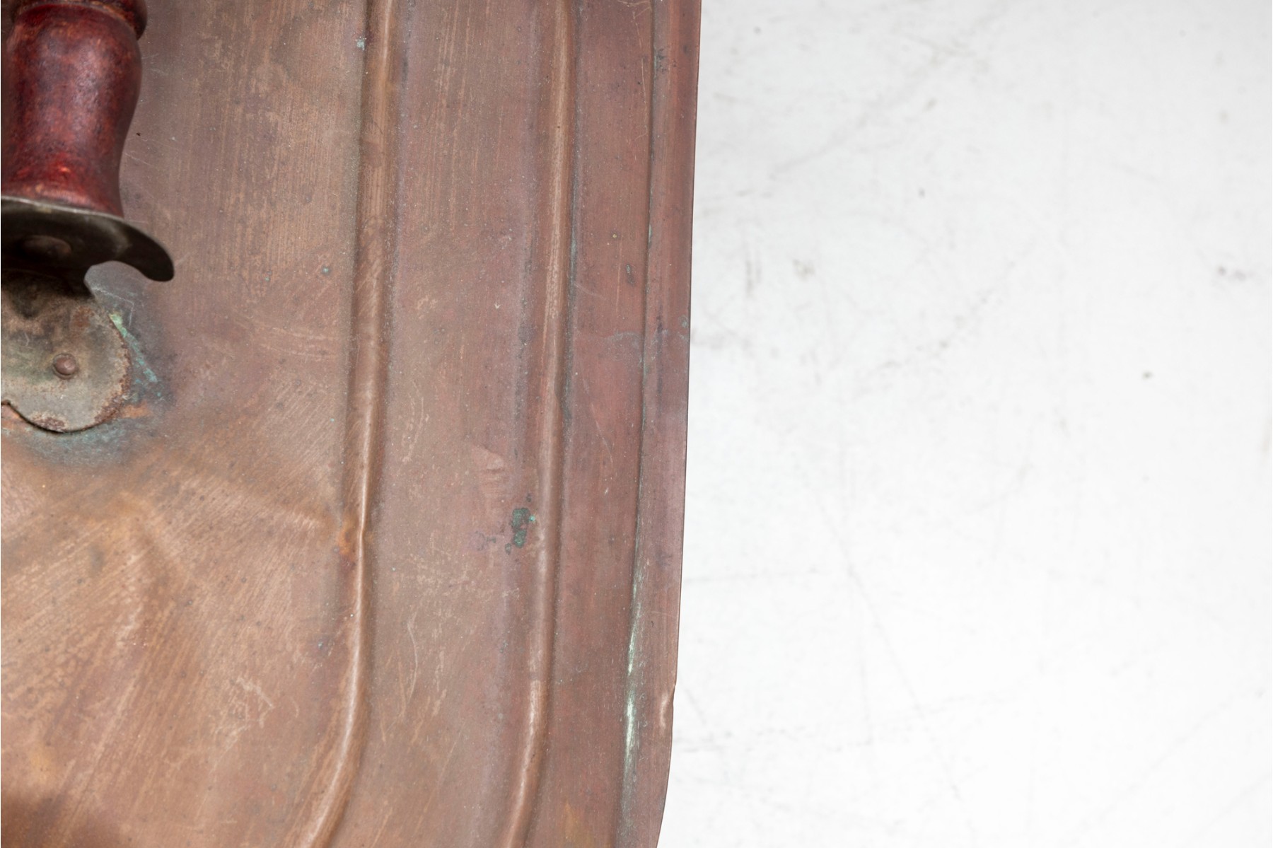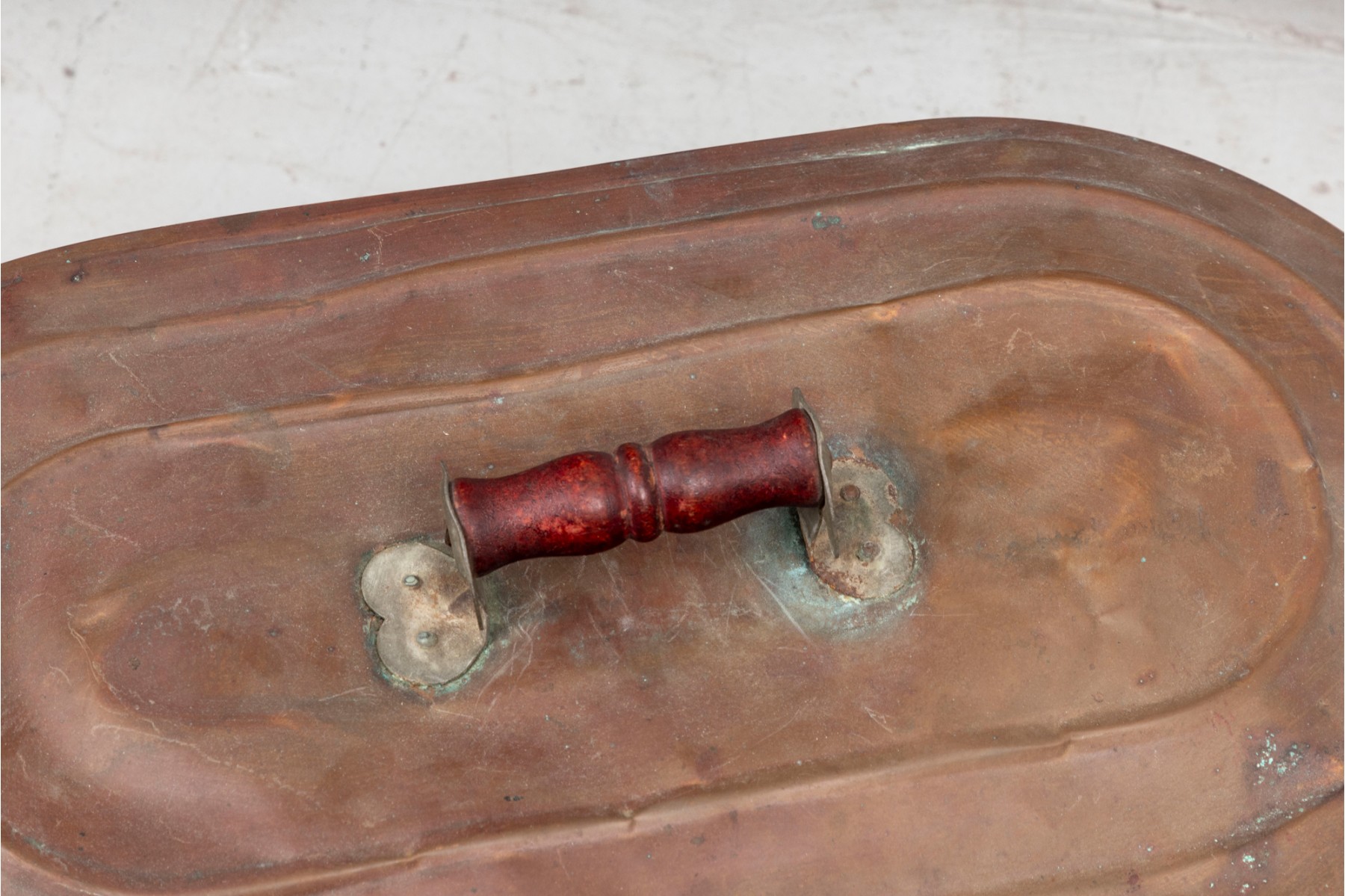 A traditional, antique lidded copper boiler sporting a Canco form complete with wood handles.
