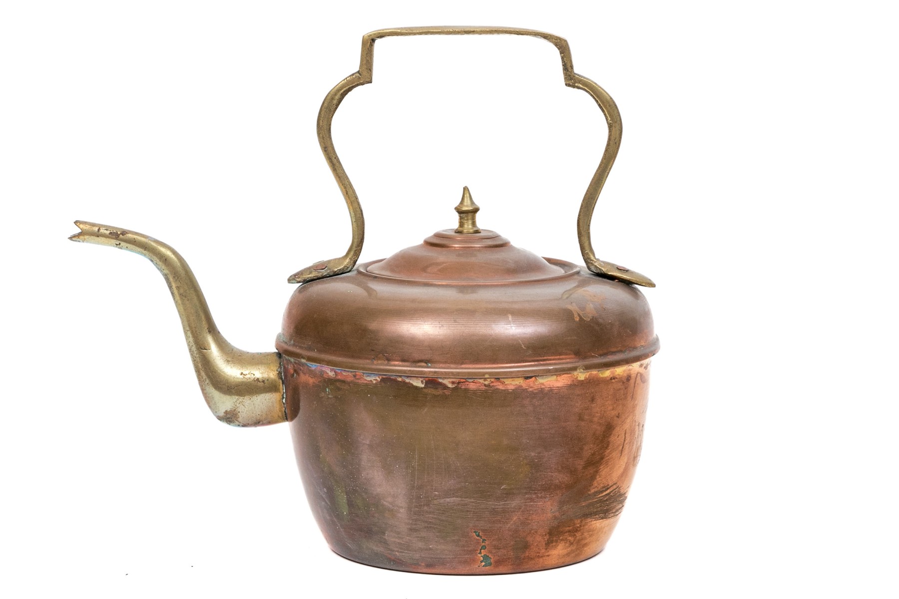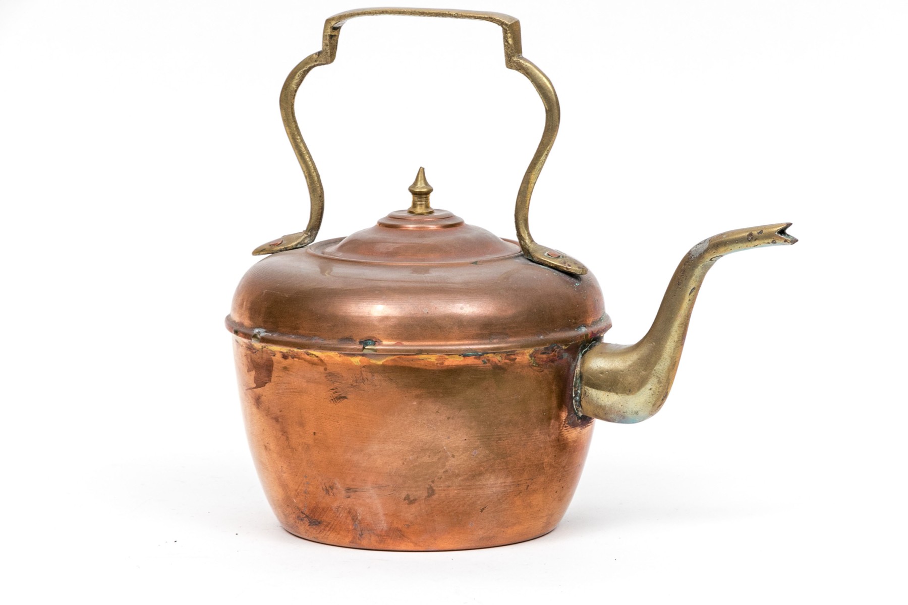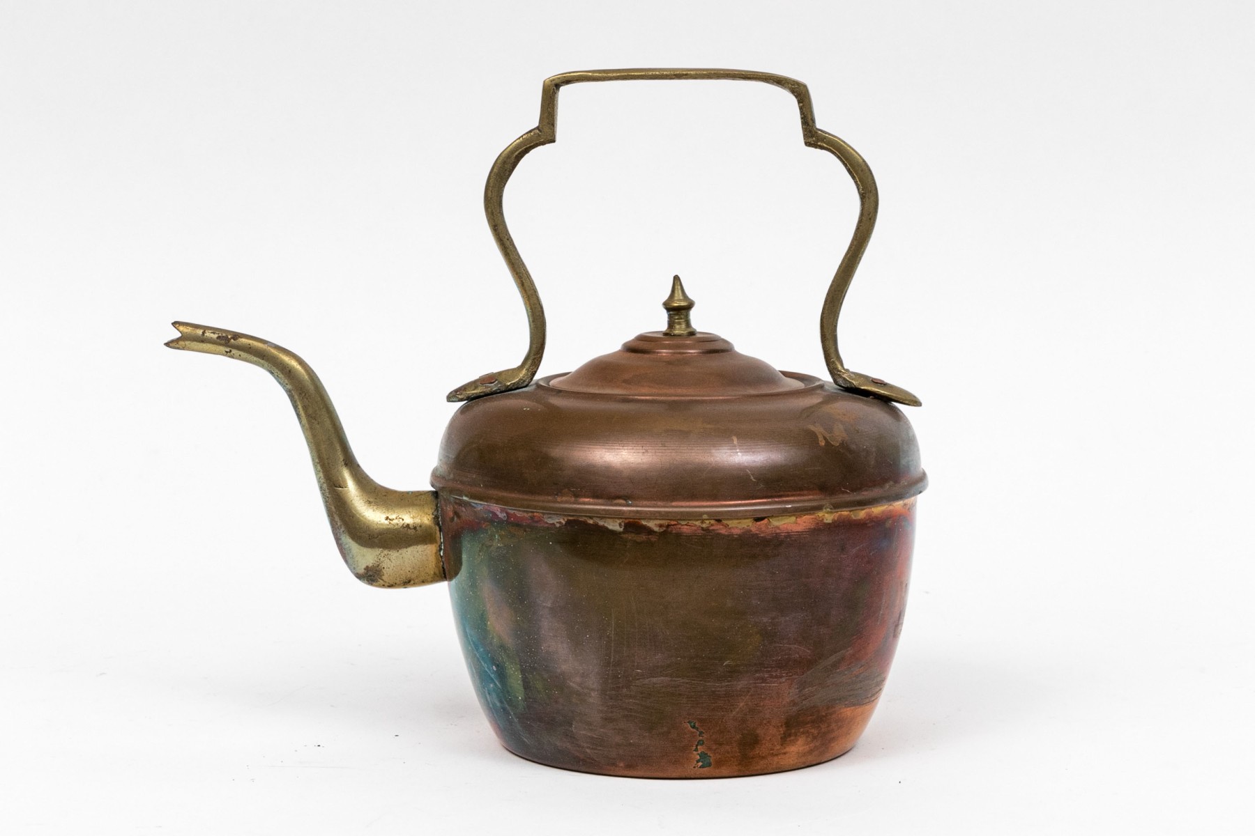 A classic shape with a brass curved top handle and a brass spout. The lid with a brass spike finial.
