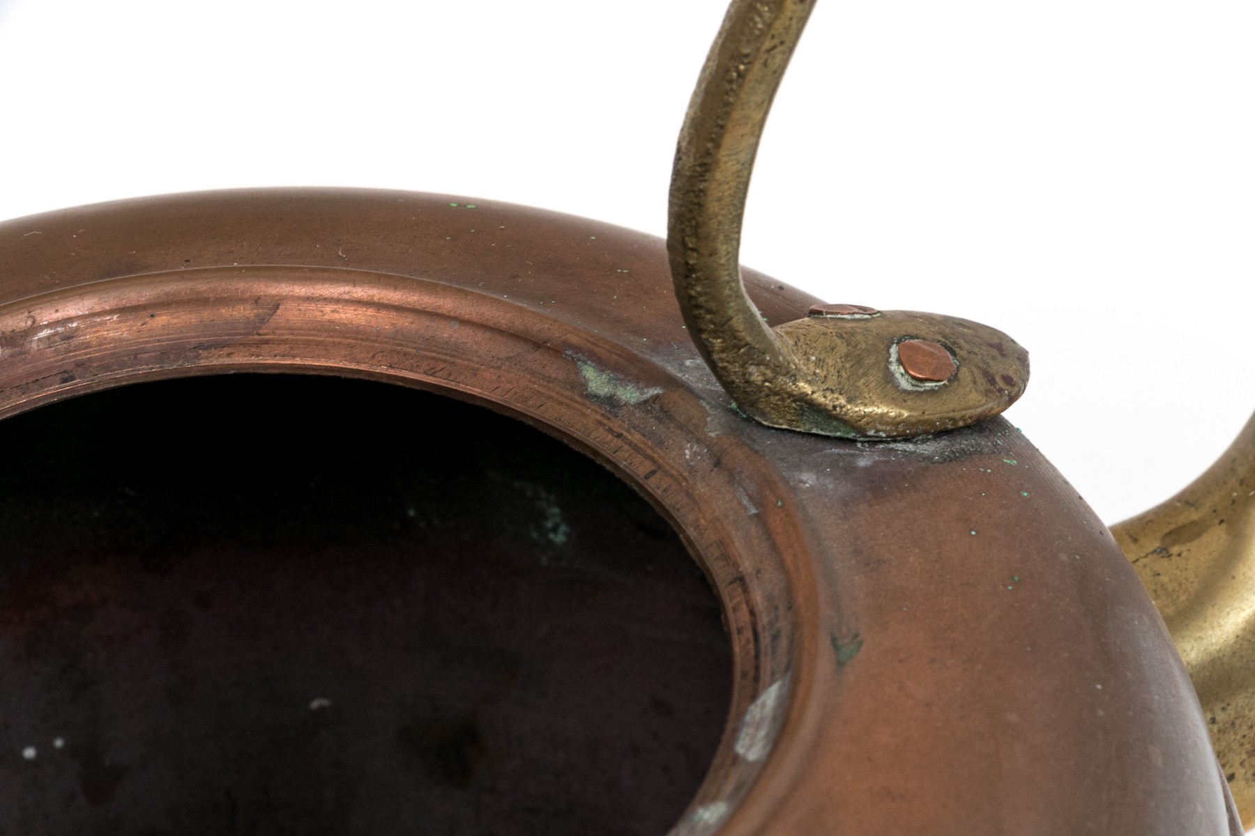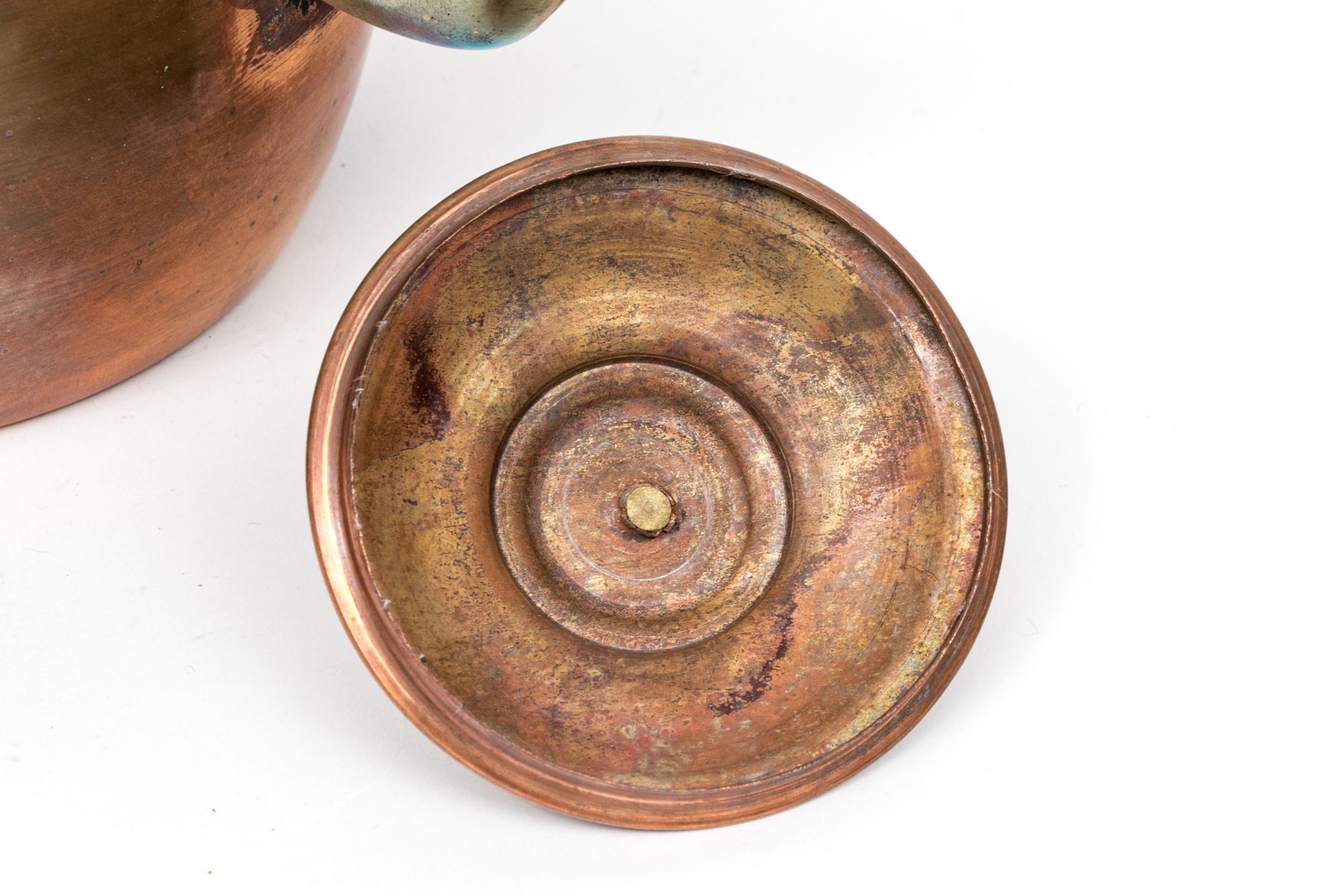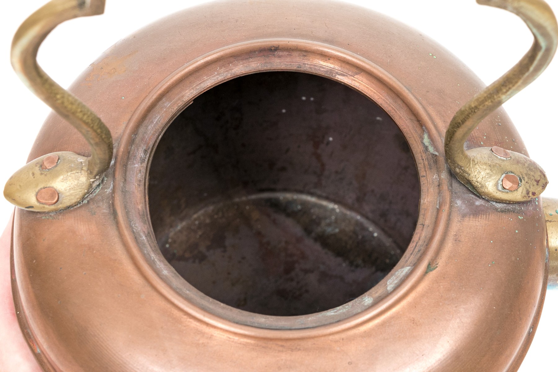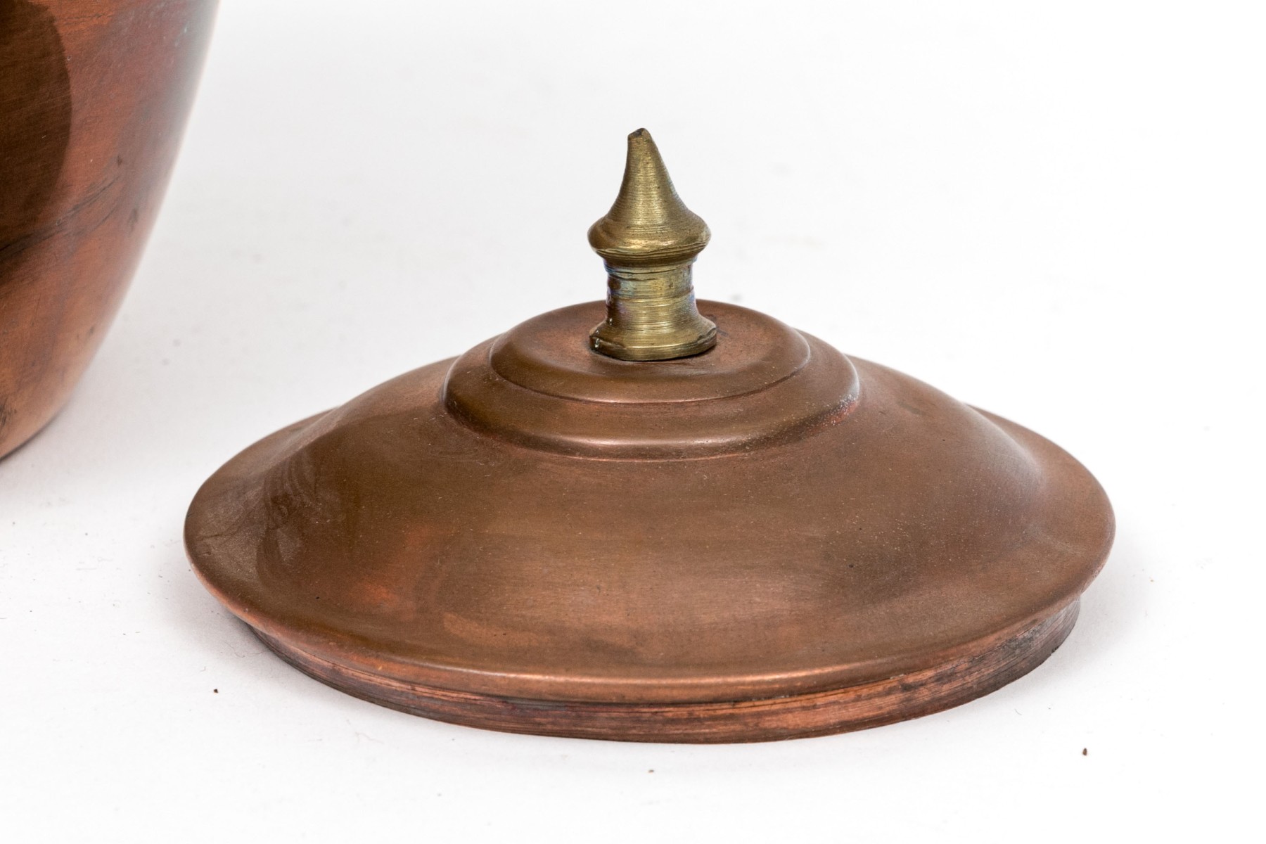 A classic shape with a brass curved top handle and a brass spout. The lid with a brass spike finial.