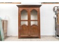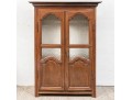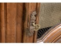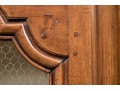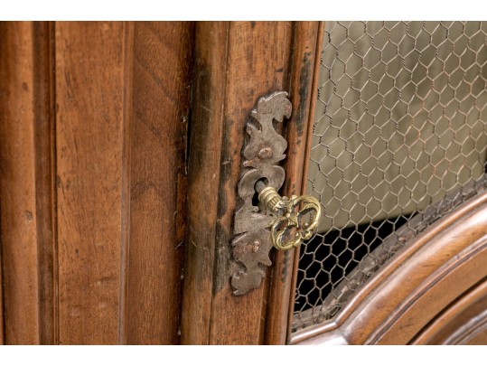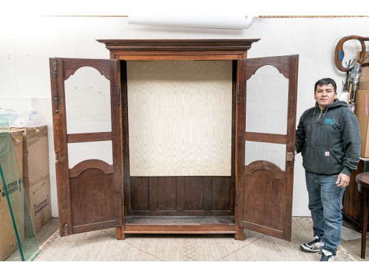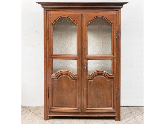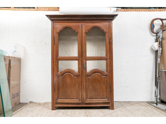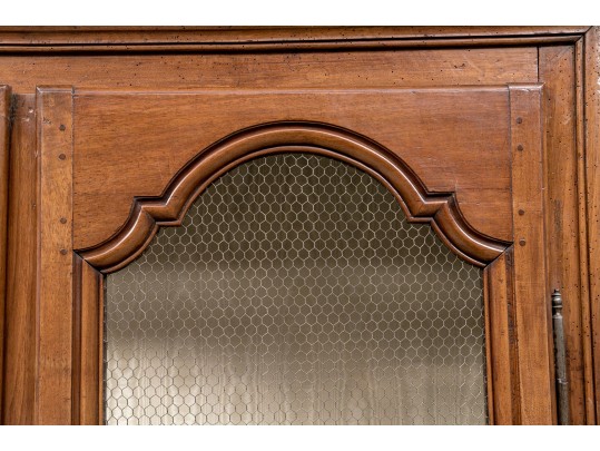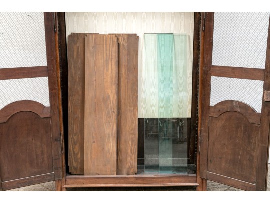A fruit wood cabinet with carved overhanging cornice over double carved arched grille work doors with the key. The open back with a white moire fabric panel. The side with carved recessed panels. Three wood shelves and two glass shelves are Included but cannot be used with the narrow inside tabs for original adjustable shelves.