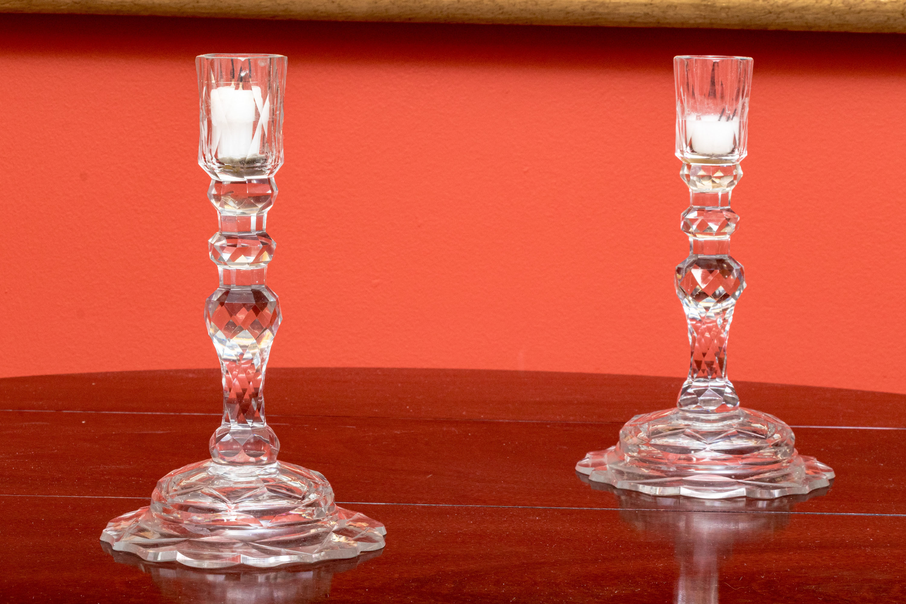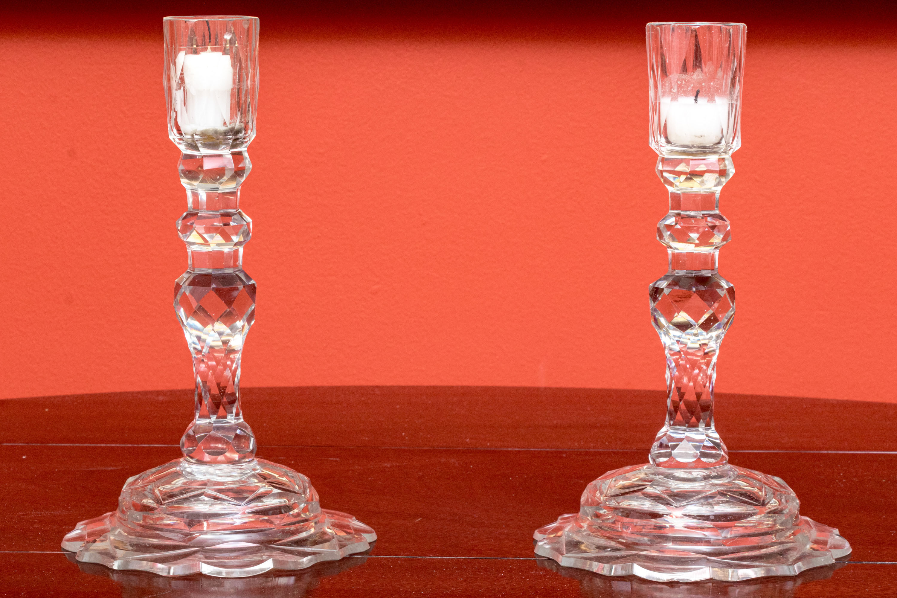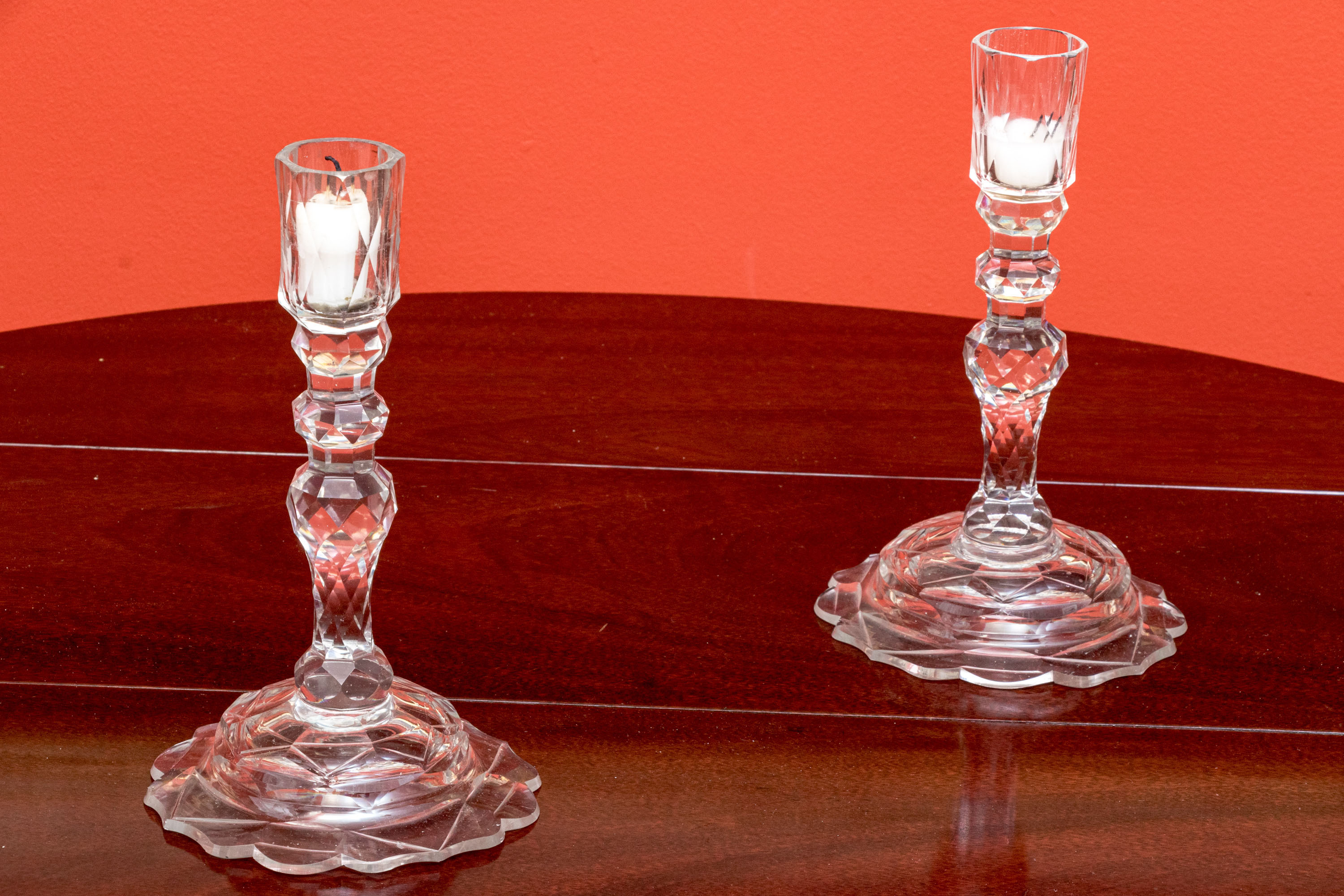 Pair of mouth blown, cut crystal candle holders, each with a faceted standard and unusual scallop cut squared base. Pontil beneath, no marks.