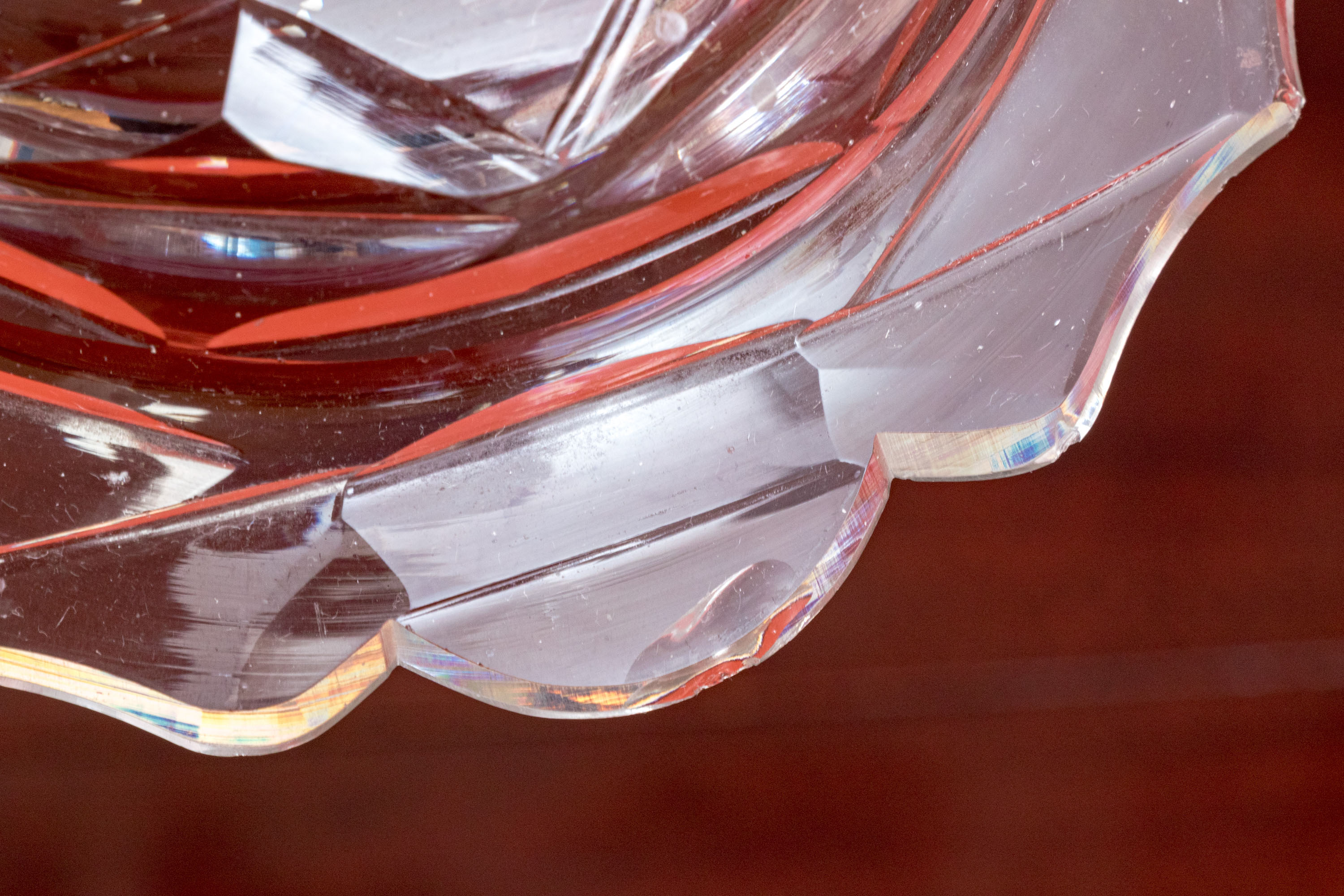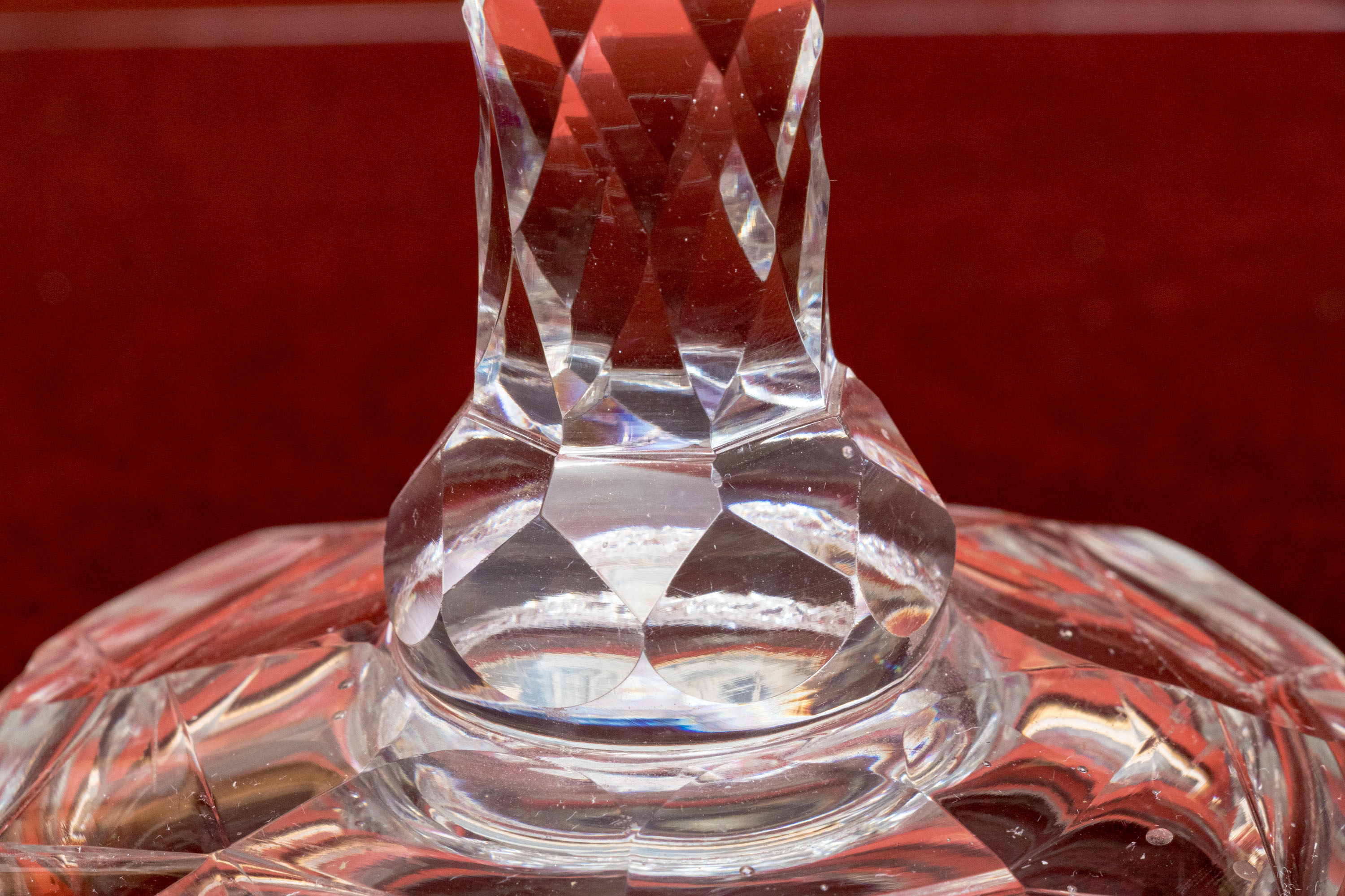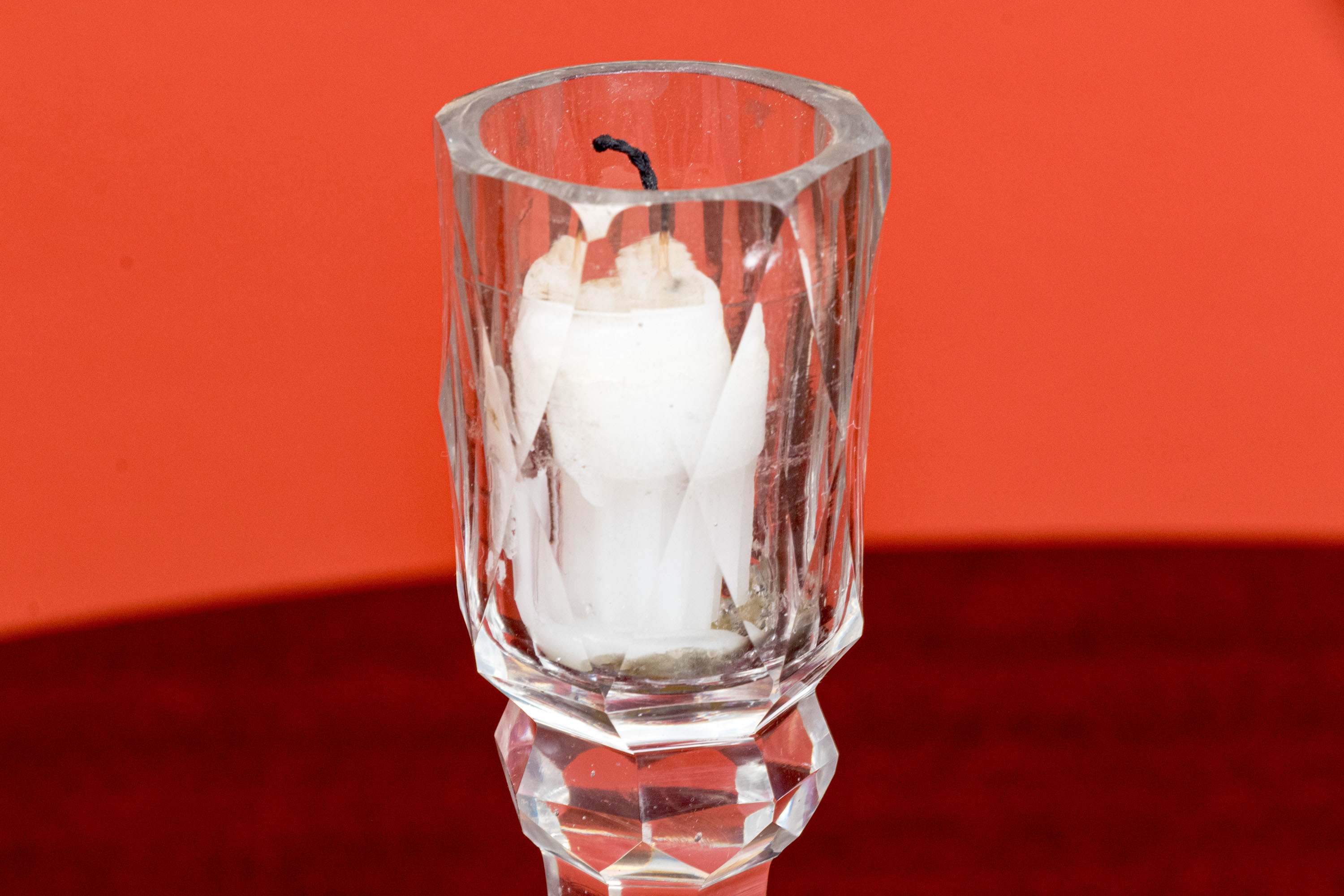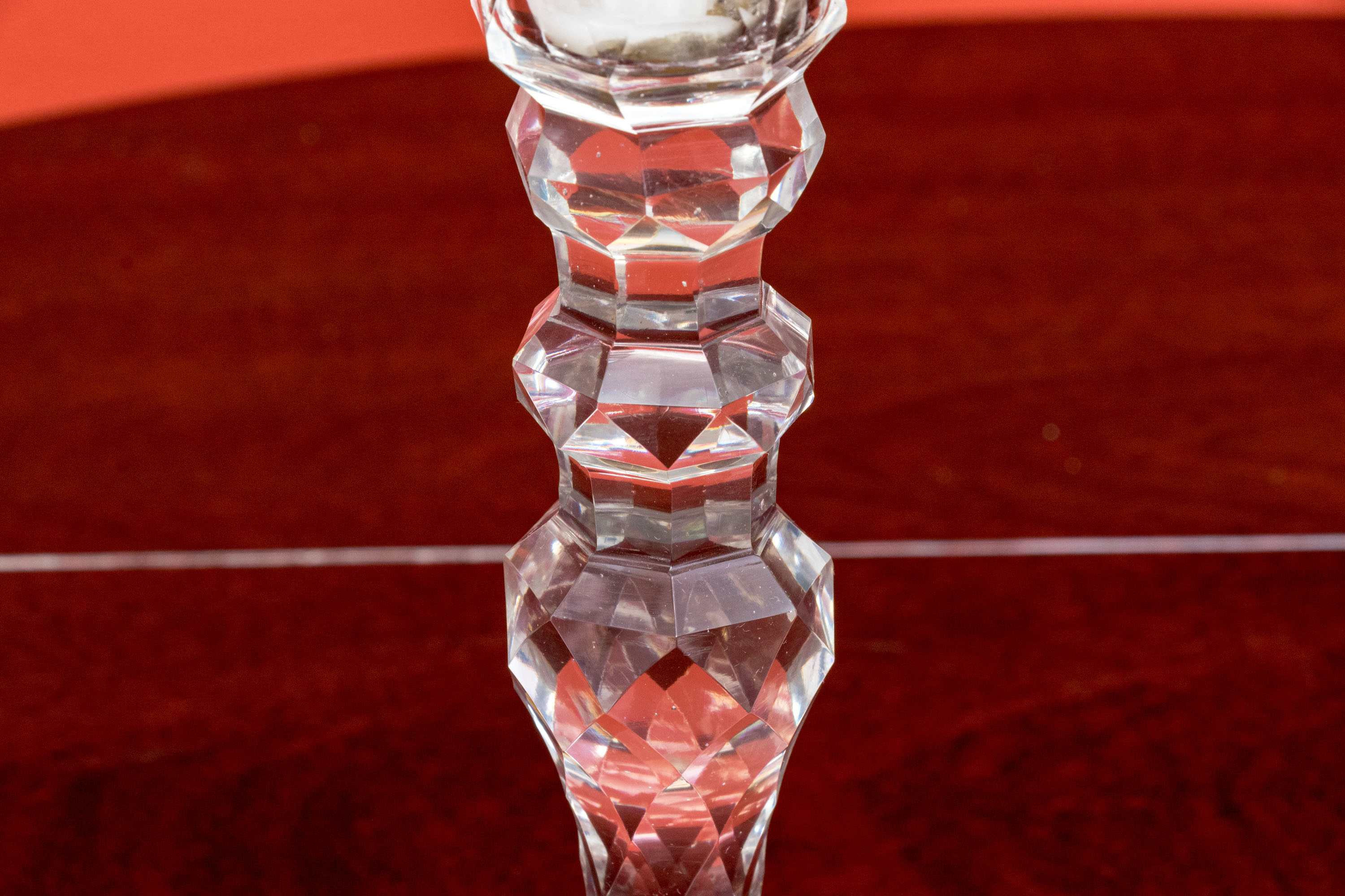 Pair of mouth blown, cut crystal candle holders, each with a faceted standard and unusual scallop cut squared base. Pontil beneath, no marks.
