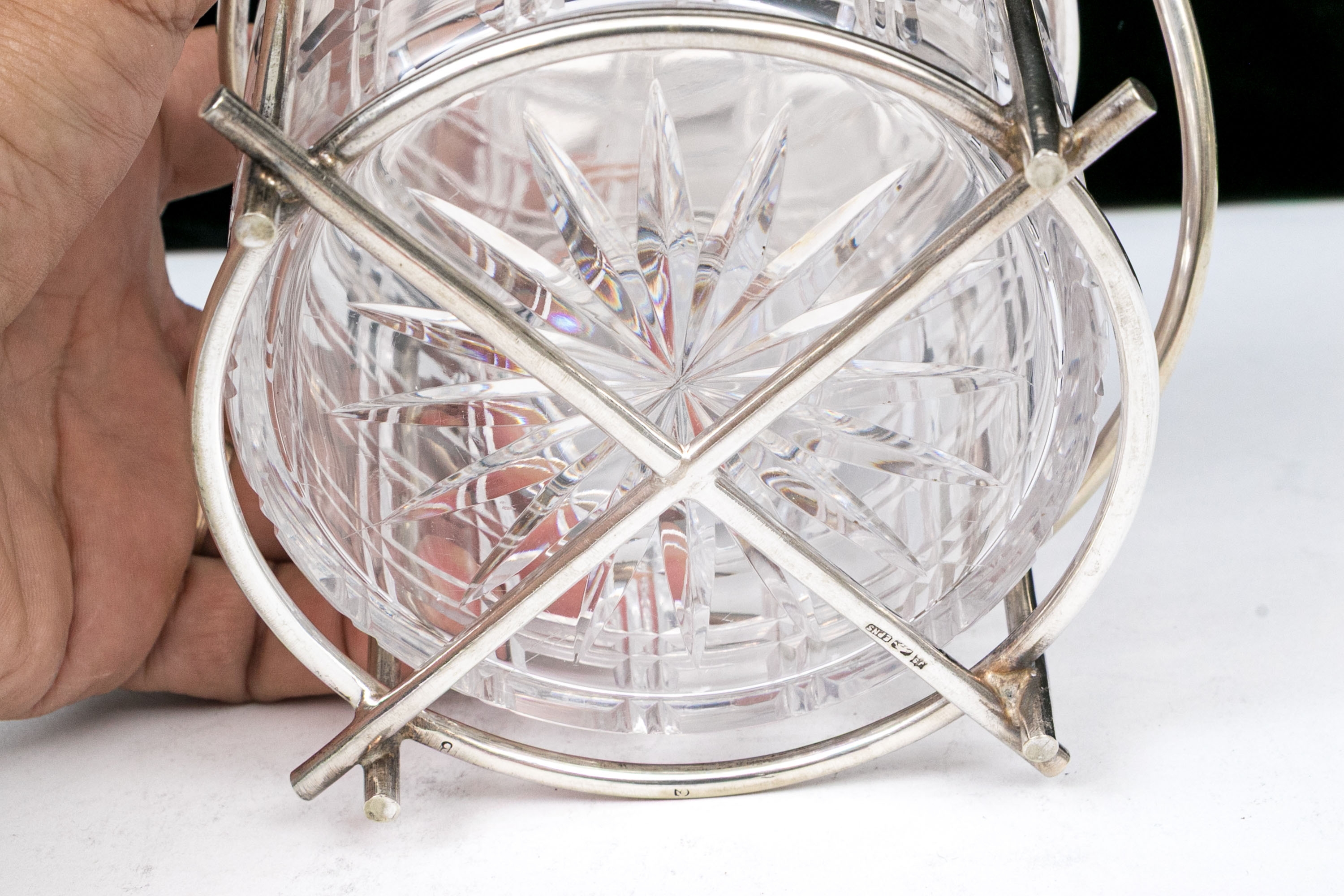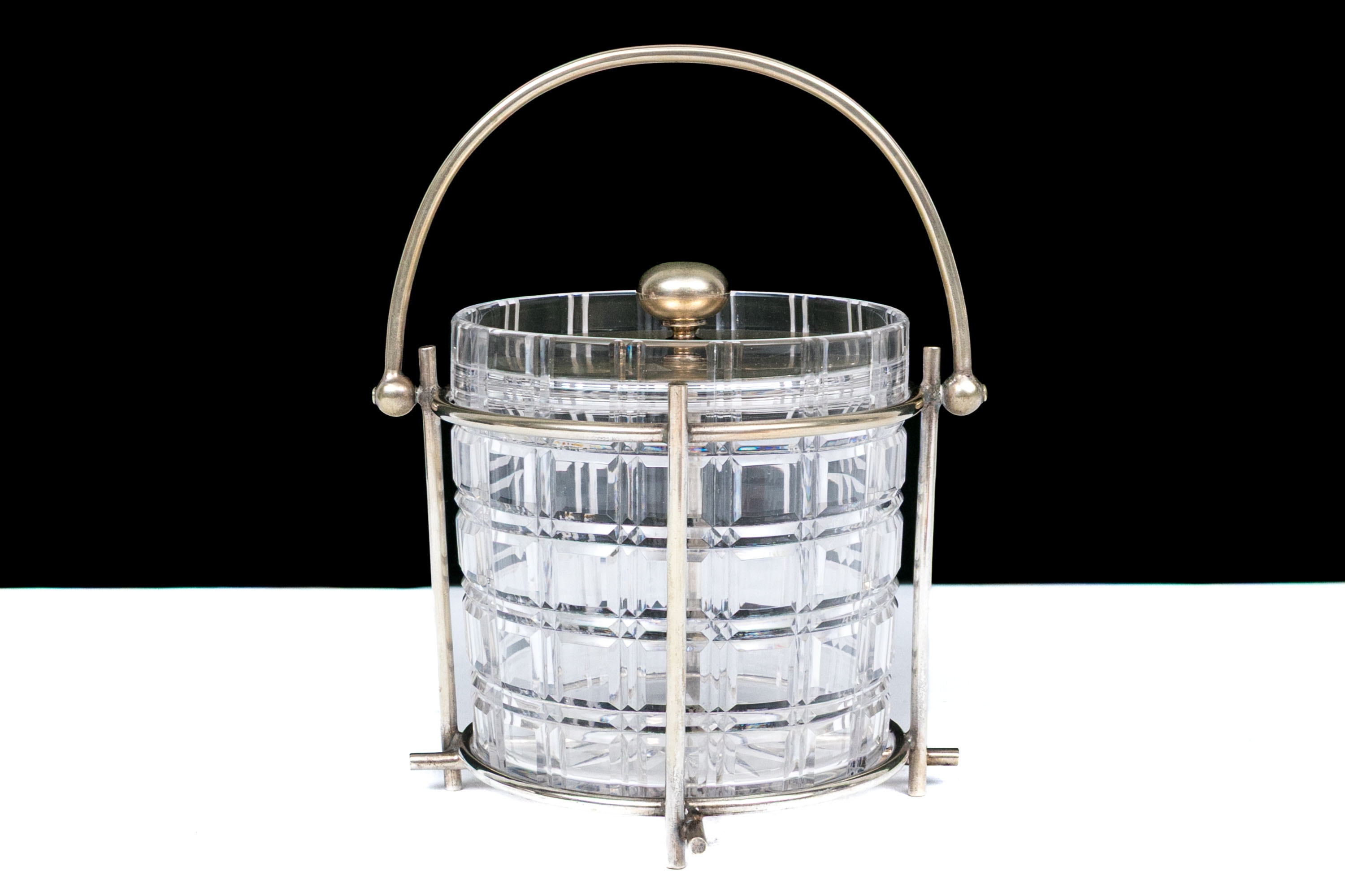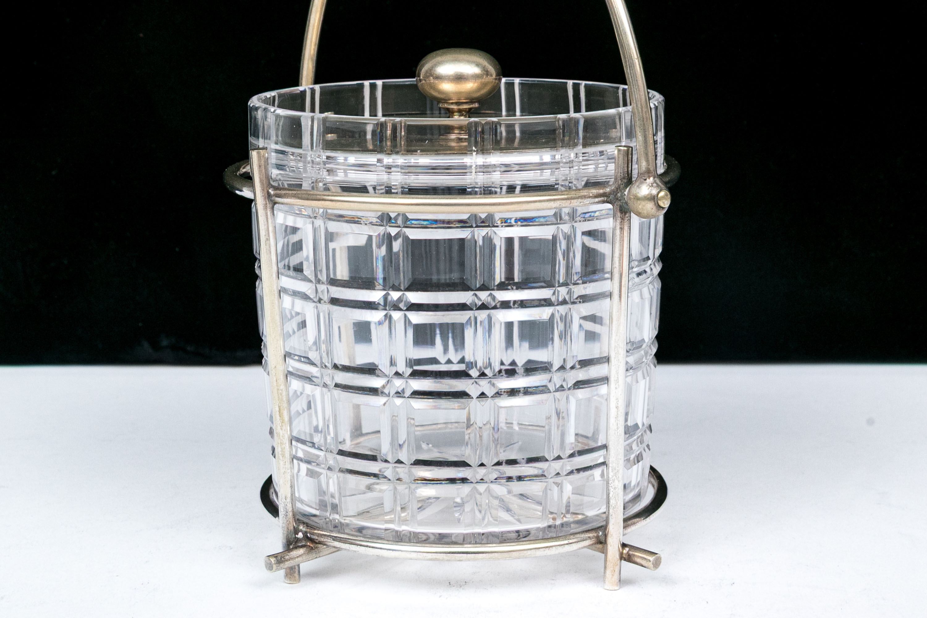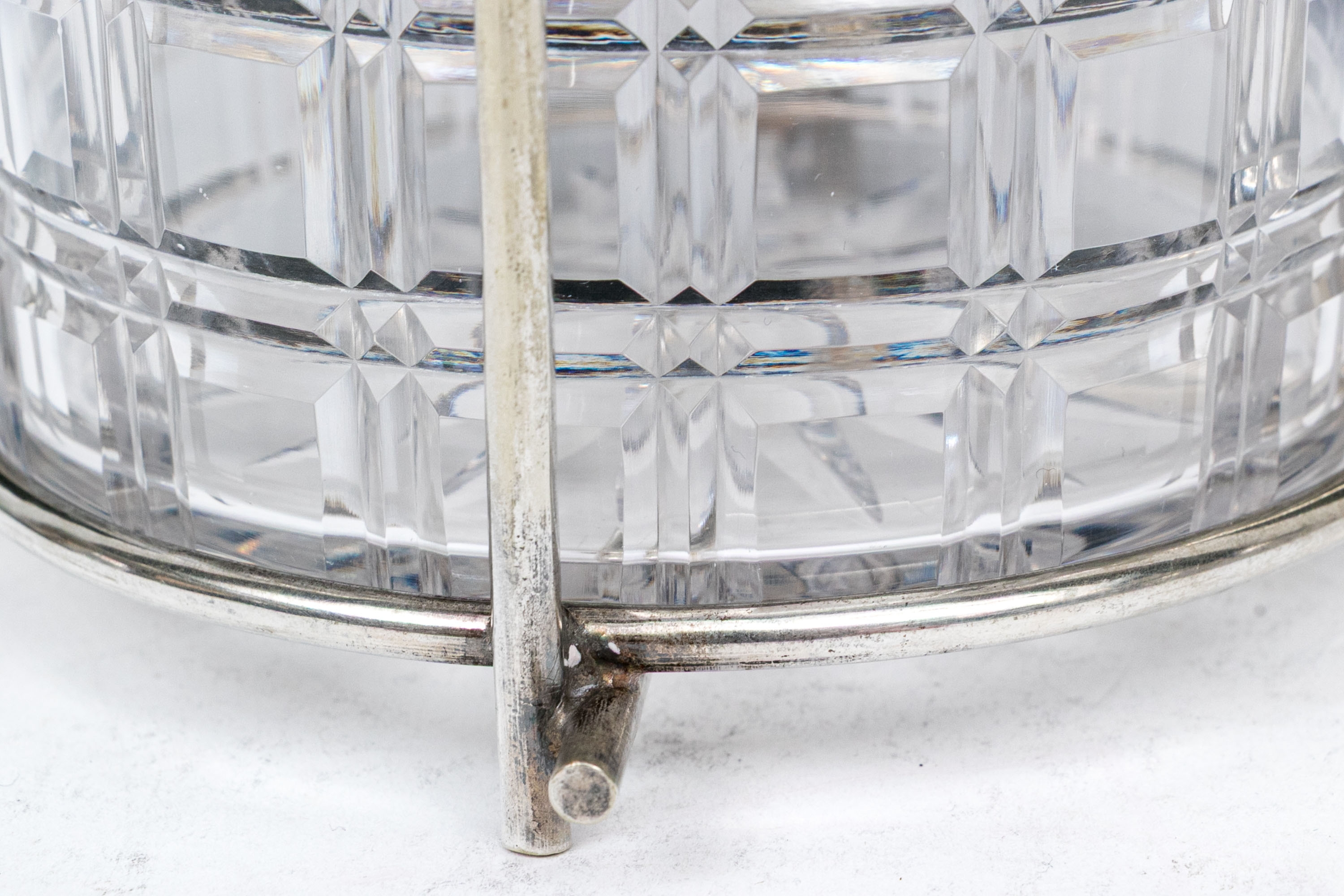 The cut crystal round jar in an overall square pattern separate from the silverplate stand. The four legged silverplate and with swivel handle and a matte finish lid. The silverplate has been restored and replated to a fine finish,