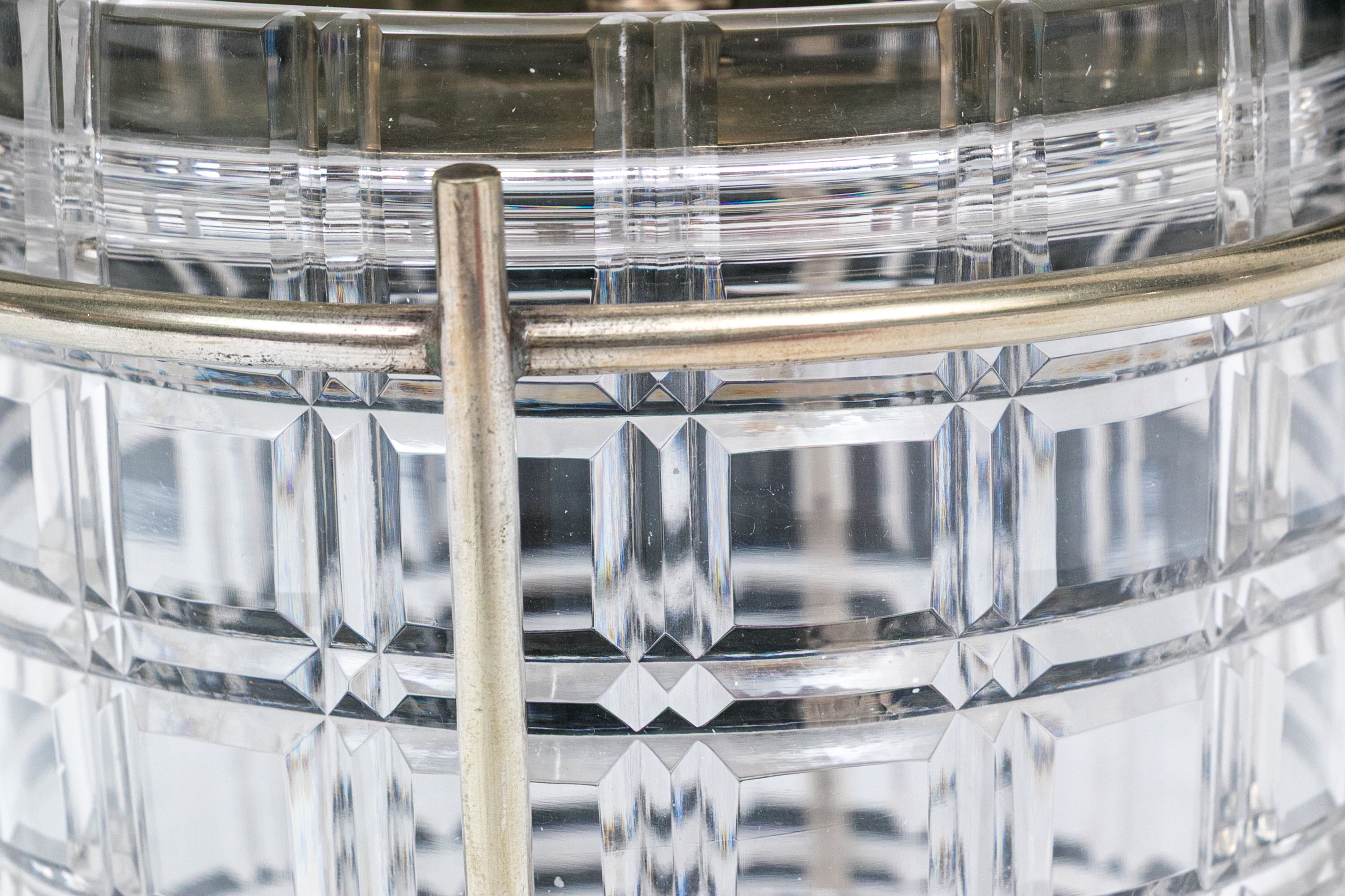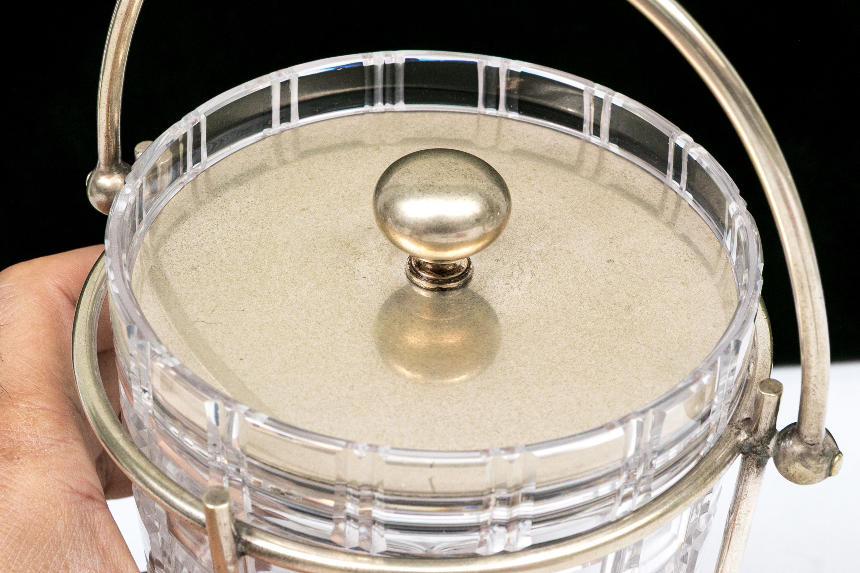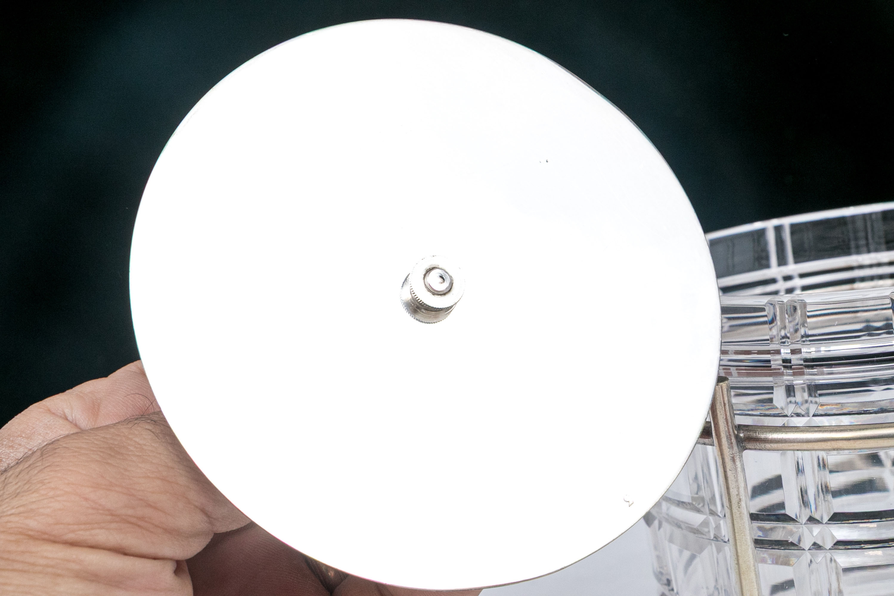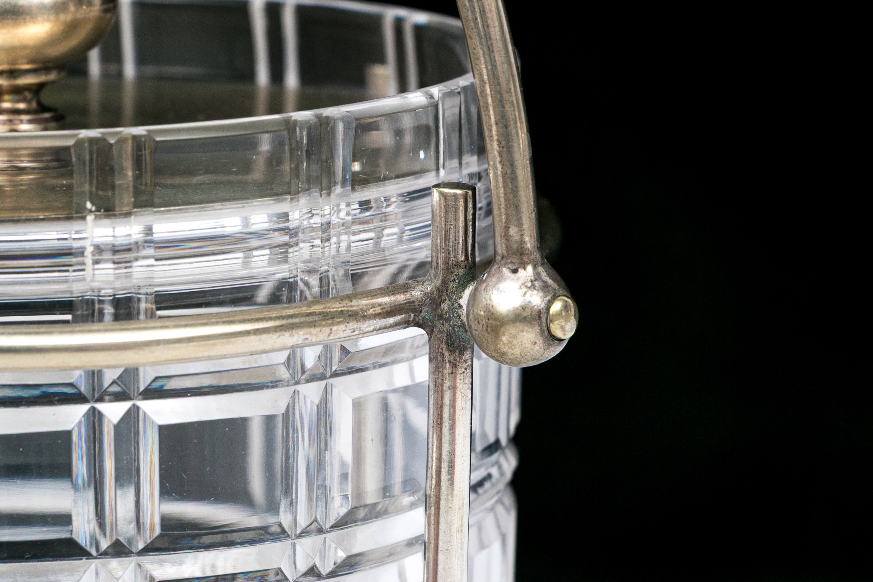 The cut crystal round jar in an overall square pattern separate from the silverplate stand. The four legged silverplate and with swivel handle and a matte finish lid. The silverplate has been restored and replated to a fine finish,