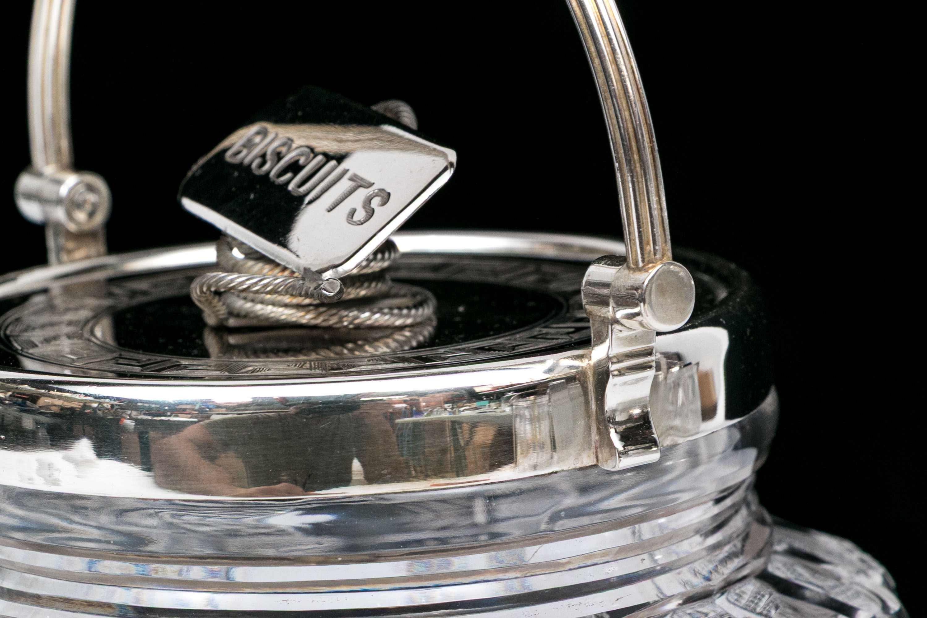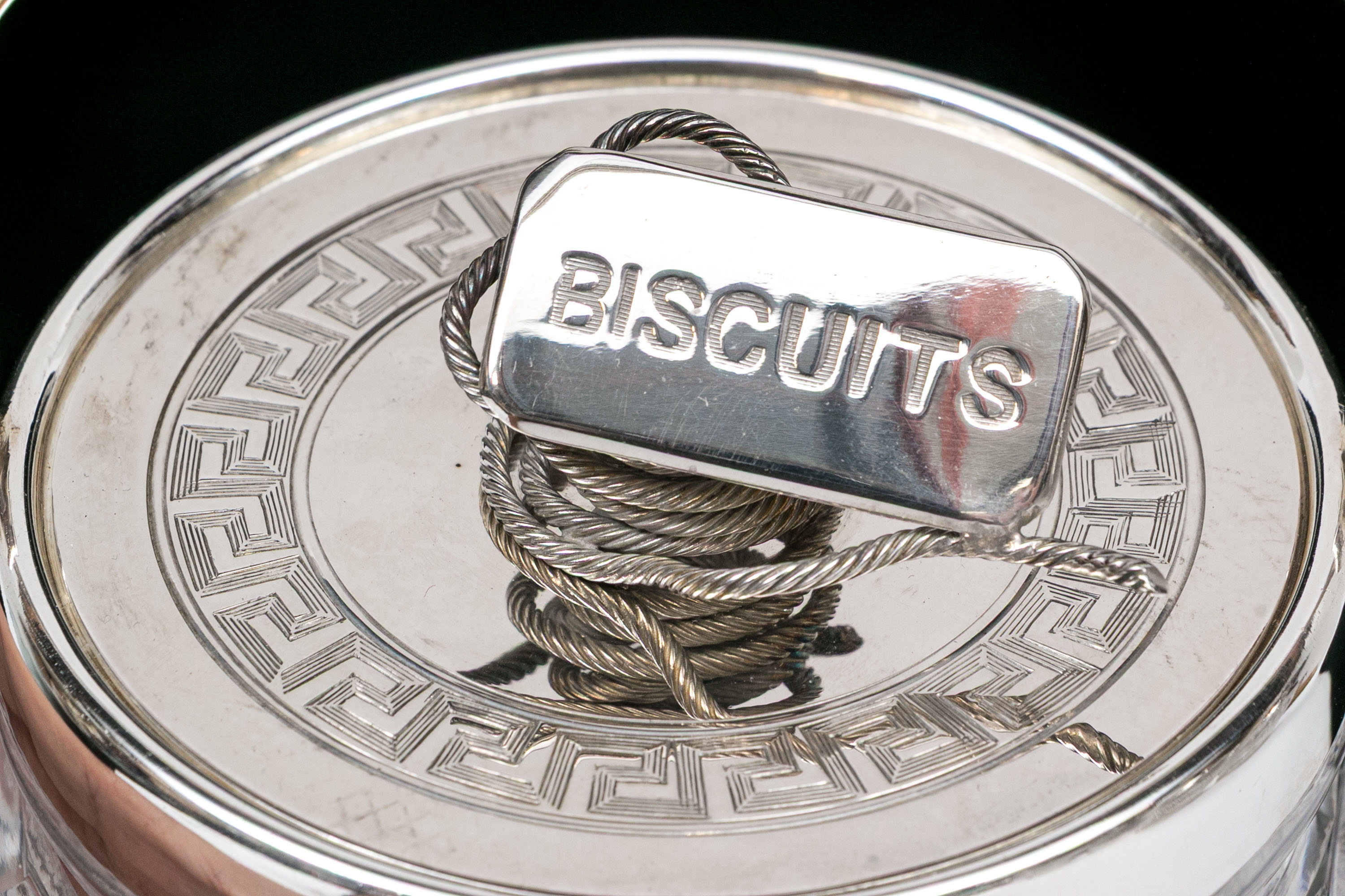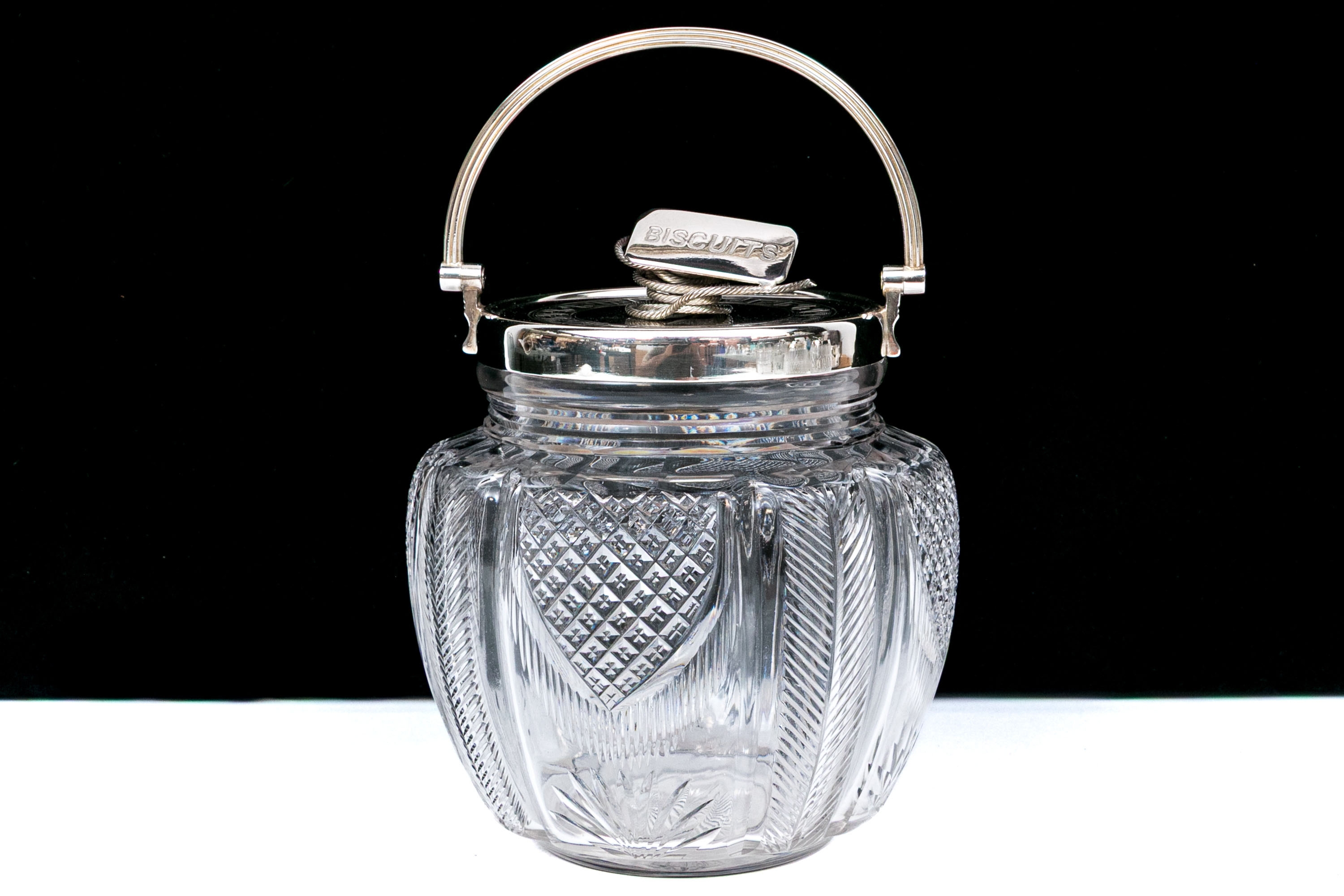 A bulbous jar with cut diamond shields and leaves and sunburst base. With fine silverplate mount and swivel handle. The lid with a chased Greek key band and rope form finial with Biscuits label. All silverplate has been restored and replated to a fine finish.
