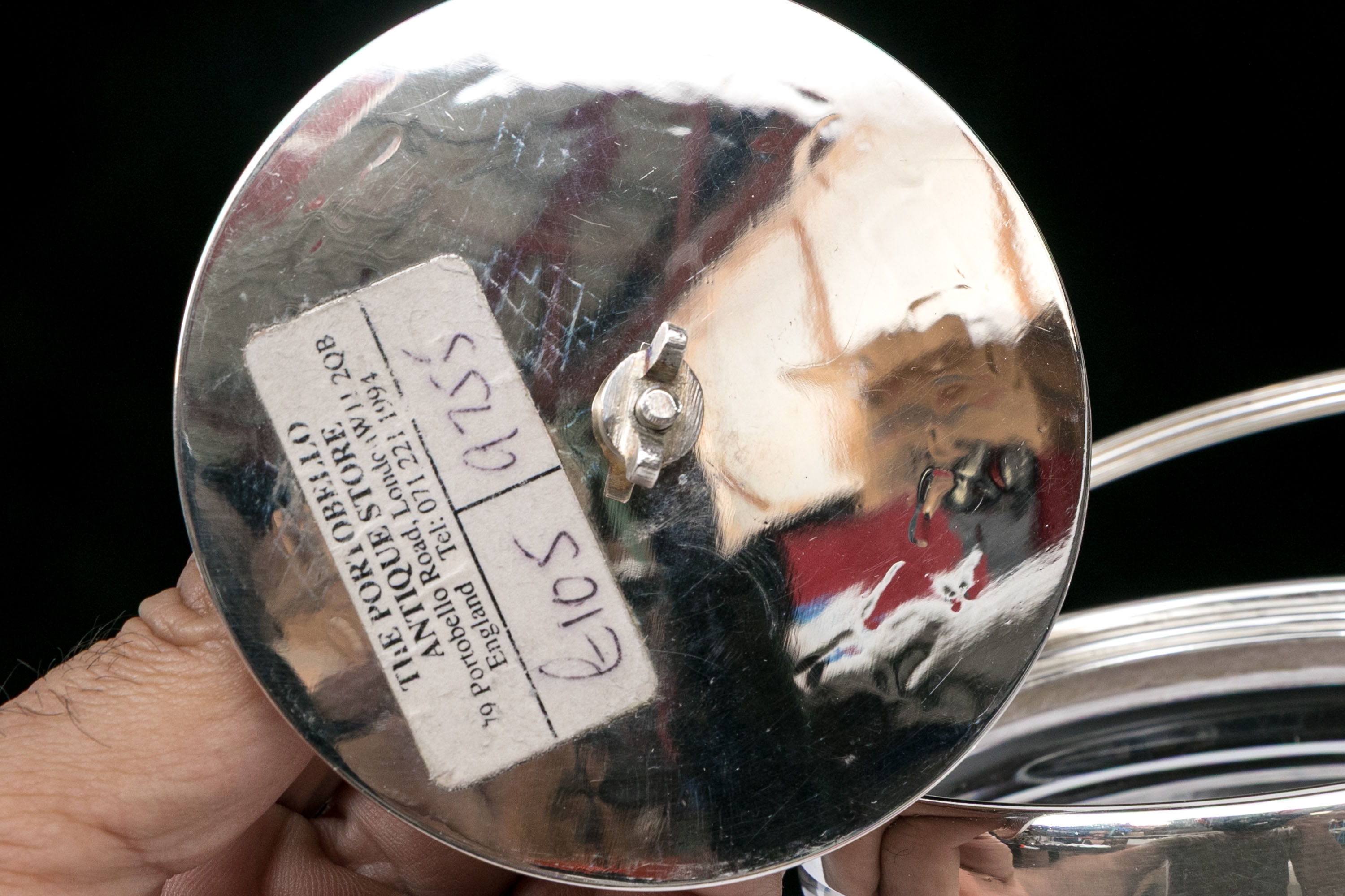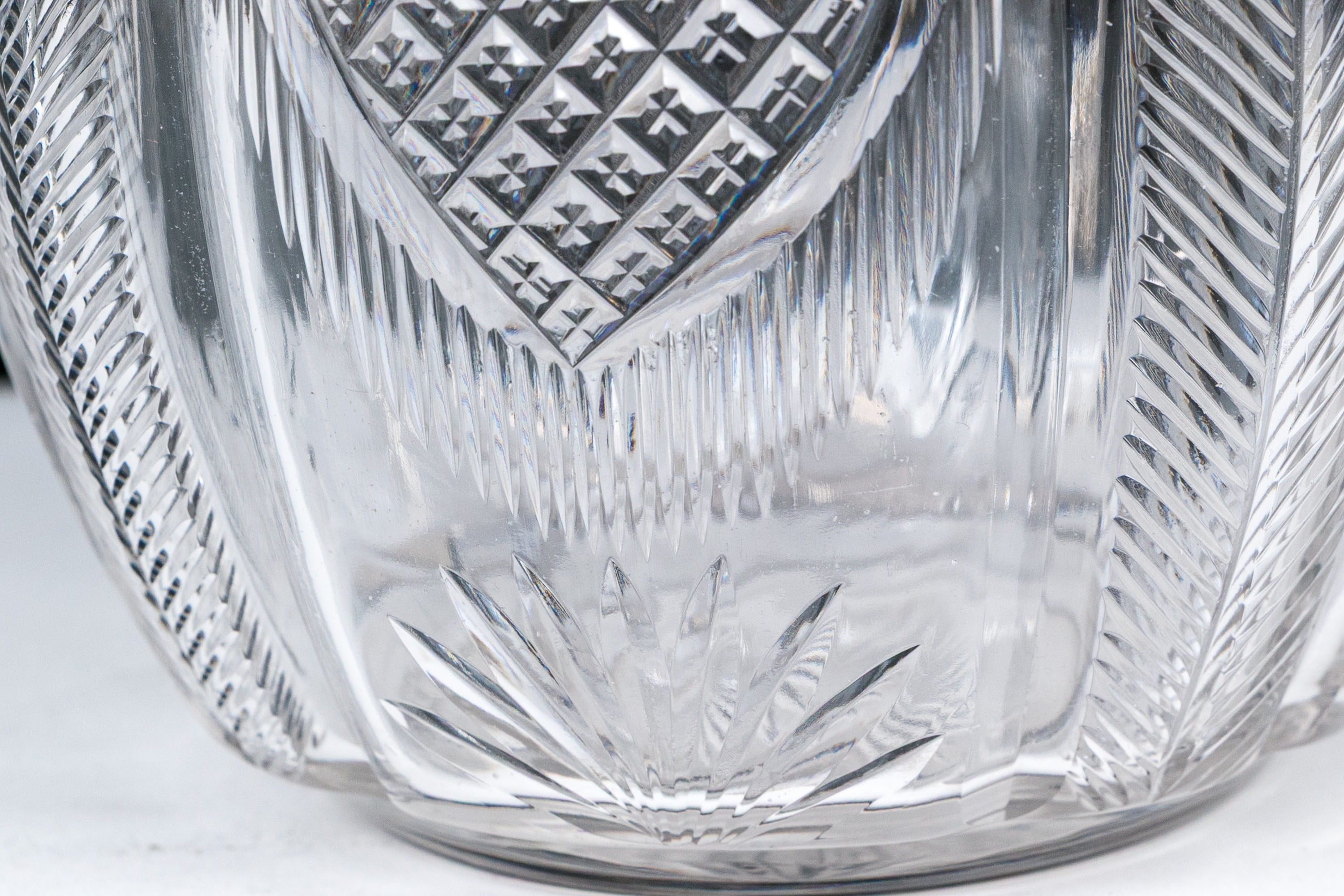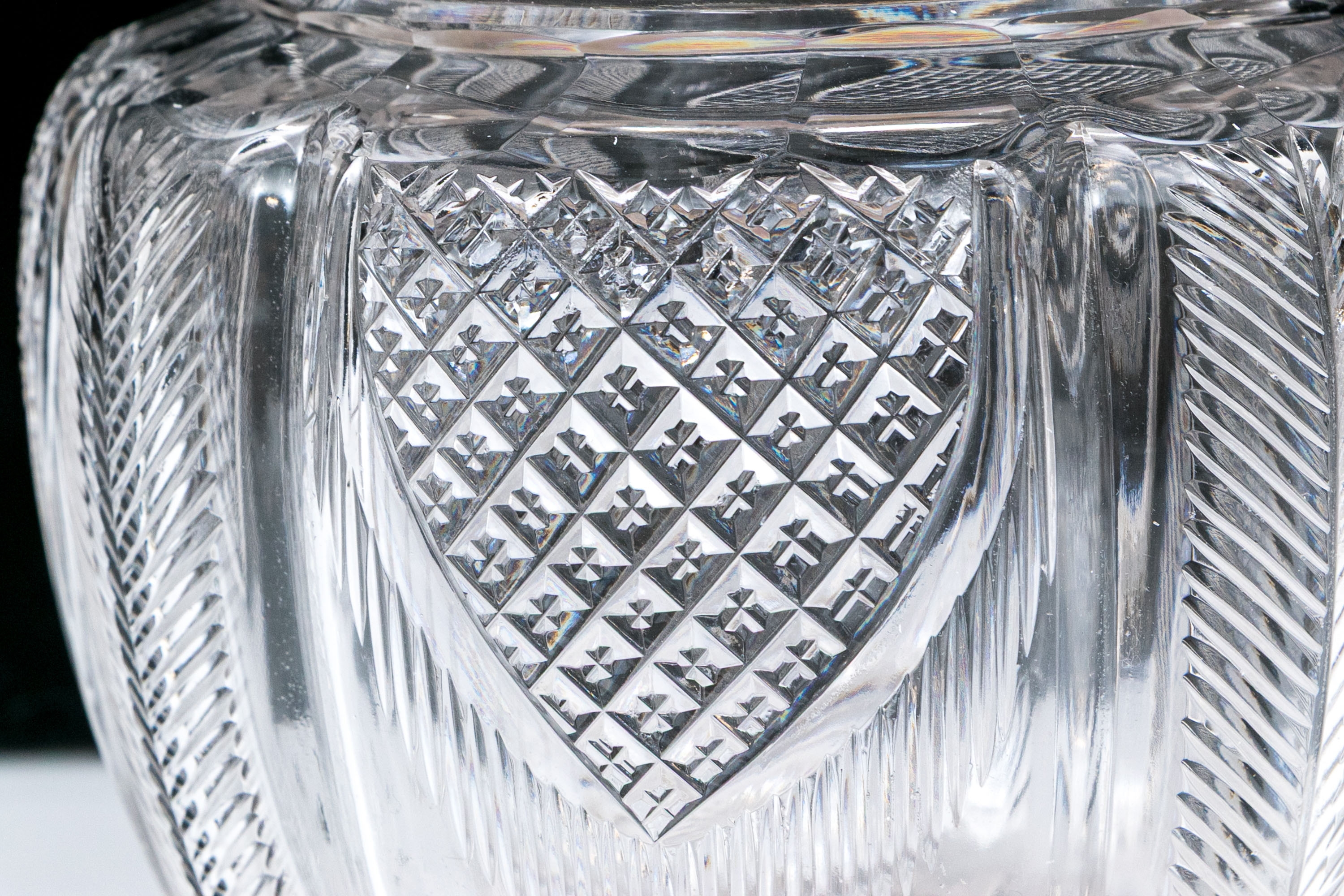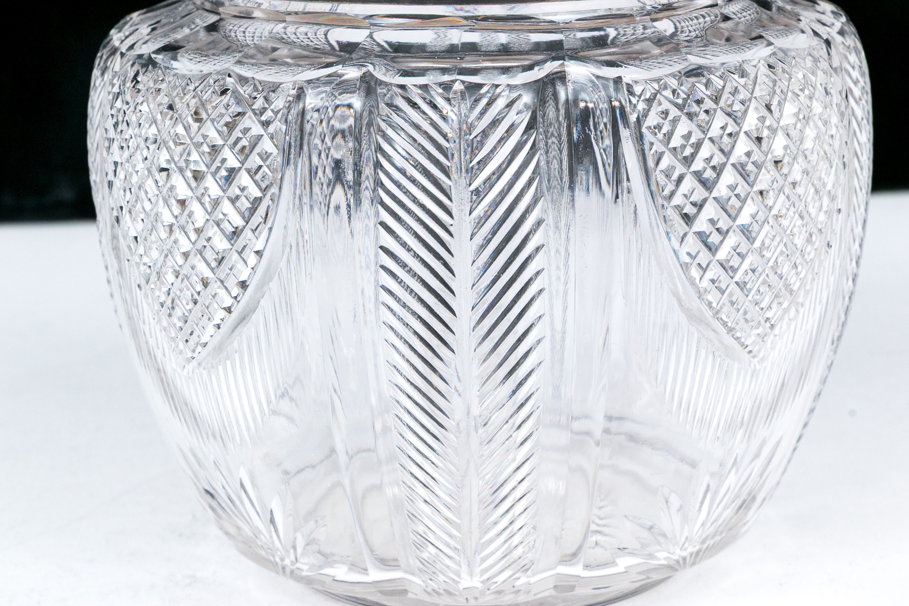 A bulbous jar with cut diamond shields and leaves and sunburst base. With fine silverplate mount and swivel handle. The lid with a chased Greek key band and rope form finial with Biscuits label. All silverplate has been restored and replated to a fine finish.