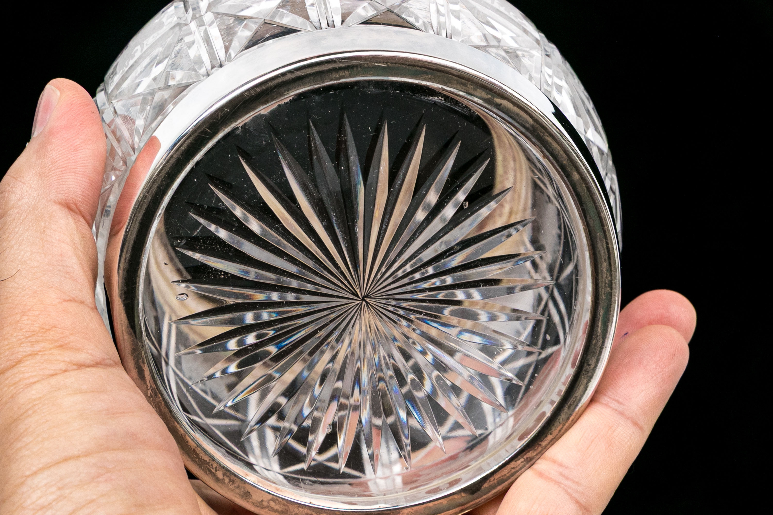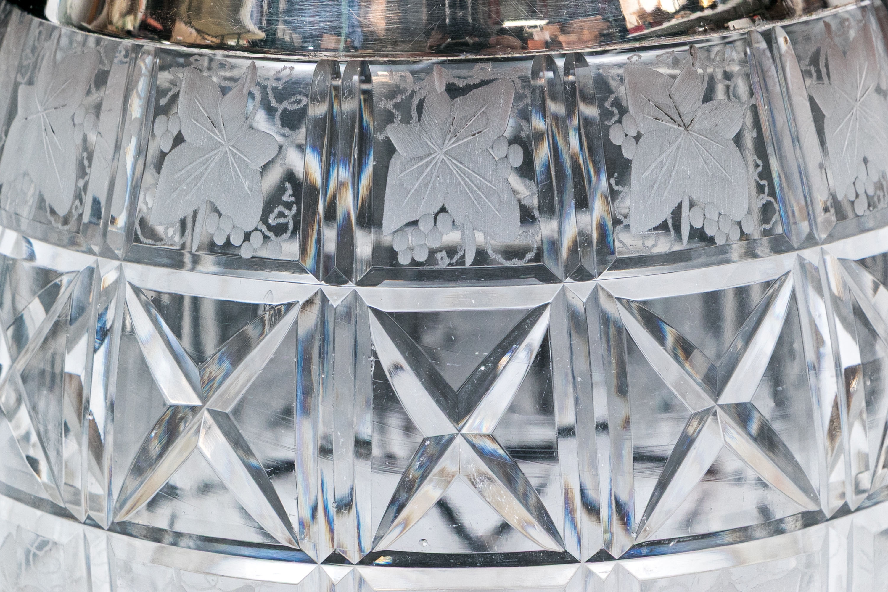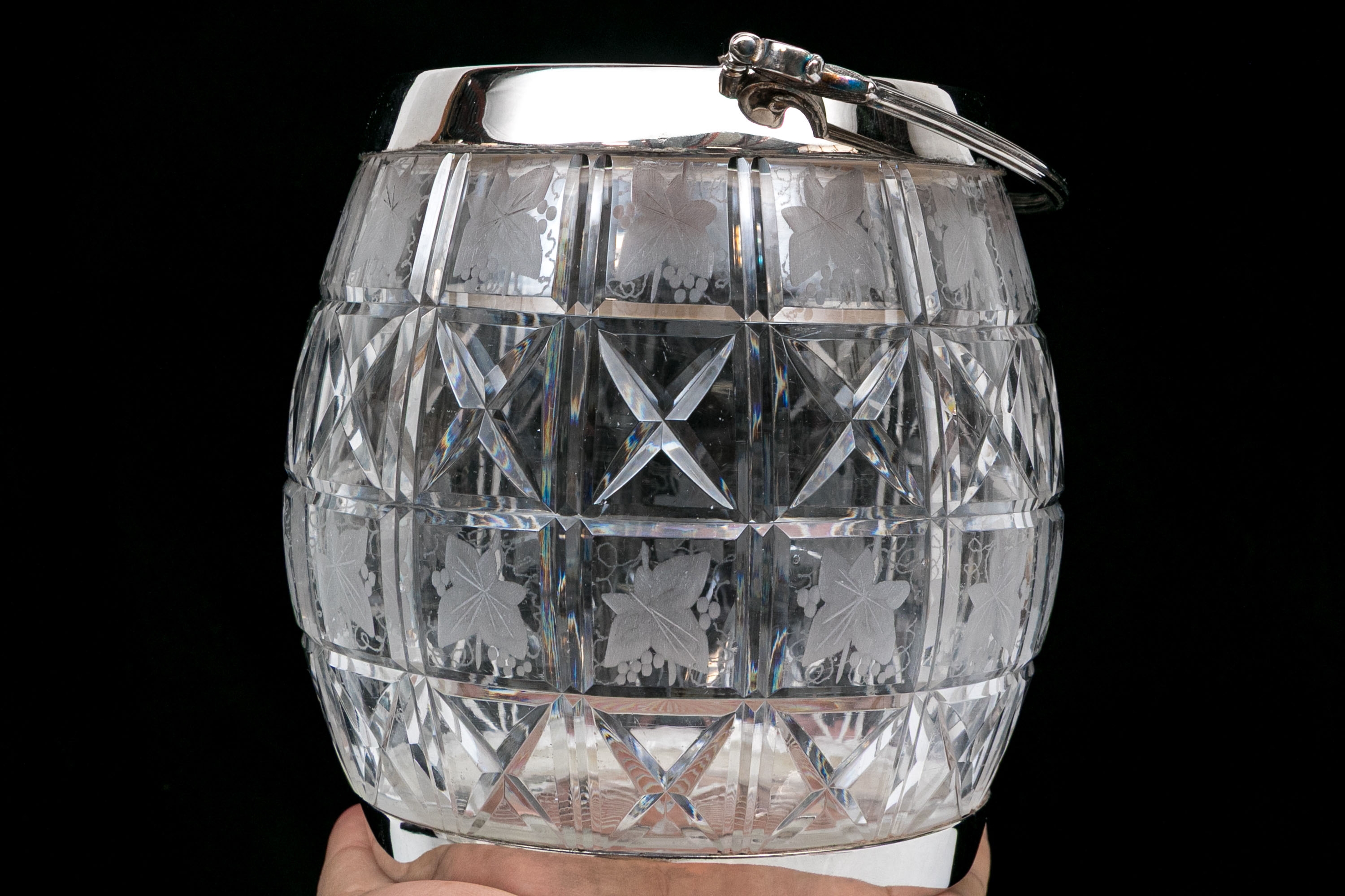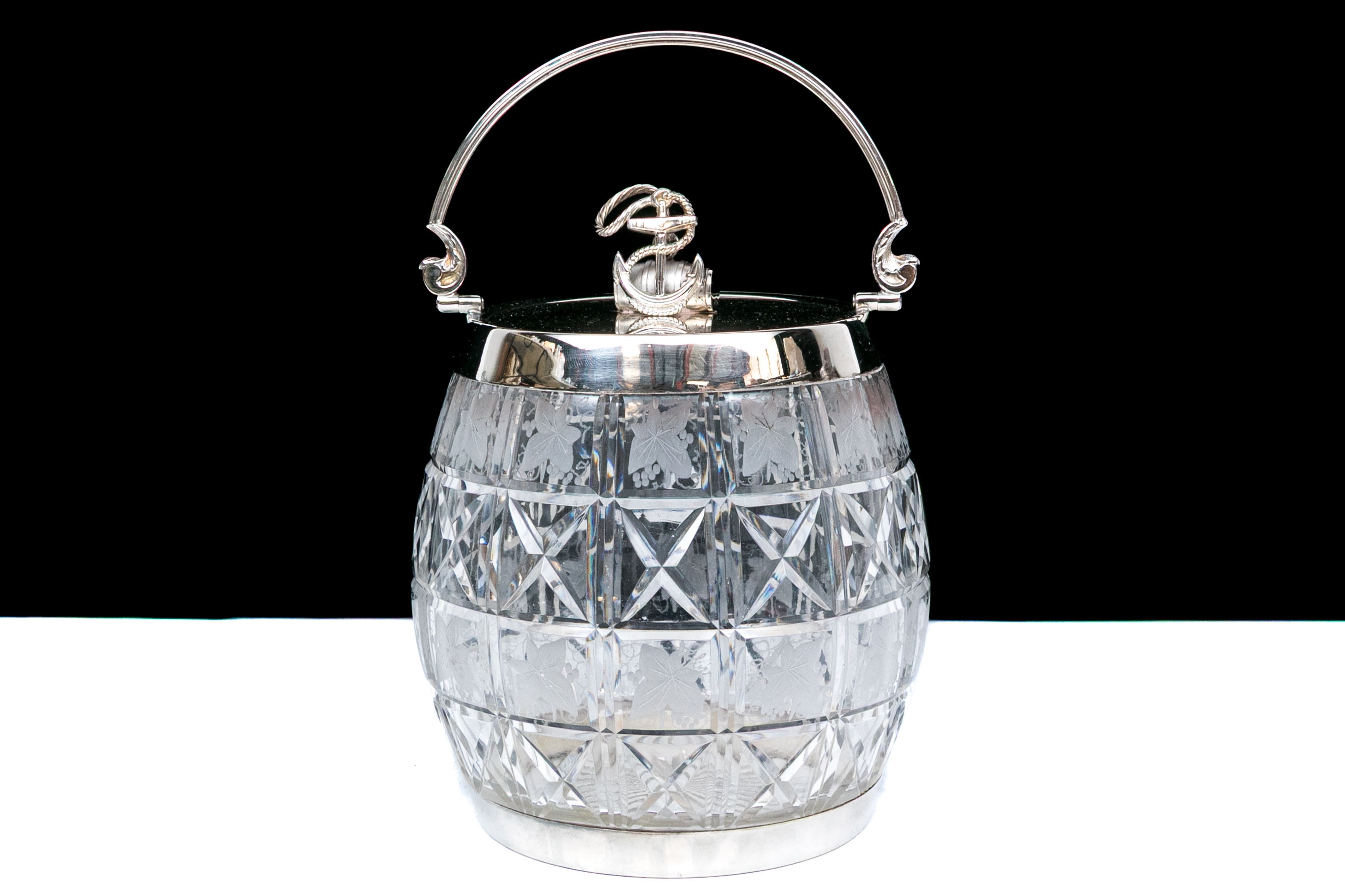 The jar with cut bands of X's and etched leaves and starburst base. With fine silverplate mounts top and bottom, a swivel handle and lid with 3-D anchor and keg motif. The silverplate is restored and replated to a fine finish.