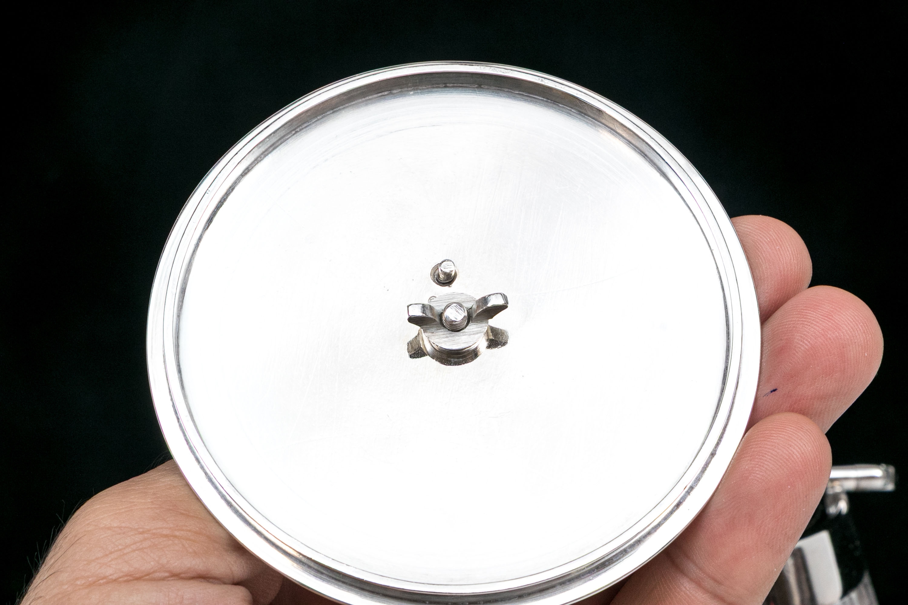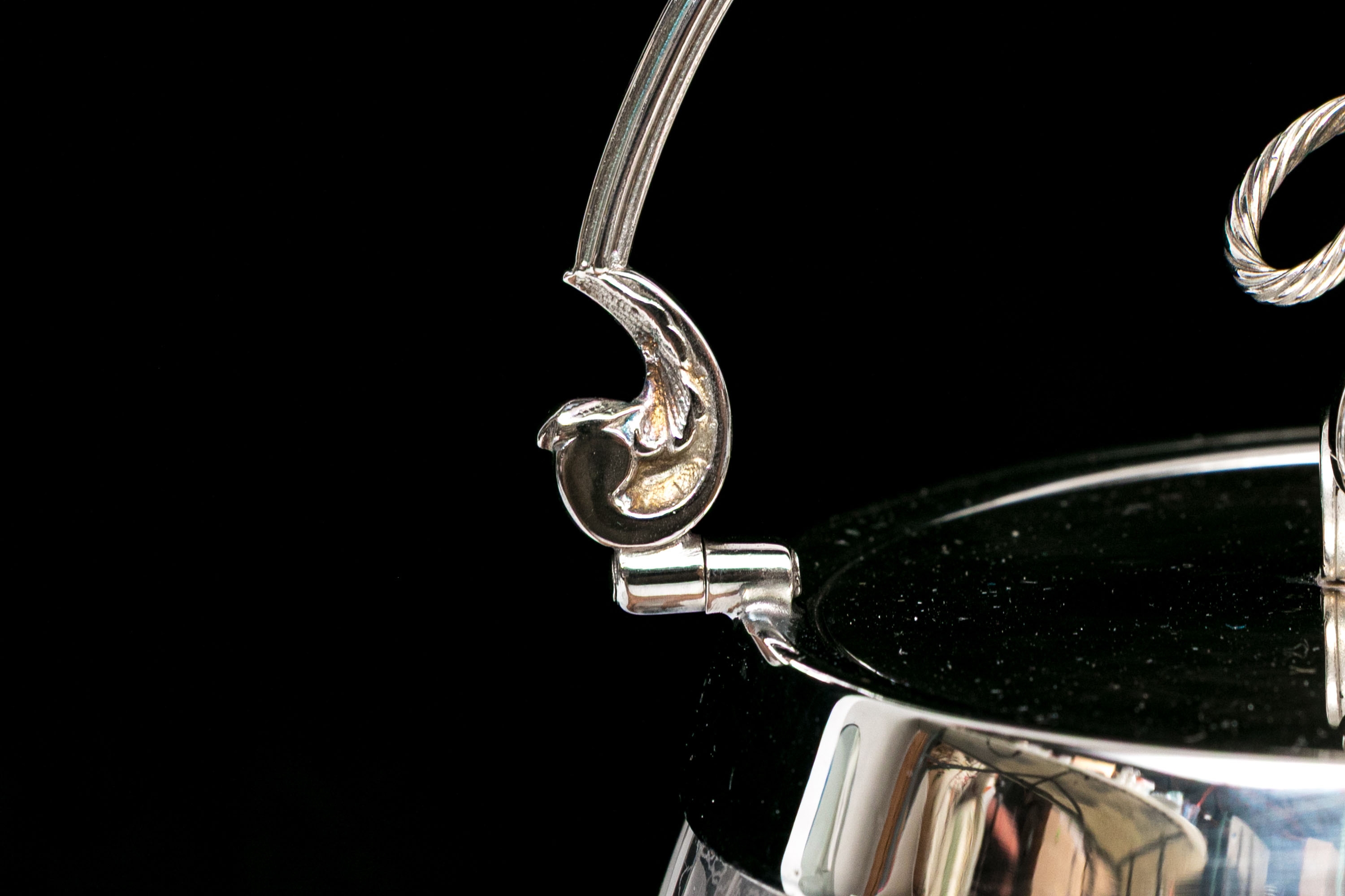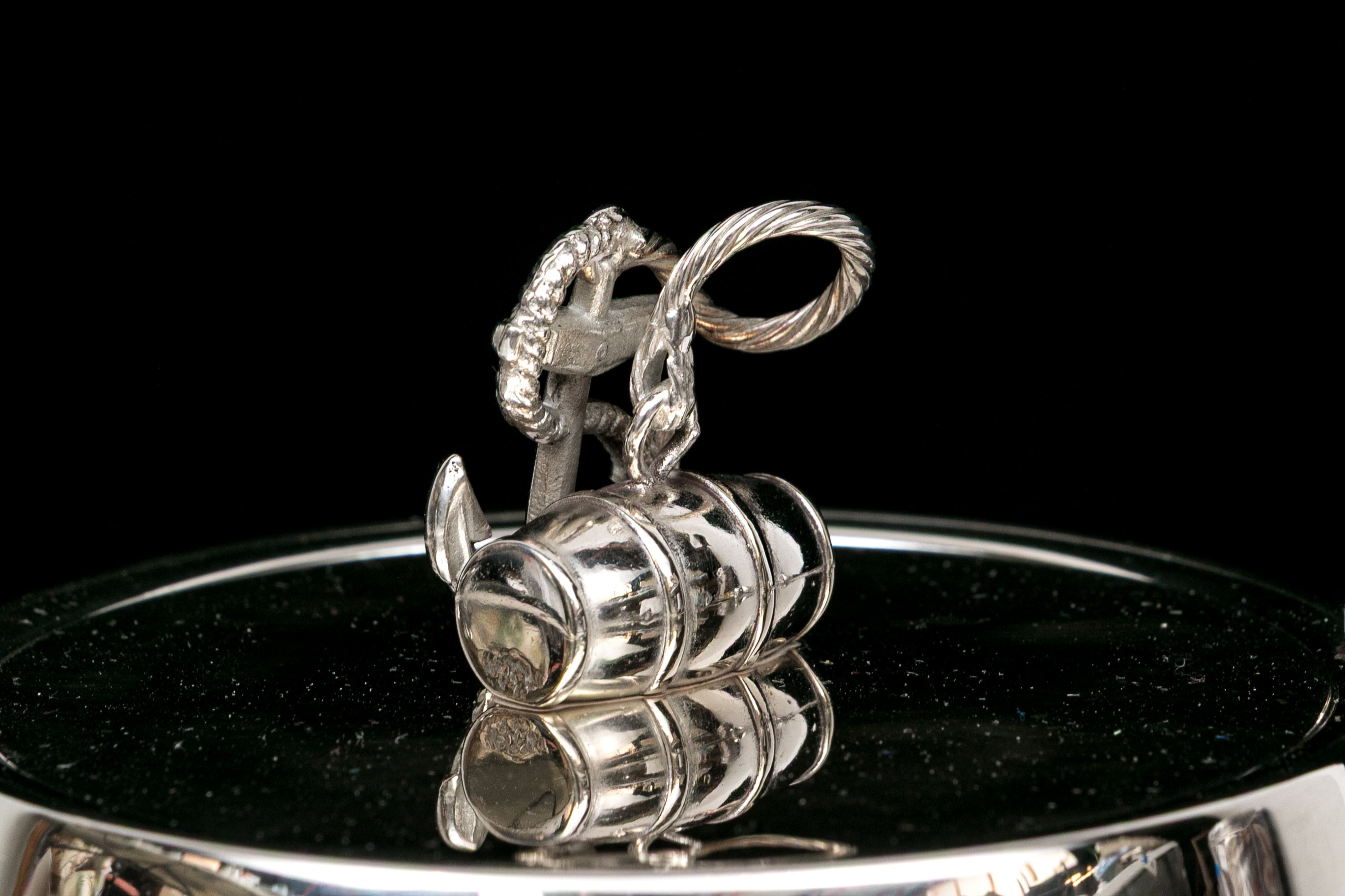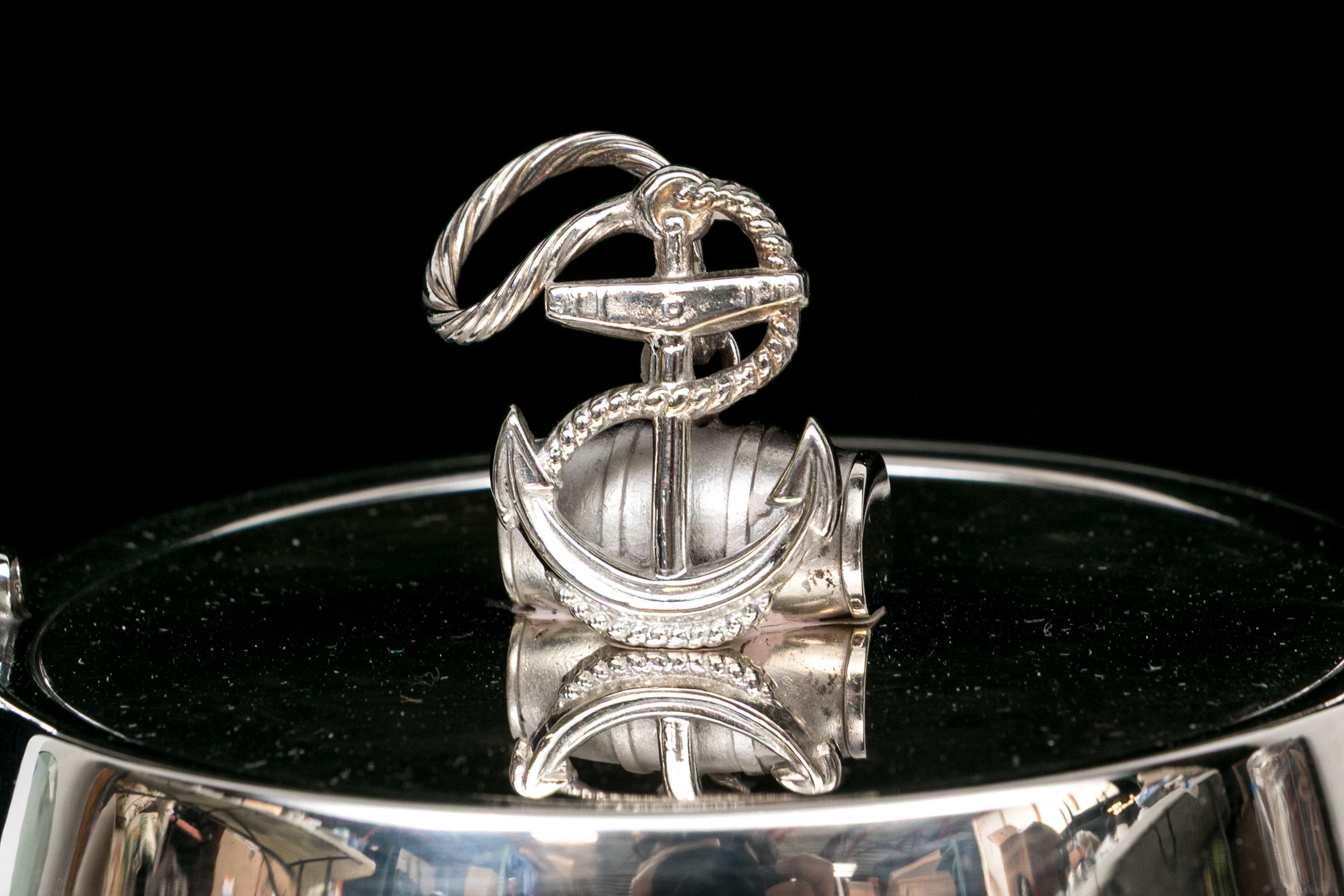 The jar with cut bands of X's and etched leaves and starburst base. With fine silverplate mounts top and bottom, a swivel handle and lid with 3-D anchor and keg motif. The silverplate is restored and replated to a fine finish.
