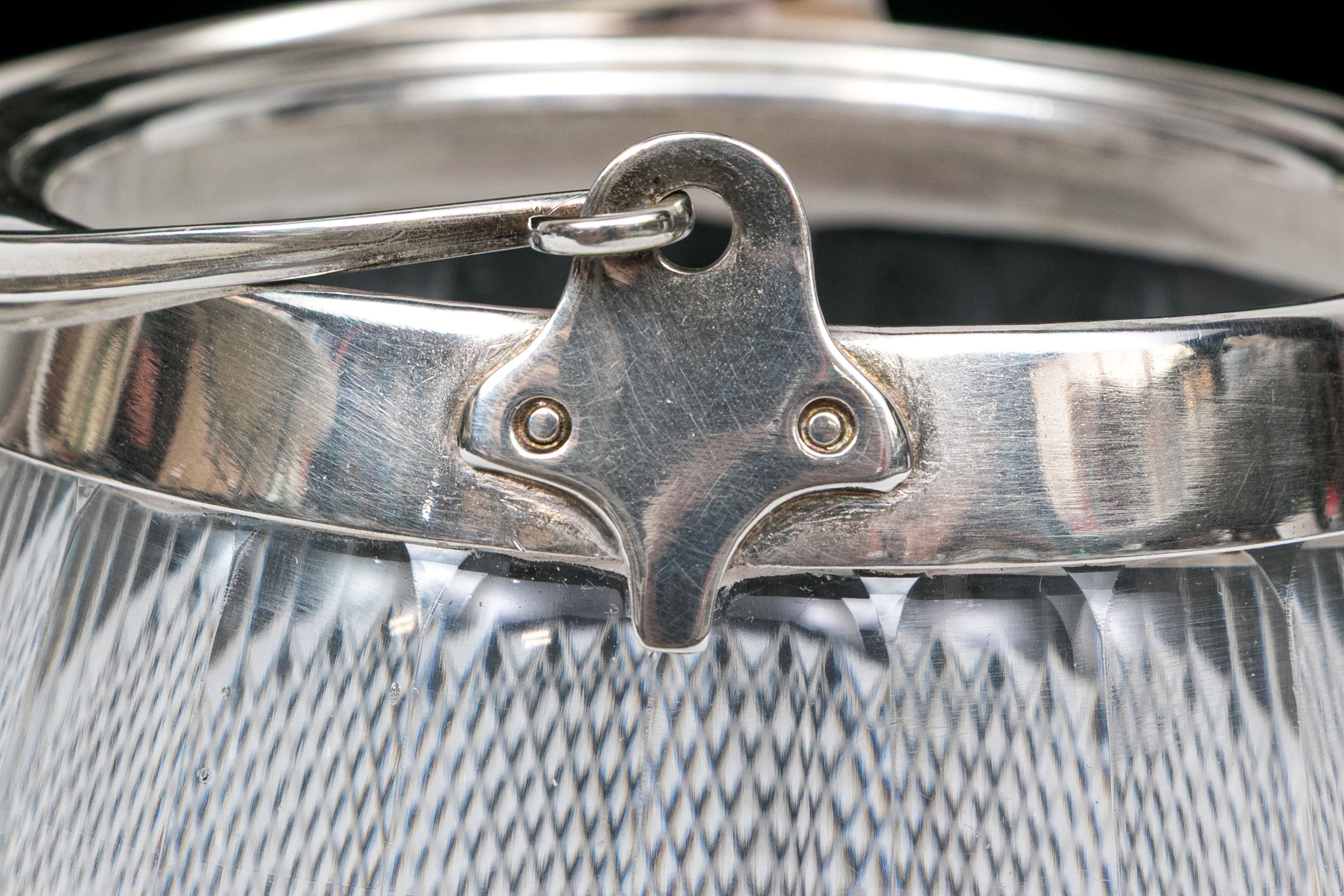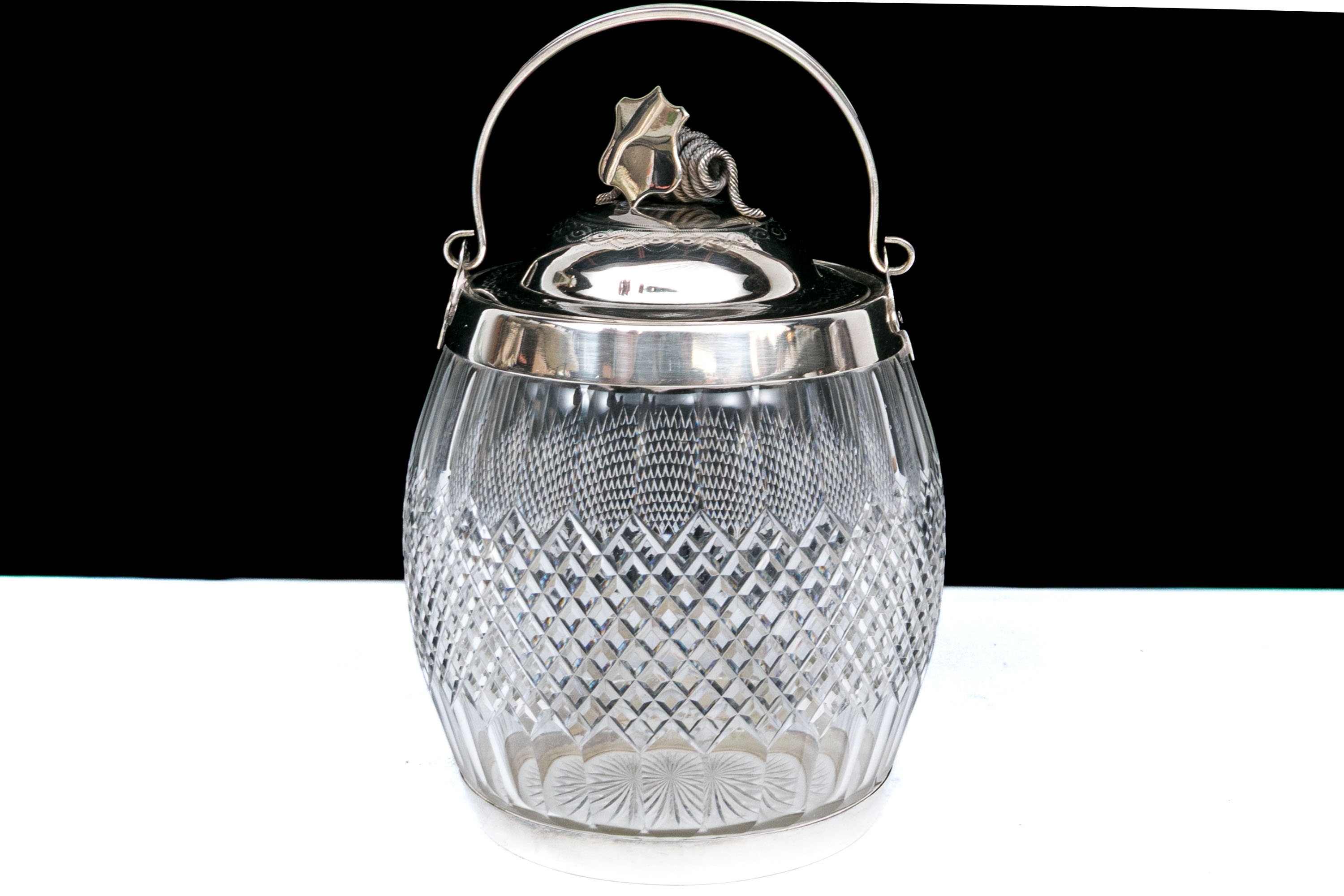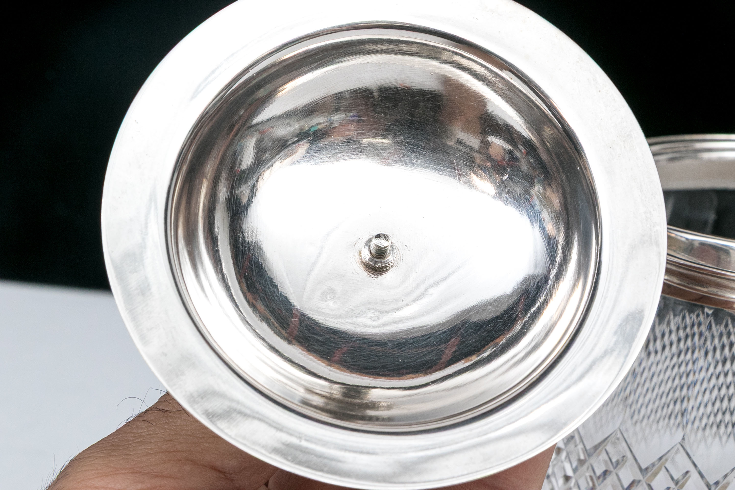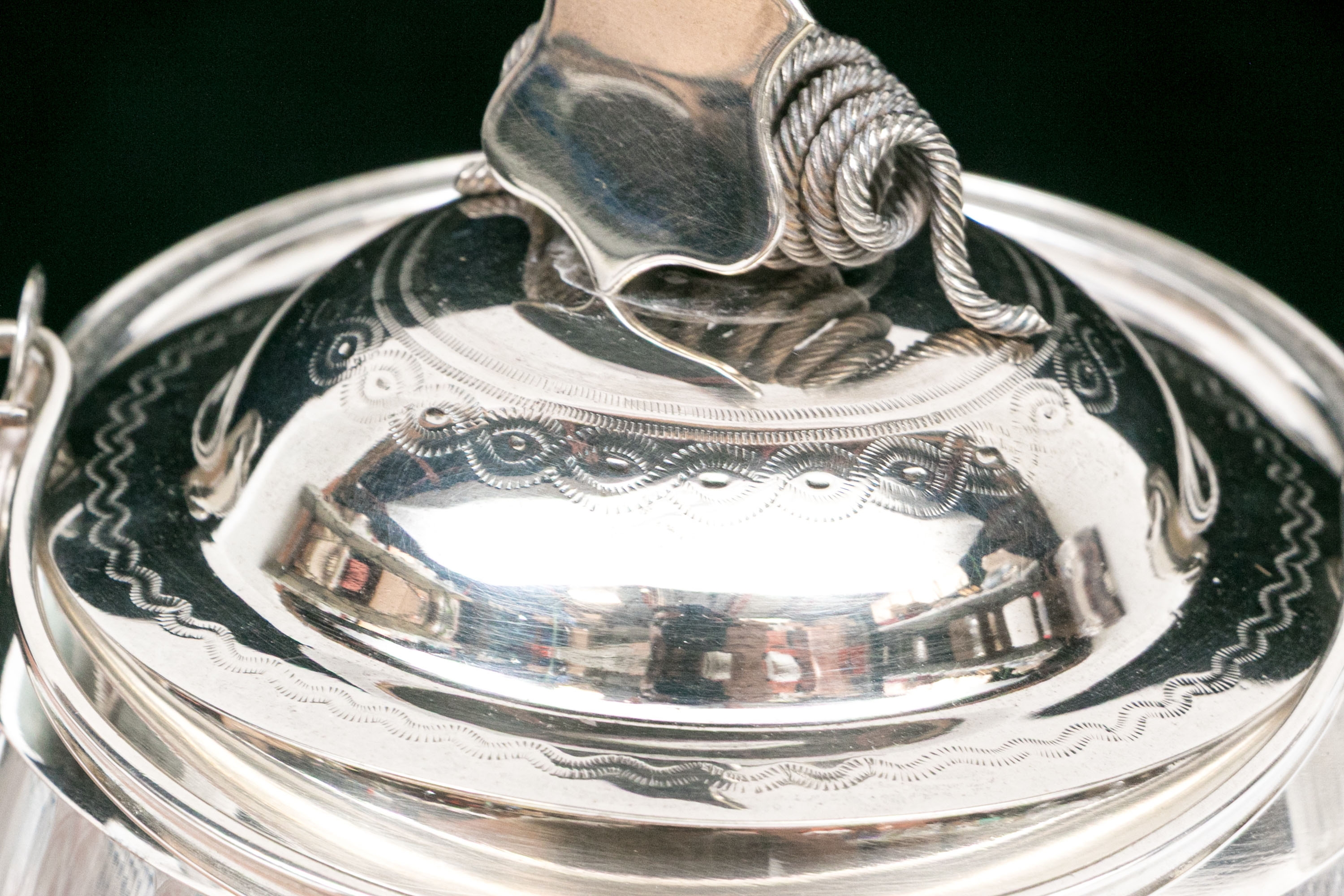A bulbous jar cit it's a wide diamond pattern band and sunburst base. With fine silverplate top and bottom mounts, swivel handle and domed lid with rope form finial with shield plaque. The silverplate has been restored and replated to a fine finish.