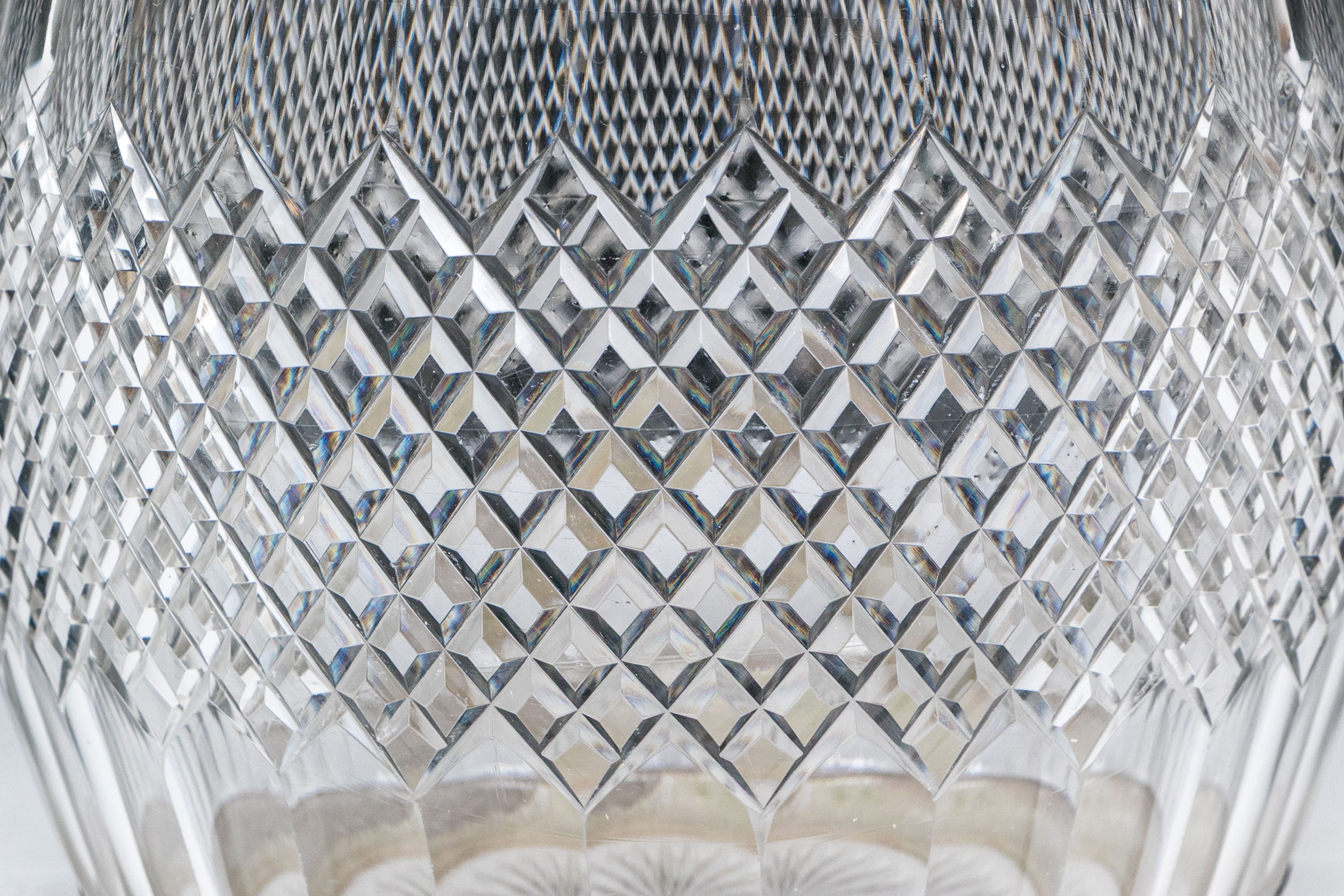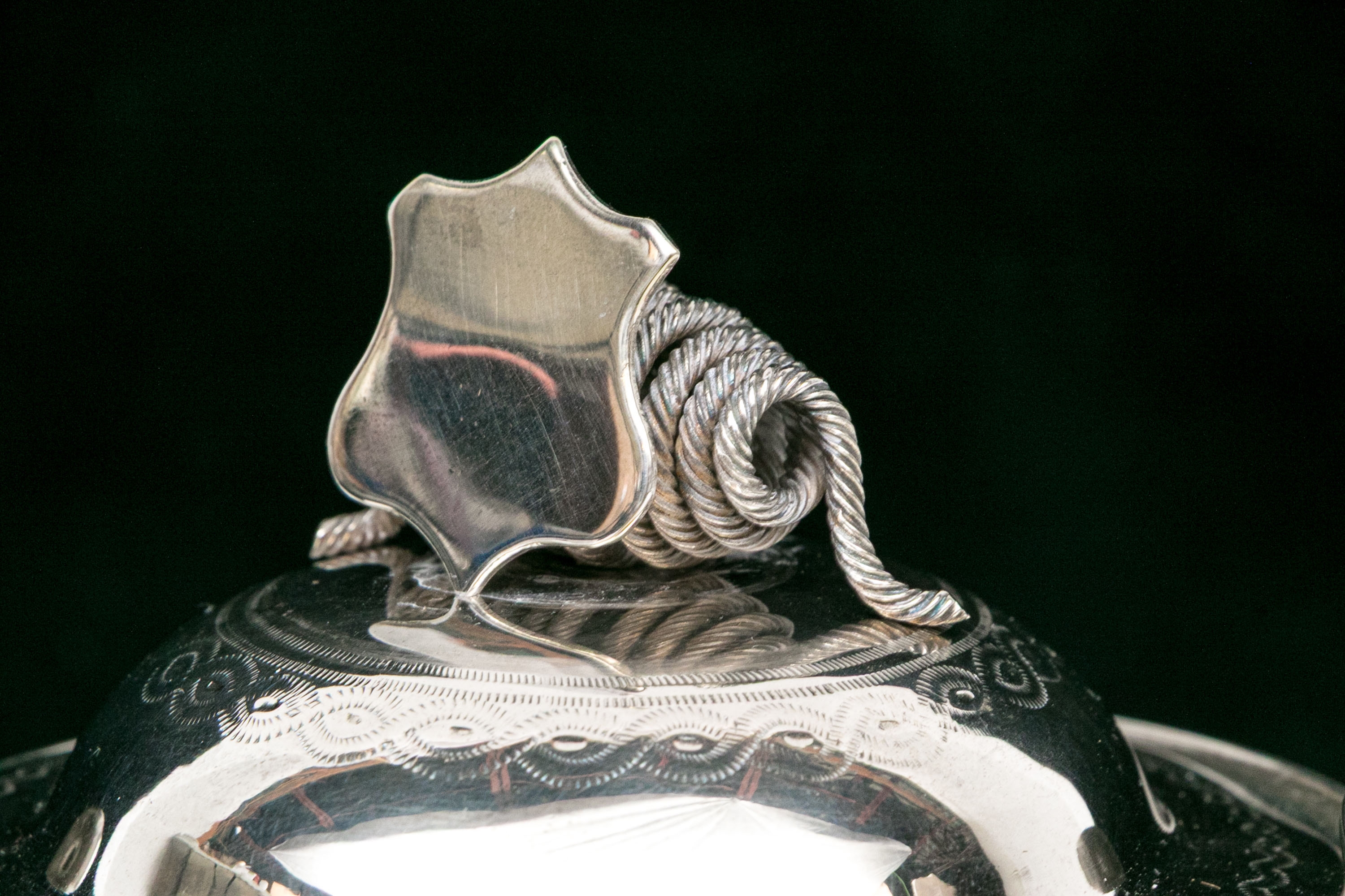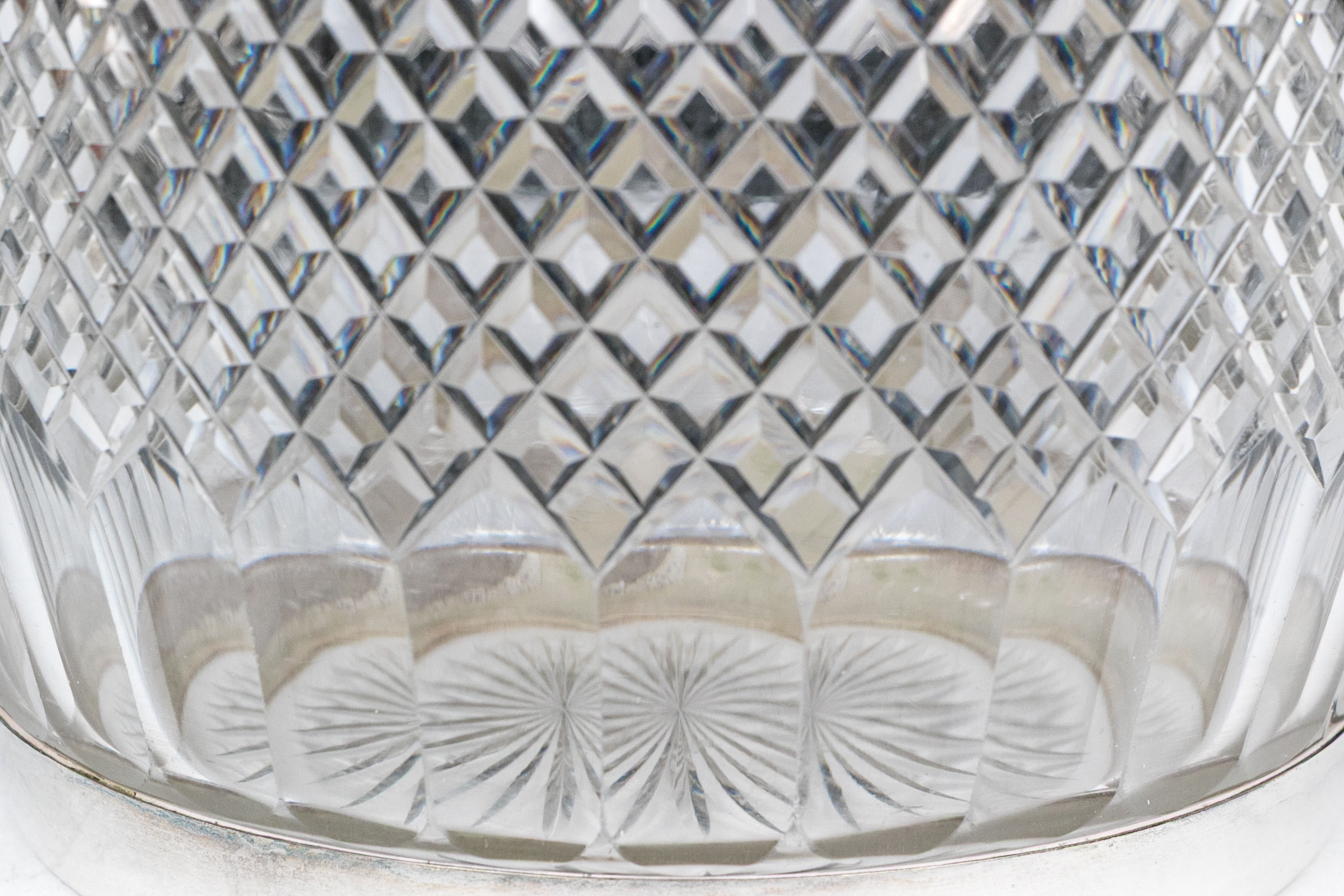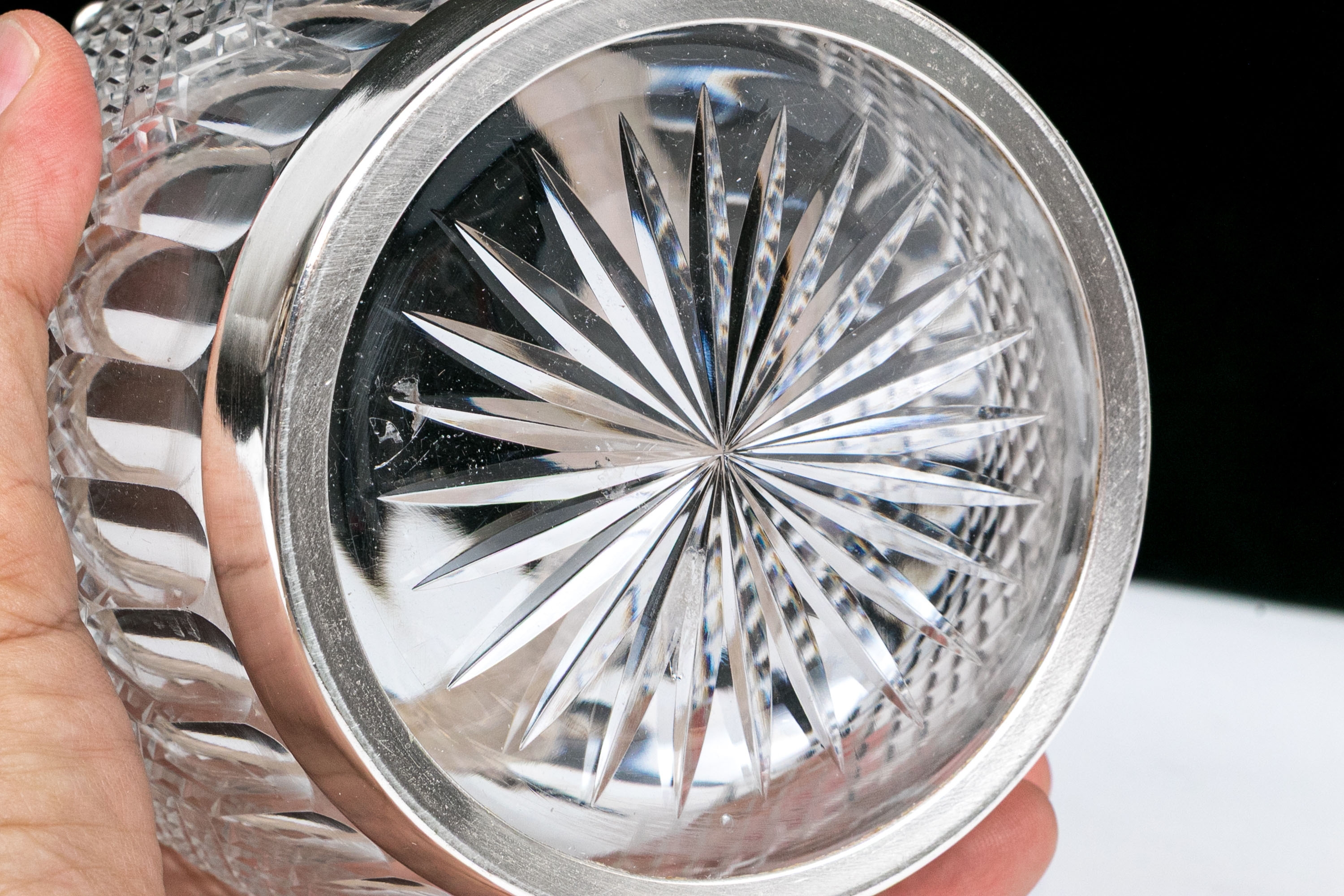 A bulbous jar cit it's a wide diamond pattern band and sunburst base. With fine silverplate top and bottom mounts, swivel handle and domed lid with rope form finial with shield plaque. The silverplate has been restored and replated to a fine finish.