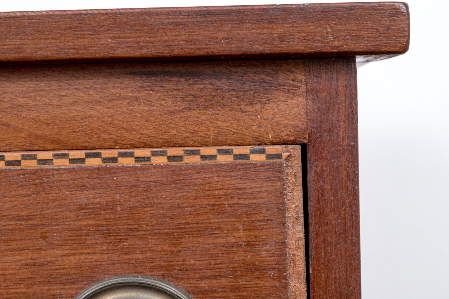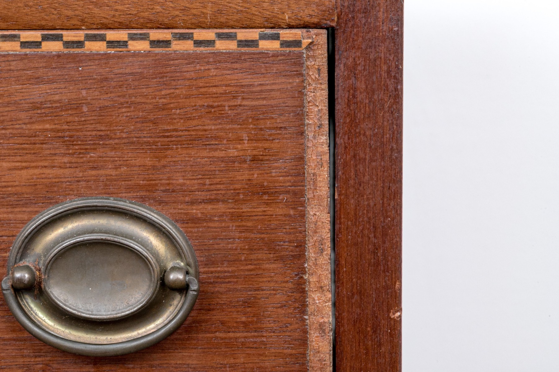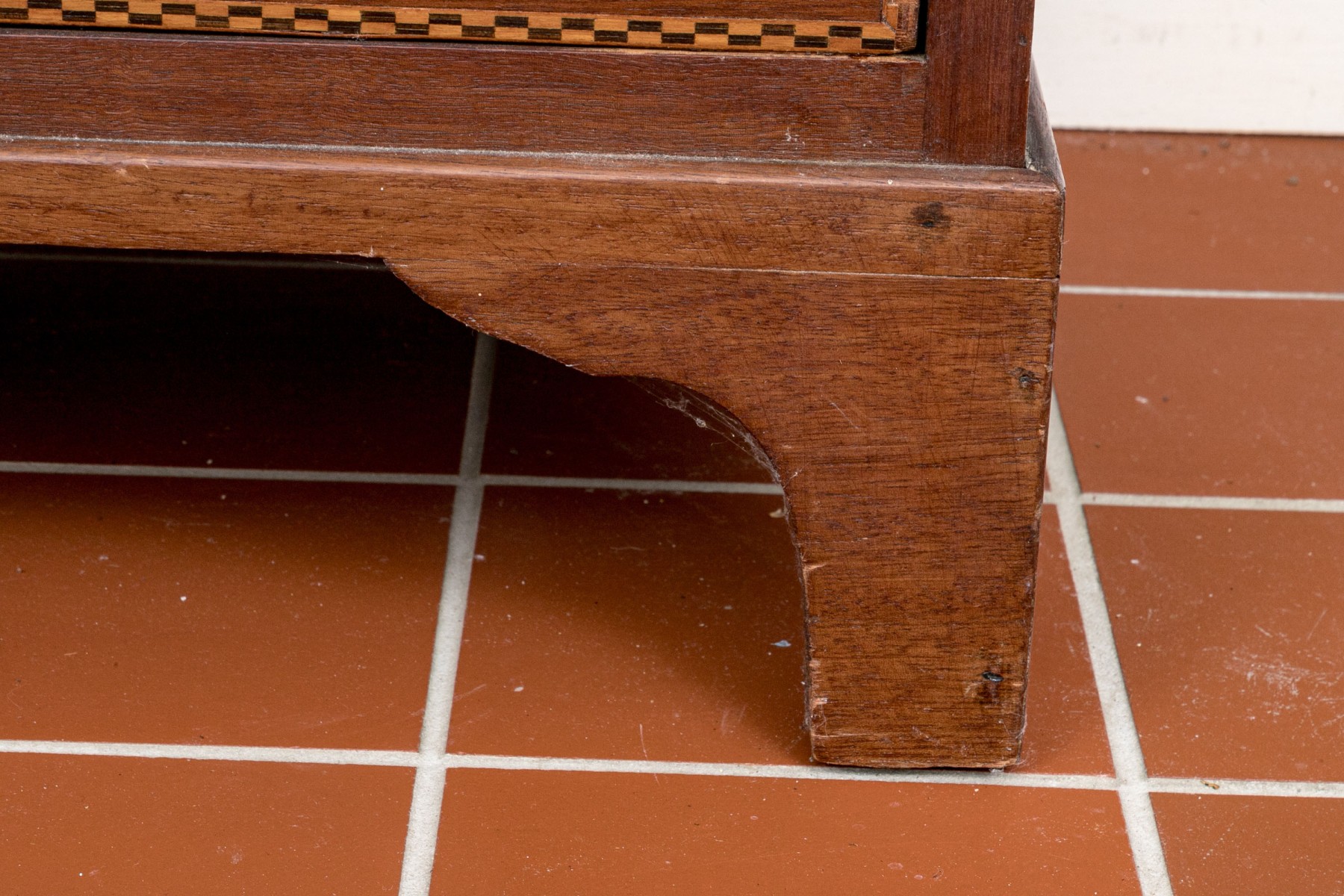 Condition: Losses to the parquetry inlaid trim to each drawers, surface scuffs, oxidation to brass handles, wear commensurate with age and usage. See images as they are part of the condition report.