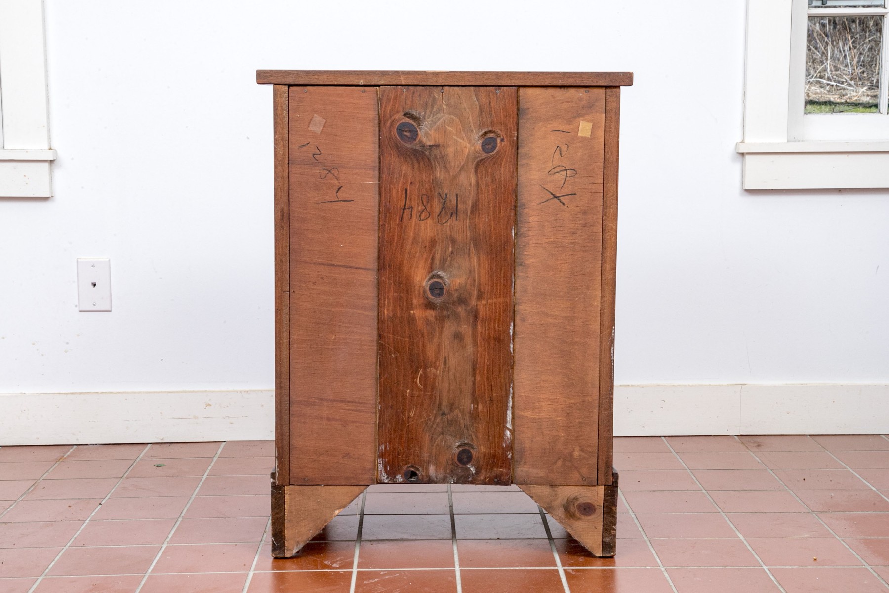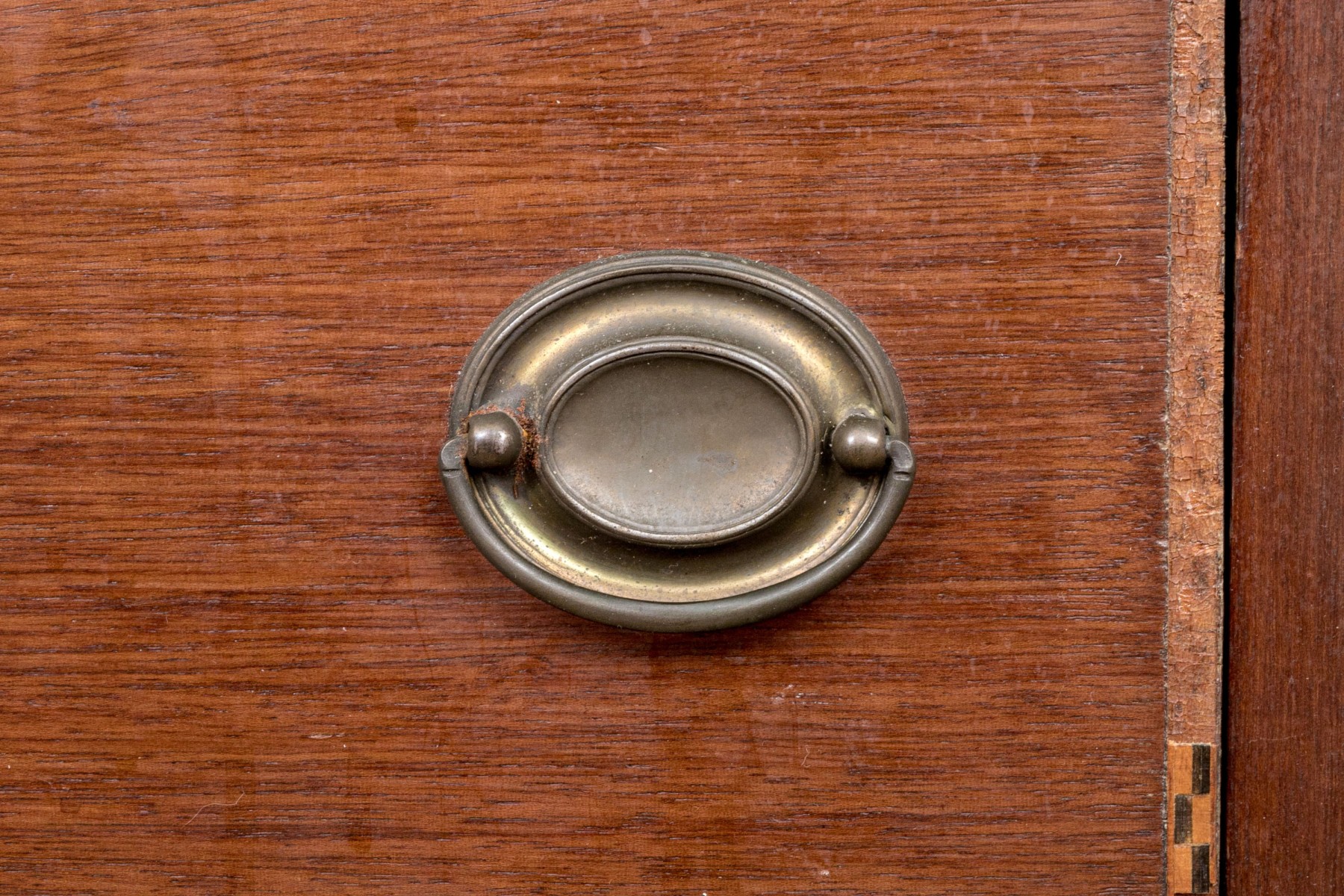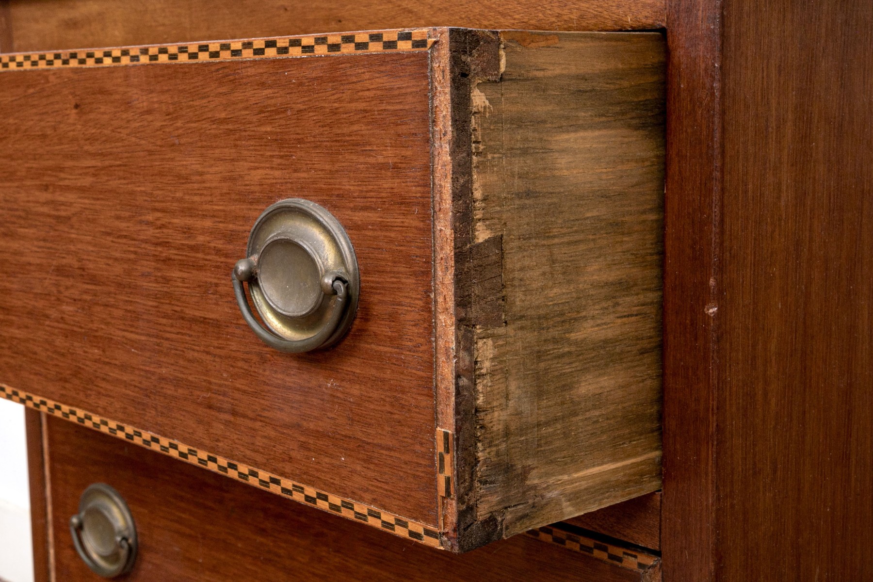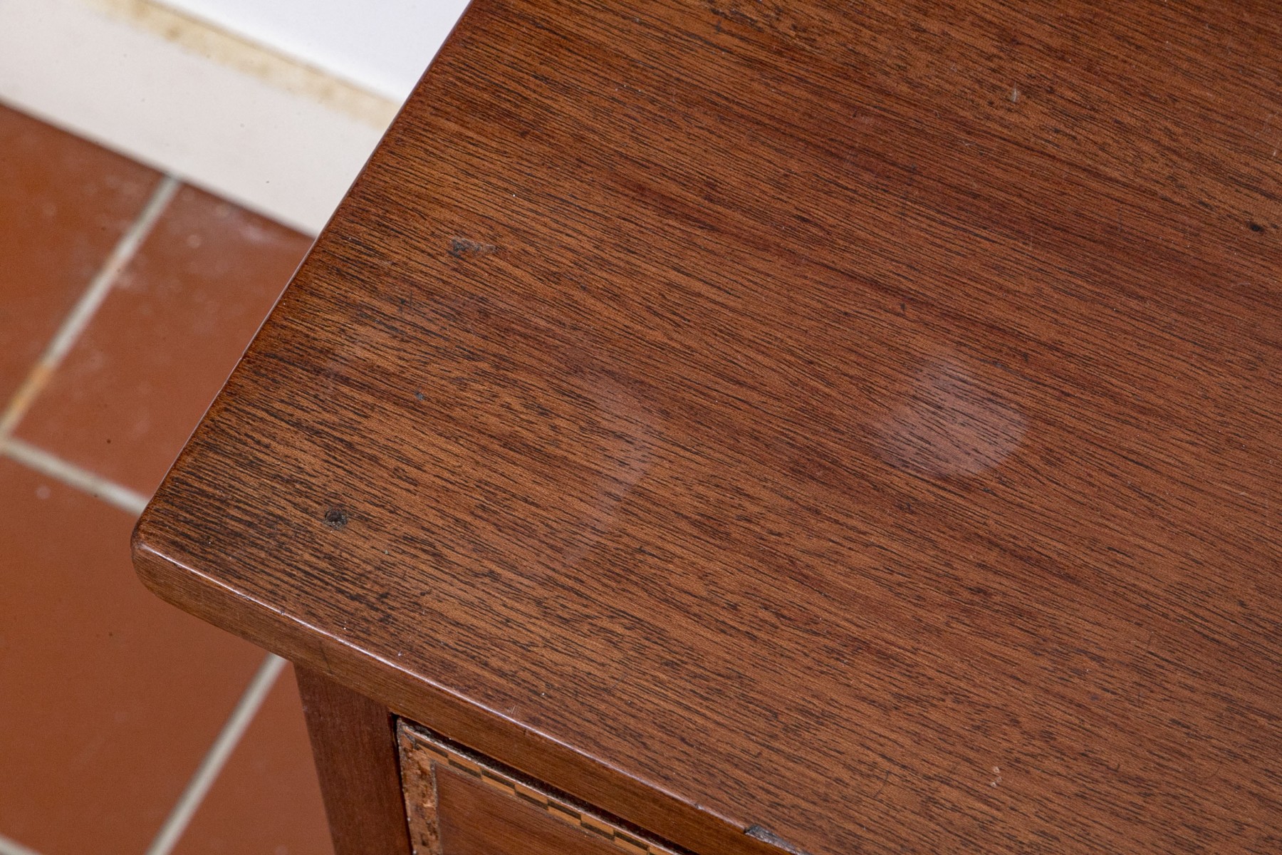 Condition: Losses to the parquetry inlaid trim to each drawers, surface scuffs, oxidation to brass handles, wear commensurate with age and usage. See images as they are part of the condition report.