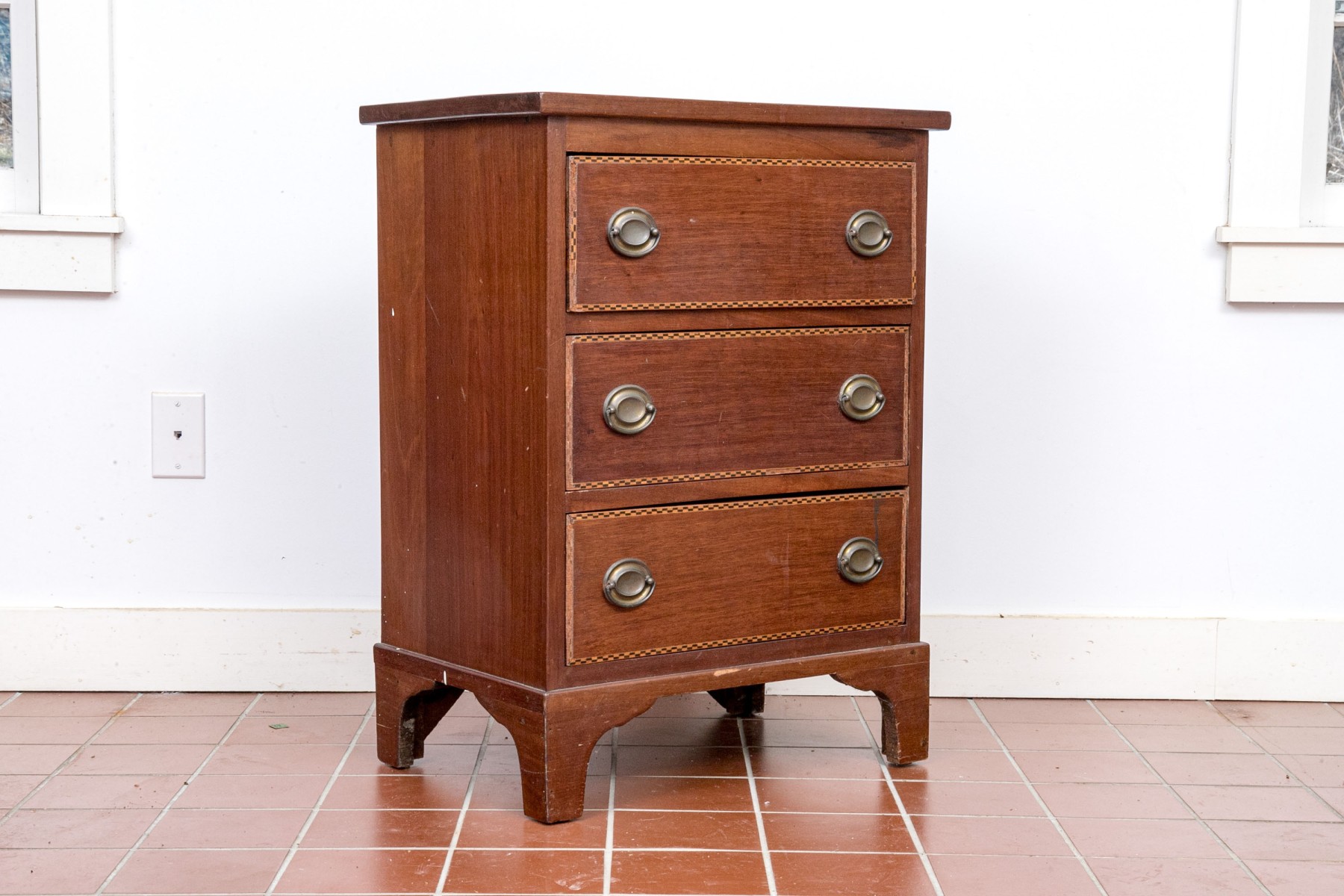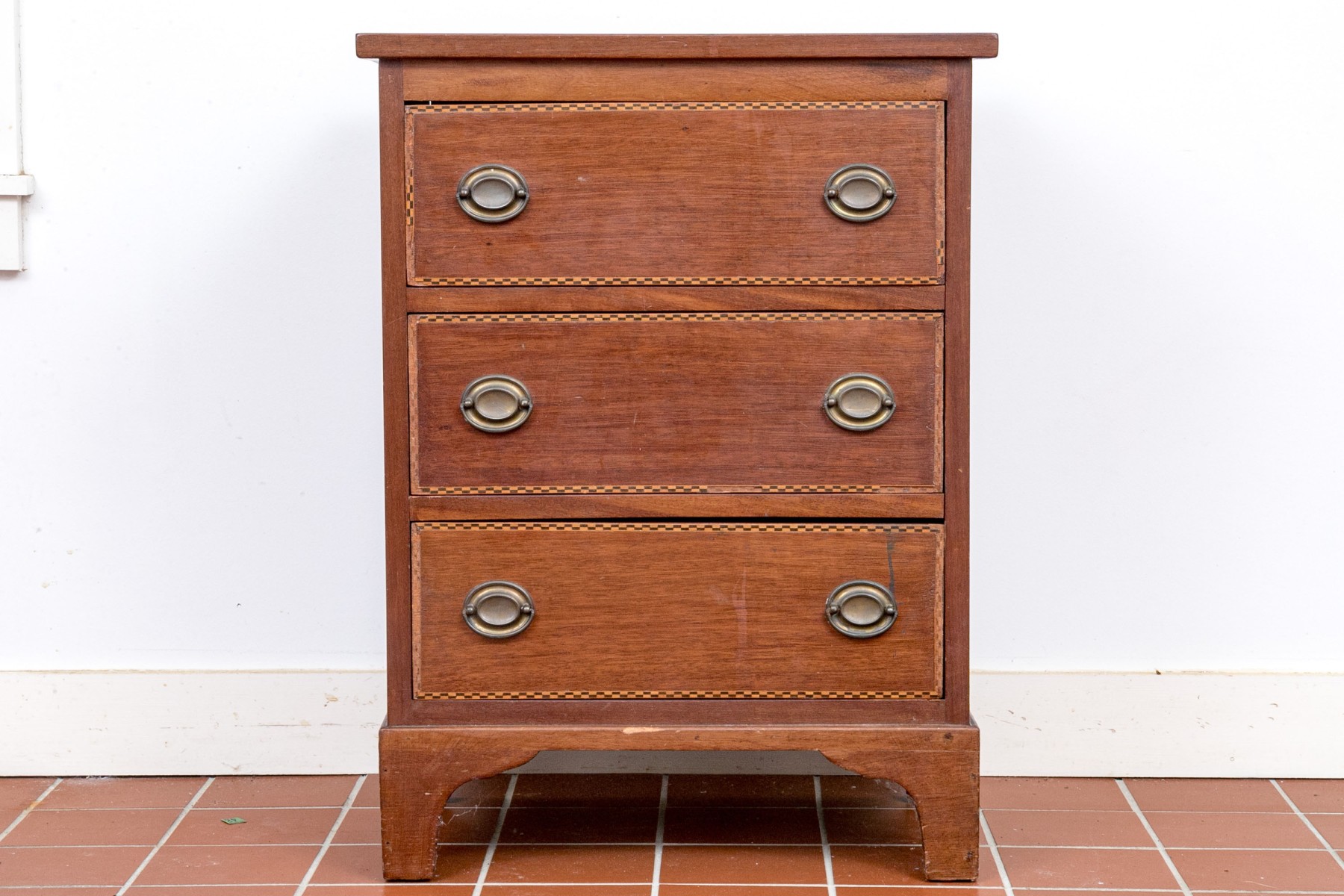 Raised on four legs with three drawers, each with parquetry inlaid trim borders and brass oval handles.
