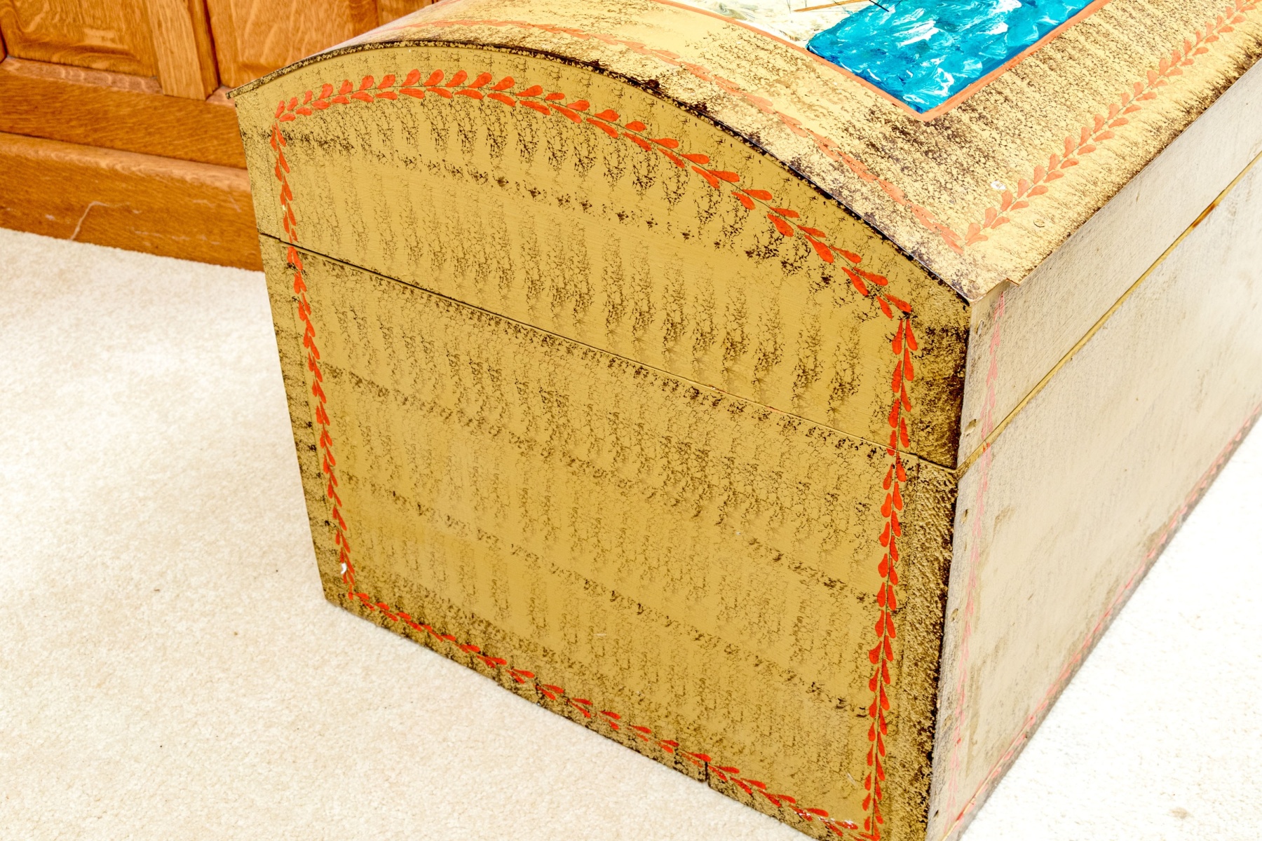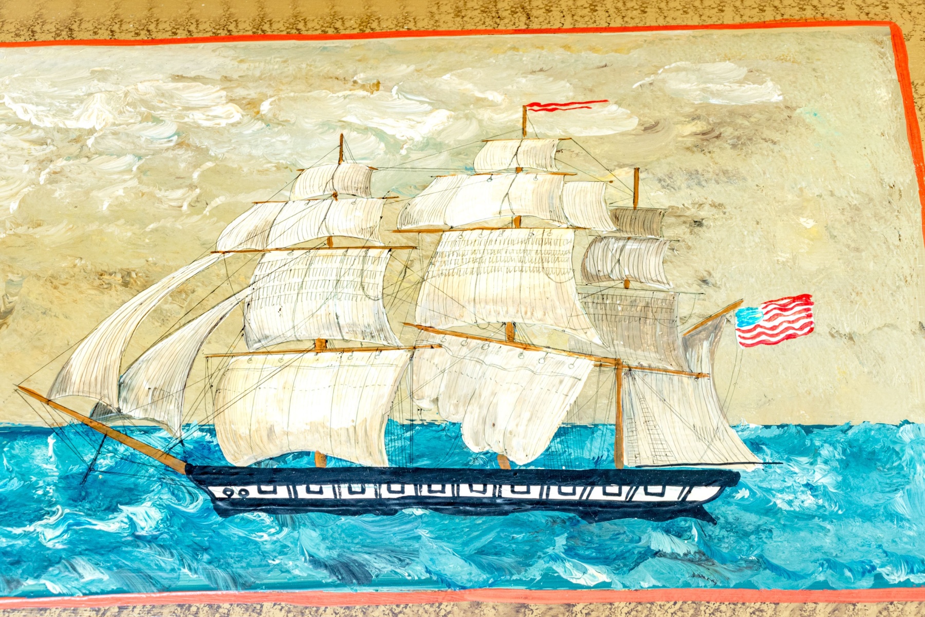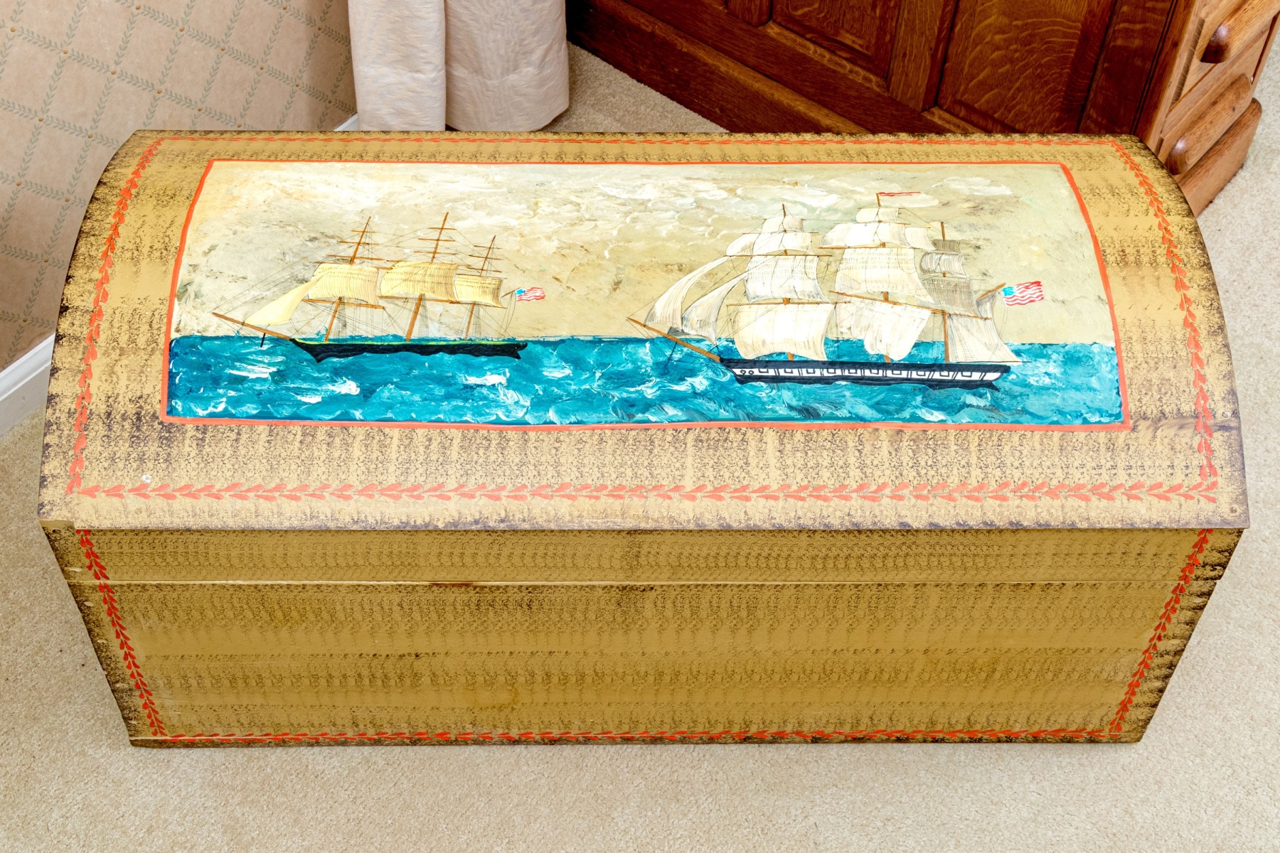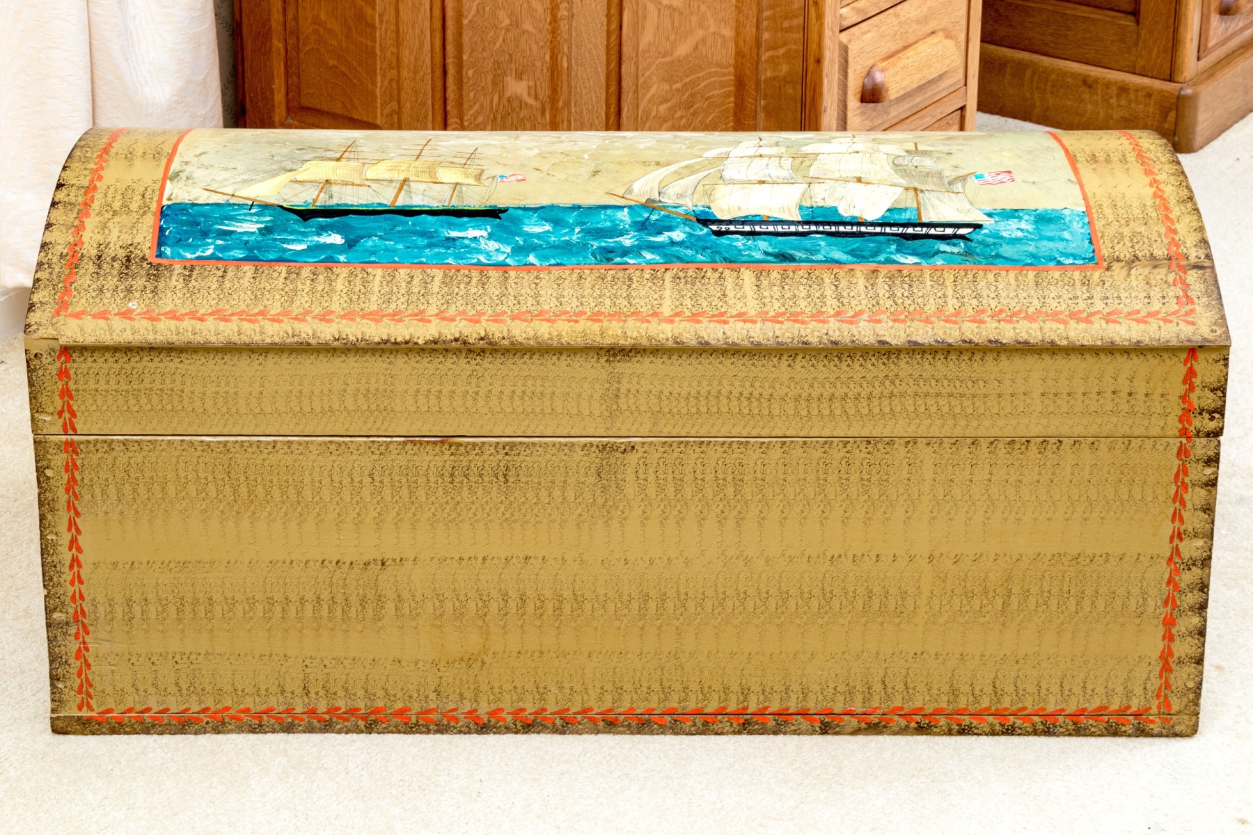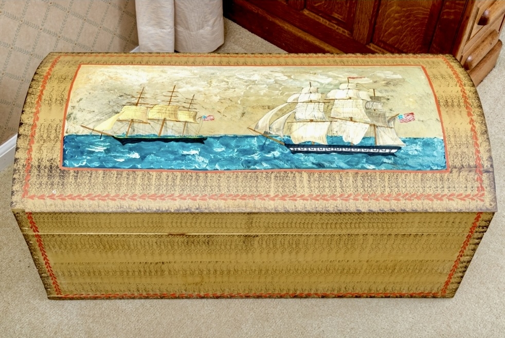 The trunk with hinged lid, having a fabulous central painted reserve depicting two tall ships at sea, both flying American flags.