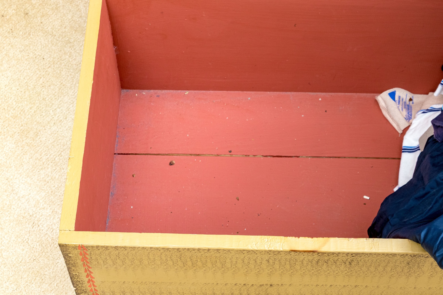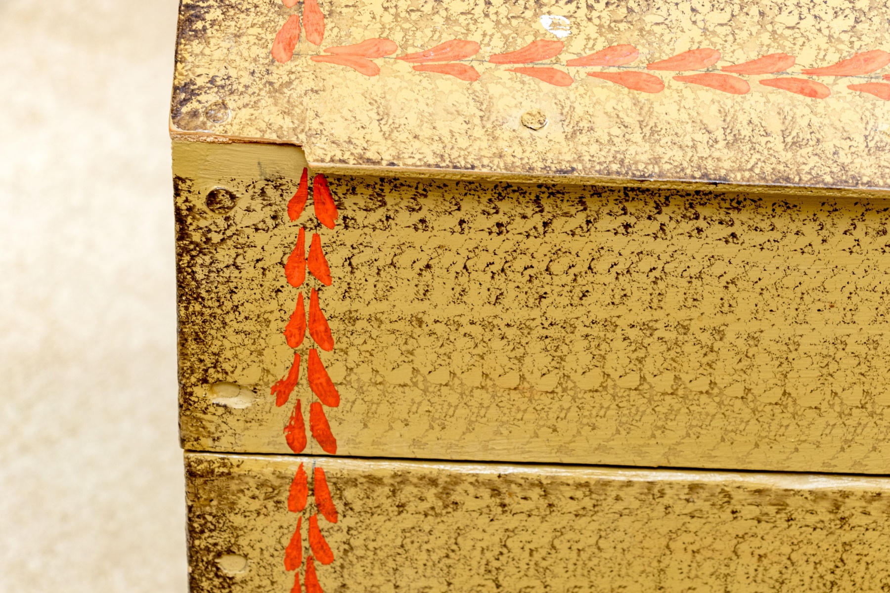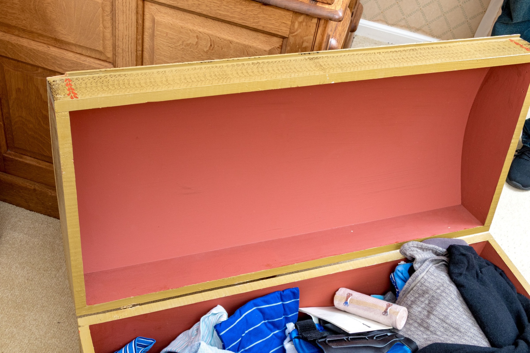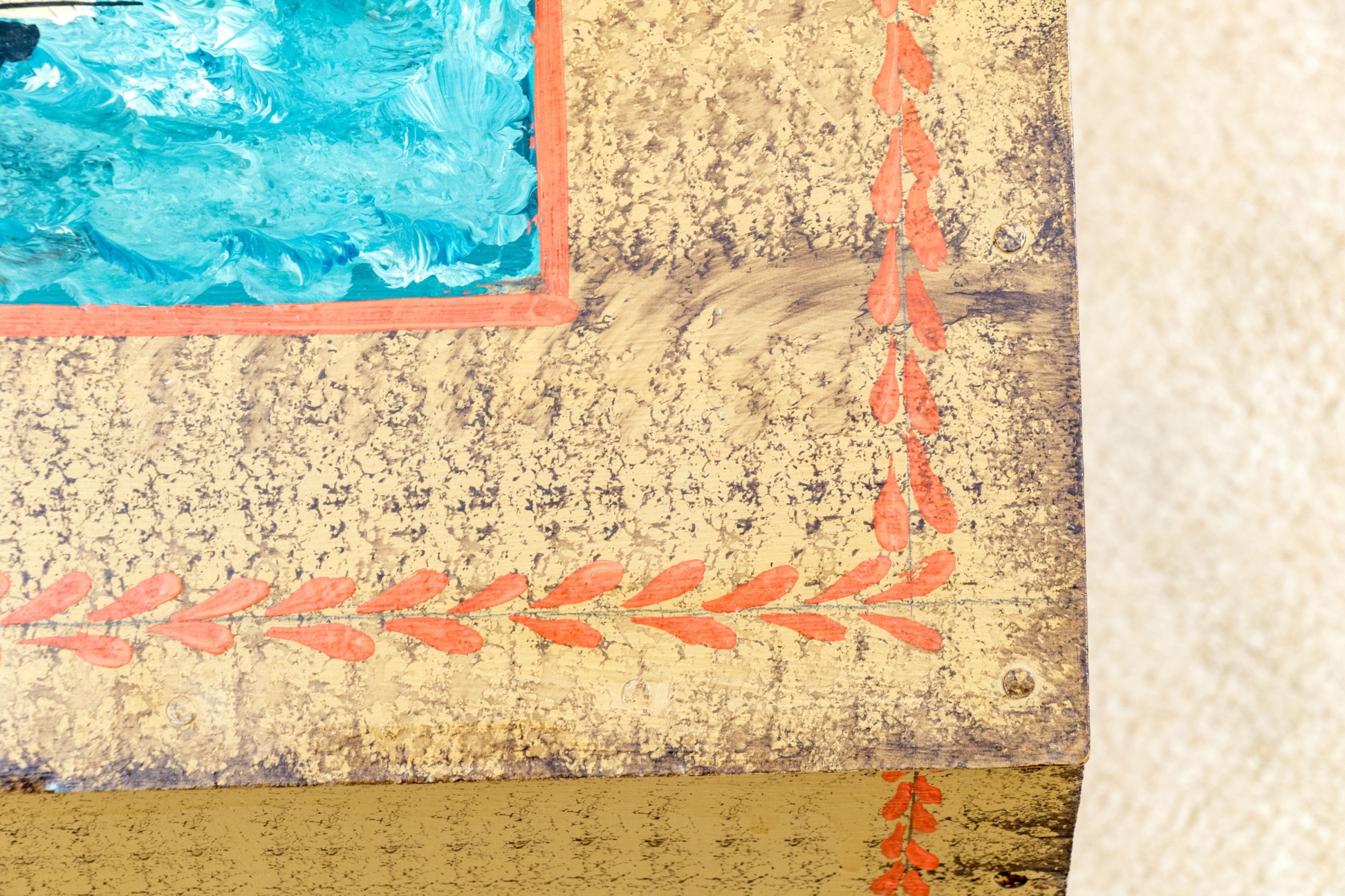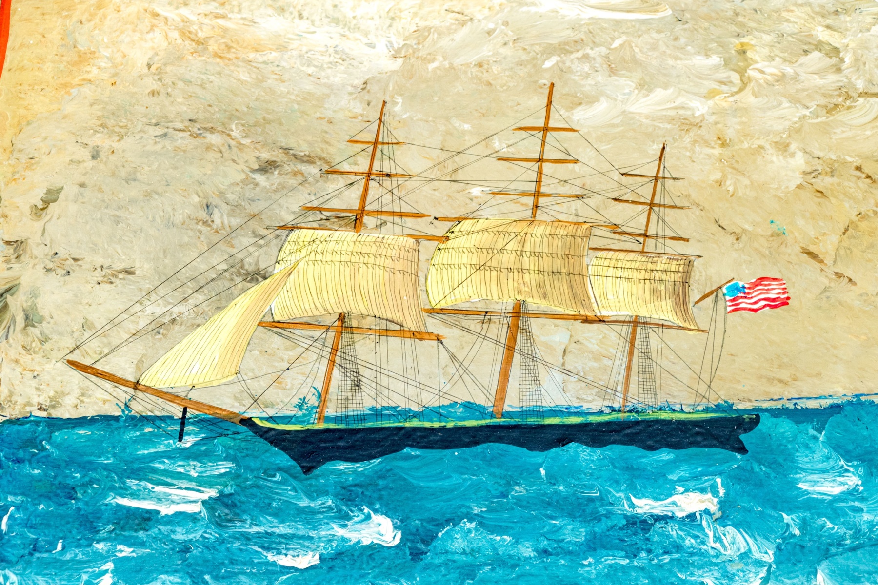 The trunk with hinged lid, having a fabulous central painted reserve depicting two tall ships at sea, both flying American flags.