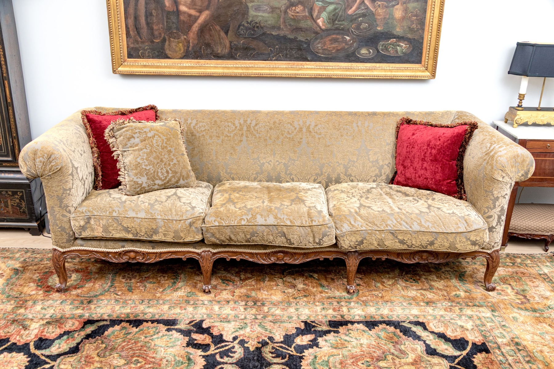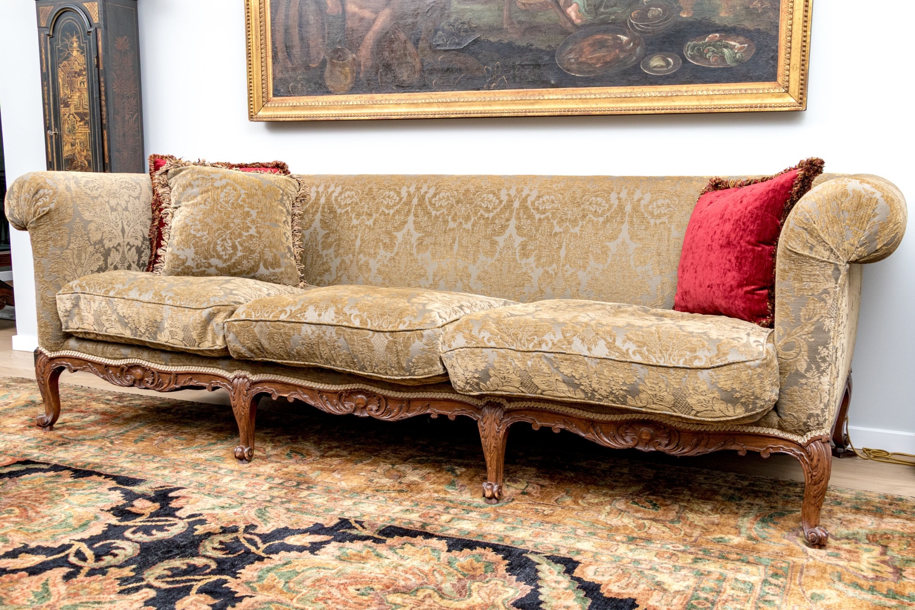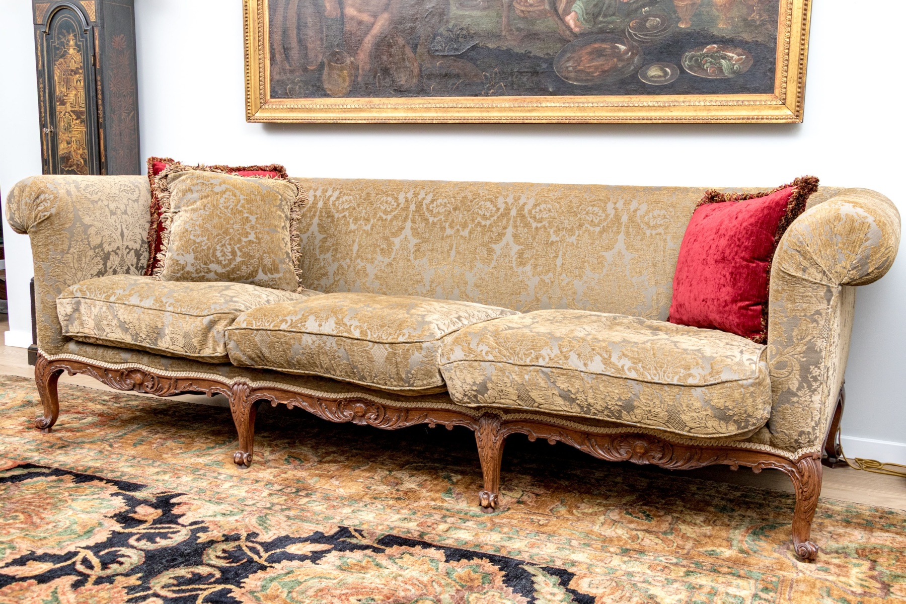 A stunning antique long sofa designed with classic Louis XV elegance, showcasing a straight back flush with rolled arms and custom upholstered in olive-brown and gray jacquard. Fitted with three luxurious down filled seat cushions and topped with a matching accent pillow along with a pair in striking red for an eye-catching pop of contrast. Raised on a nicely carved and serpentine apron with cabriole legs finished with scrolled feet.