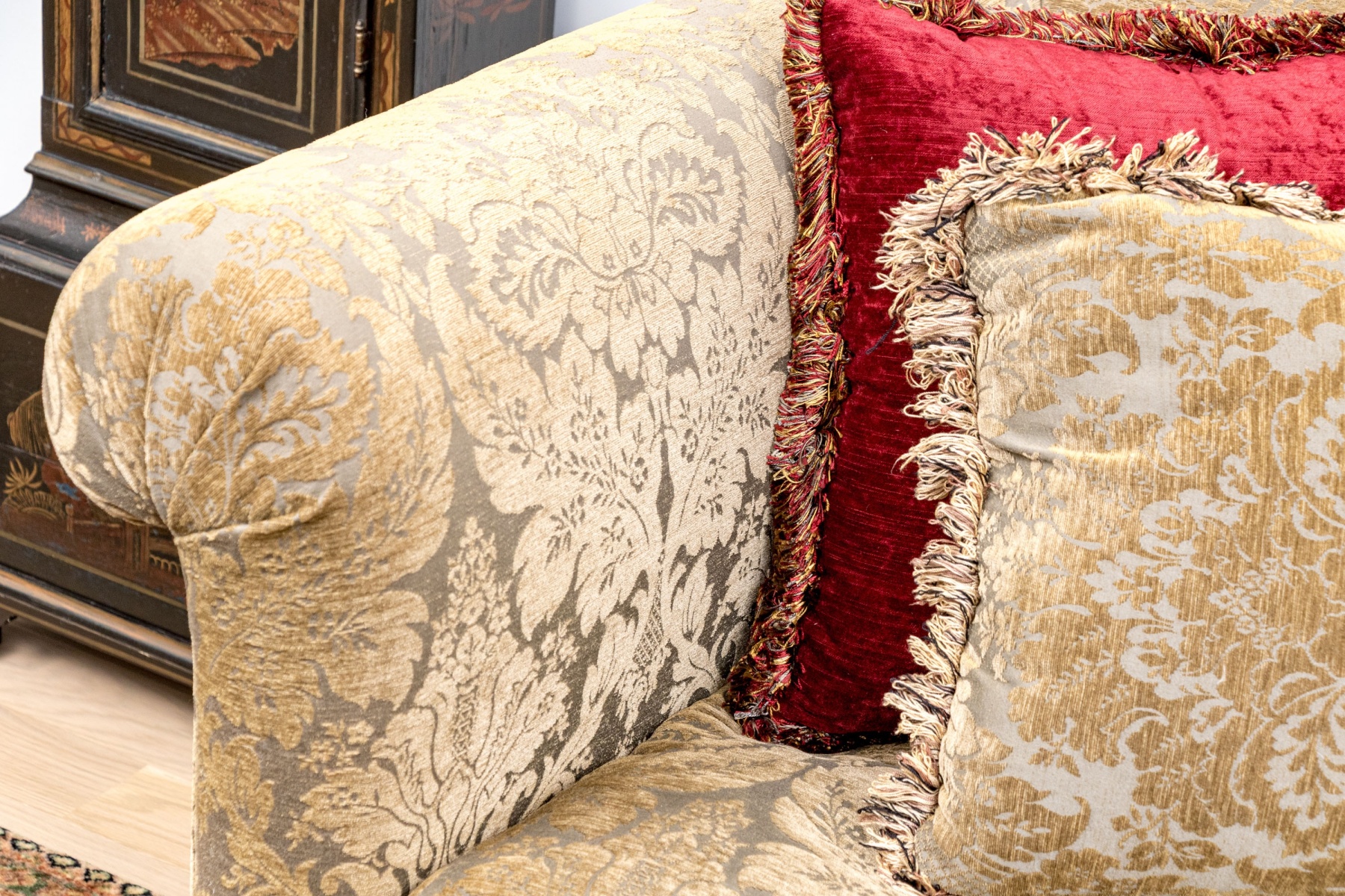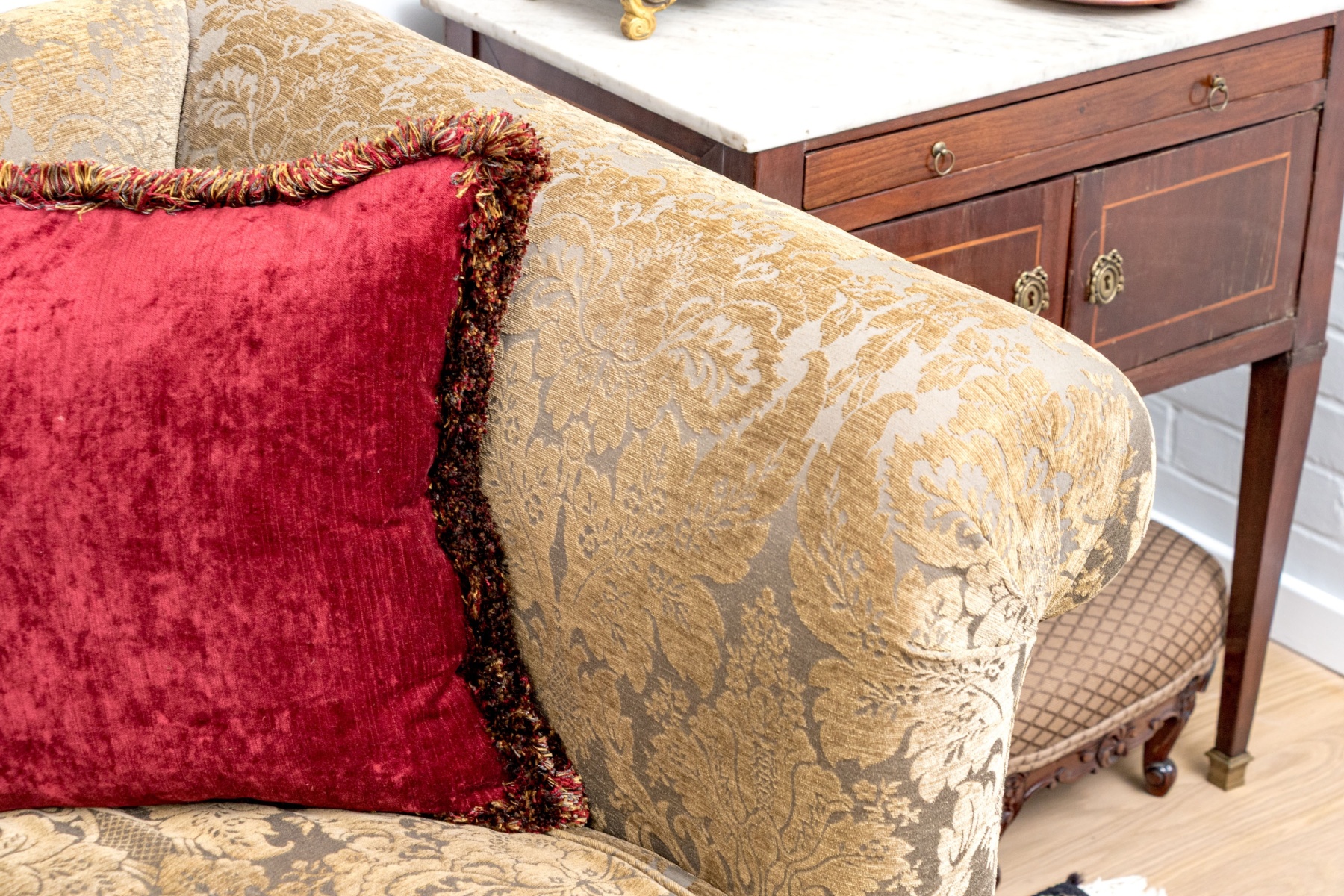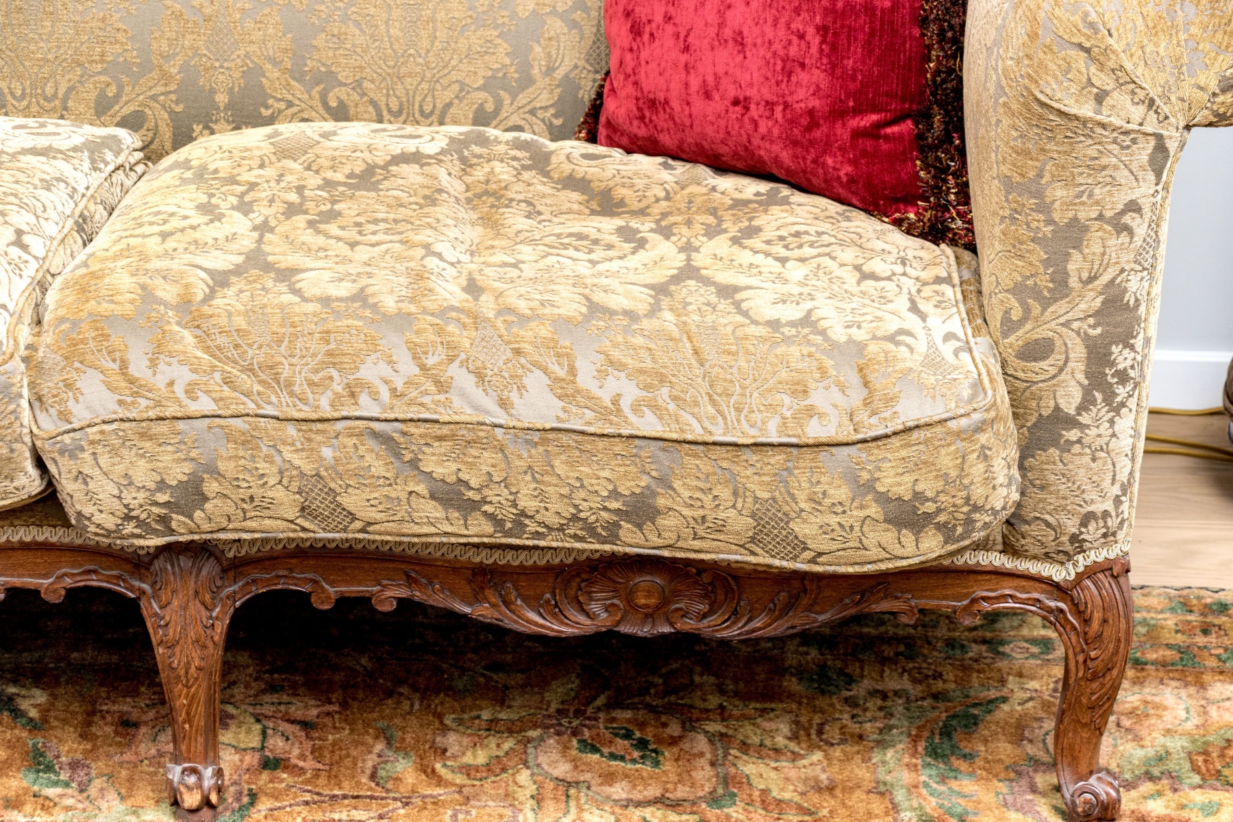 A stunning antique long sofa designed with classic Louis XV elegance, showcasing a straight back flush with rolled arms and custom upholstered in olive-brown and gray jacquard. Fitted with three luxurious down filled seat cushions and topped with a matching accent pillow along with a pair in striking red for an eye-catching pop of contrast. Raised on a nicely carved and serpentine apron with cabriole legs finished with scrolled feet.