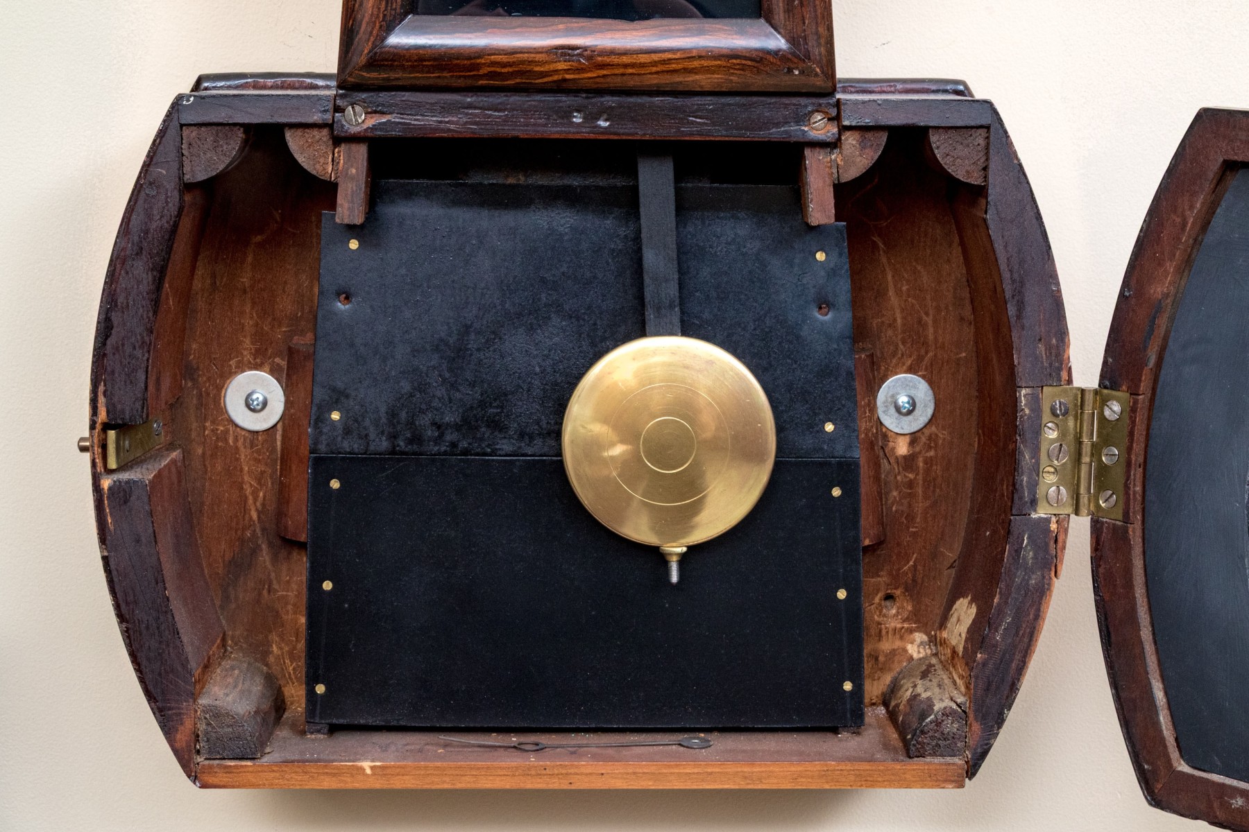 The clock's minute hand is loose but with the clock. Appears to be missing its winding key. The weight and pendulum is included. The clock is in unknown working condition. Crackled finish to clock face with Roman Numerals around the dial.