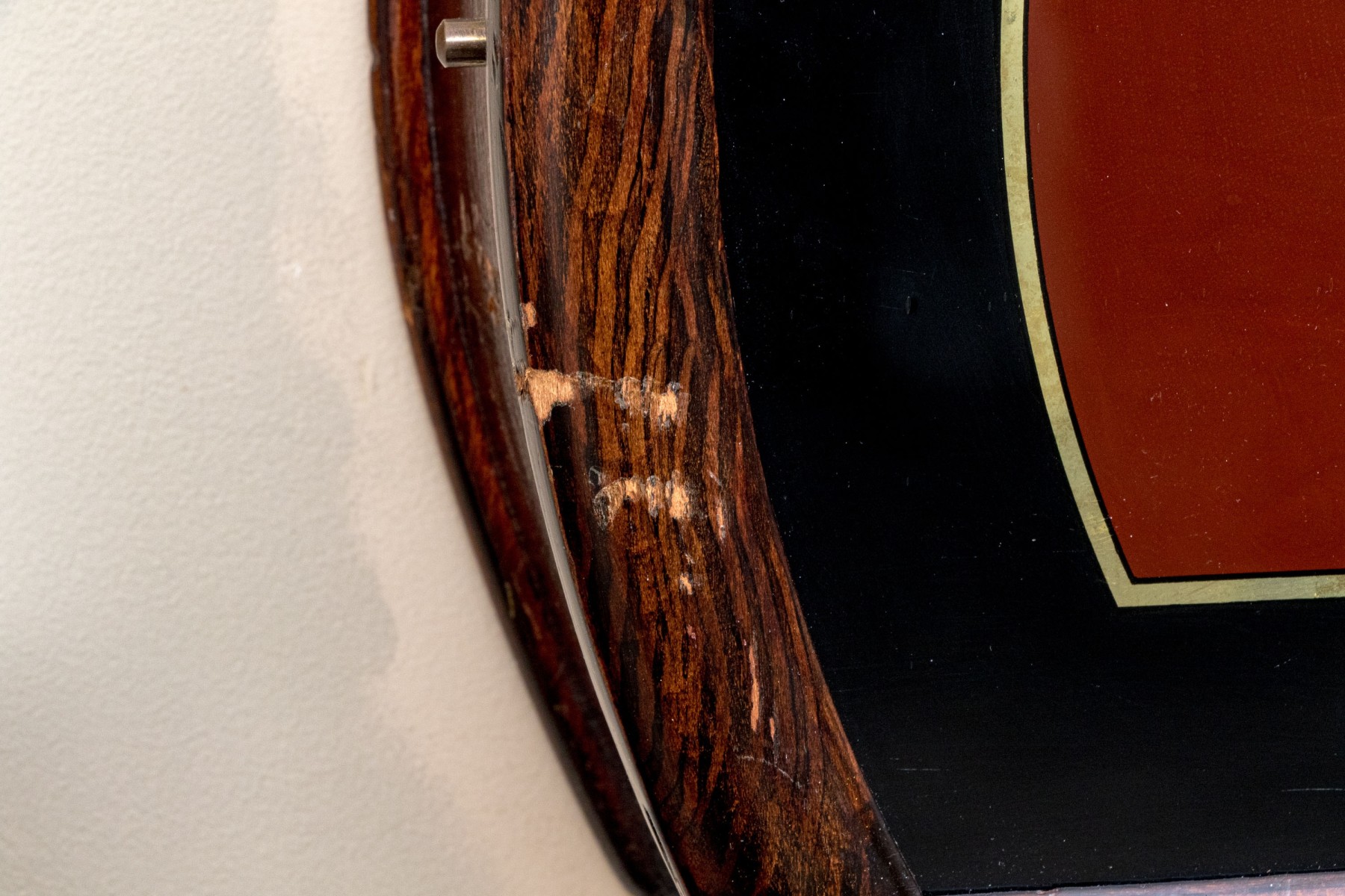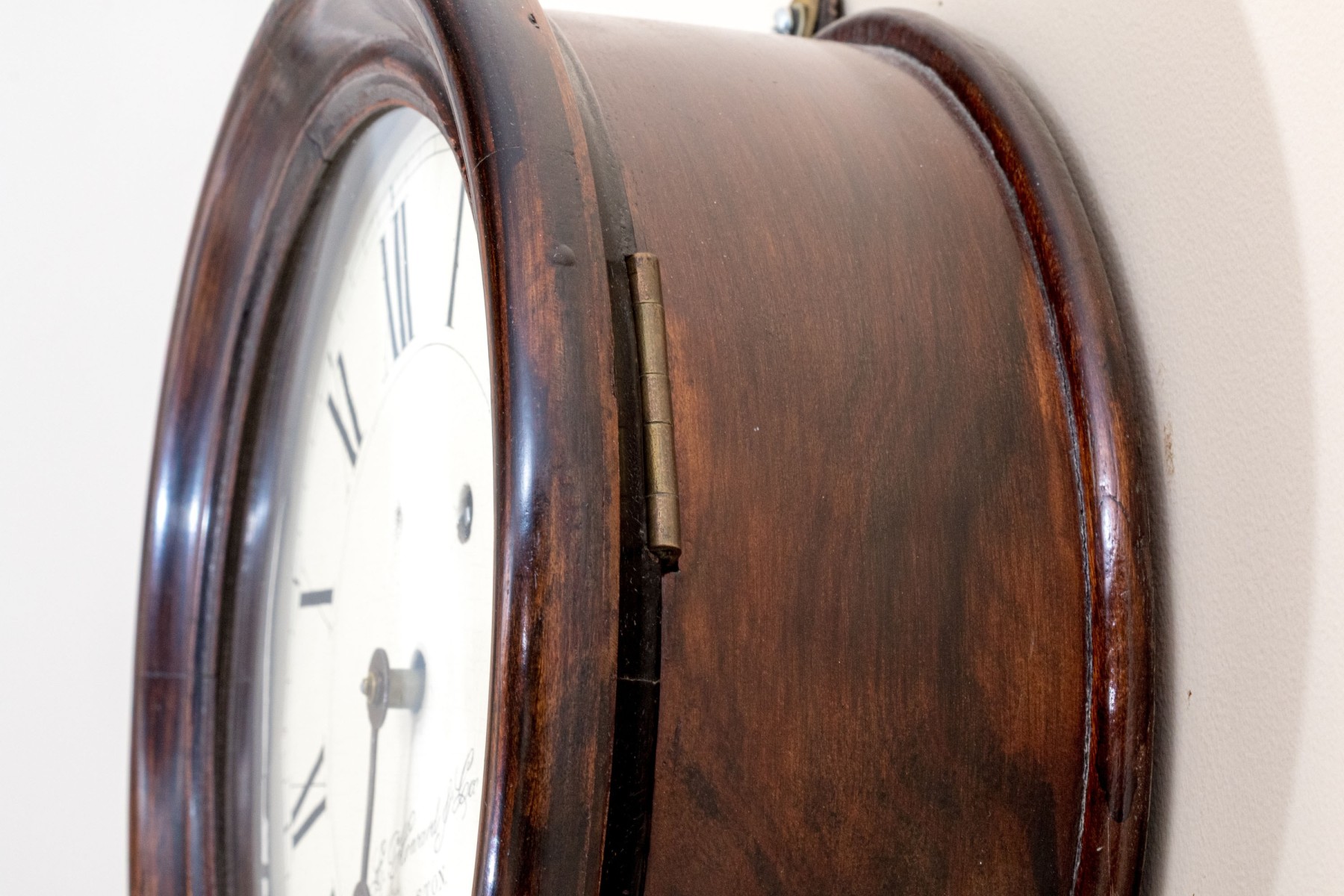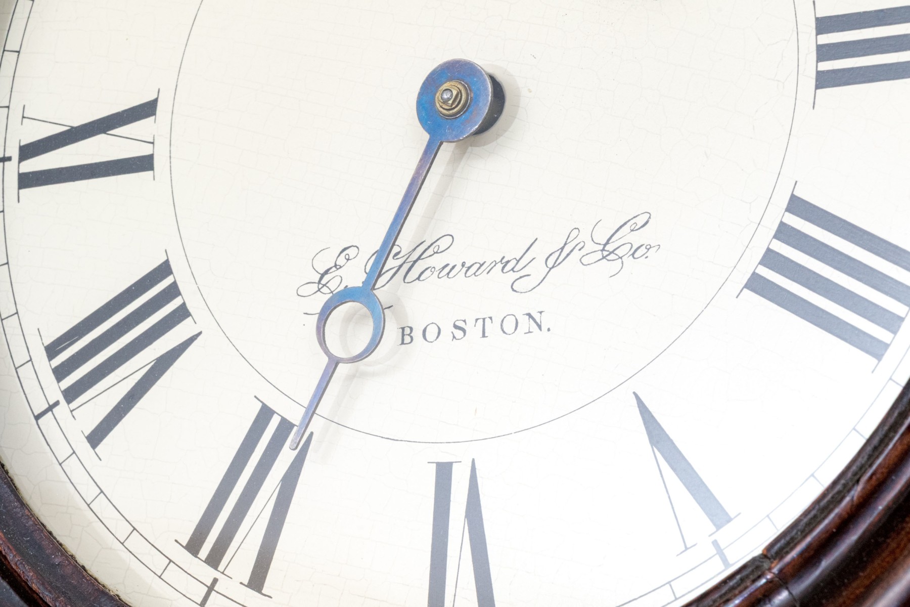 E. Howard & Co. (Boston, MA, a. 1858-1881) banjo form wall clock showcasing a white dial with black Roman numerals in a dark brown stained case. The column and pendulum case are beautifully designed with striking black, gilt, and oxblood red borders.