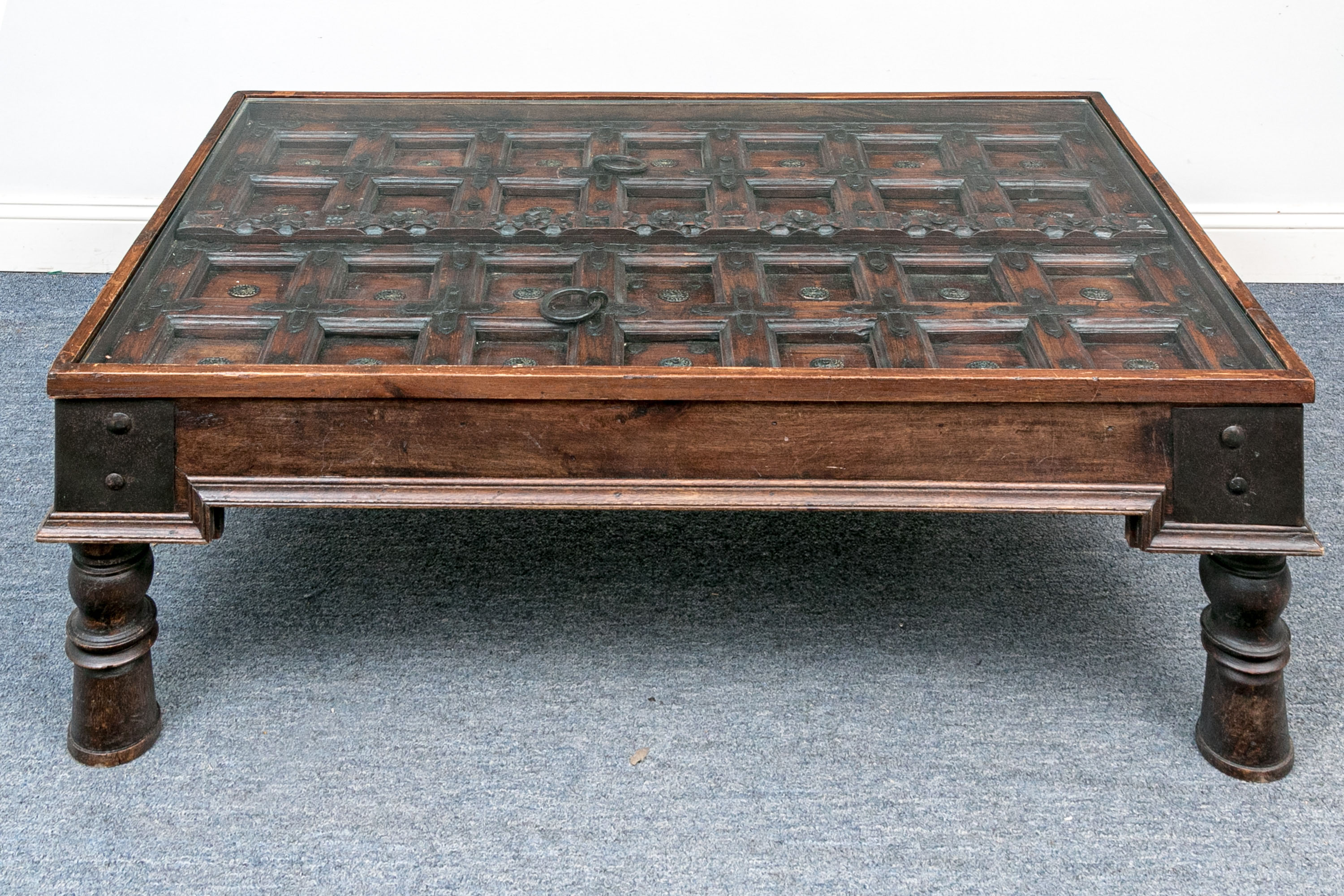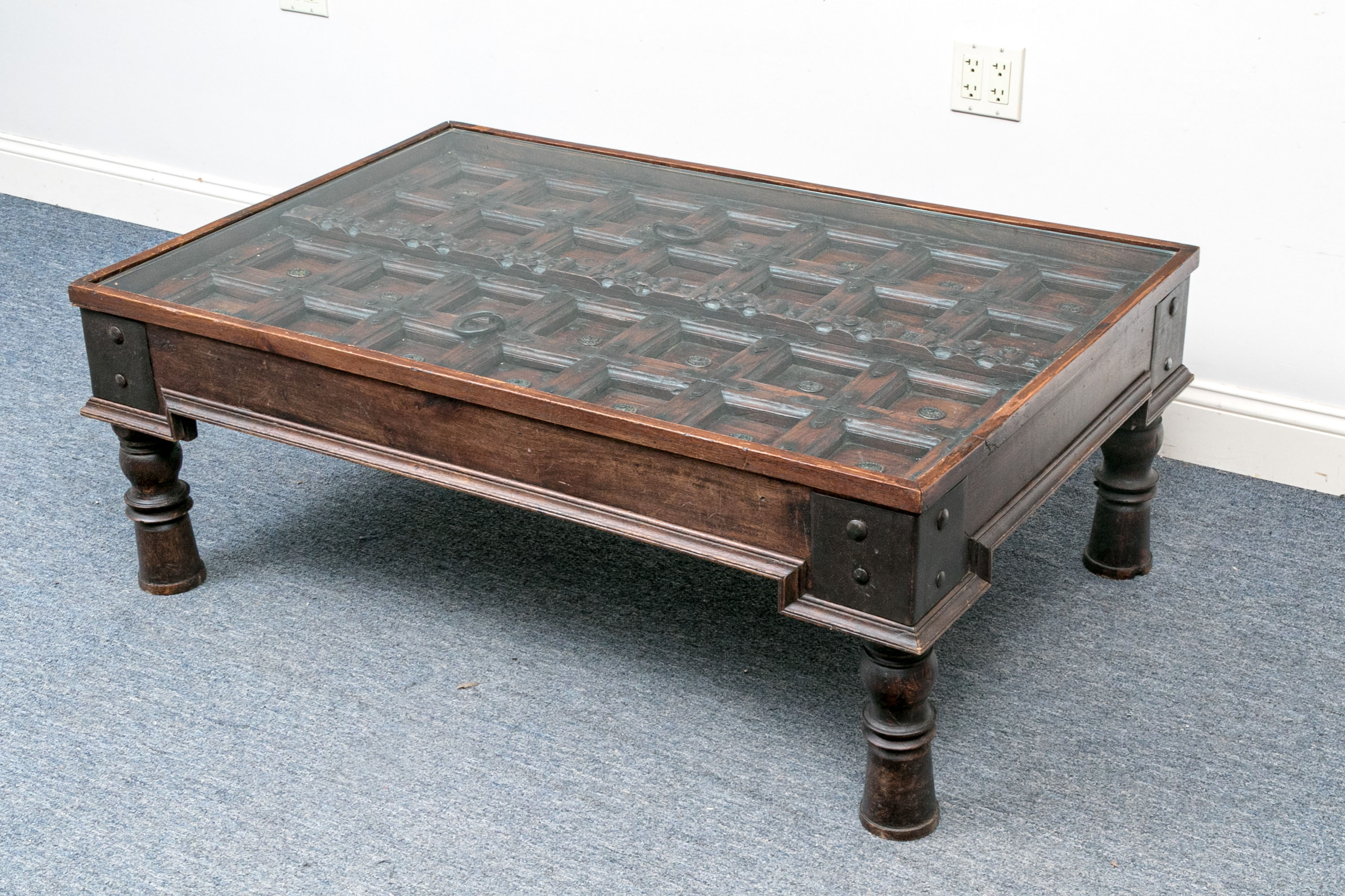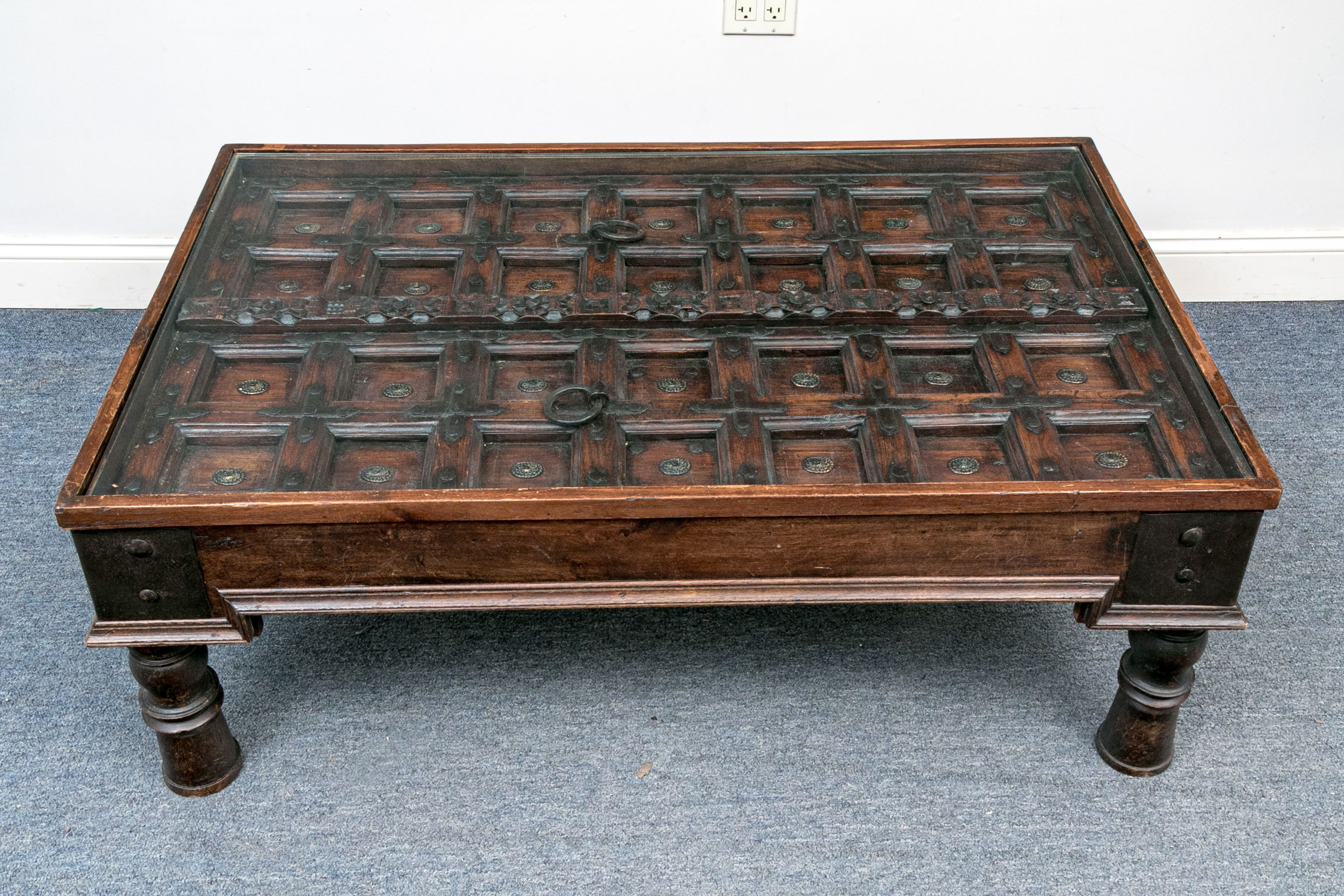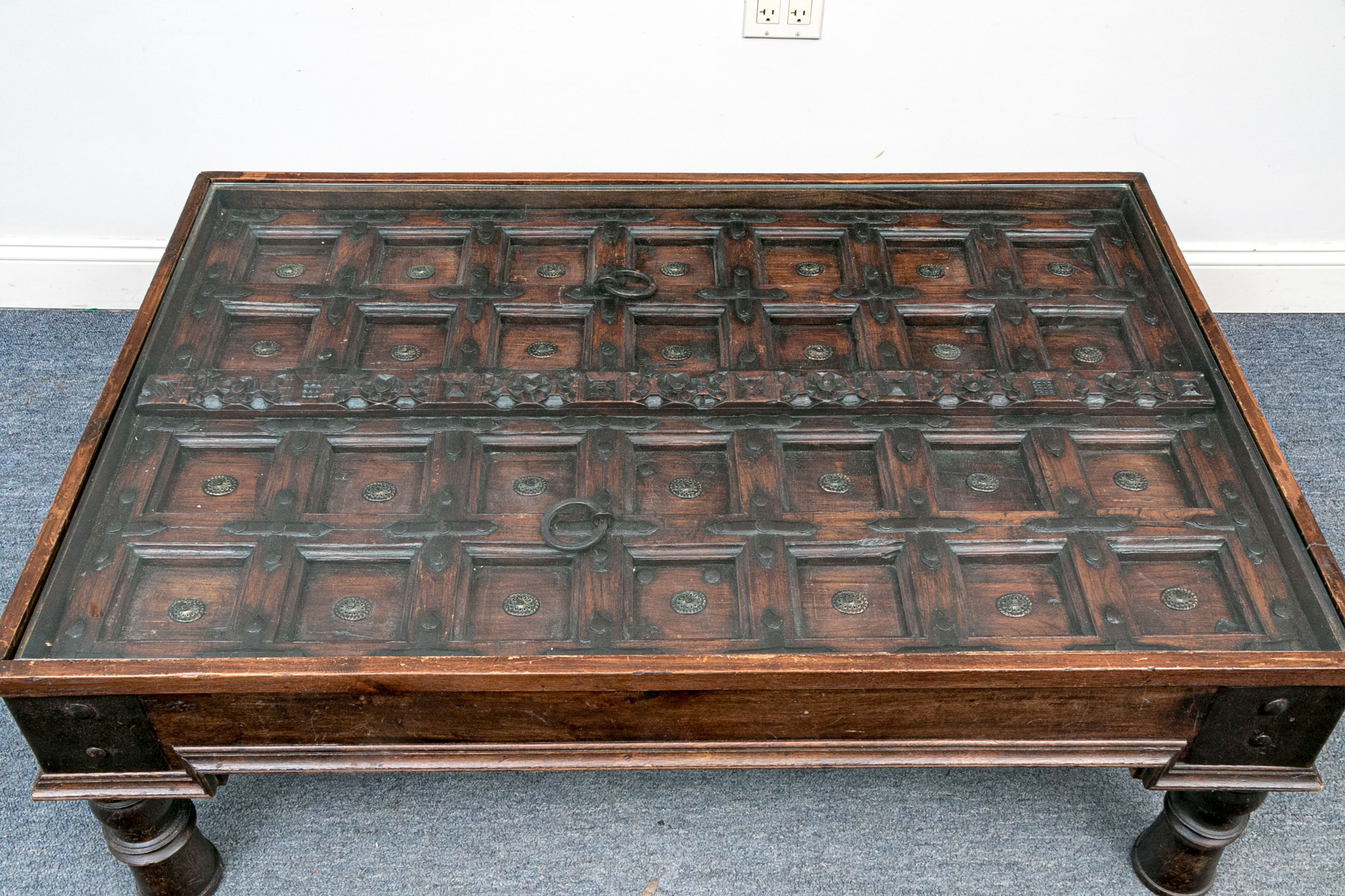An antique Eastern wood and iron heavy door mounted as a cocktail table.