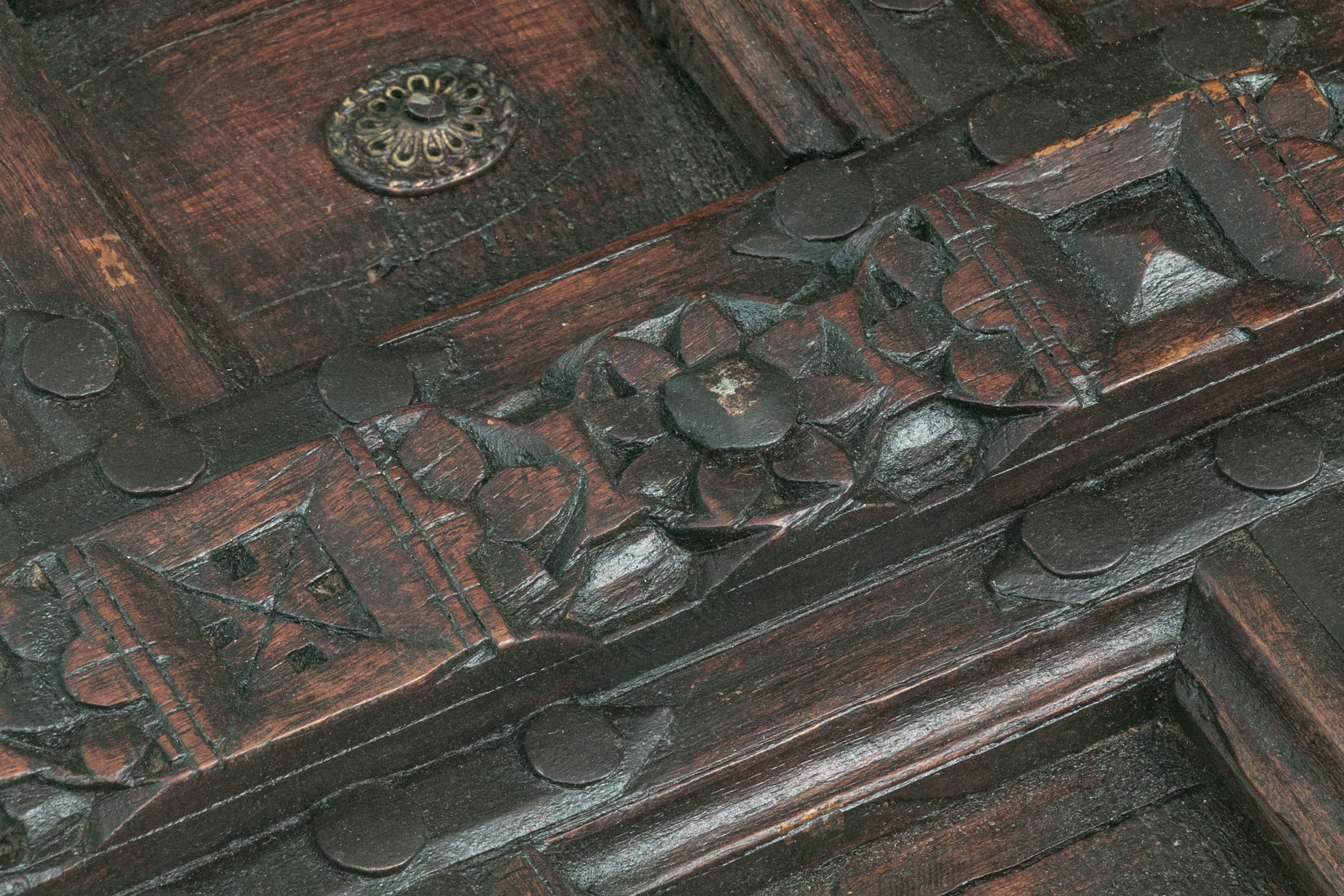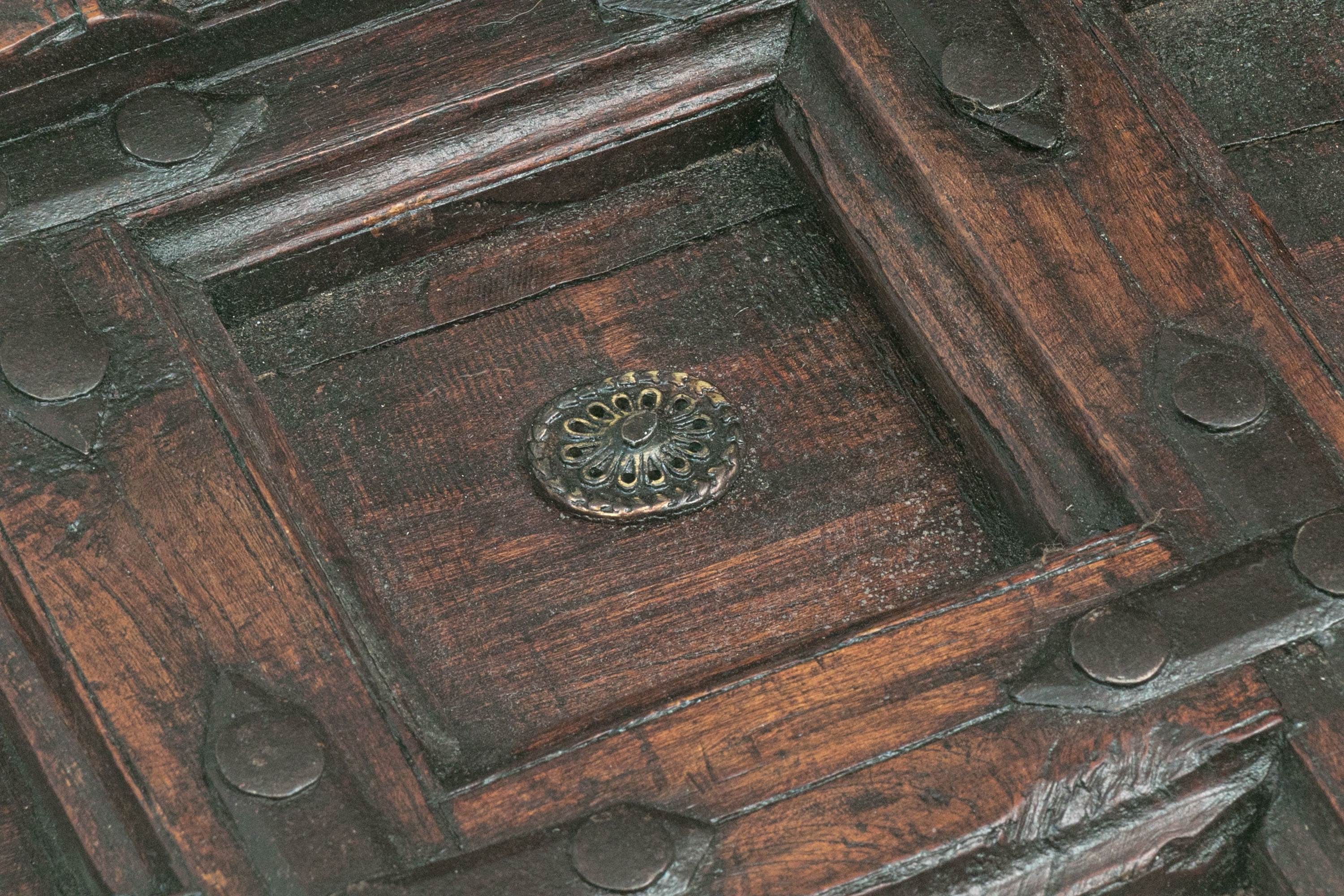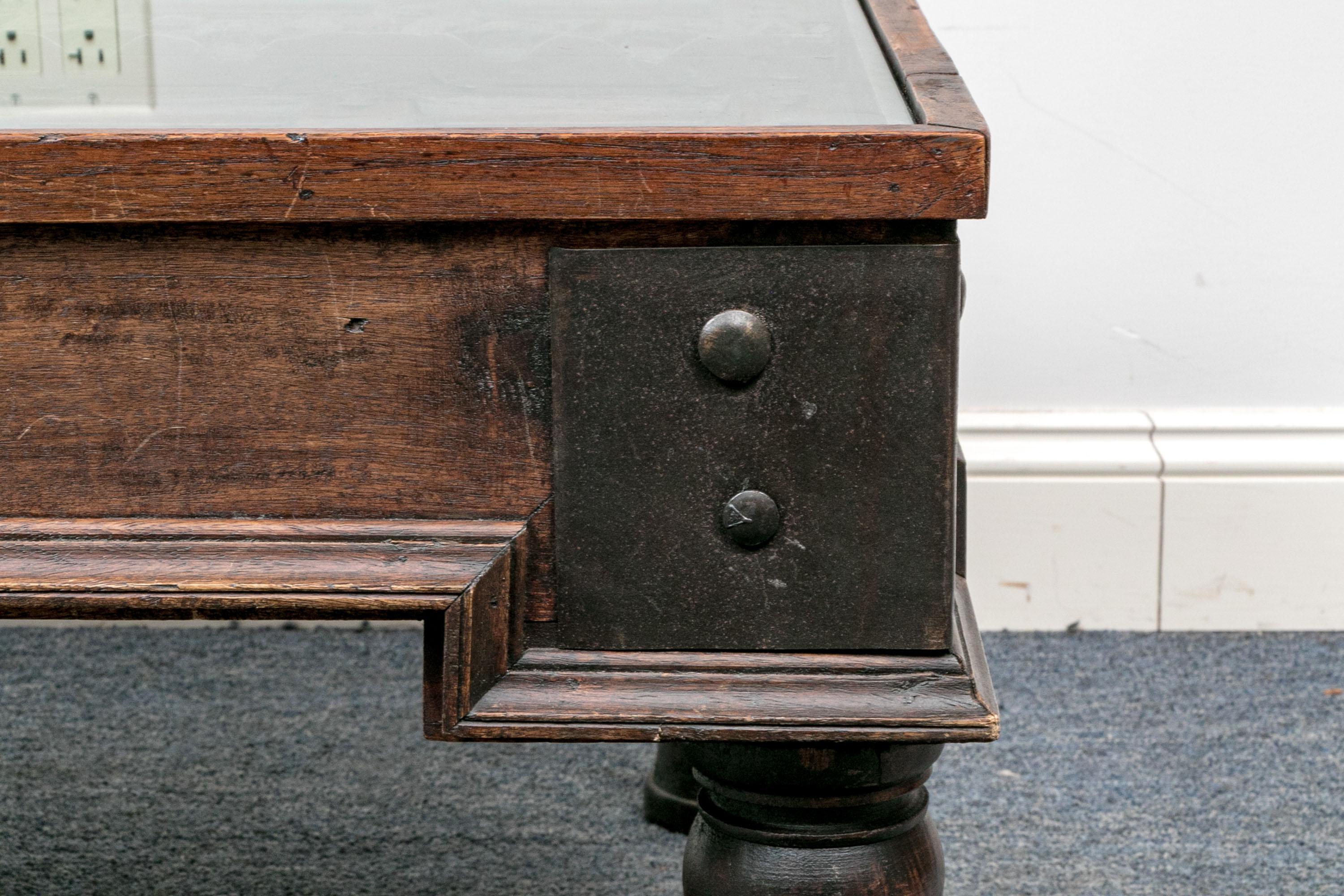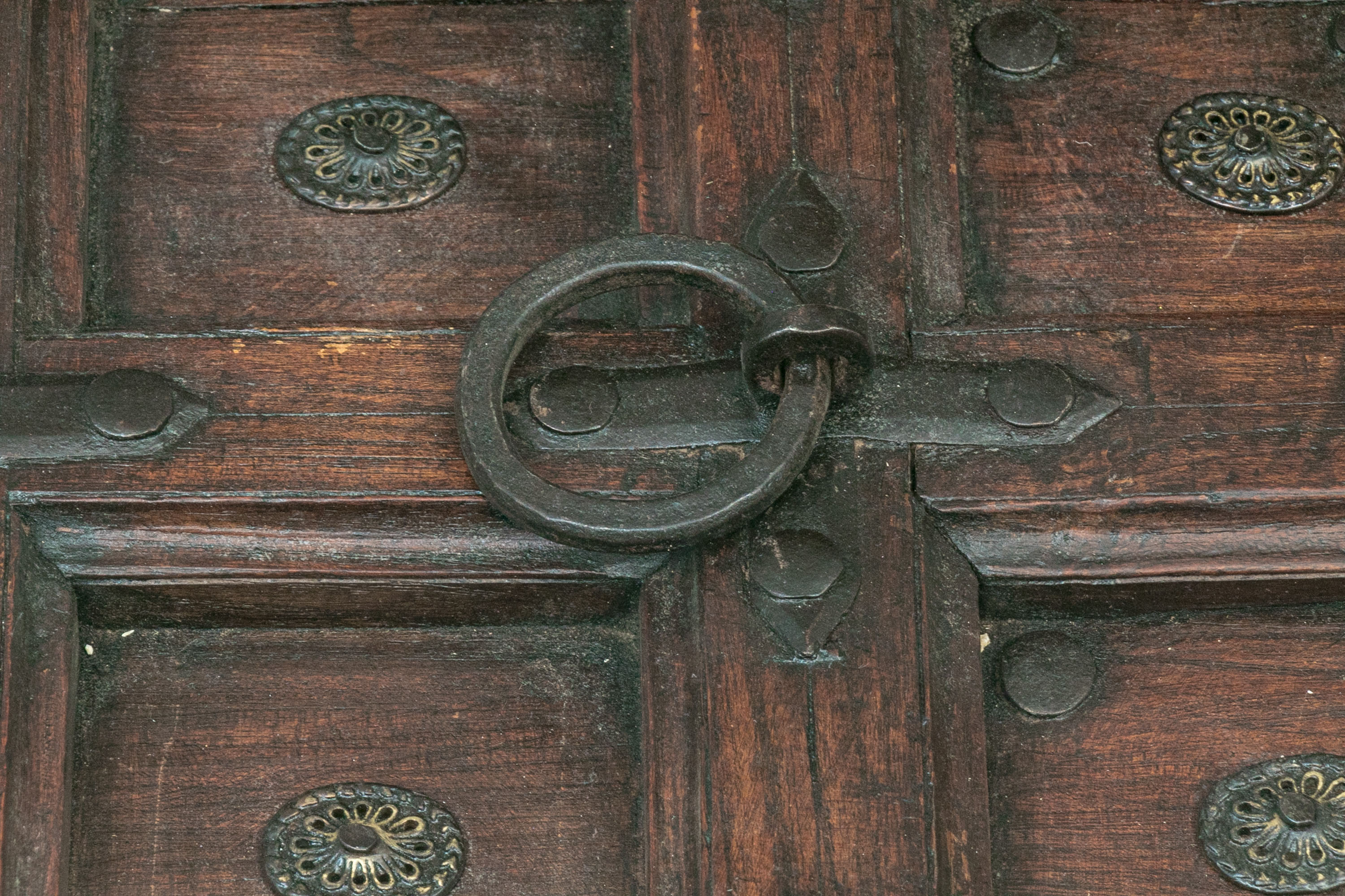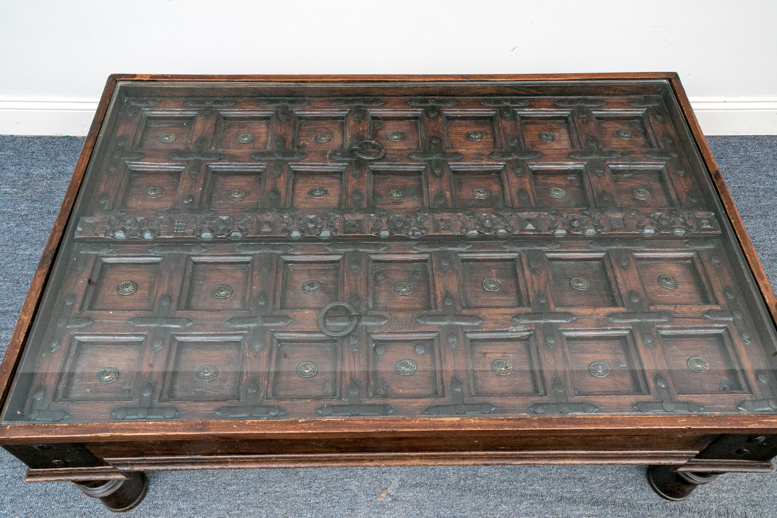 An antique Eastern wood and iron heavy door mounted as a cocktail table.