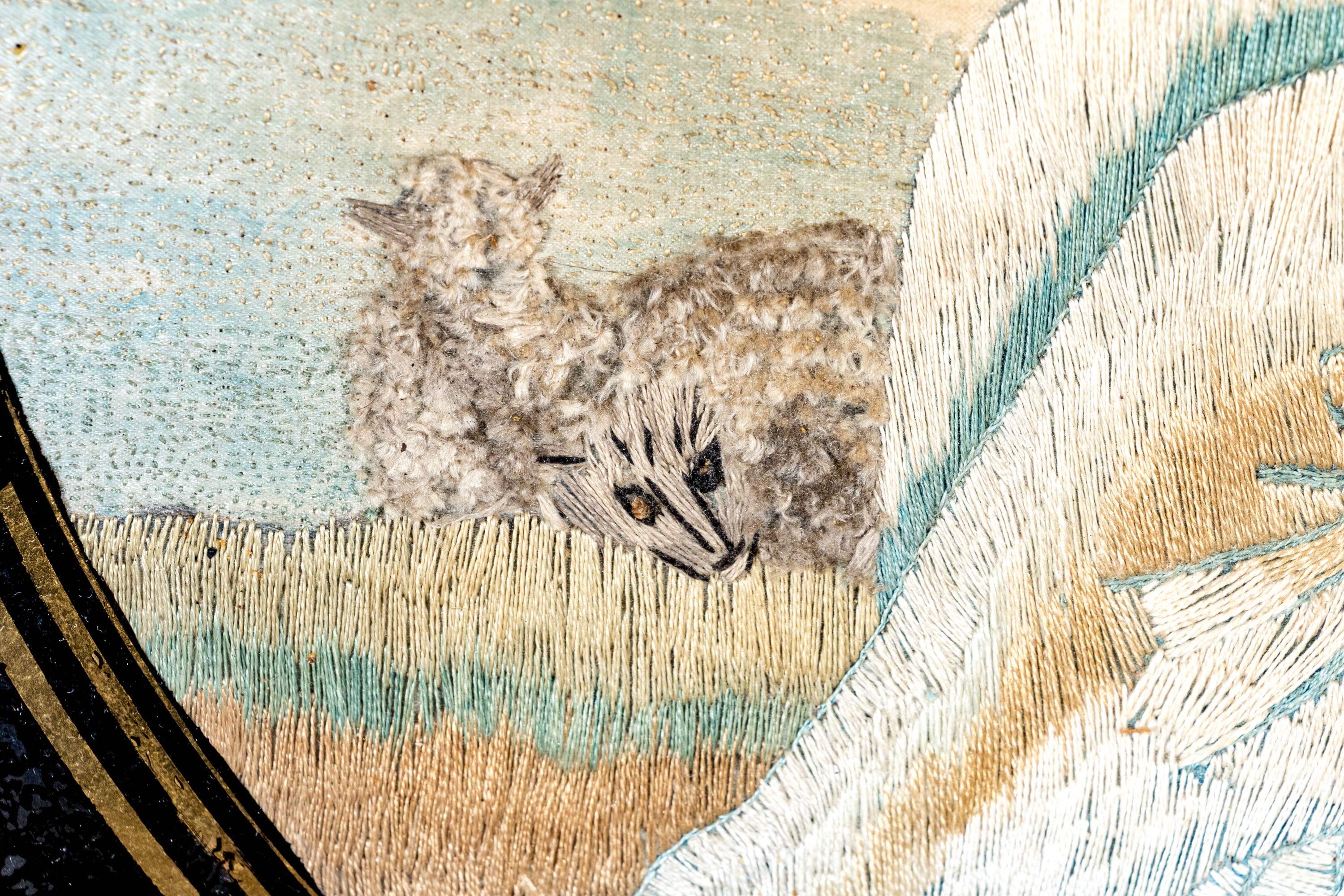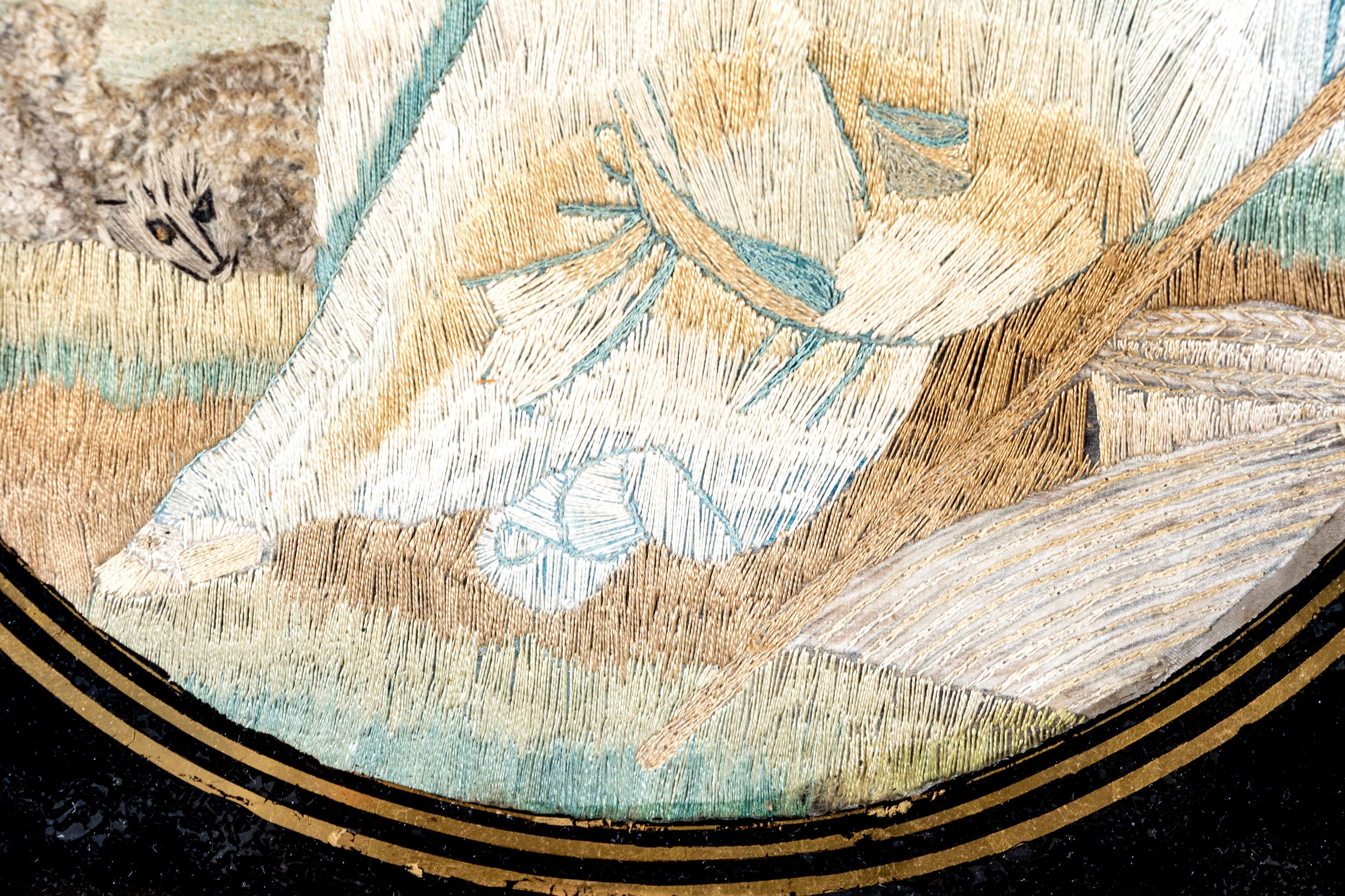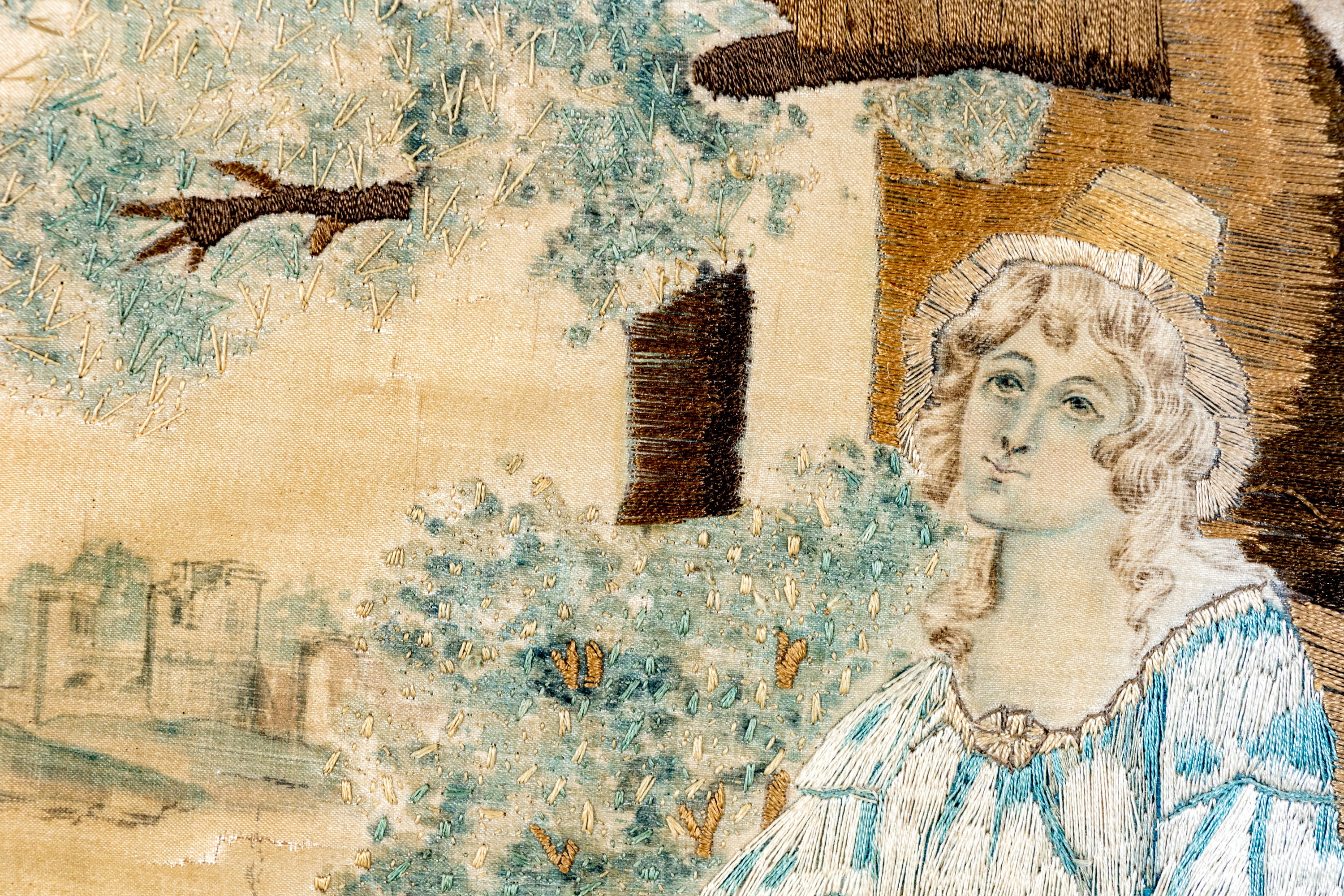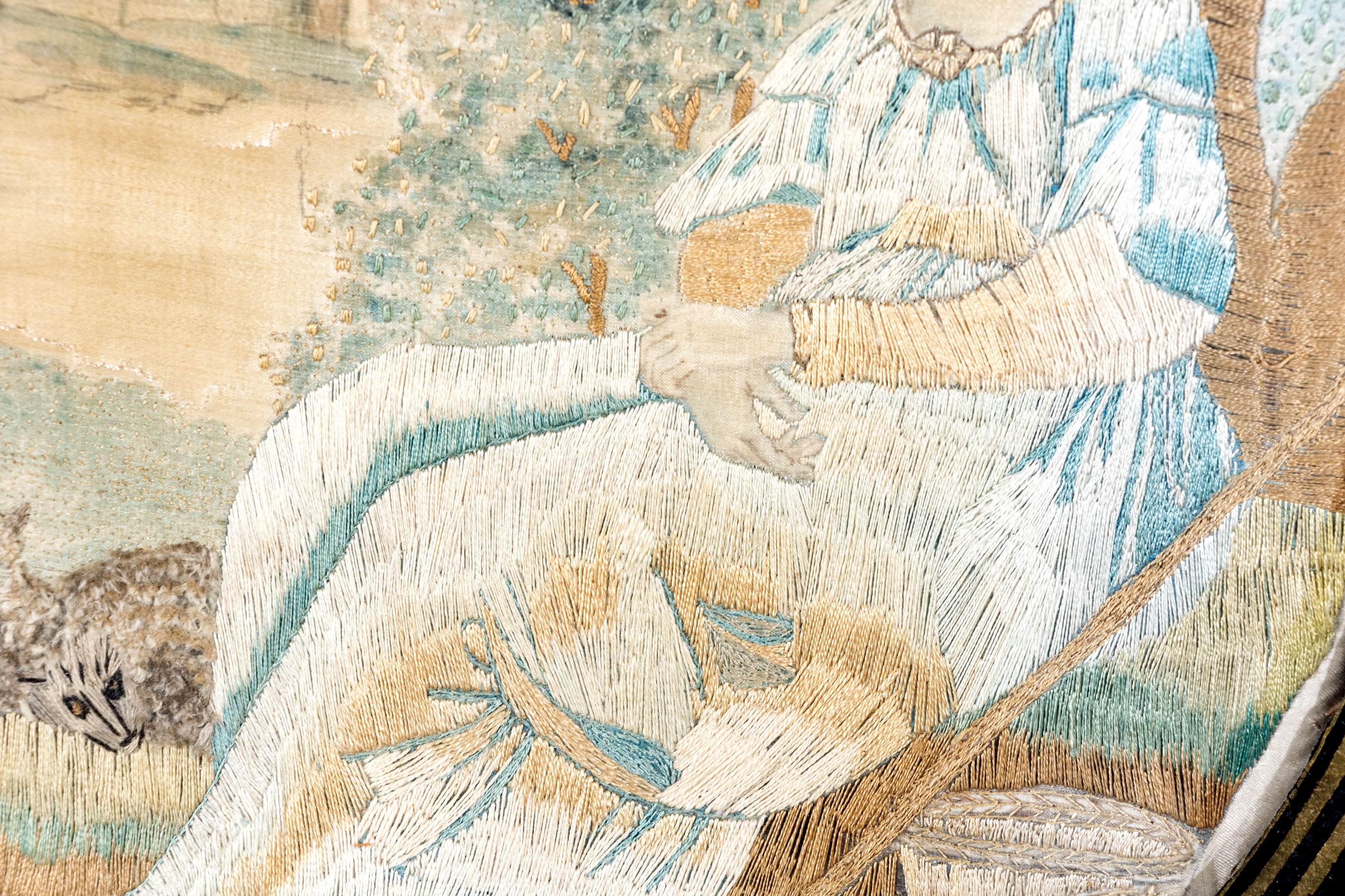 A gorgeous antique crewel embroidery depicting a shepherdess in a long white dress resting under a tree with some sheep alongside her. She gazes up at the sky with a calm and content expression. Rendered in a restrained palette of blue, white, brown, yellow, and green. The scene features a gorgeous combination of threadwork textures against a painted background.