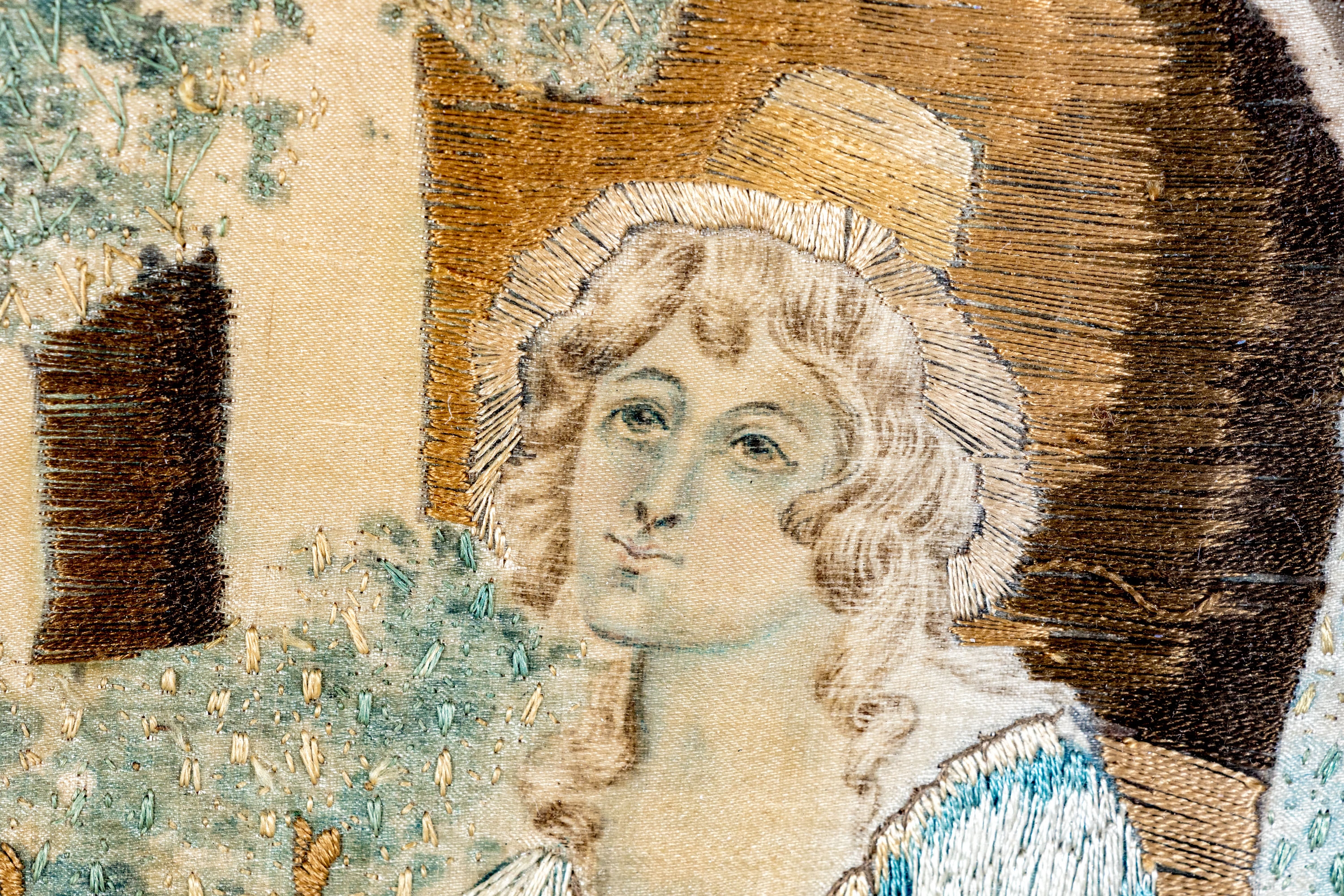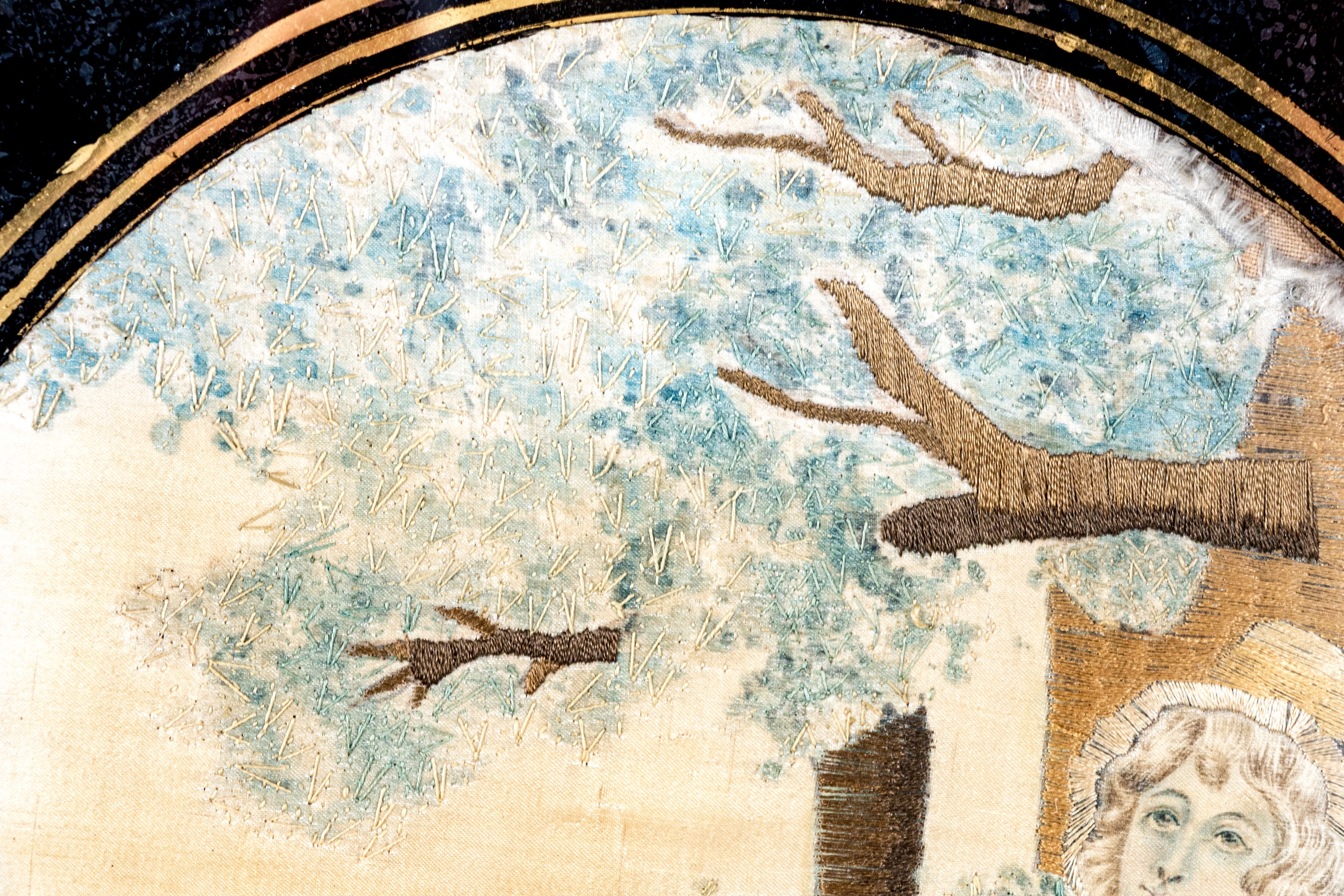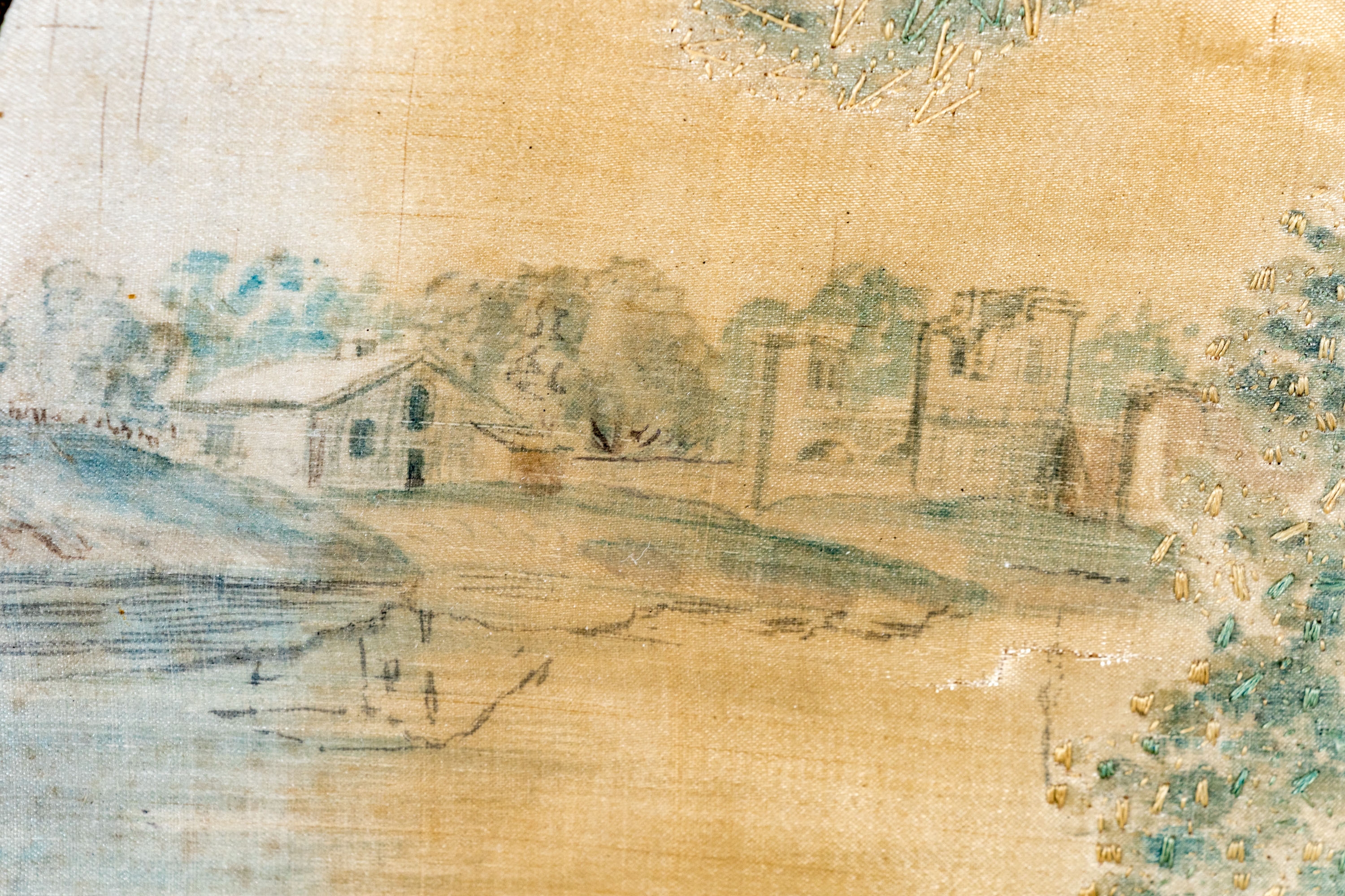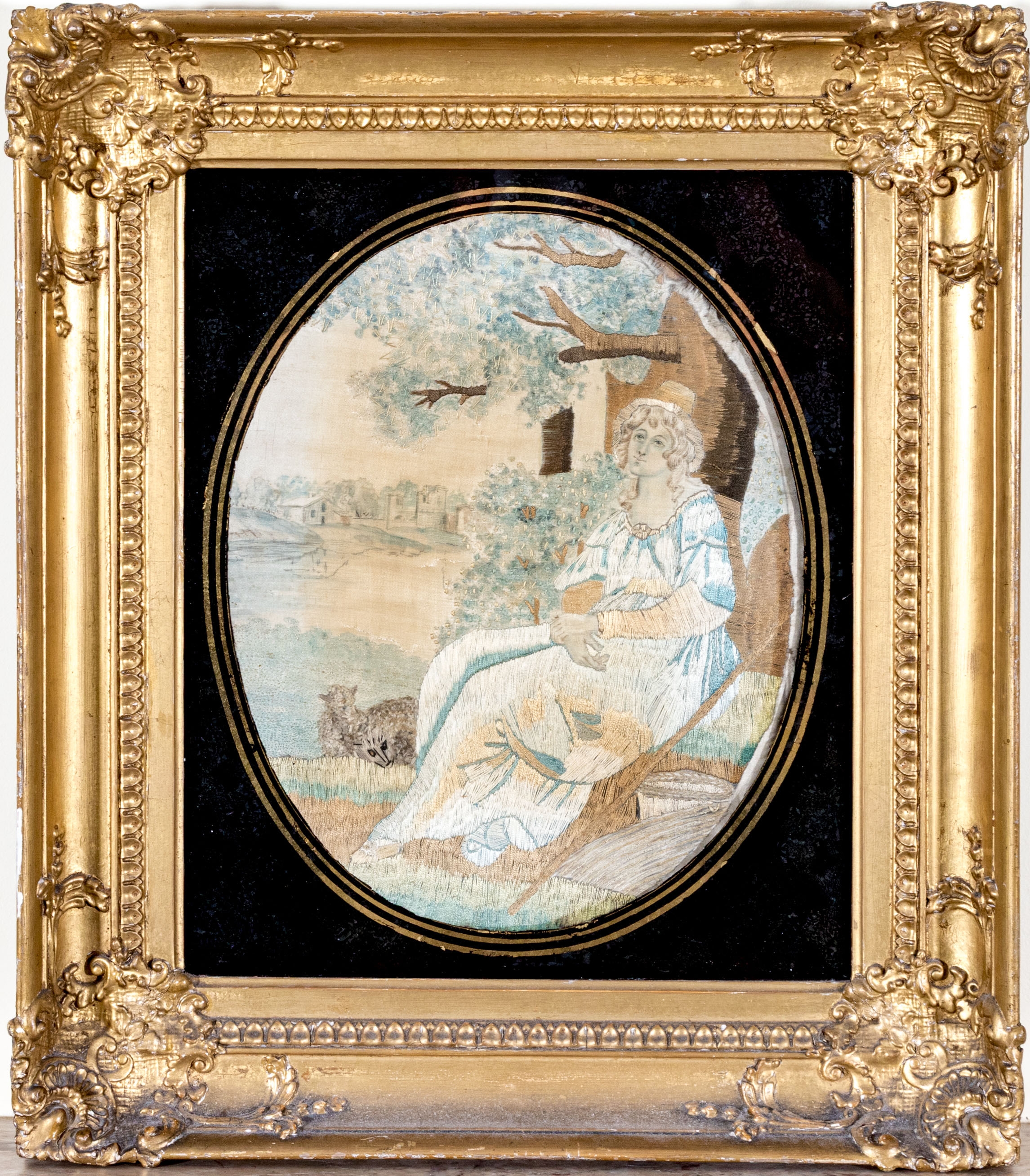 A beautiful piece overall with some wear commensurate with age and display. Some small tears to the fabric that does not distract the eye from the overall appearance. Staining to the fabric and discoloration to the frame along the bottom. Chipping to the frame gesso, most notably at the lower left edge.