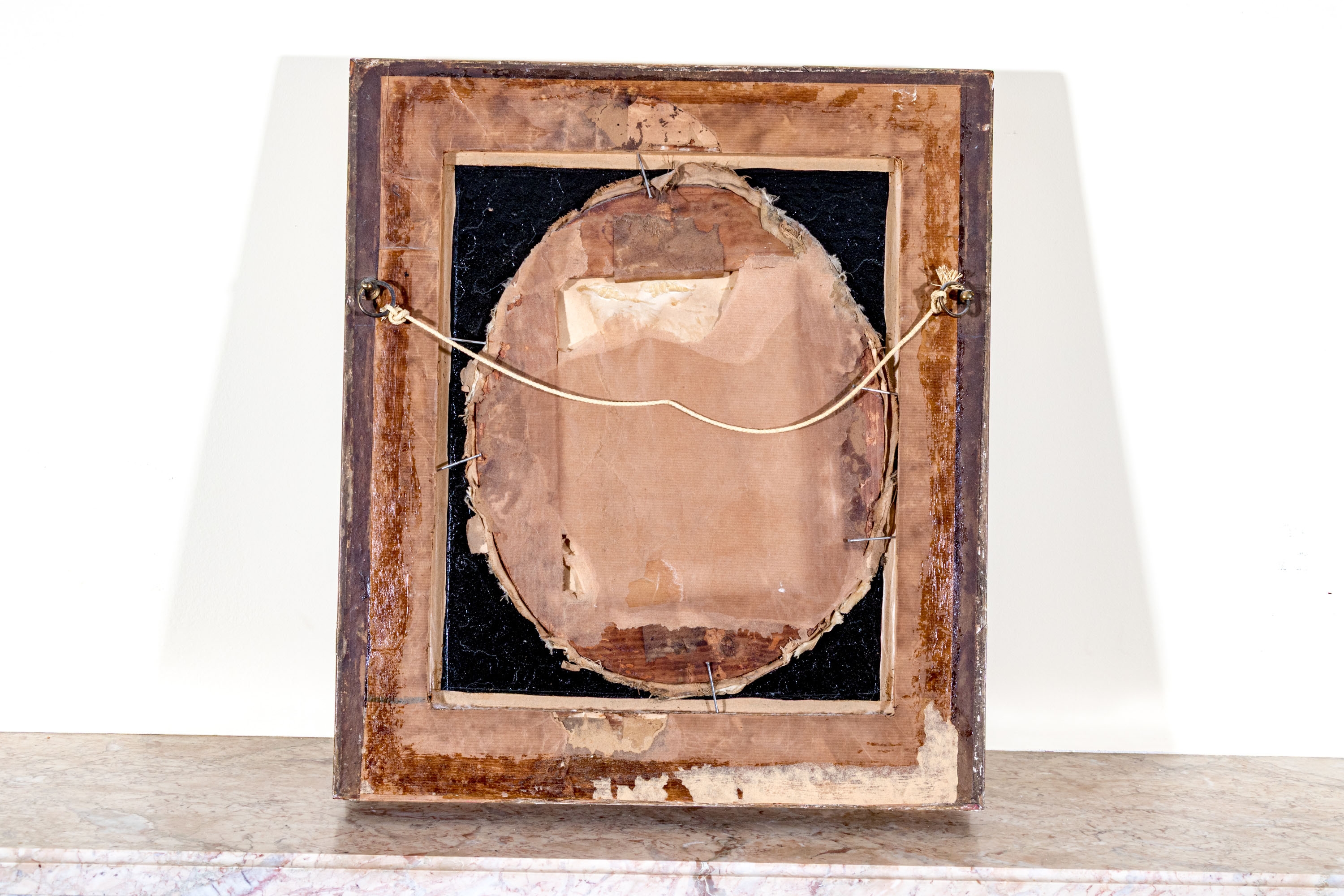 Displayed in an oval tondo style black velvet surround with gilt bands within a magnificent gilt frame with egg and dart trims and flourished relief corners.
