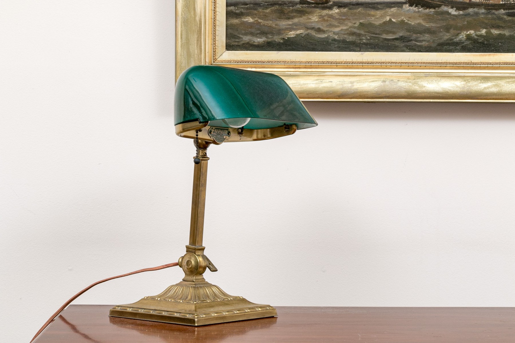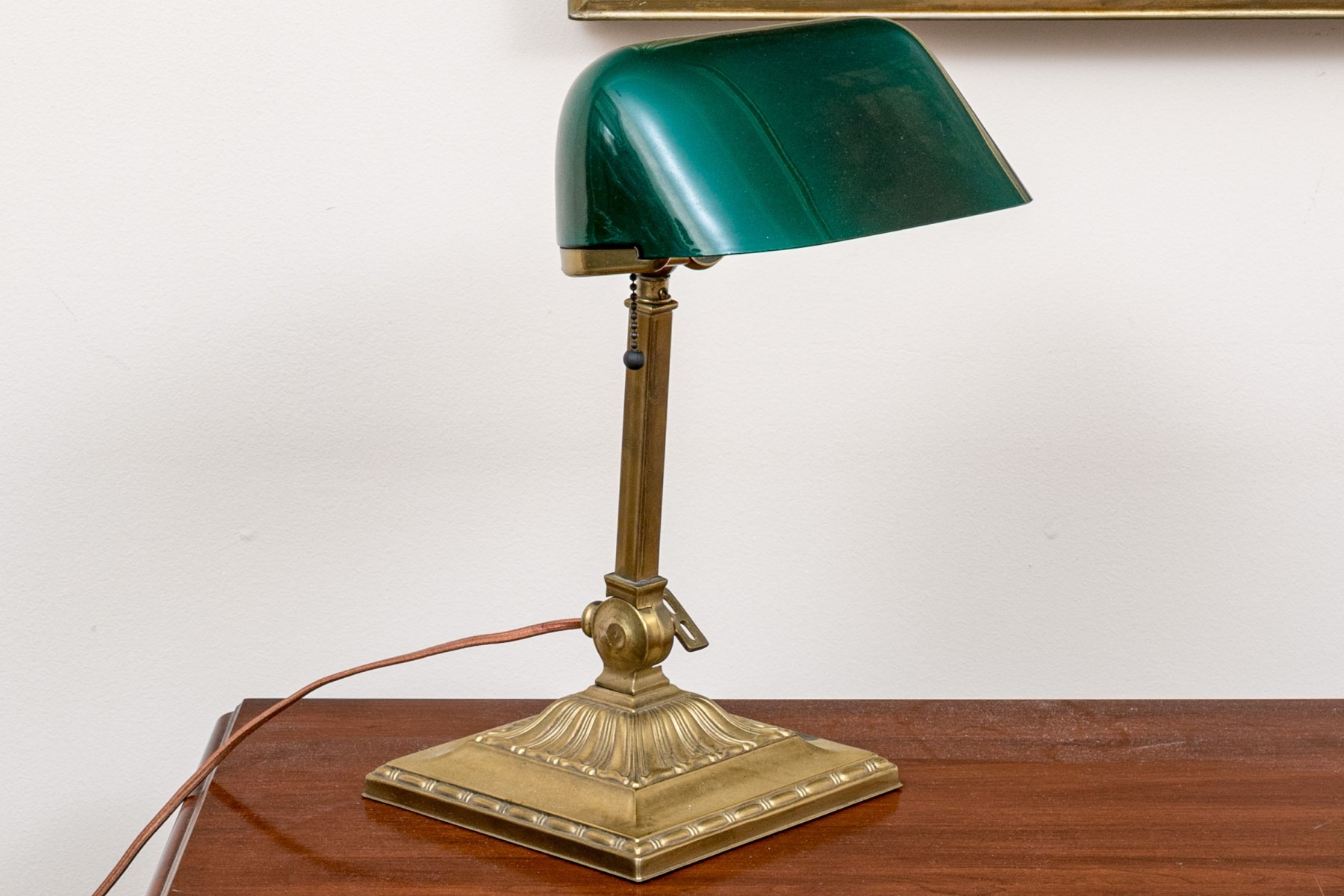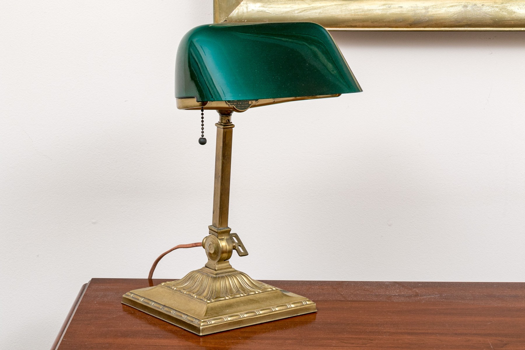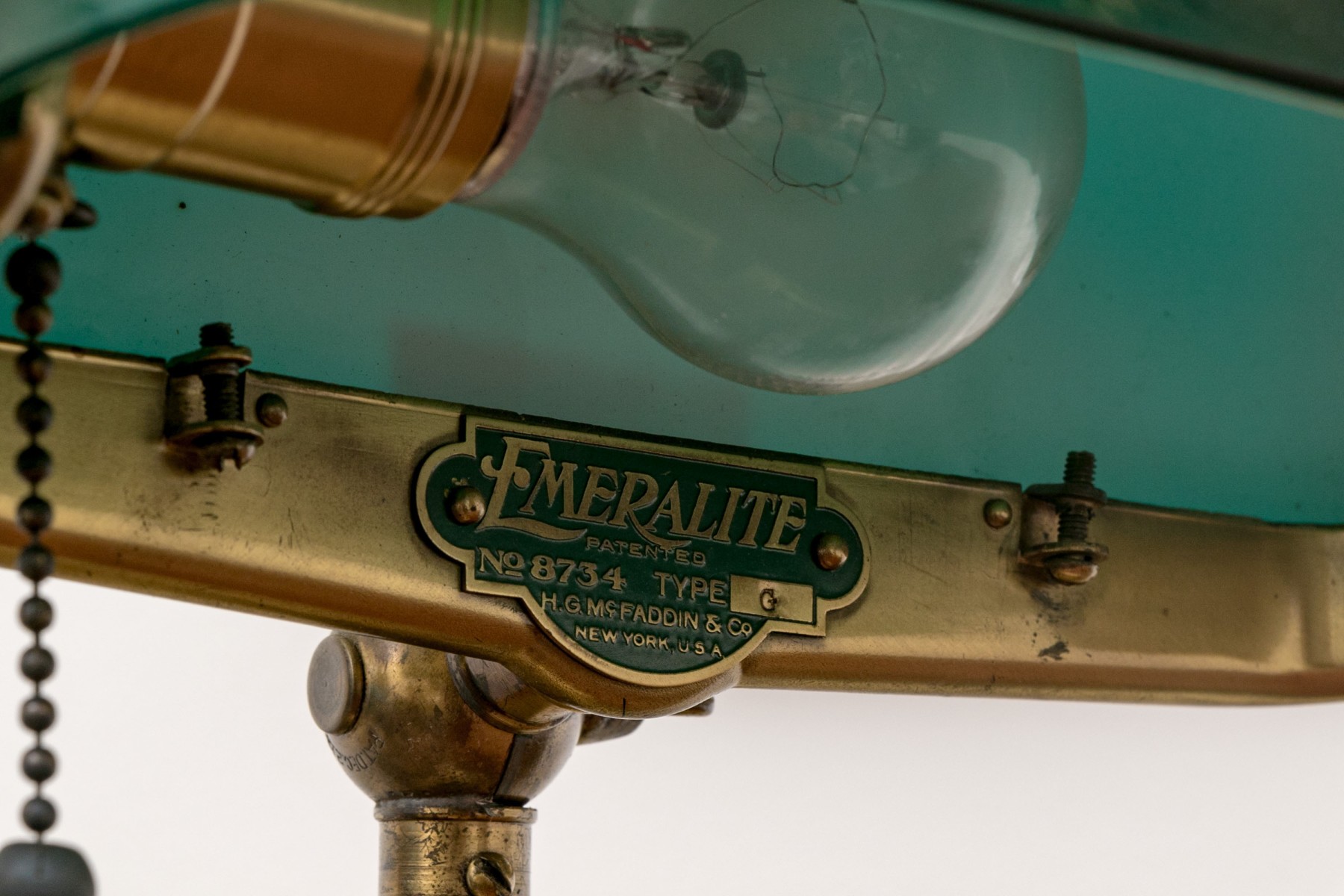 An antique Emeralite Banker's Lamp, bearing the number #8784 and retaining its original label, is equipped with an adjustable green glass shade. This classic lamp exudes vintage charm and functionality.